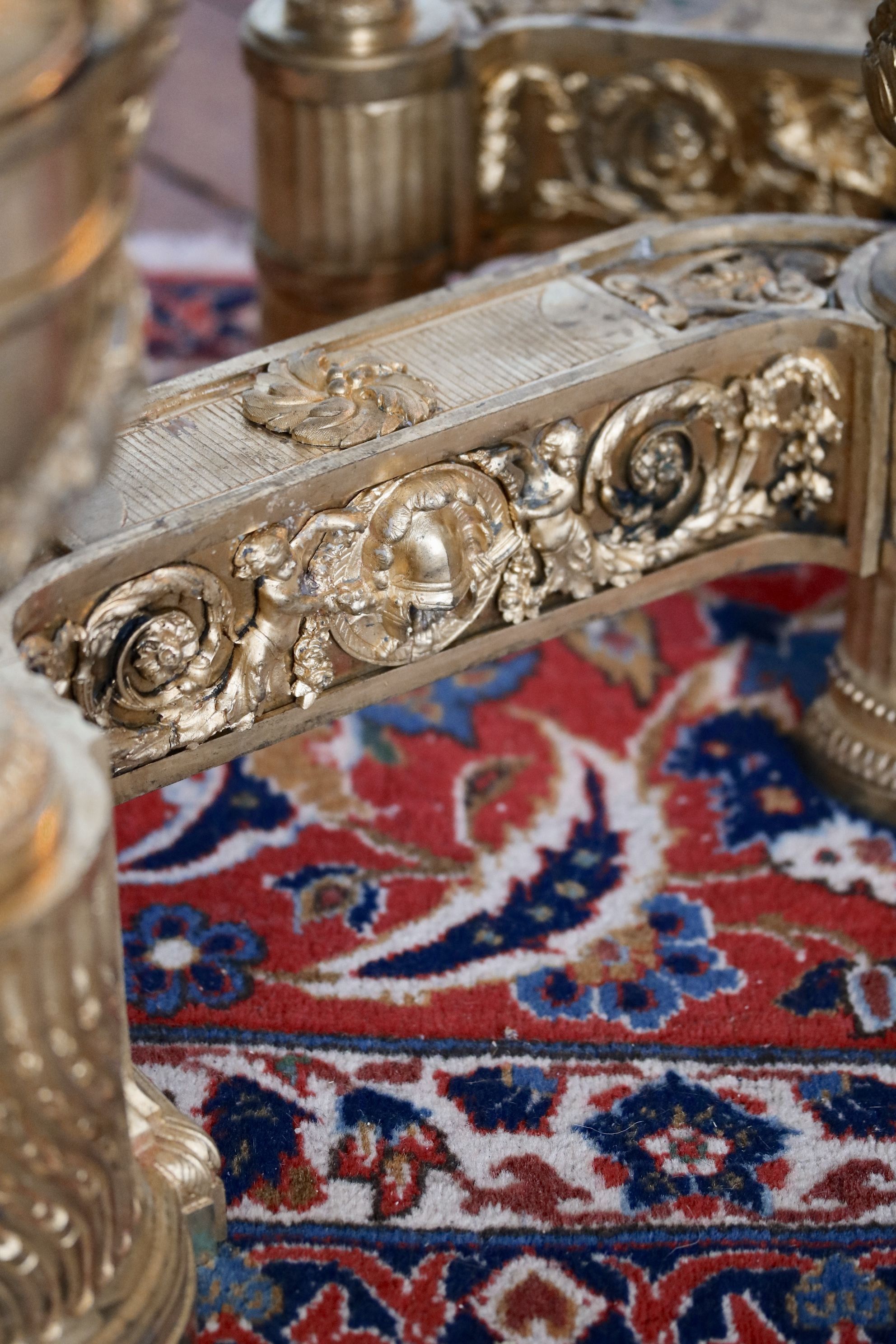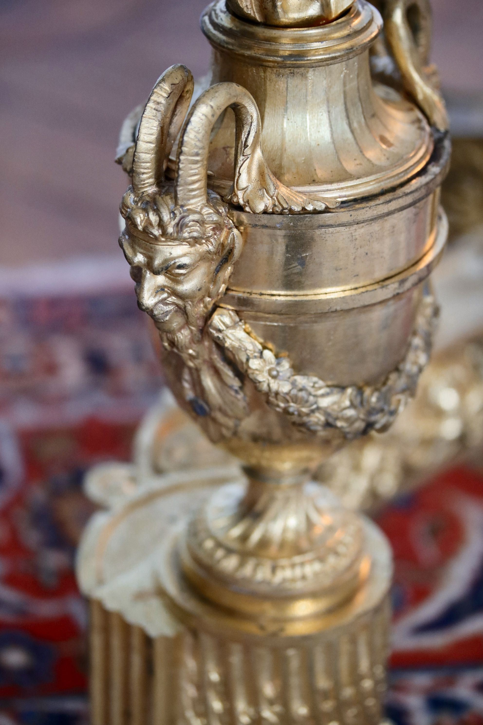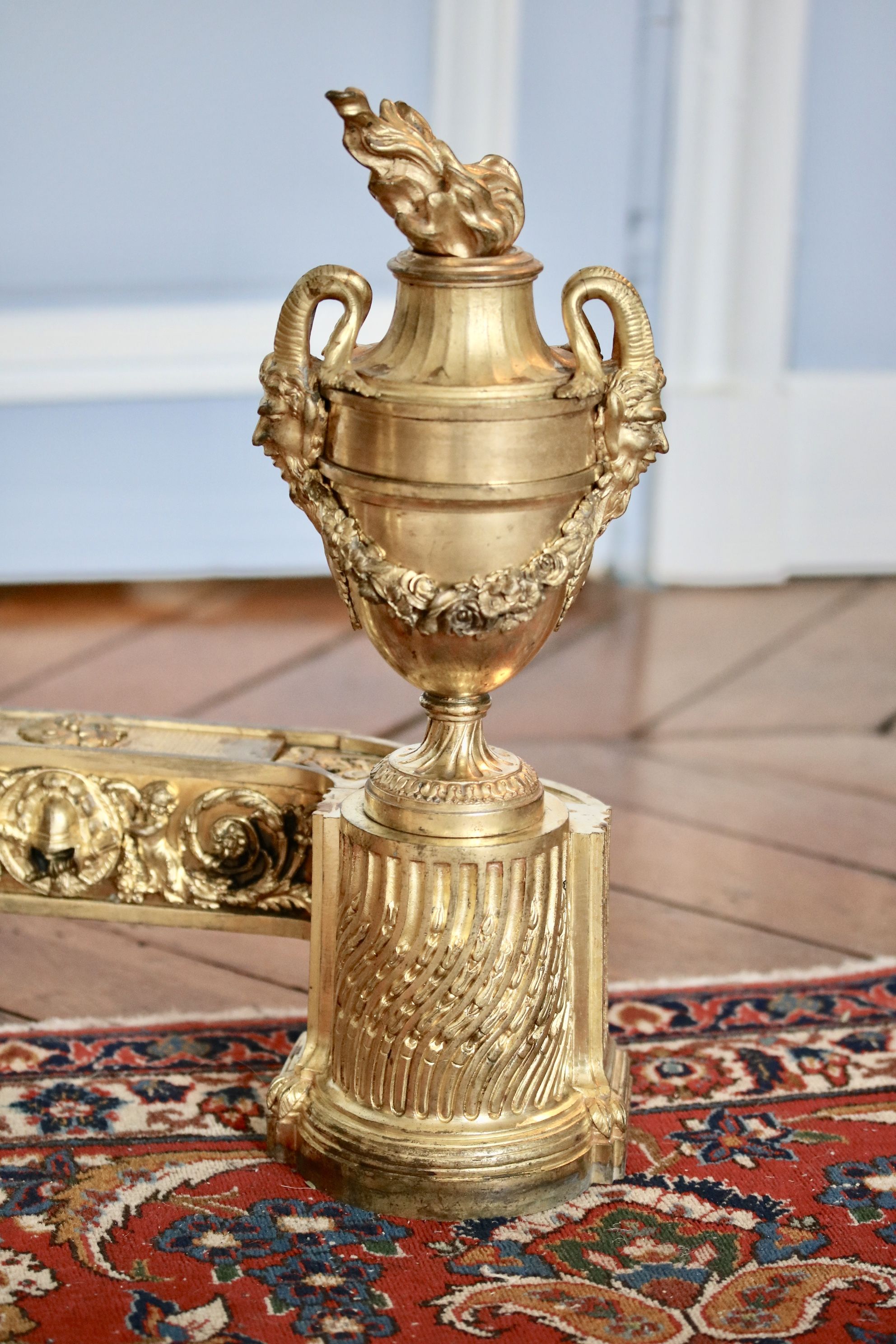Paire de chenets en bronze doré représentant des pots à feu. Chacun d’eux sont encadrés par des anses en forme de satyres retenant des guirlandes de fleurs qui repose sur une base à cannelures torses à asperges. La traverse présente une frise à motifs d’enfants sortant de rinceaux d’acanthes, encadrant un trophée guerrier avec casque et de carquois. La partie arrière représente une colonne cannelée sommé d’une pomme de pin. Epoque Louis XVI Restaurations d’usage H. 42,5 x L42,5 x P. 17 cm
