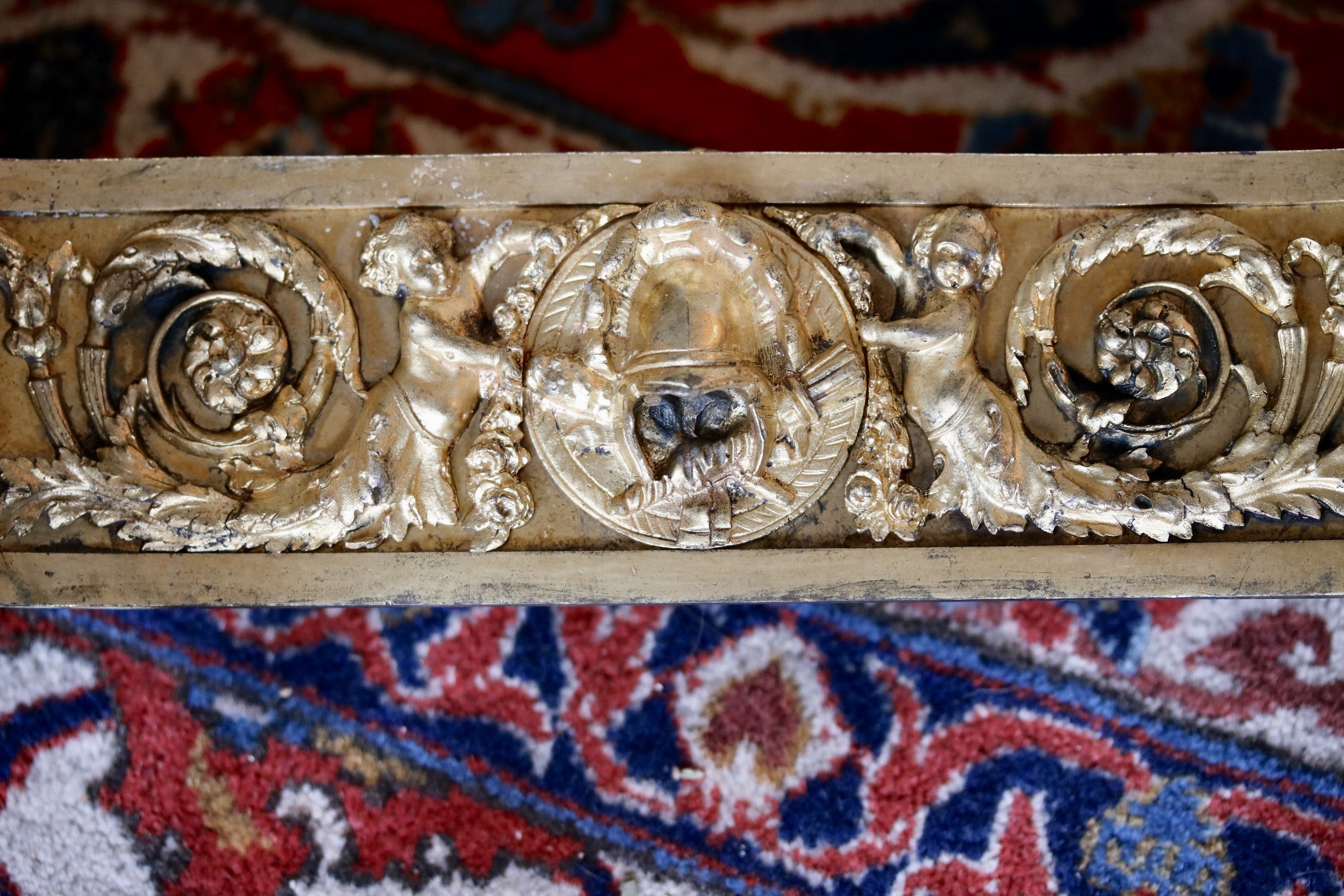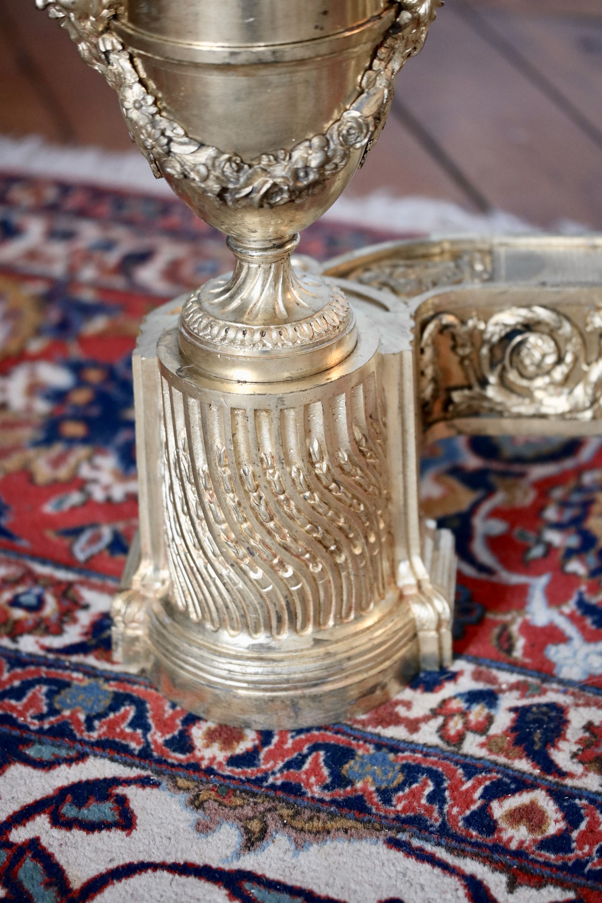 Notre paire de chenets présente un pot-à-feu dont le traitement est à rapprocher du travail du bronzier Philippe Caffieri, à qui l’on attribue le modèle original de cassolette flanquées de deux satyres supportant des guirlandes de fleurs. Philippe Caffieri est né en 1714 à Paris où il meurt en 1774. Il s’associe en 1747 avec son père Jacques Caffieri. Ce dernier jouissait d’une grande renommée qui se manifeste encore à nos yeux par la célèbre pendule de Passemant. Philippe Caffieri est reçu maître en 1754 et reprend l’atelier à la suite de son père l’année suivante. Il délaisse progressivement les formes rocailles pour se tourner vers les lignes du néo-classicisme dont il est l’un des pionniers. Il est effectivement l’artisan-bronzier du bureau de Lallive de July, qui marque la première rupture avec le rocaille. Son travail est si fameux qu’à sa mort, ses dessins et modèles sont vendus en vente publique et rachetés par nombre de bronziers, qui contribuent à divulguer son oeuvre dont ils attestent ainsi le génie. Le corps central des chenets est orné de motifs d’enfants sortant de rinceaux d’acanthe qui sont repris de dessins de Jean-François Forty et exécutés par Turpin en 1785 pour le salon des nobles de la reine à Versailles qui le possède aujourd’hui (n° V5199.1; V5199.2 ).