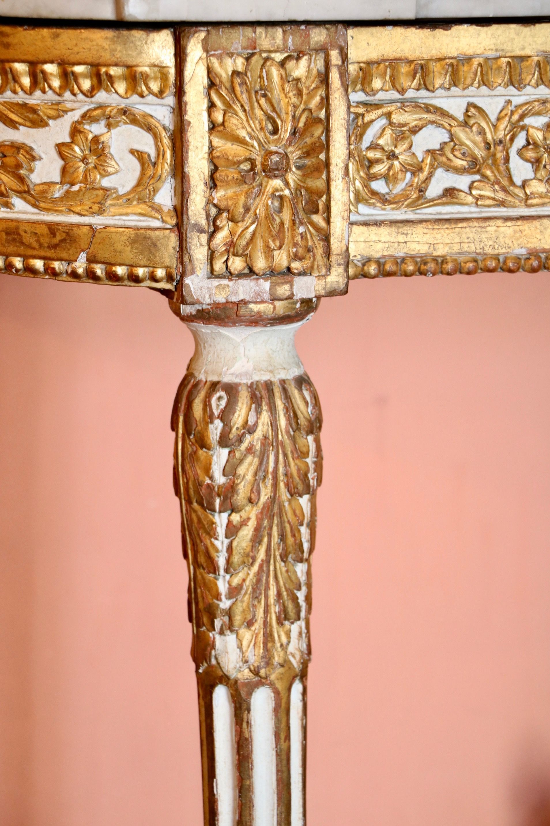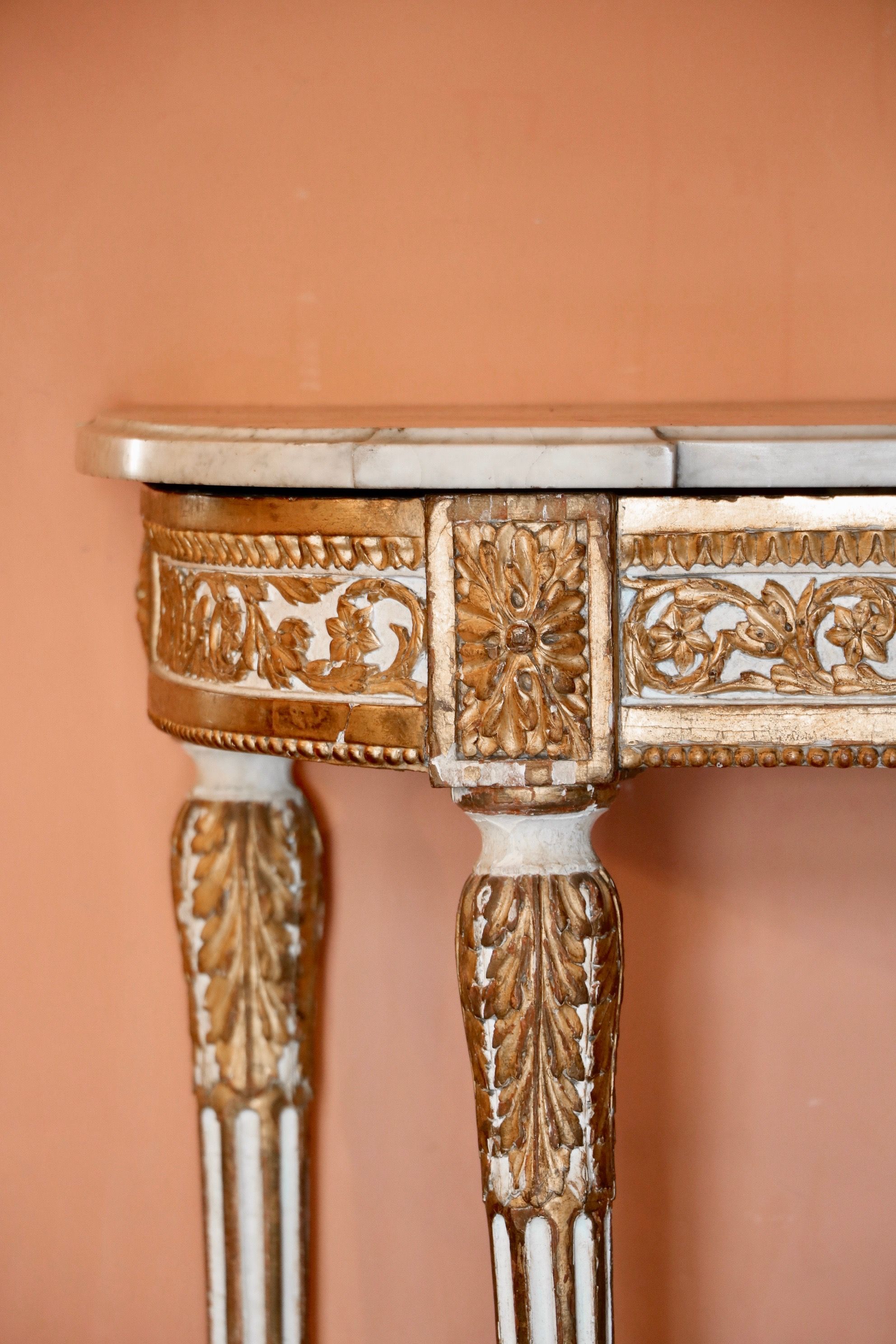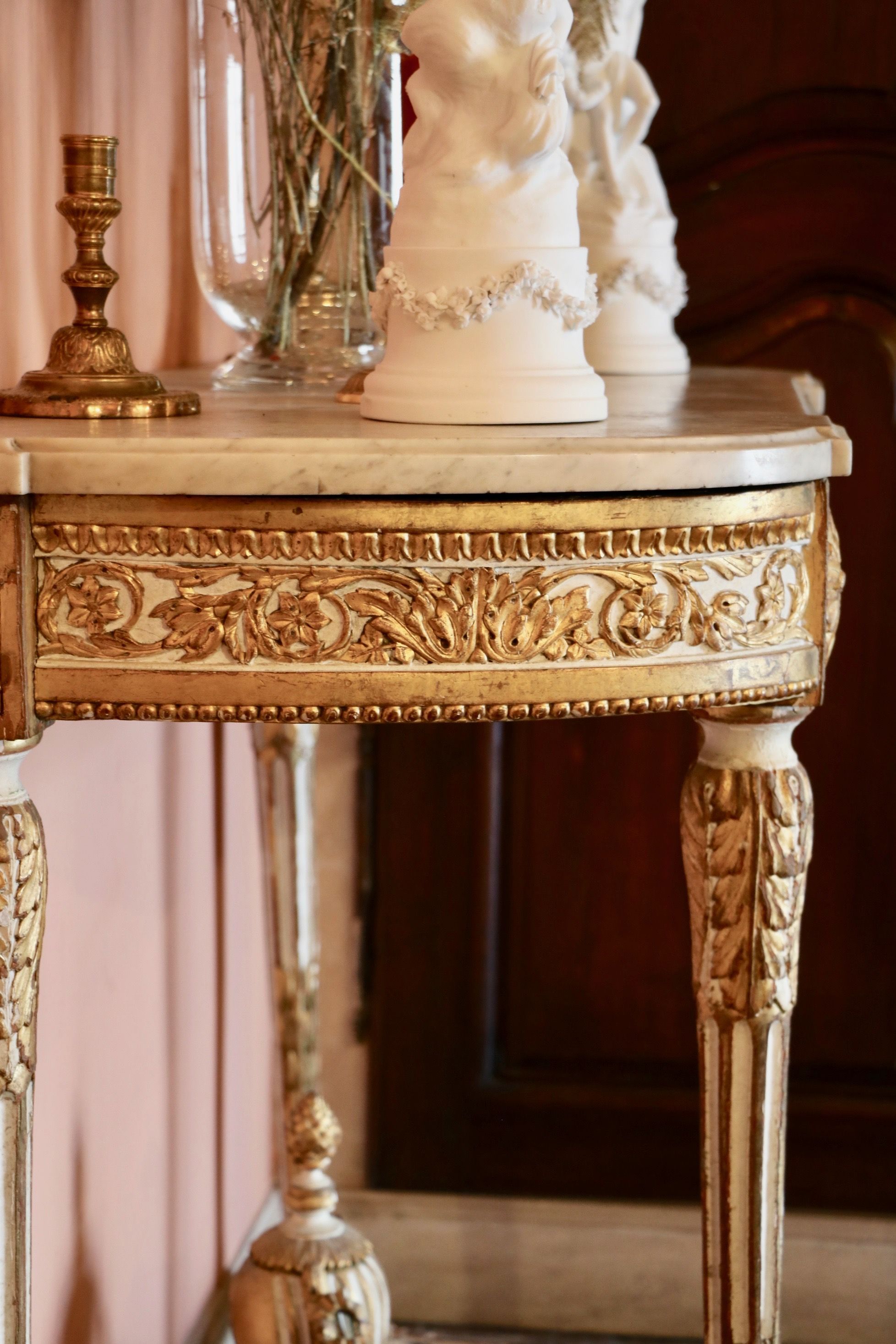 Console demi-lune laquée blanc rechampie or richement décorée sur la ceinture de frises en rinceaux à motif végétal et floral. Les dés raccordant la ceinture au piètement sont ornés de rosettes, tout comme ceux des pieds. La console repose sur quatre pieds fuselés et cannelés sommés de feuilles d’acanthe. Ils sont réunis par une entretoise en X présentant des volutes légères à l’arrière, et ornés sur leurs cotés de frises. L’entretoise présente un décor recherché, avec deux espaces laissés vides, de part et d’autre de l’urne godronnée qui orne en son centre l’entretoise, destinés à accueillir des vases. La console est surmontée d’un marbre blanc et mouluré faisant le pourtour du meuble. Epoque Louis XVI Dans le goût à Georges Jacob Restaurations d’usage, anciennement laqué vert H. 88 x L. 107 x P. 45,5 cm