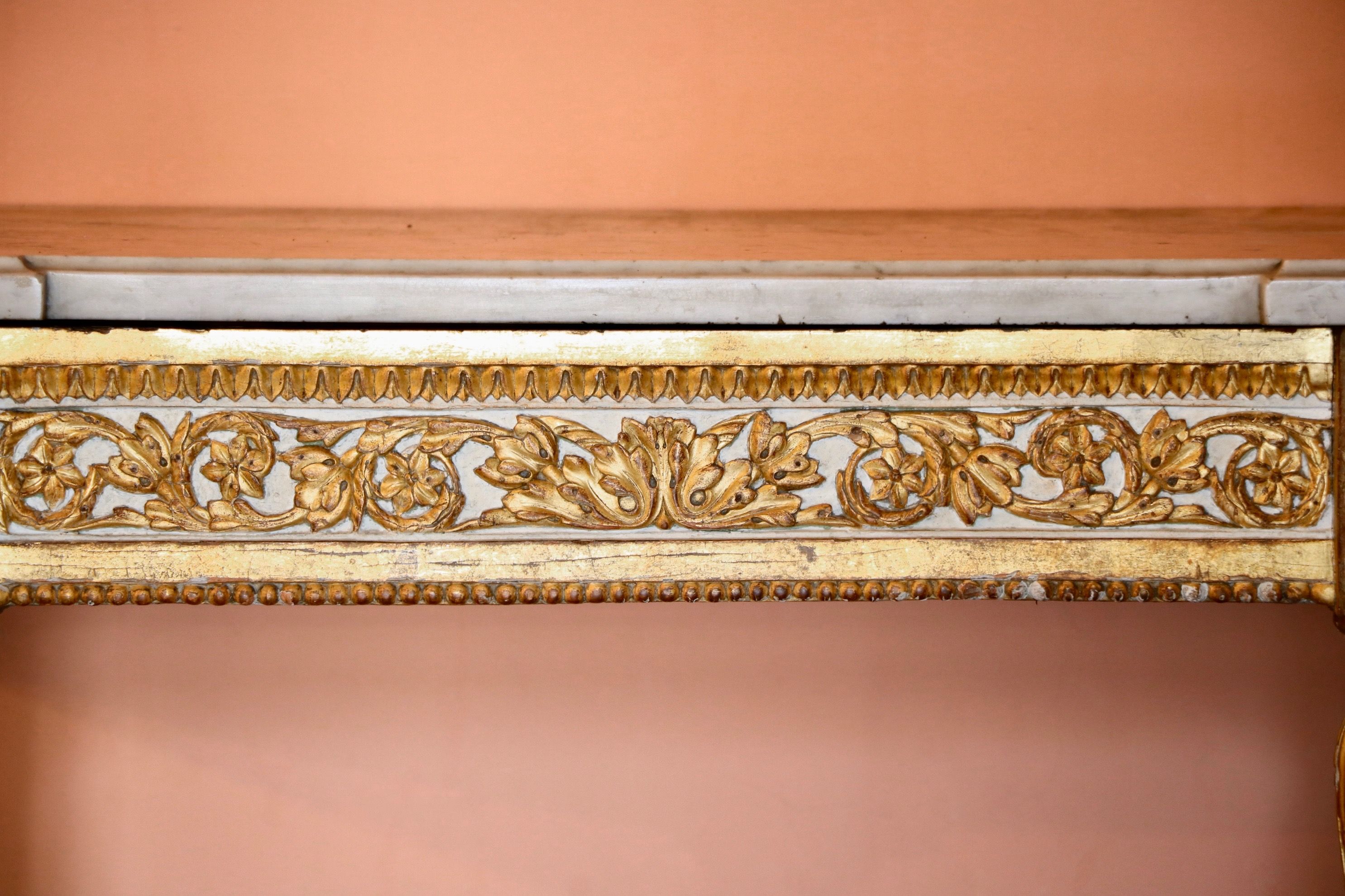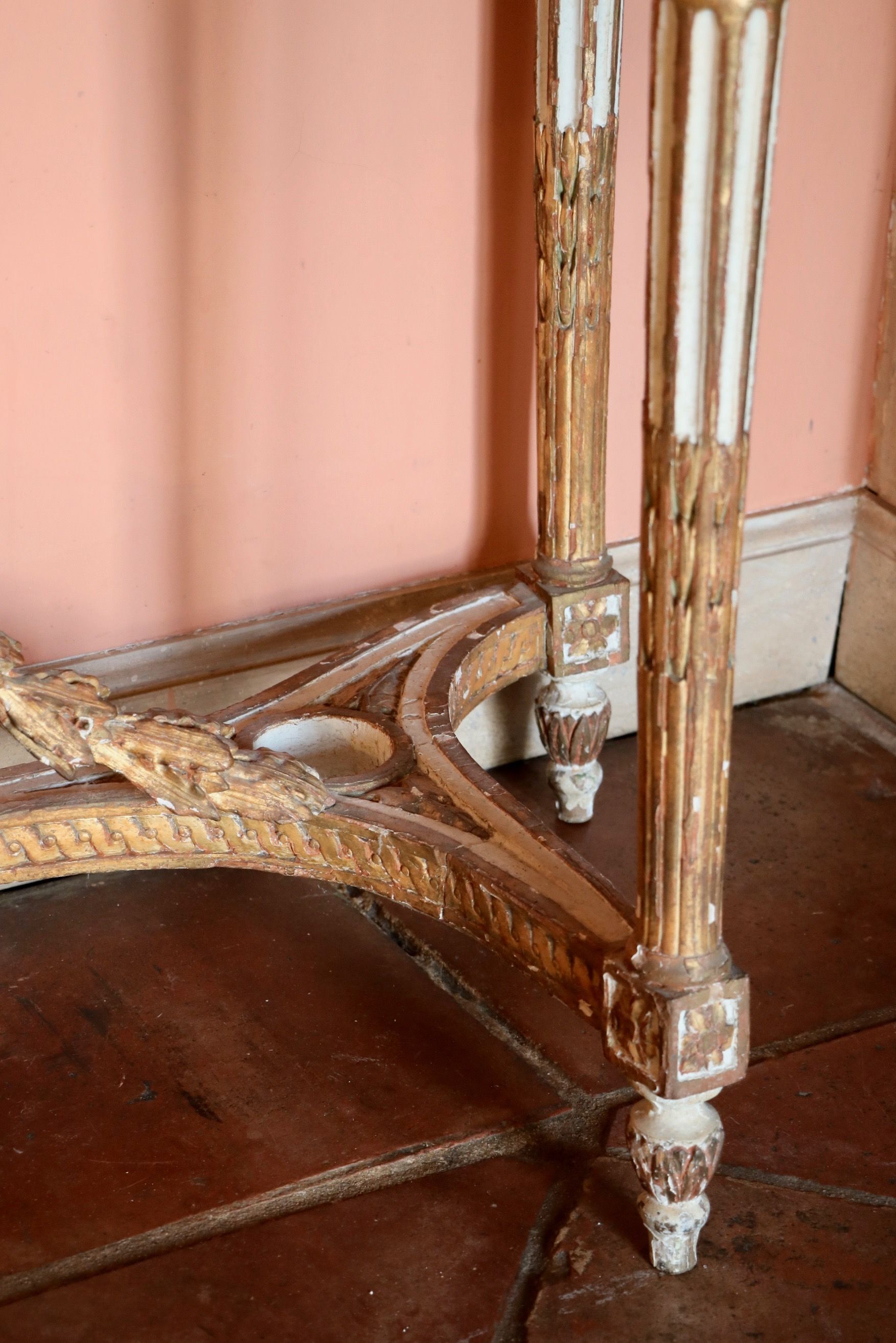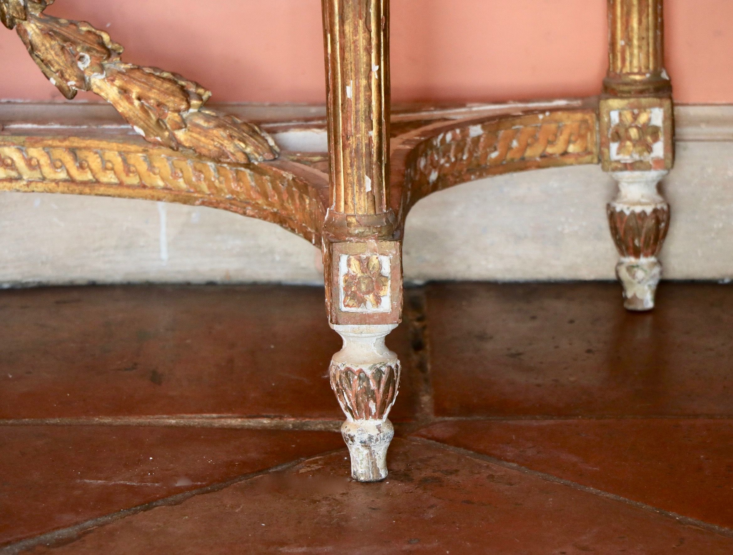 Console demi-lune laquée blanc rechampie or richement décorée sur la ceinture de frises en rinceaux à motif végétal et floral. Les dés raccordant la ceinture au piètement sont ornés de rosettes, tout comme ceux des pieds. La console repose sur quatre pieds fuselés et cannelés sommés de feuilles d’acanthe. Ils sont réunis par une entretoise en X présentant des volutes légères à l’arrière, et ornés sur leurs cotés de frises. L’entretoise présente un décor recherché, avec deux espaces laissés vides, de part et d’autre de l’urne godronnée qui orne en son centre l’entretoise, destinés à accueillir des vases. La console est surmontée d’un marbre blanc et mouluré faisant le pourtour du meuble. Epoque Louis XVI Dans le goût à Georges Jacob Restaurations d’usage, anciennement laqué vert H. 88 x L. 107 x P. 45,5 cm