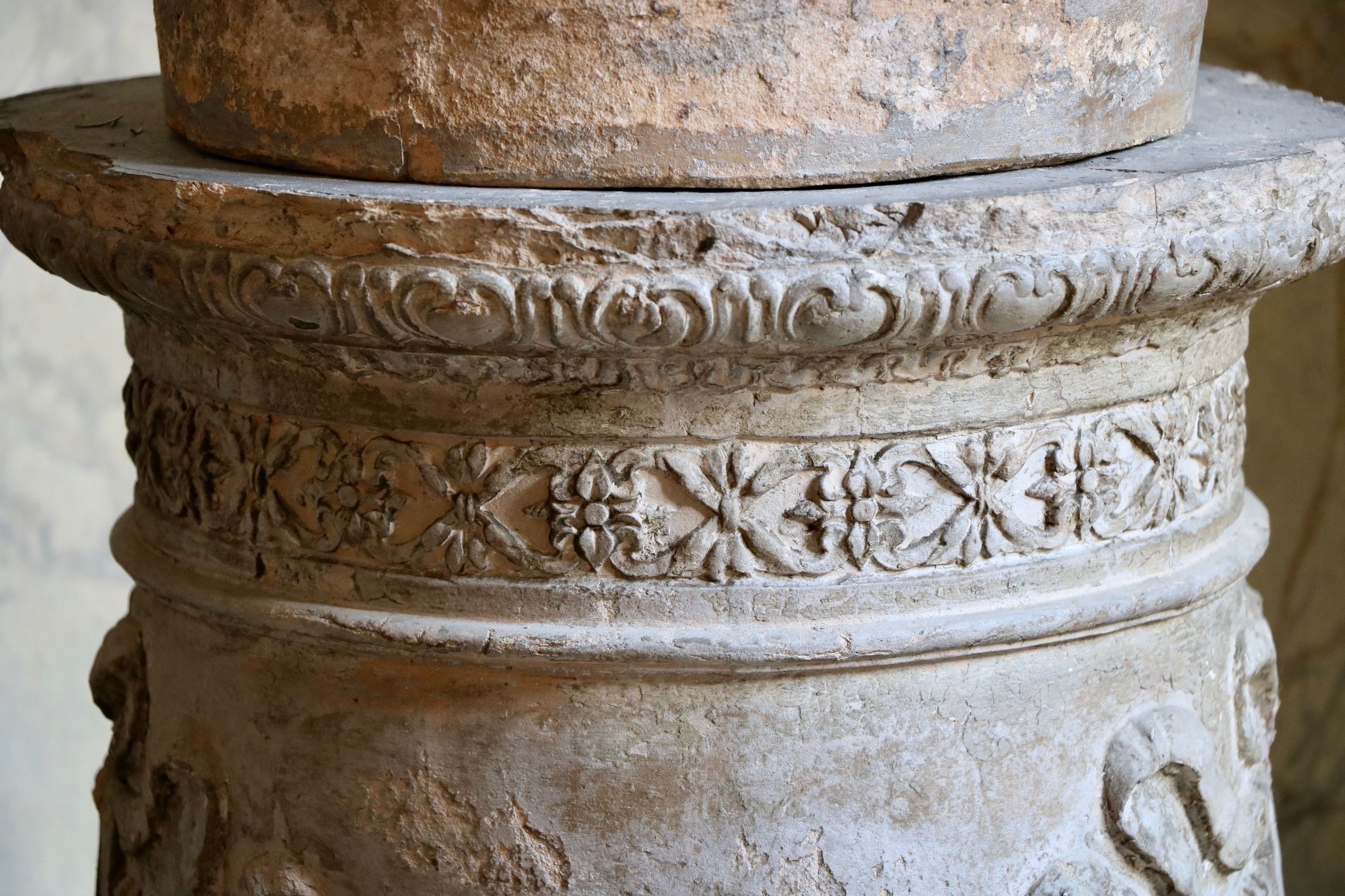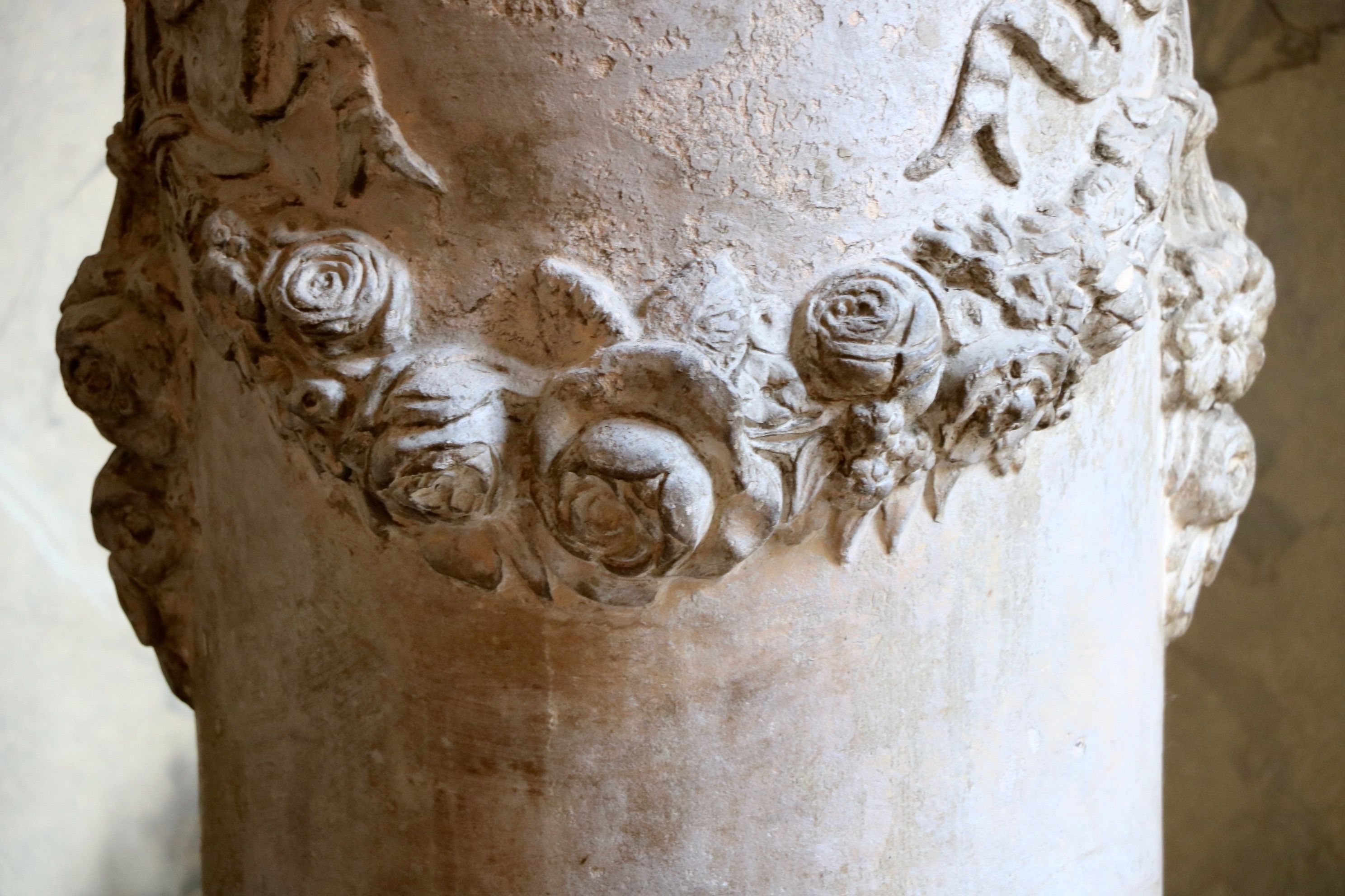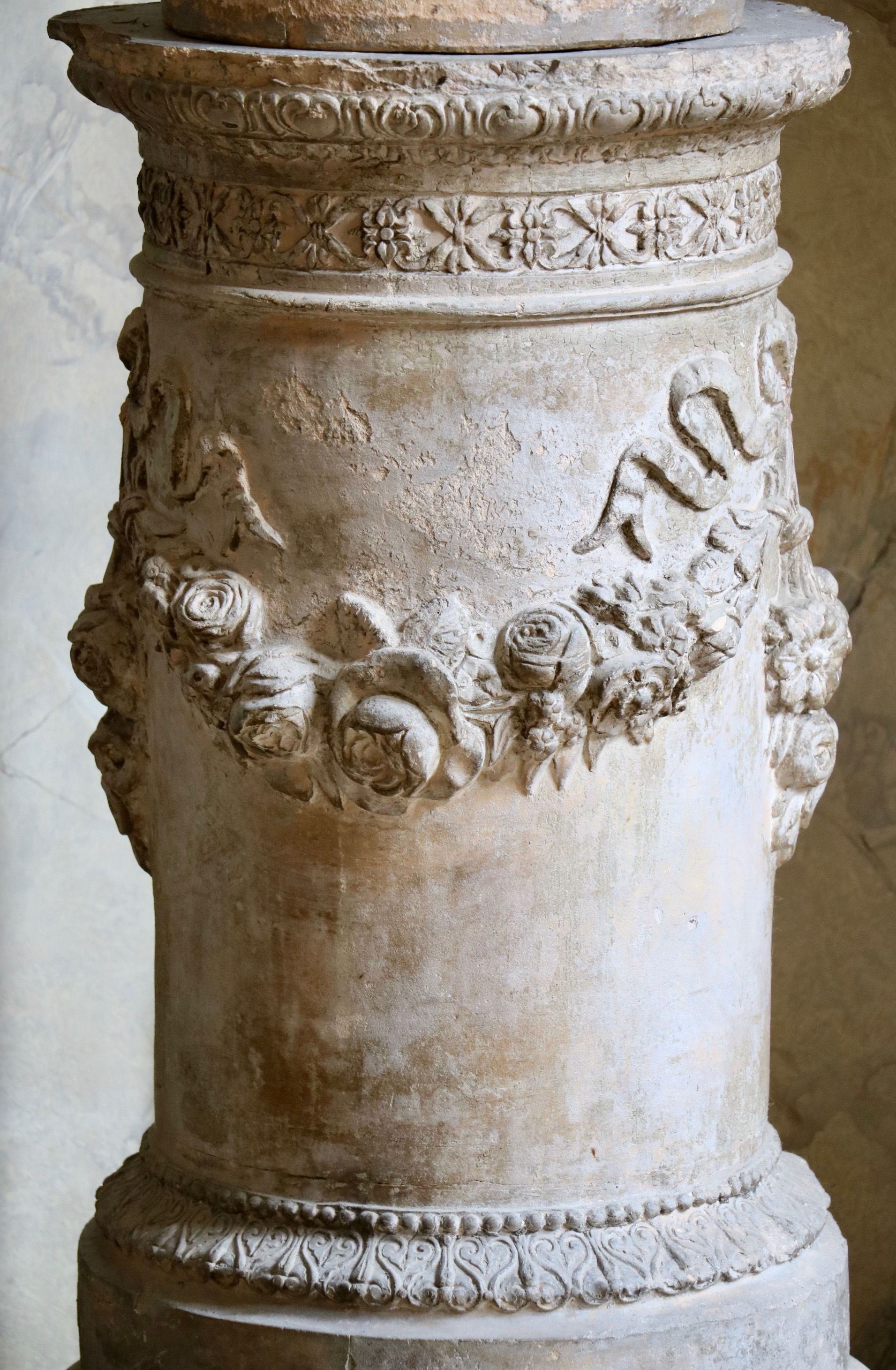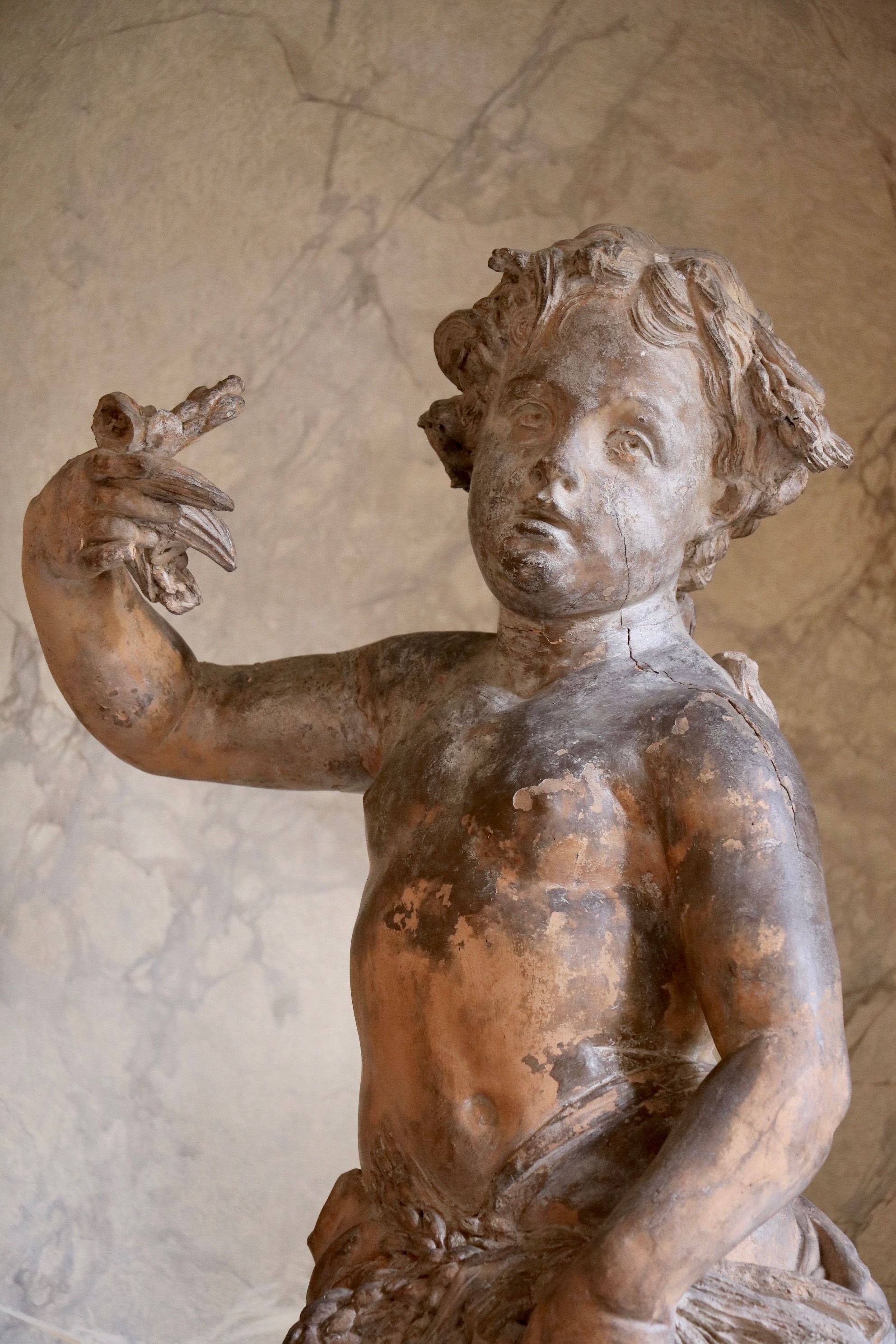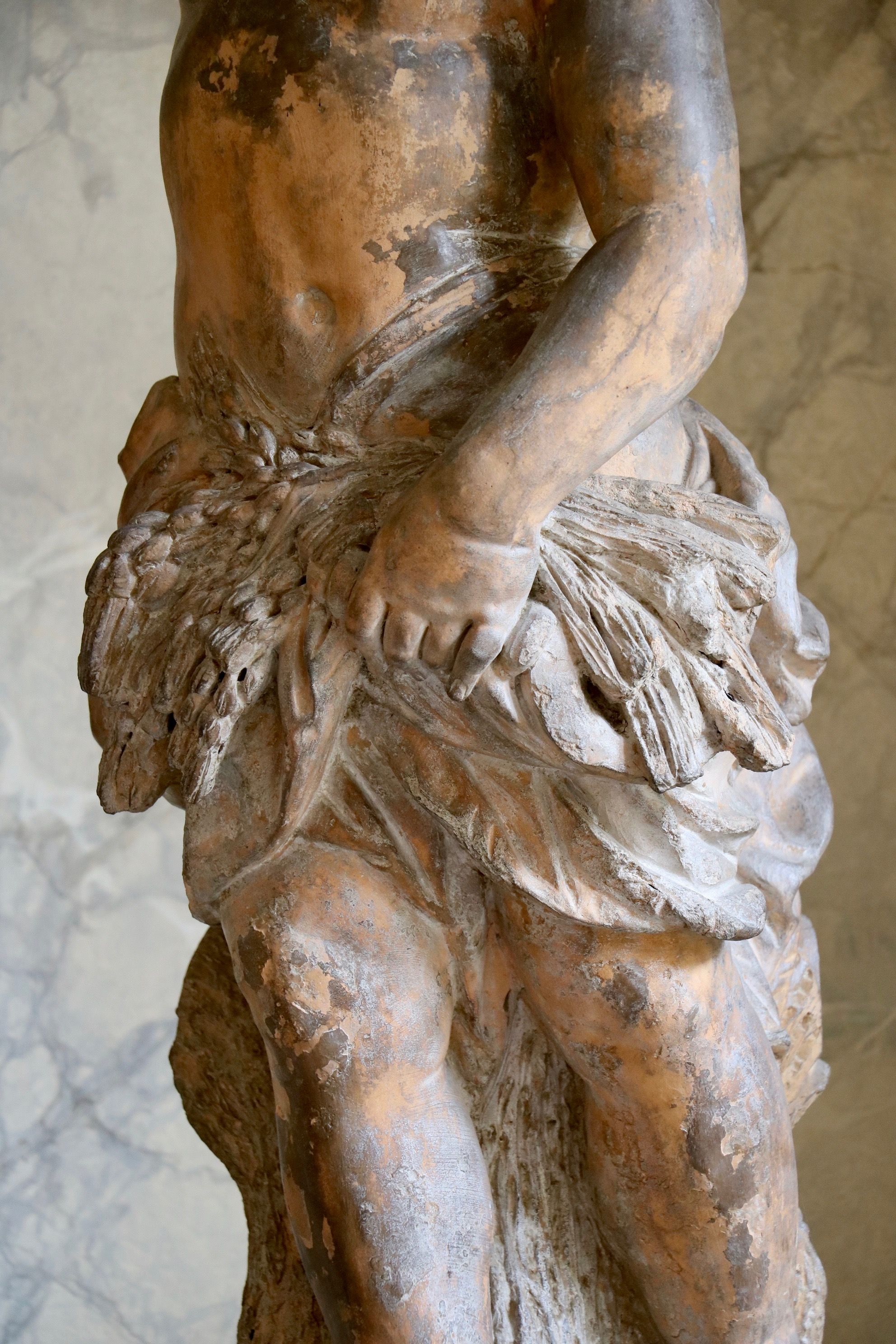 Un putto en terre cuite représentant l’Eté. Il est représenté debout contre un tronc placé derrière lui, la tête ceinte d’une couronne de fleurs. Il tient dans sa main droite levée un bouquet fleuri et des épis de blé dans l’autre. Il repose sur un socle en forme de colonne ornée d’une guirlande de fleurs tenue par un ruban avec frise de fleurons à la partie supérieure. Première moitié du XVIIIème siècle Restaurations d’usage, restes de monochromie couleur pierre, quelques accidents et fissures H. 100 cm, H. totale : 187 cm