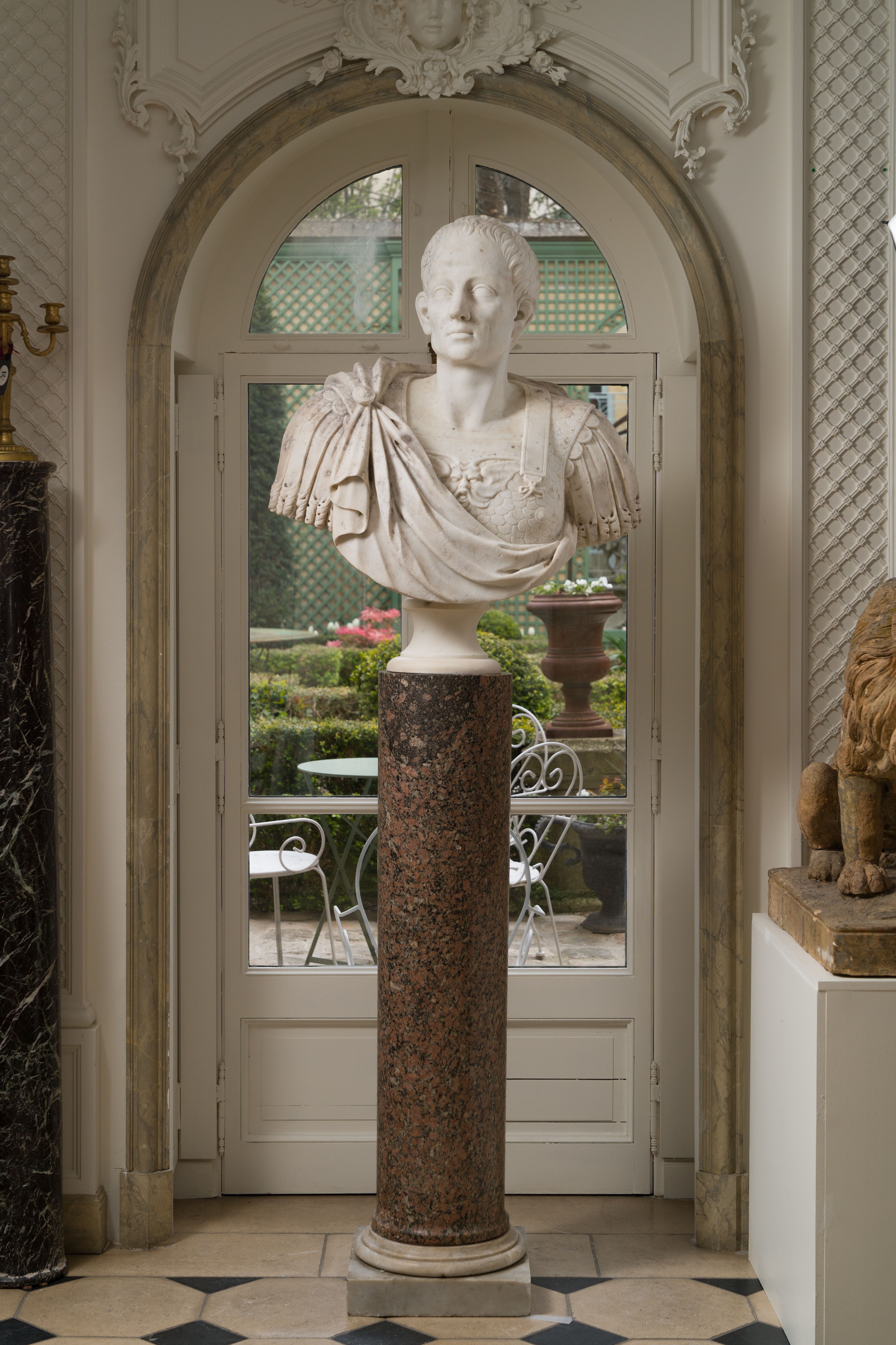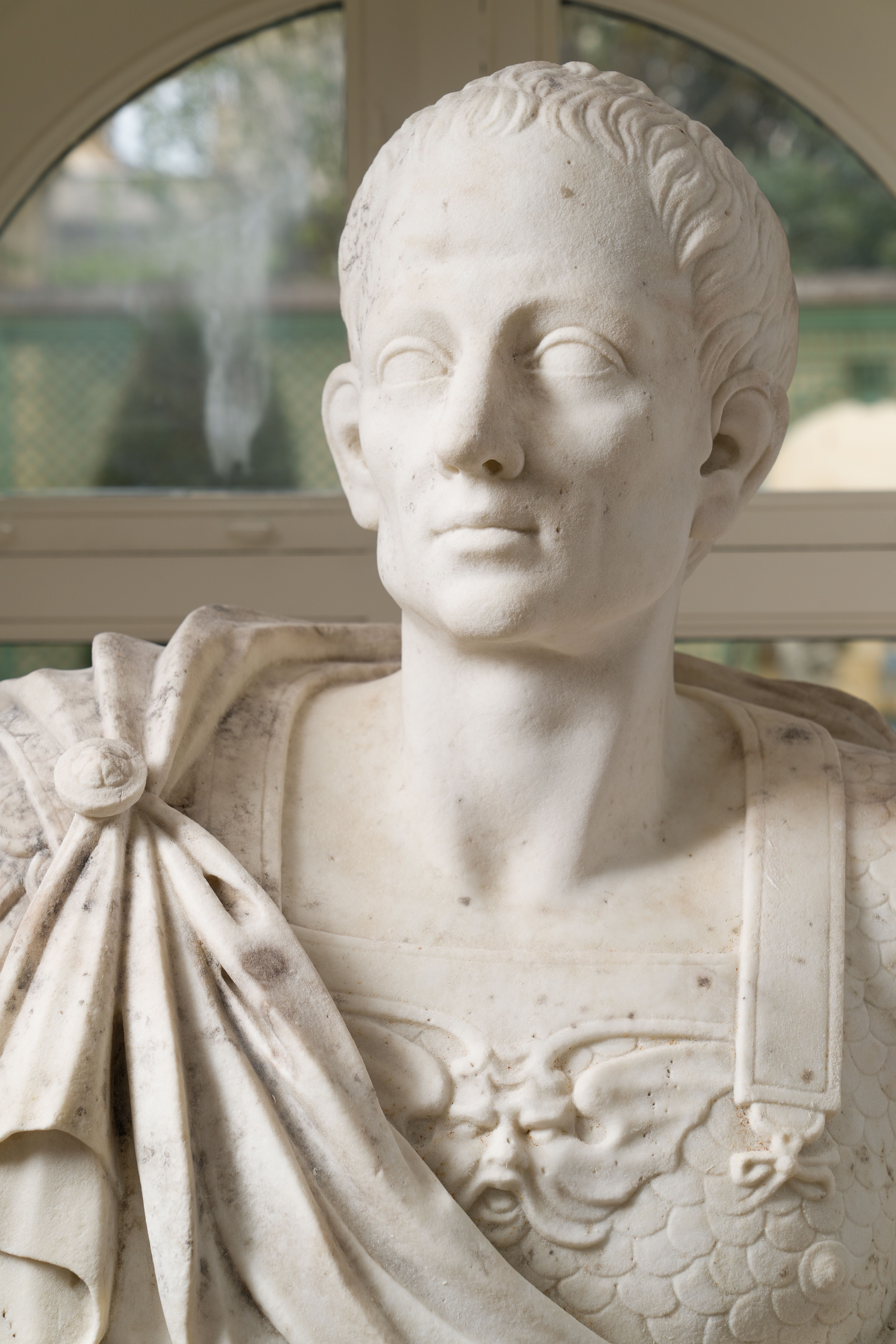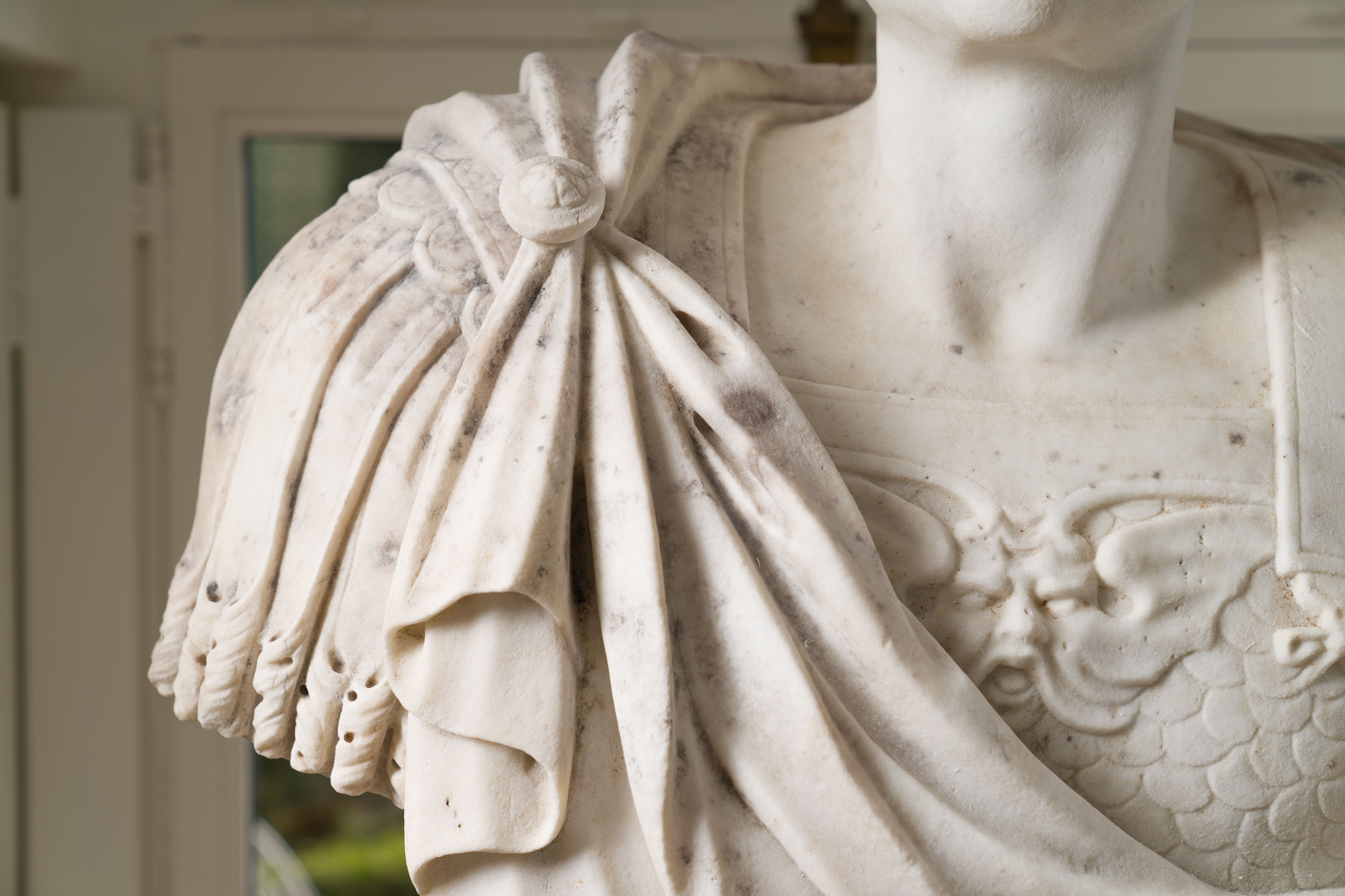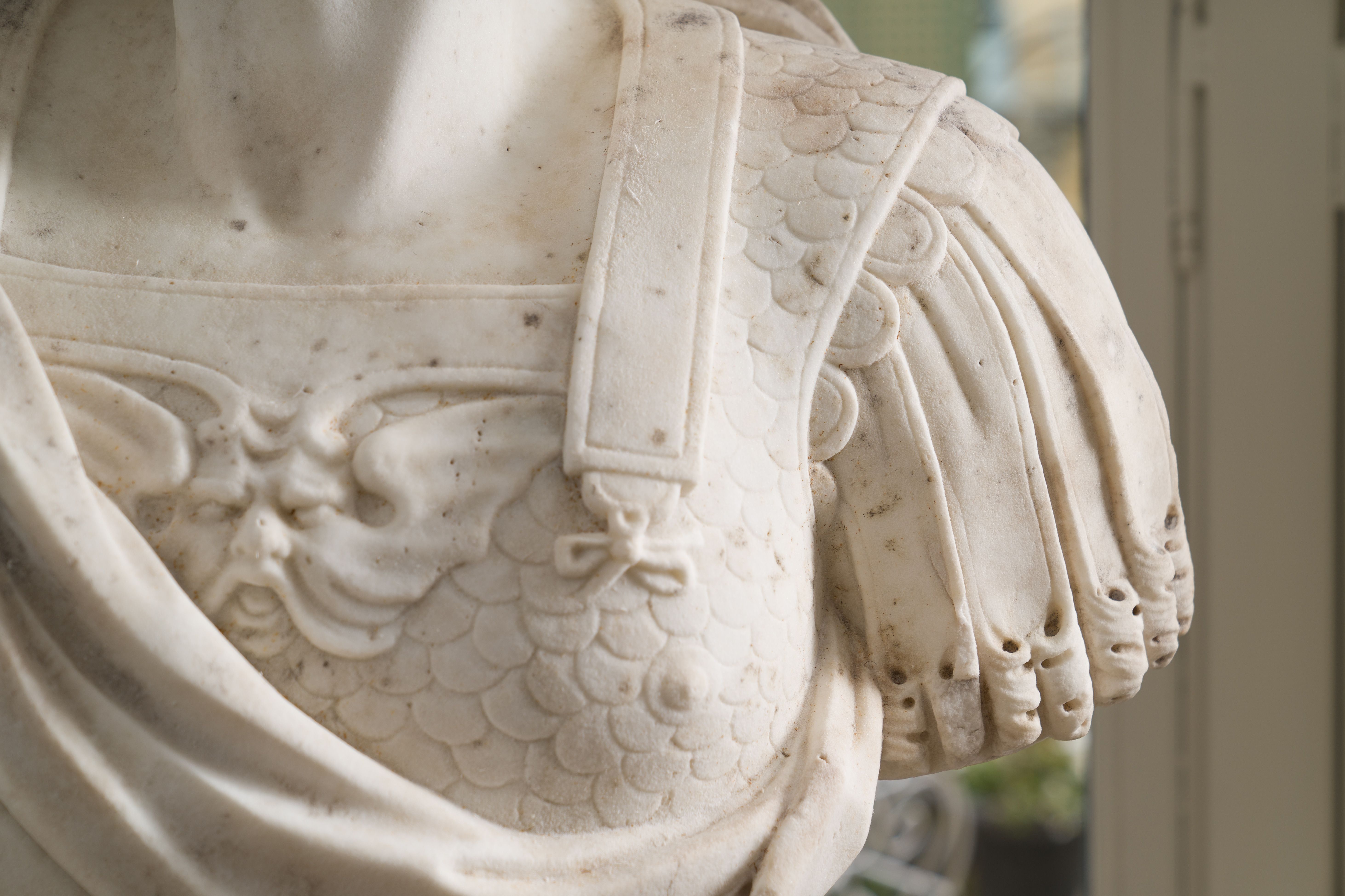 Le buste que nous présentons aujourd’hui est caractéristique du goût de l’Antique qui prévaut en France depuis les guerres d’Italie. La statuaire antique était prisée des rois, car outre sa dimension artistique, elle évoquait une filiation entre le pouvoir impérial de l’ancienne Rome, et celui des rois de la France moderne. Notre buste présente une cuirasse très caractéristique, en forme d’écailles de poisson. Elle est ornée en son centre d’une figure de gorgone, symbole que les grecs puis les romains utilisaient afin de conjurer le mauvais sort (signe apotropaïque). La présence de cette cuirasse, fréquemment associée à la tenue de la garde prétorienne, peut répondre à la volonté impériale de s’attirer les bonnes grâces de ce corps d’armée très influent. La qualité de la sculpture ne se limite pas à la cuirasse et se voit également sur les manches en lambrequins de cuir qui s’enroulent délicatement à leurs extrémités. Le jeu de plissés offert par le paludamentum, retenu par une agrafe, est encore une belle illustration de la dextérité du sculpteur. Le buste est à rapprocher d’une représentation de l’empereur Auguste âgé, commandée par le roi Louis XIV pour orner les façades de sa cour de marbre et de sa cour royale, aujourd’hui conservée au musée du Louvre.