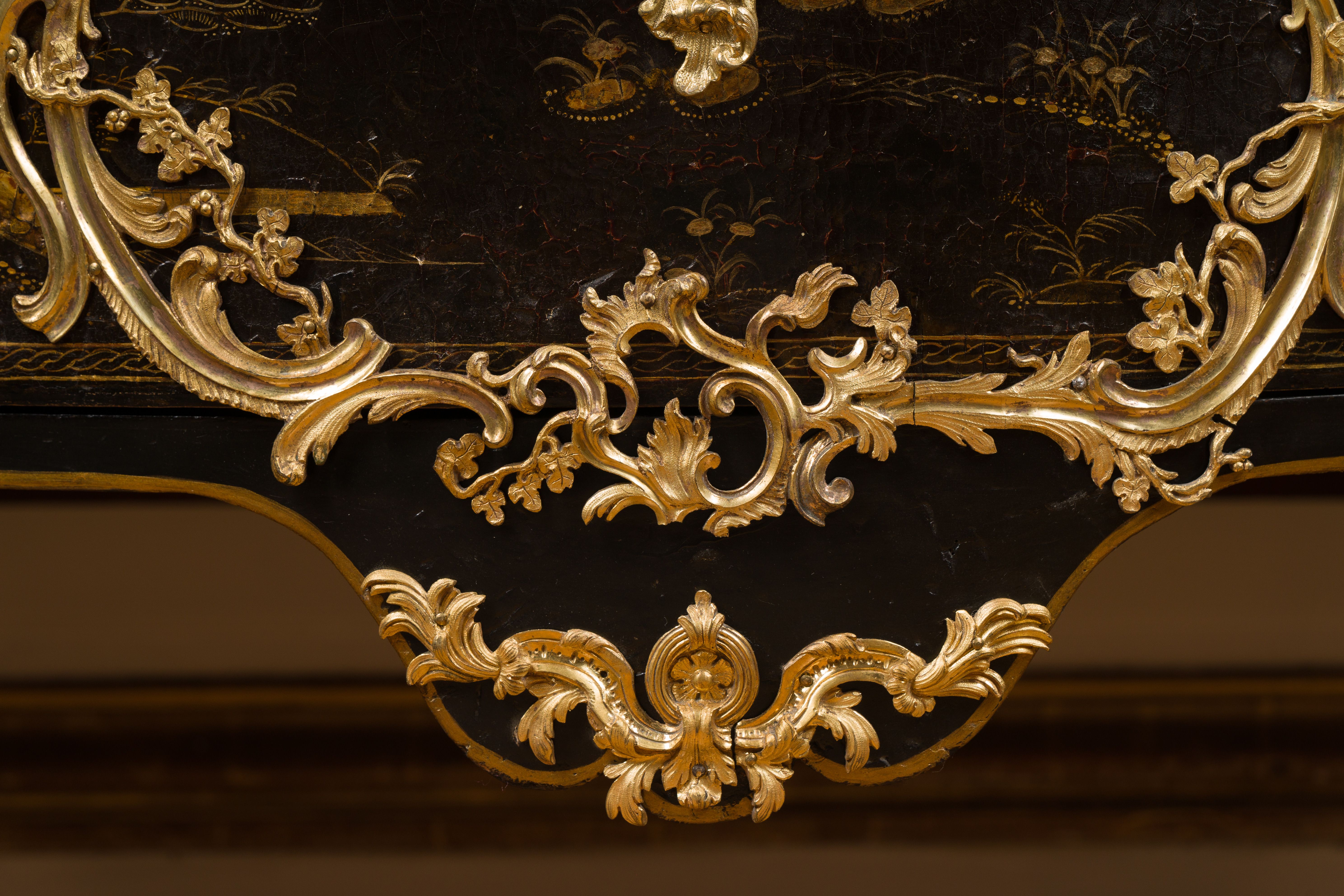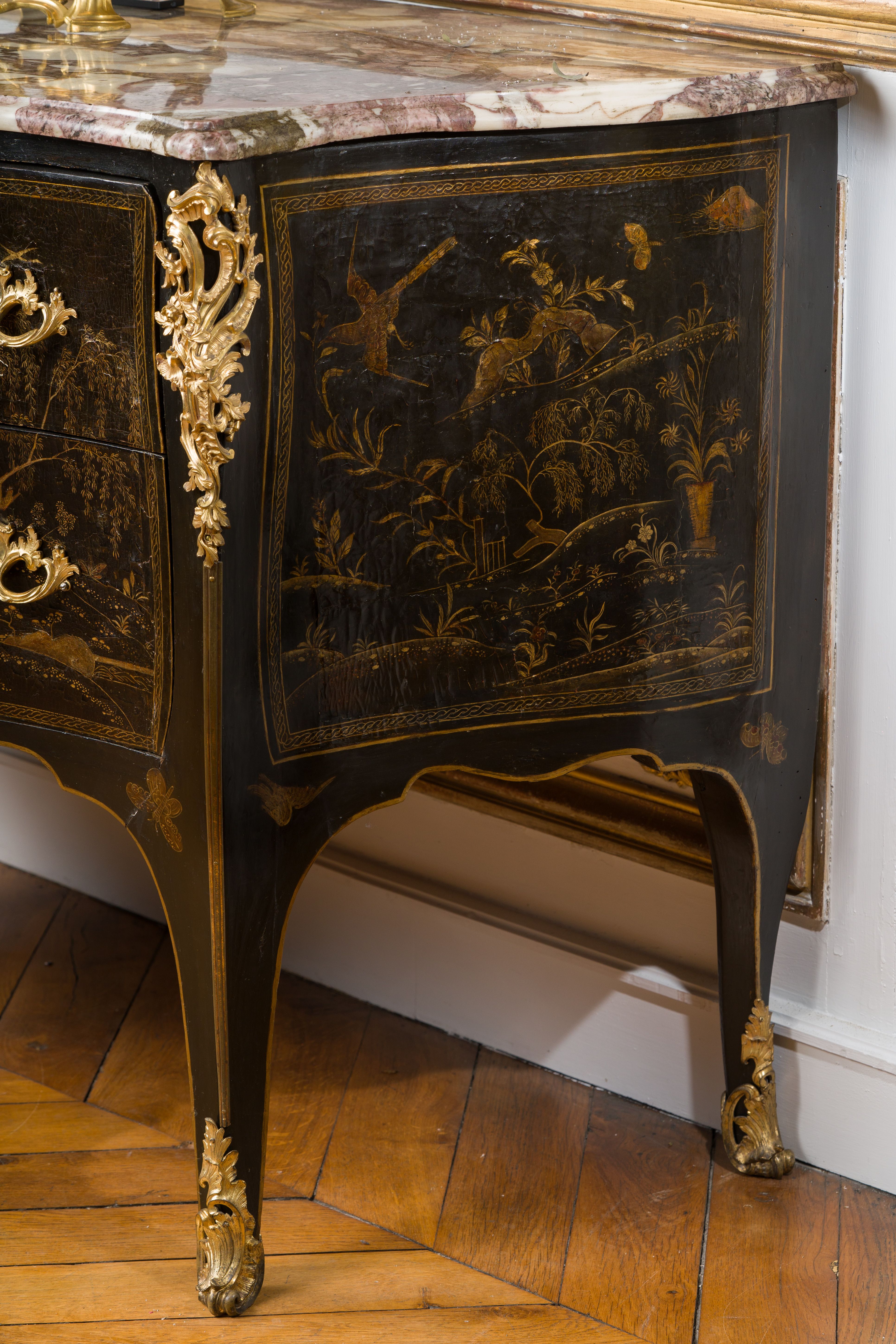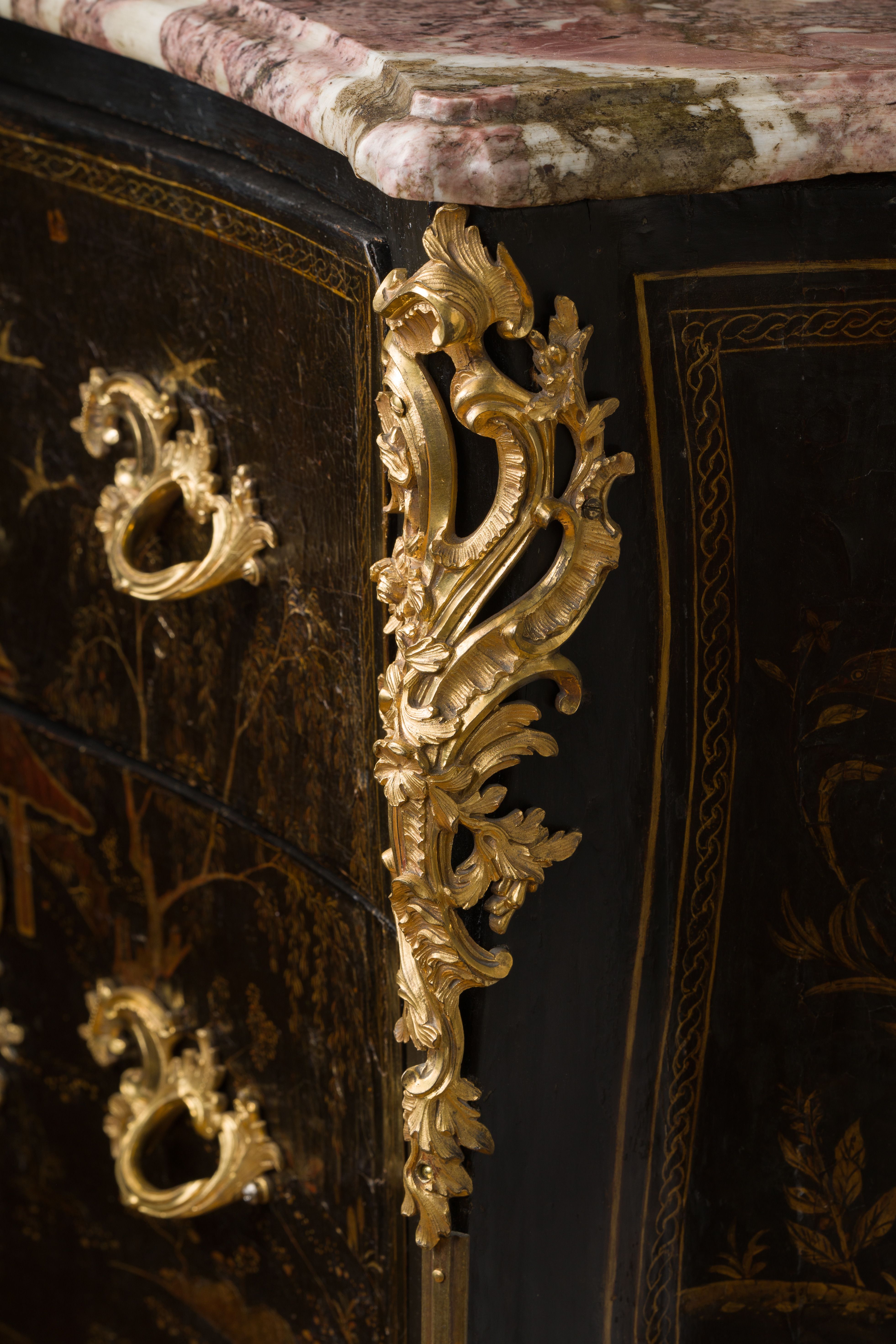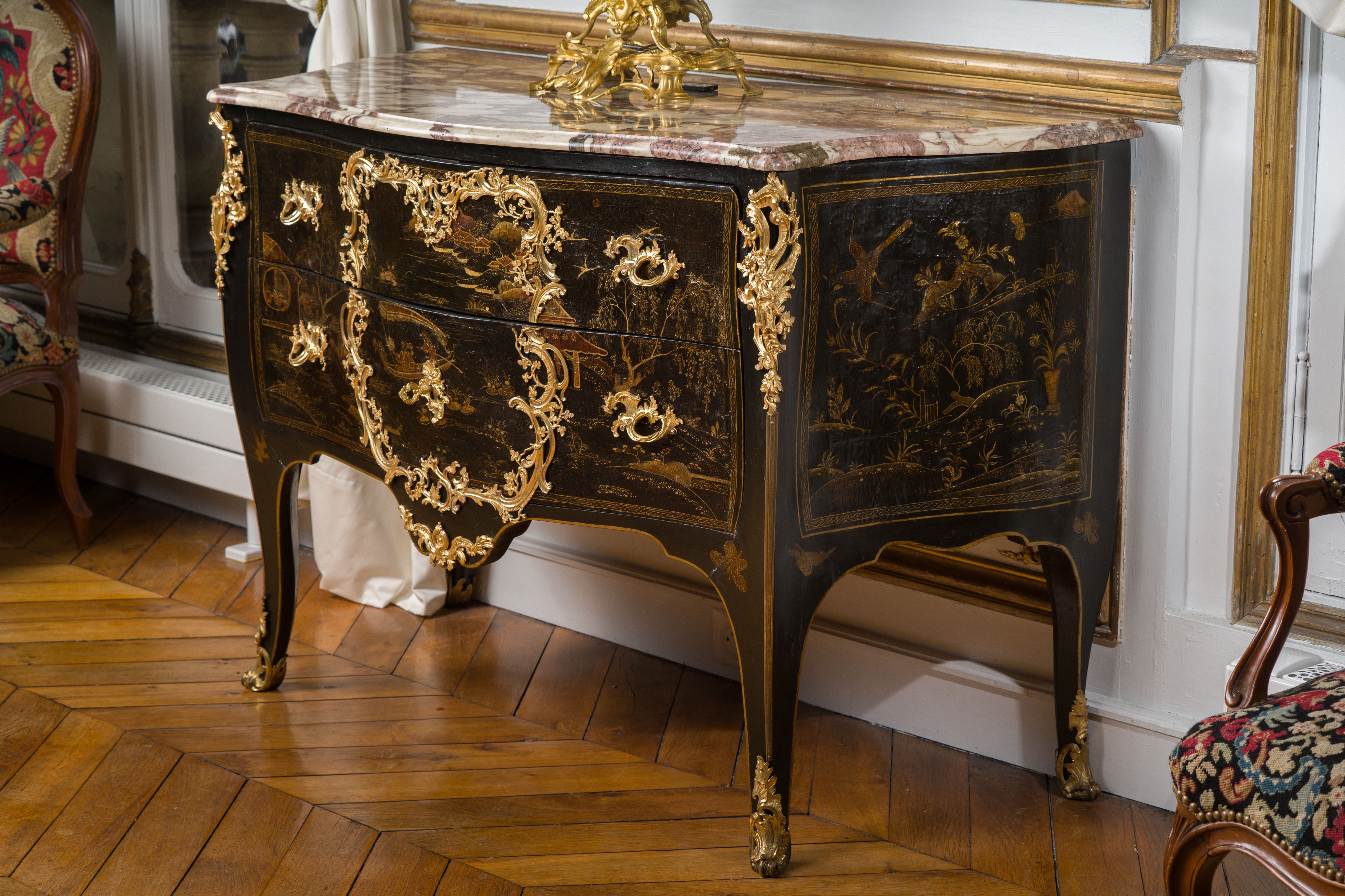 Commode en vernis européen reposant sur quatre pieds galbés. Elle ouvre en façade par deux tiroirs à traverses cachées. Elle est richement garnie de bronzes ajourés, dorés et ciselés en façade par un large cartouche formé par des feuillages et des rinceaux, ainsi qu’en chutes, sur le tablier et sur les poignées de tirage. La commode est surmontée d’un marbre gris des Ardennes mouluré suivant le pourtour du meuble. Epoque Louis XV Restaurations d’usage H. 86 x L. 127 x P. 59 cm