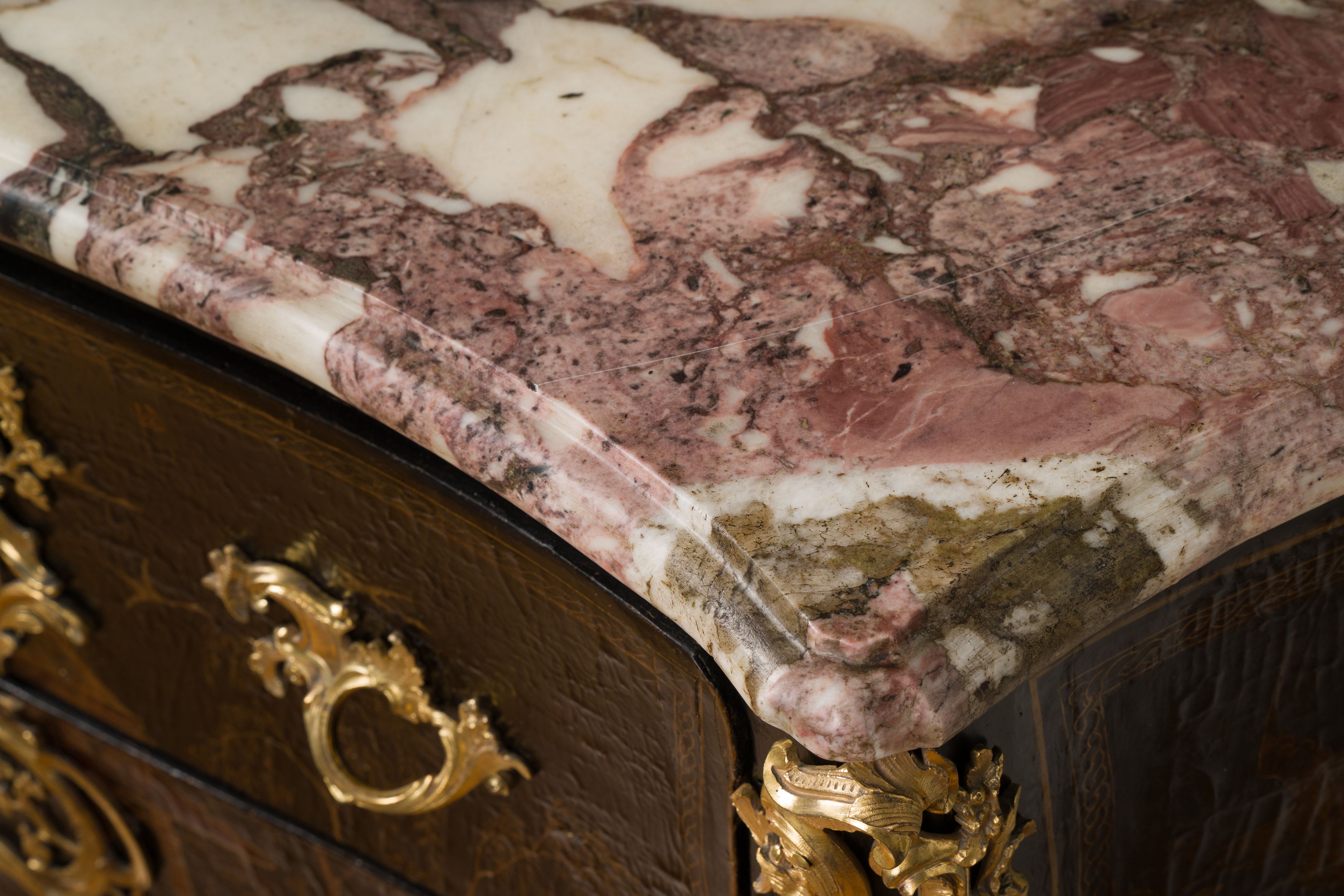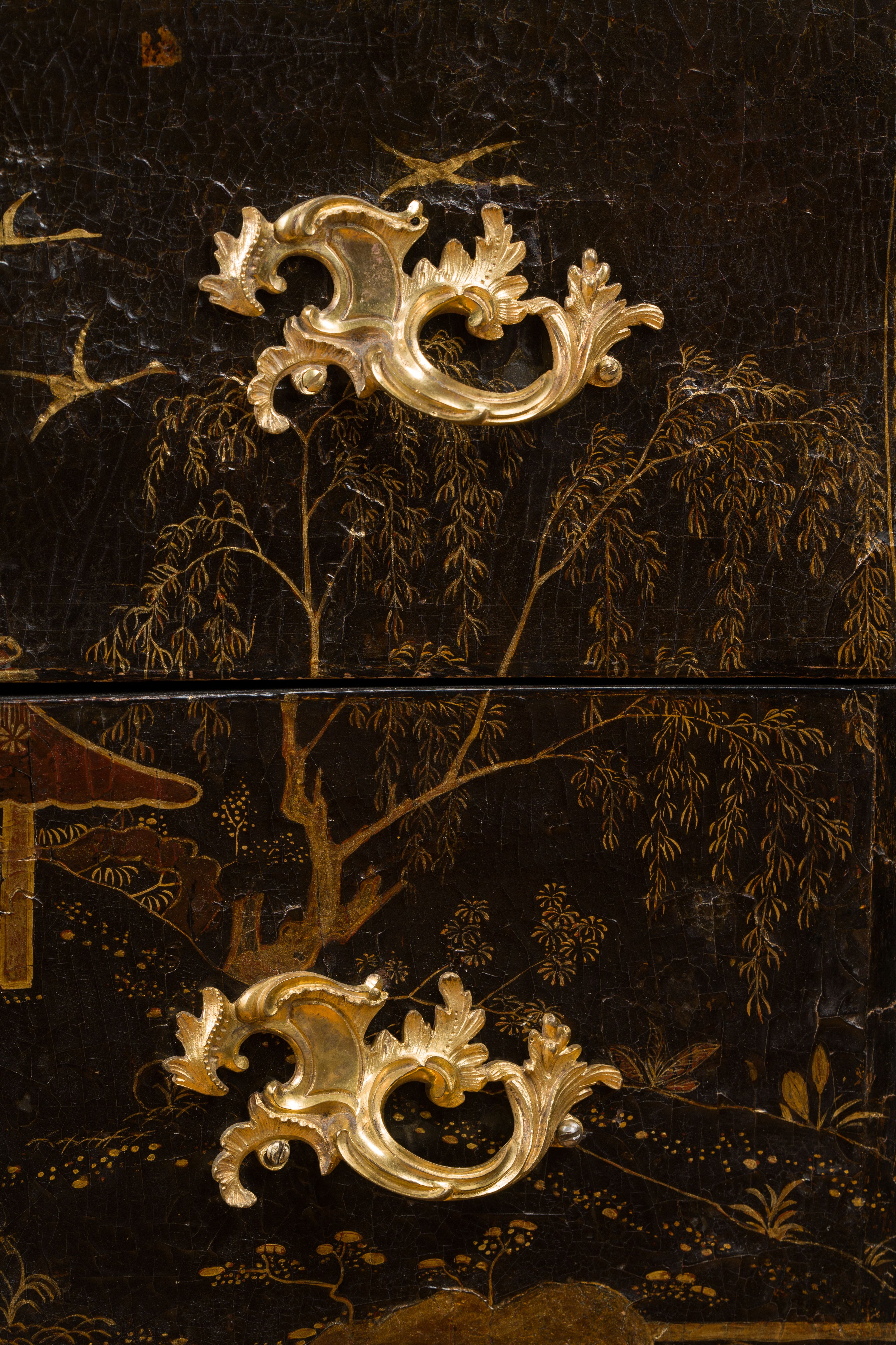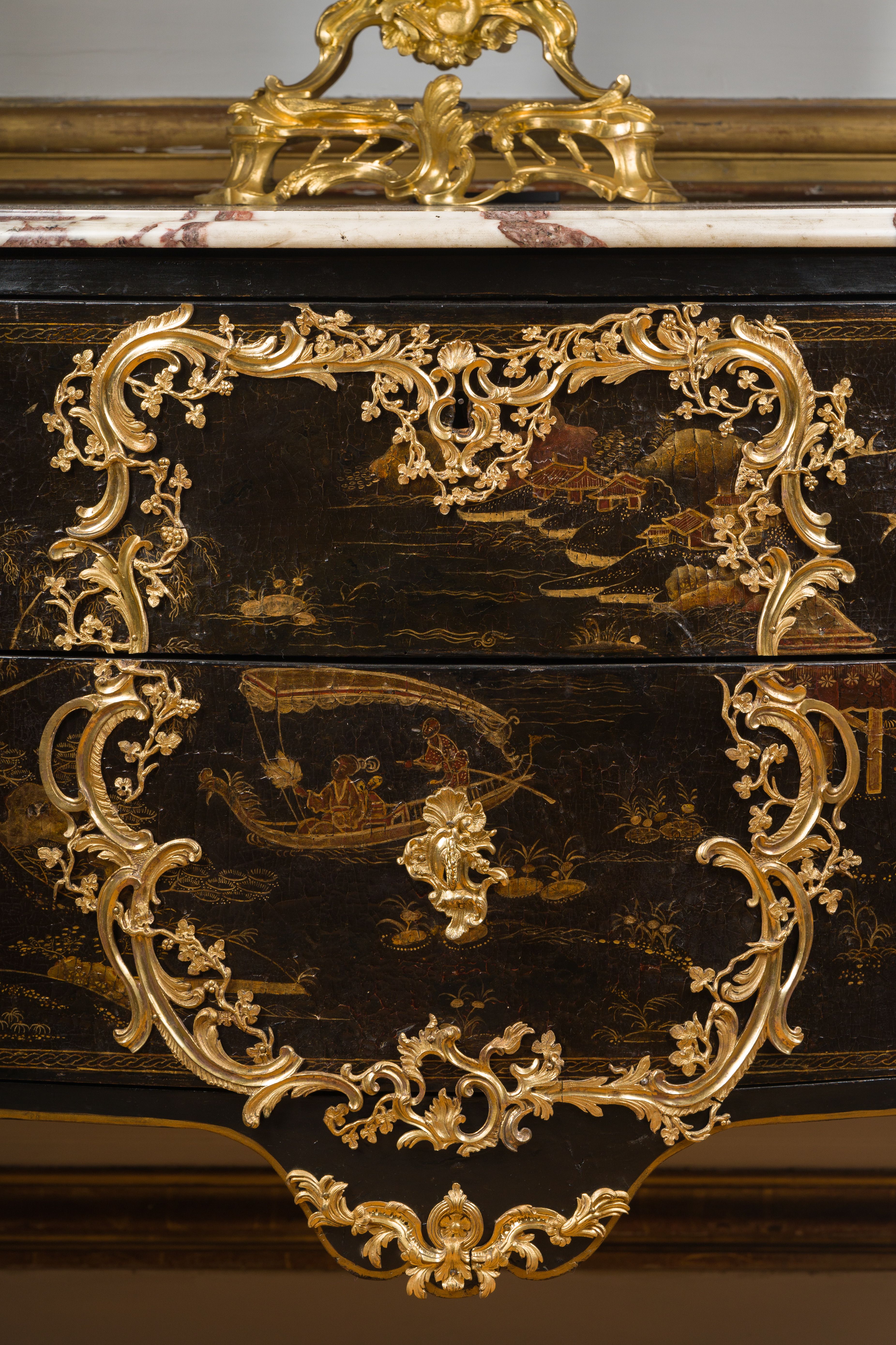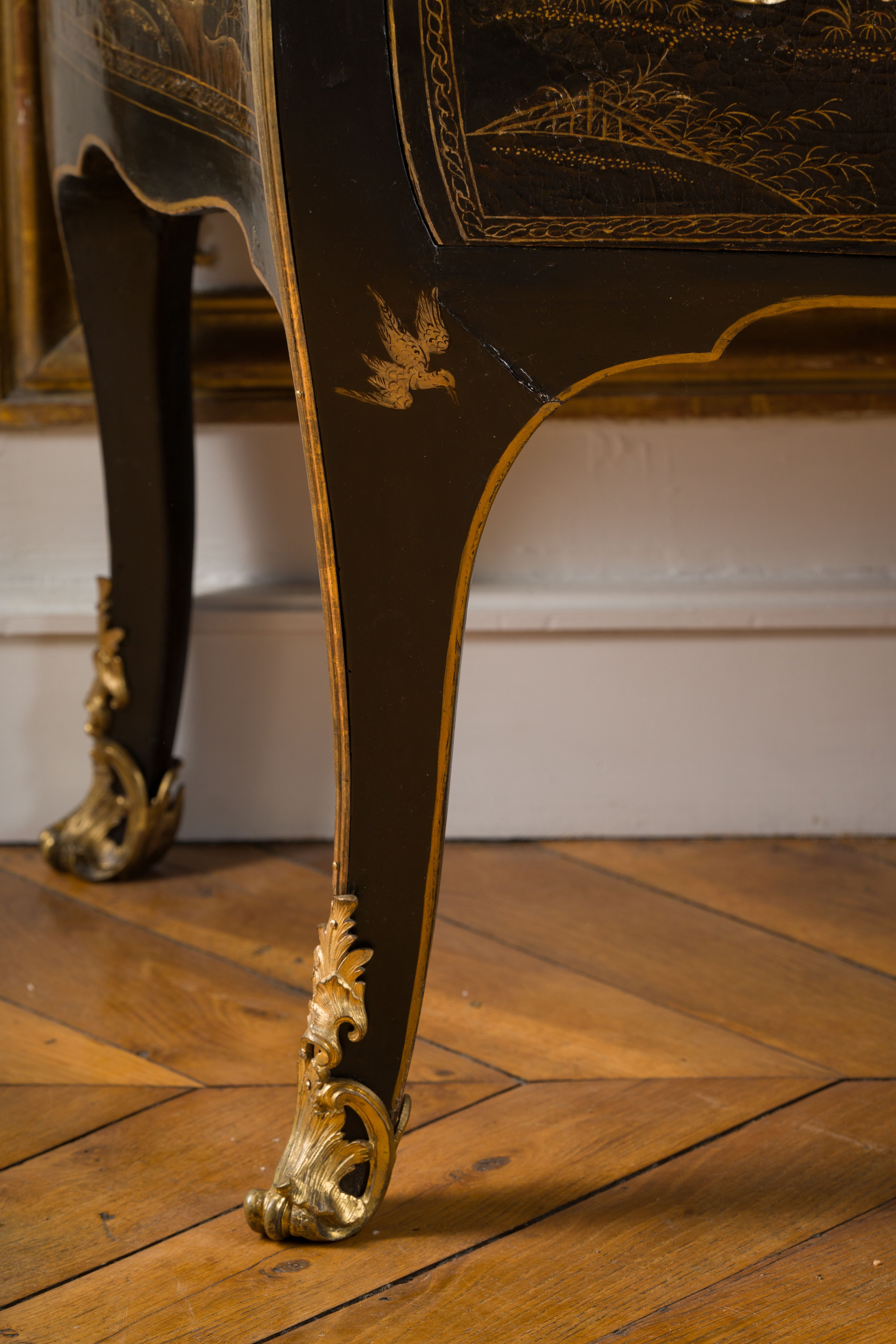 Commode en vernis européen reposant sur quatre pieds galbés. Elle ouvre en façade par deux tiroirs à traverses cachées. Elle est richement garnie de bronzes ajourés, dorés et ciselés en façade par un large cartouche formé par des feuillages et des rinceaux, ainsi qu’en chutes, sur le tablier et sur les poignées de tirage. La commode est surmontée d’un marbre gris des Ardennes mouluré suivant le pourtour du meuble. Epoque Louis XV Restaurations d’usage H. 86 x L. 127 x P. 59 cm