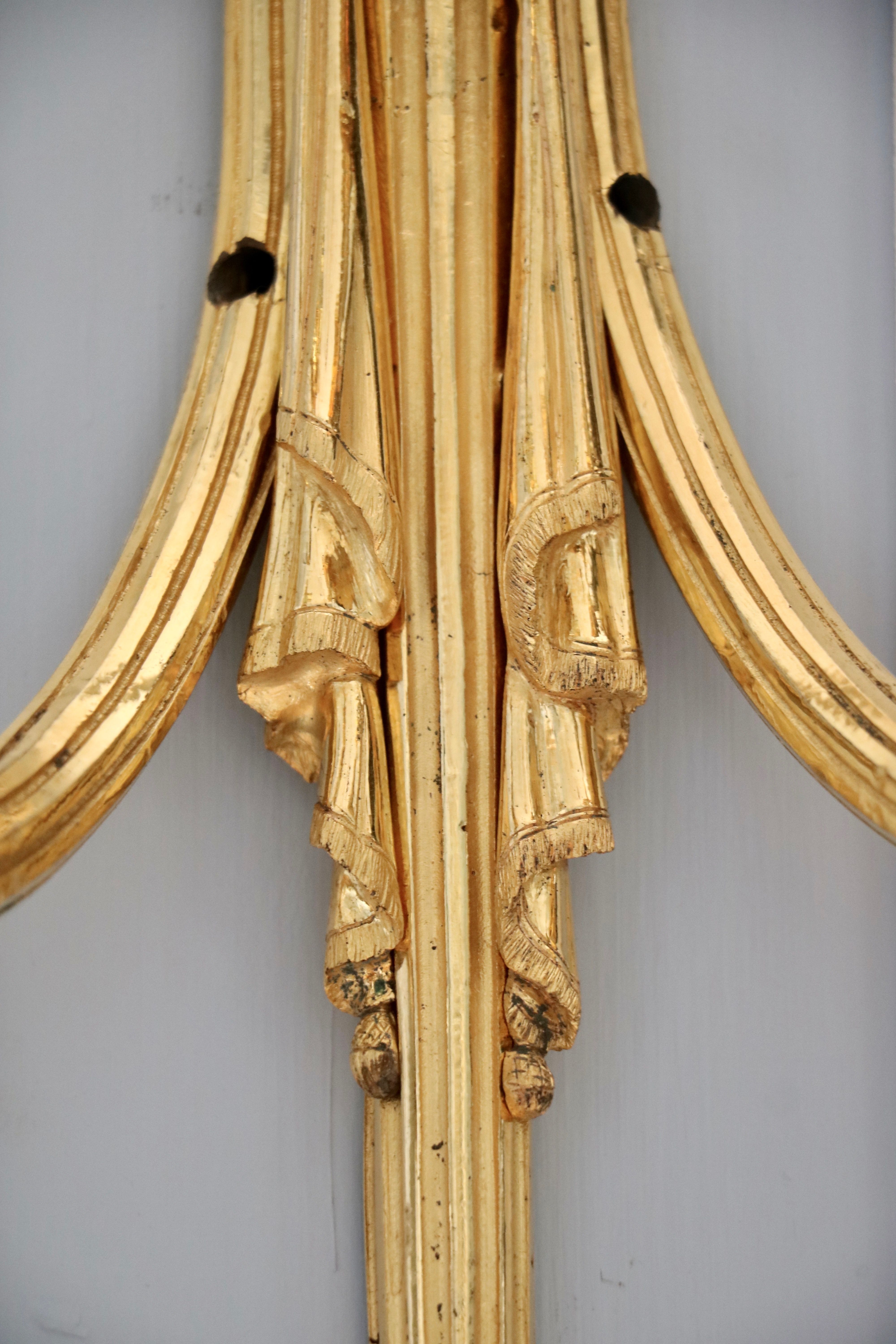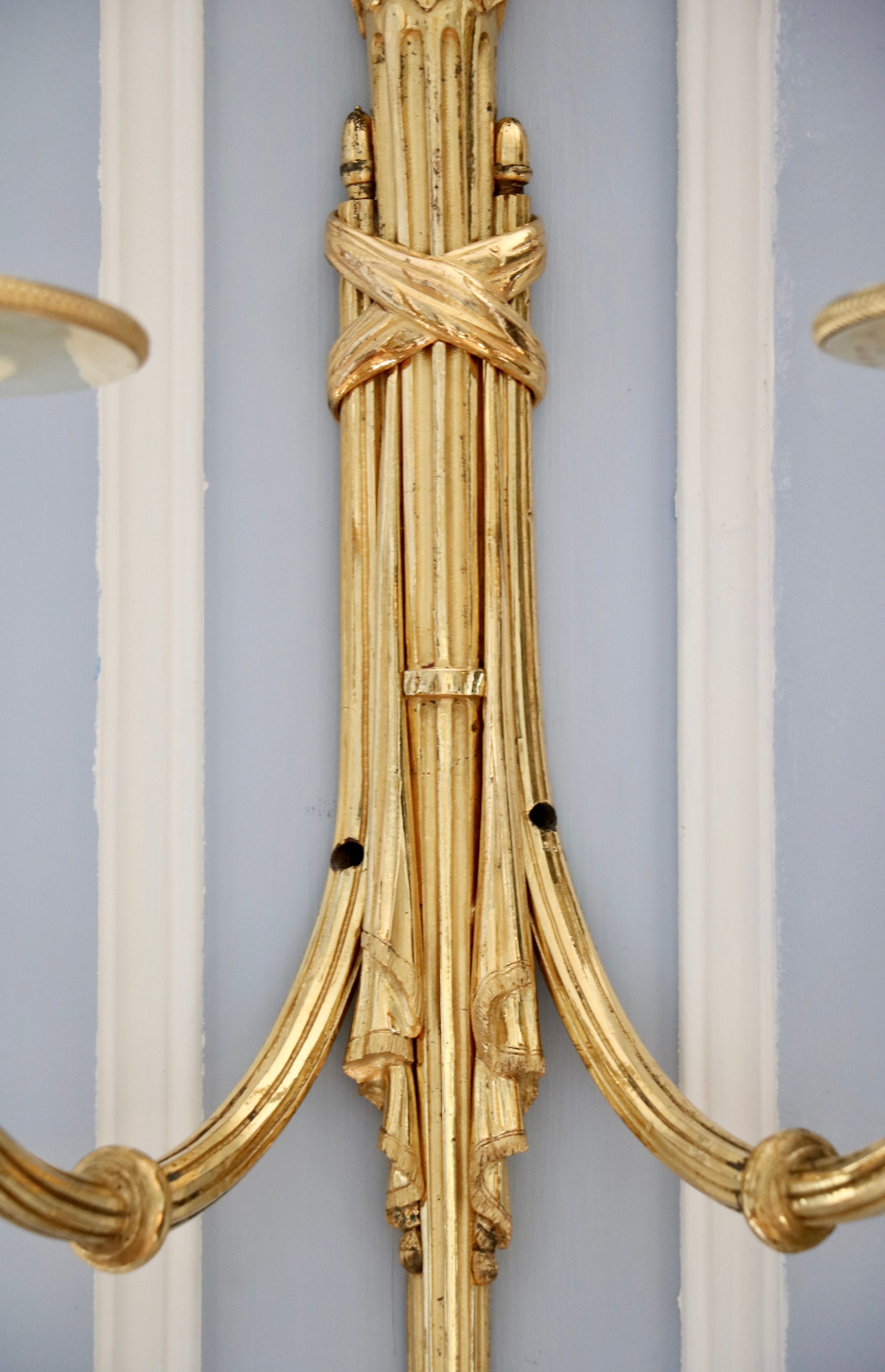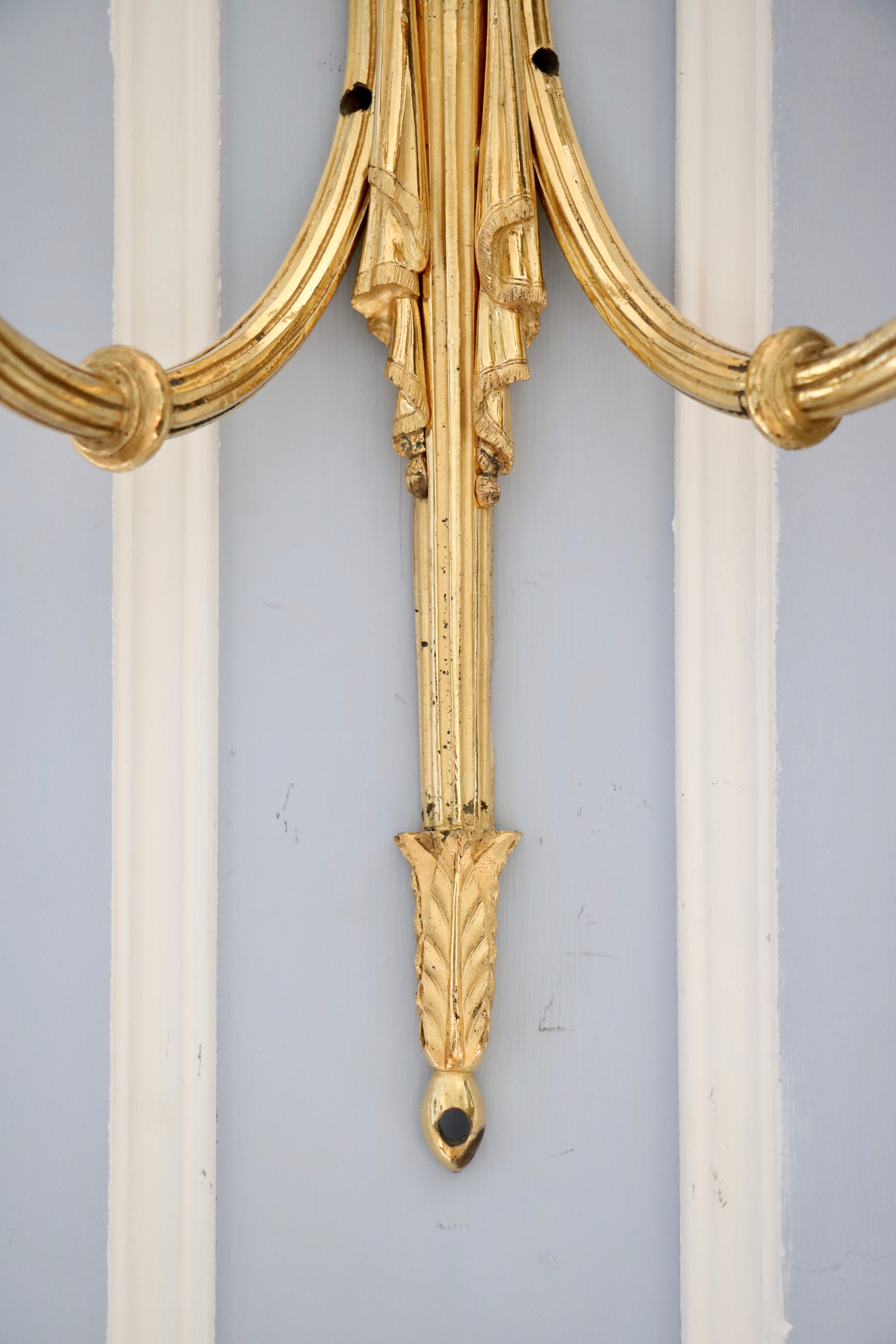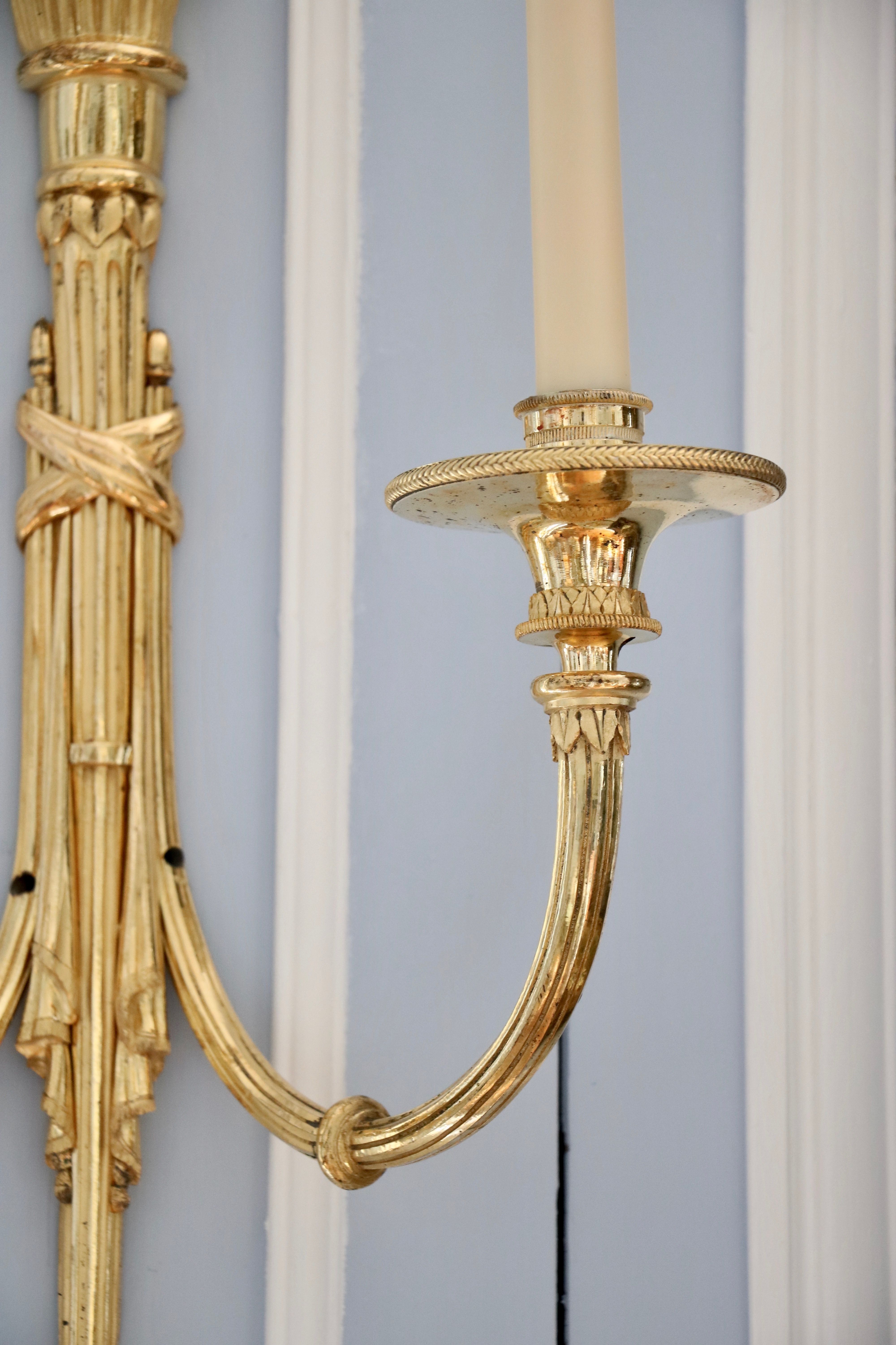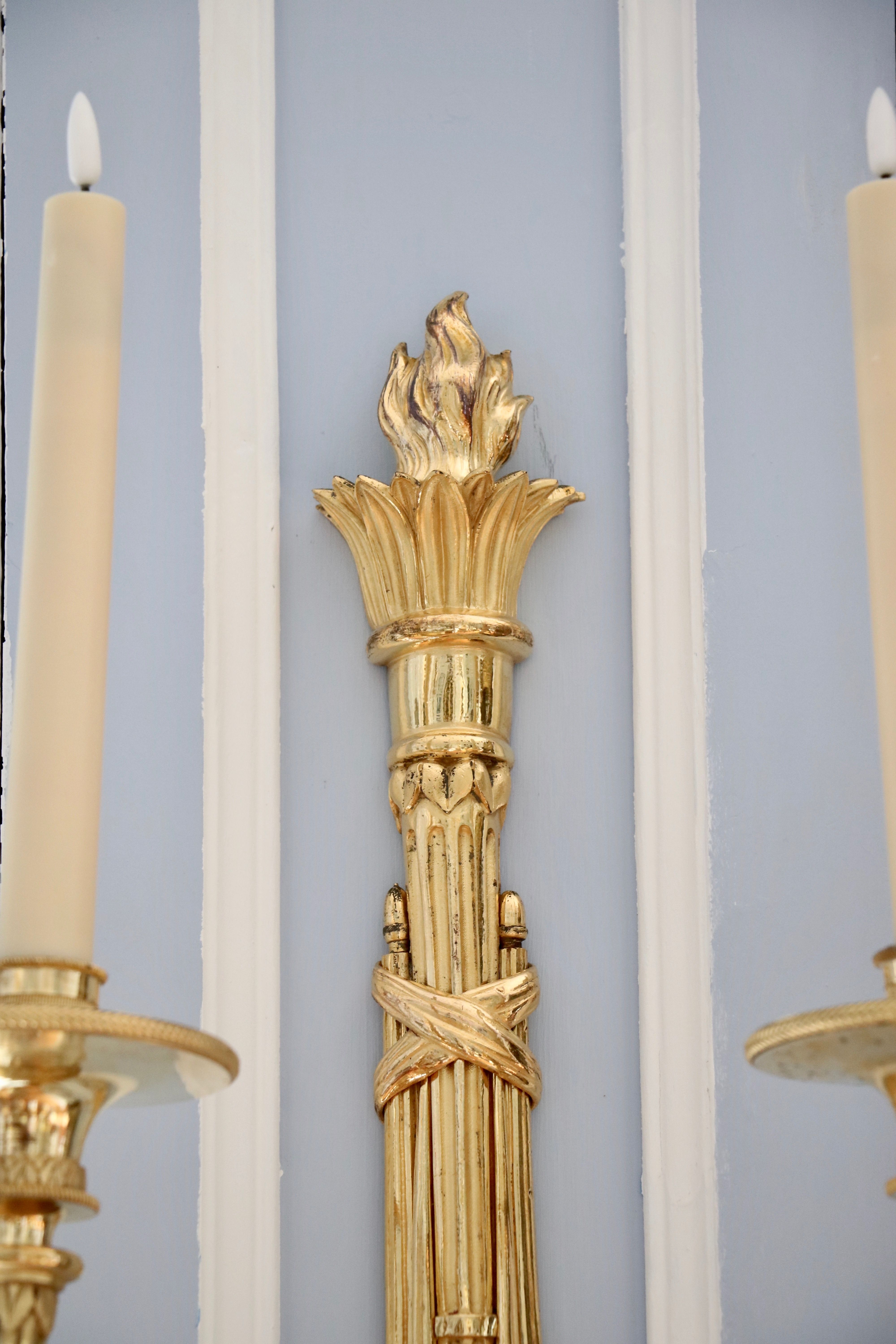 Rare ensemble de quatre appliques en bronze doré et ciselé à deux bras de lumières représentant une torche allumée et drapée, ornée de feuilles stylisées. Epoque Louis XVI Restaurations d’usage H. 53 x L. 31 x P. 20 cm
