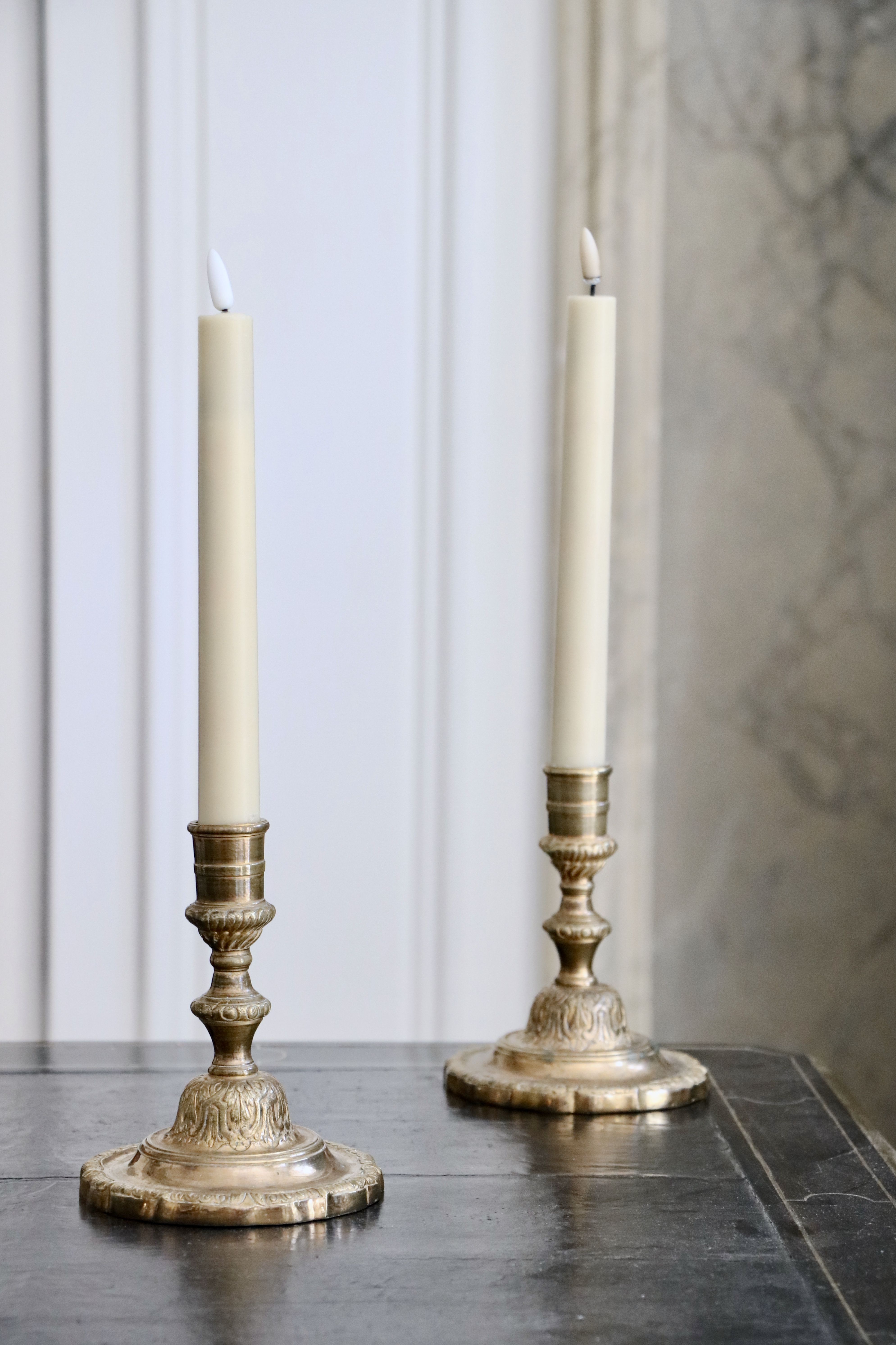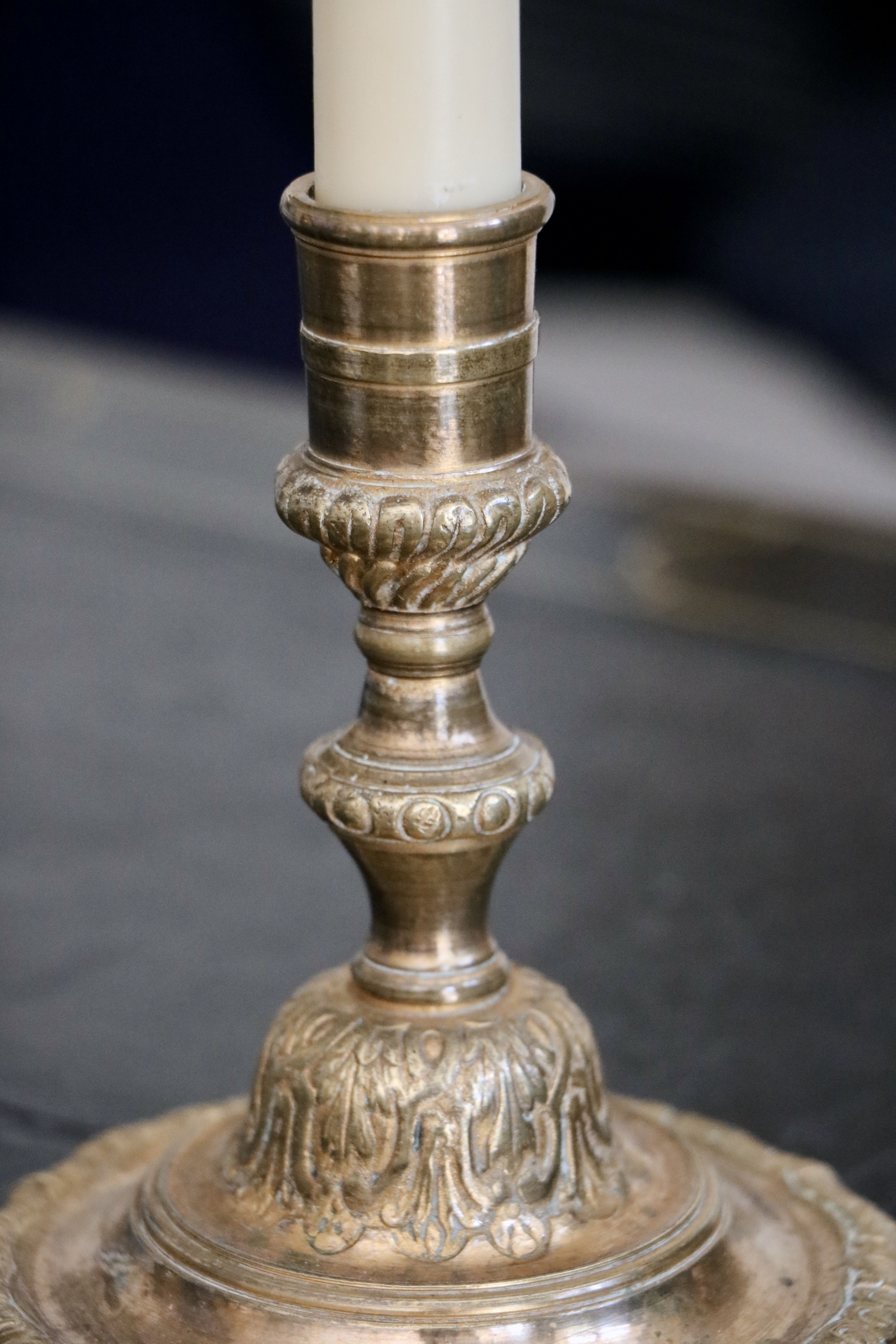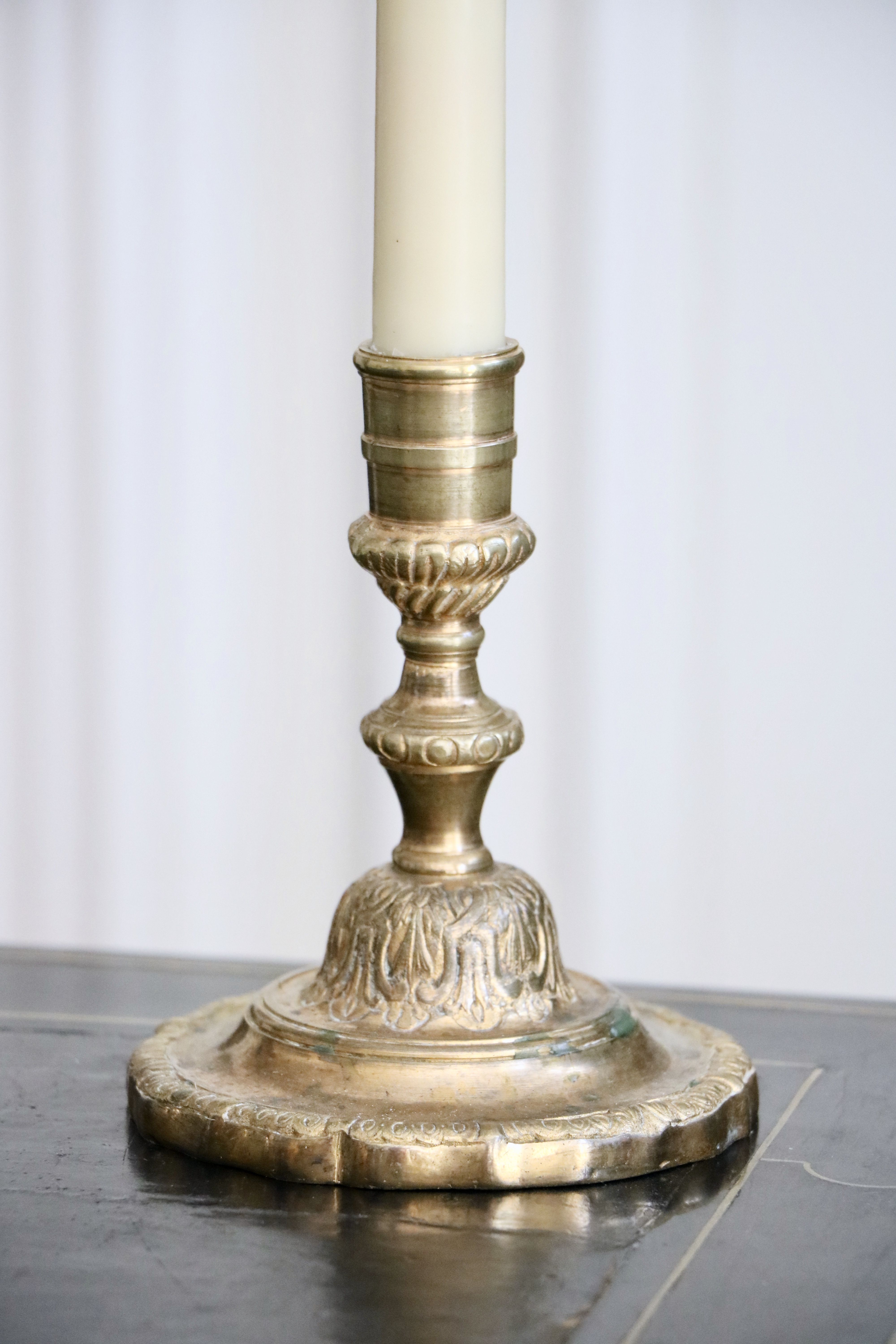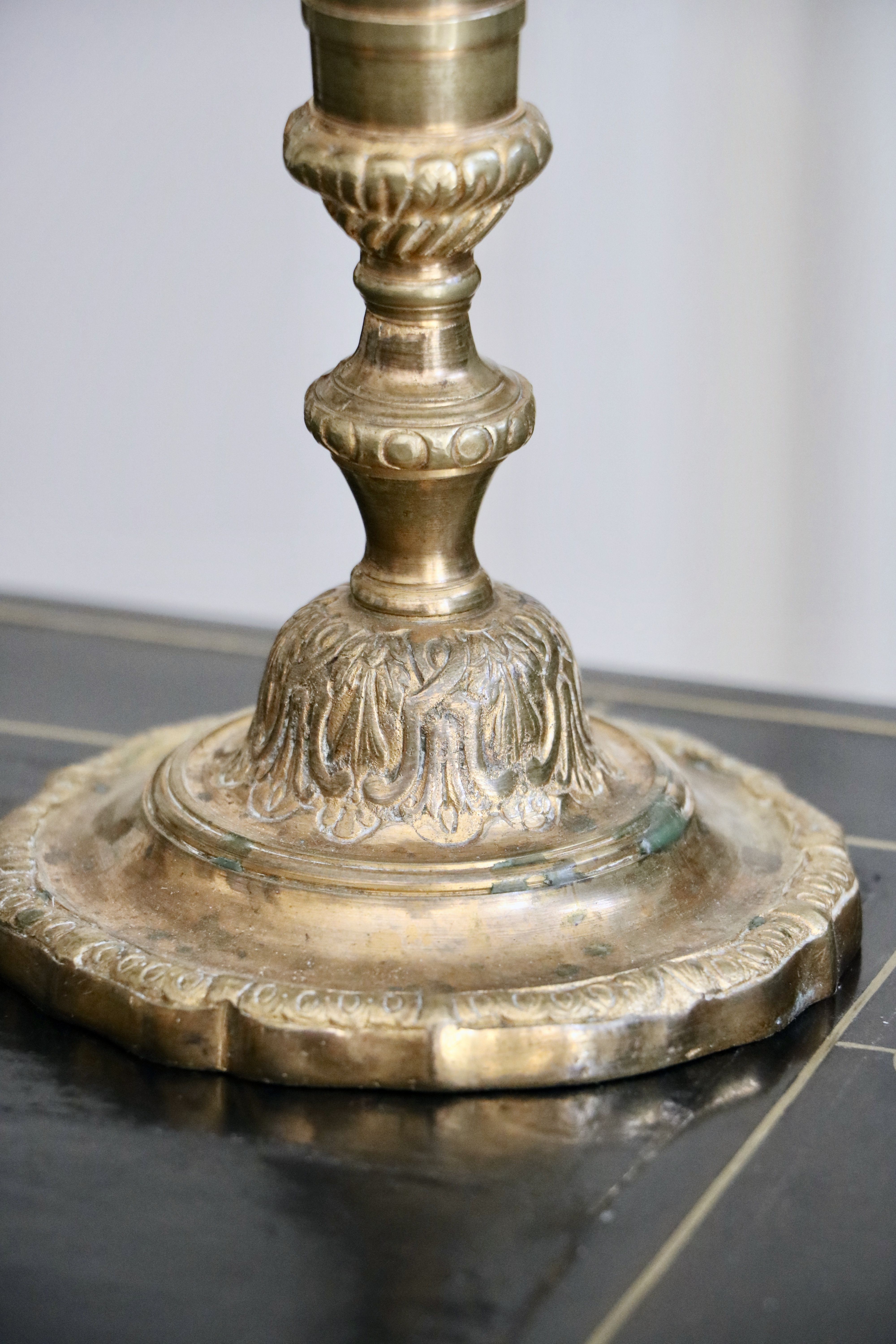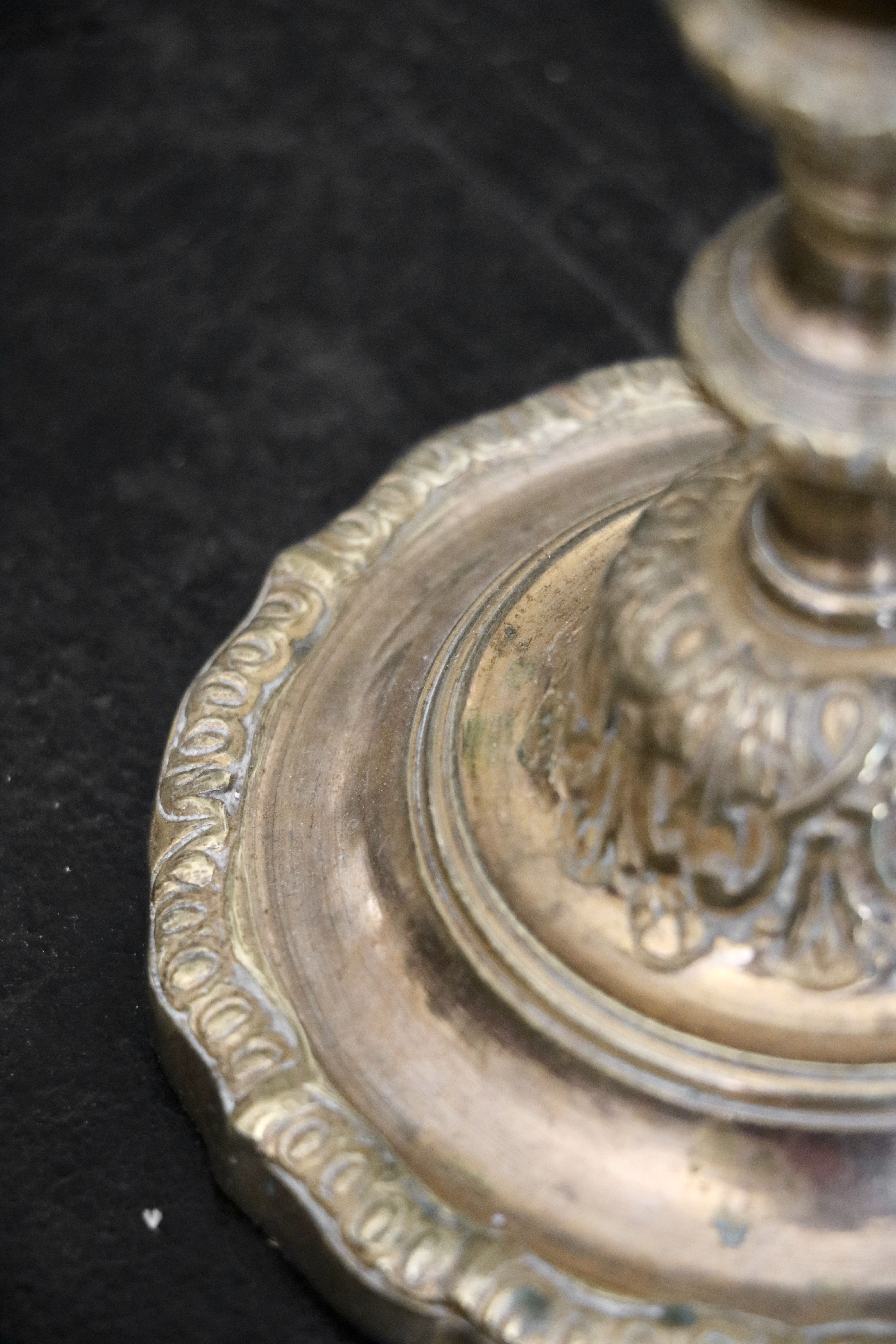 Paire de Bougeoirs en bronze doré à décor à la bérain. Epoque Régence Restaurations d'usage H. 15 x D. 11,5 cm