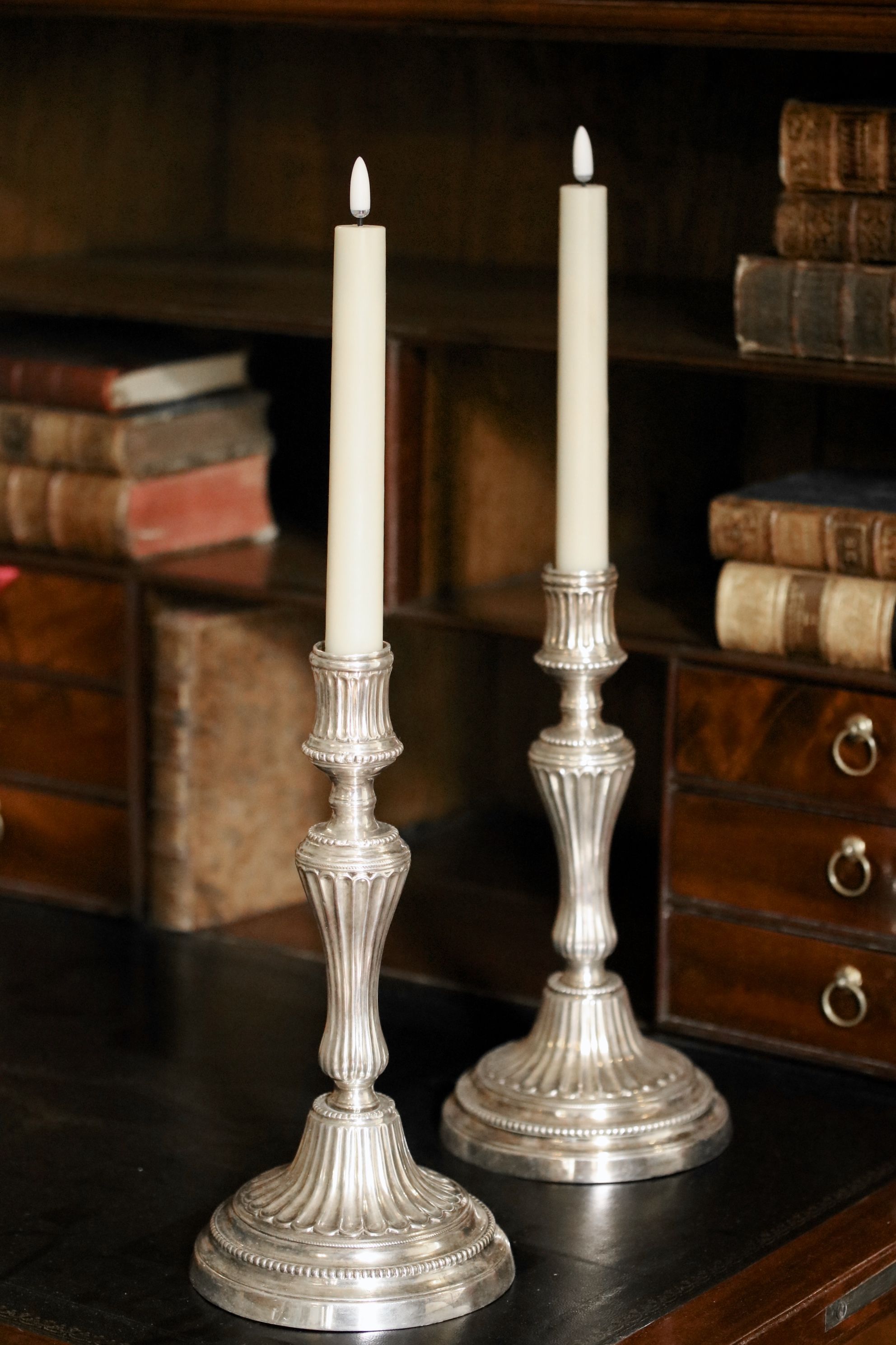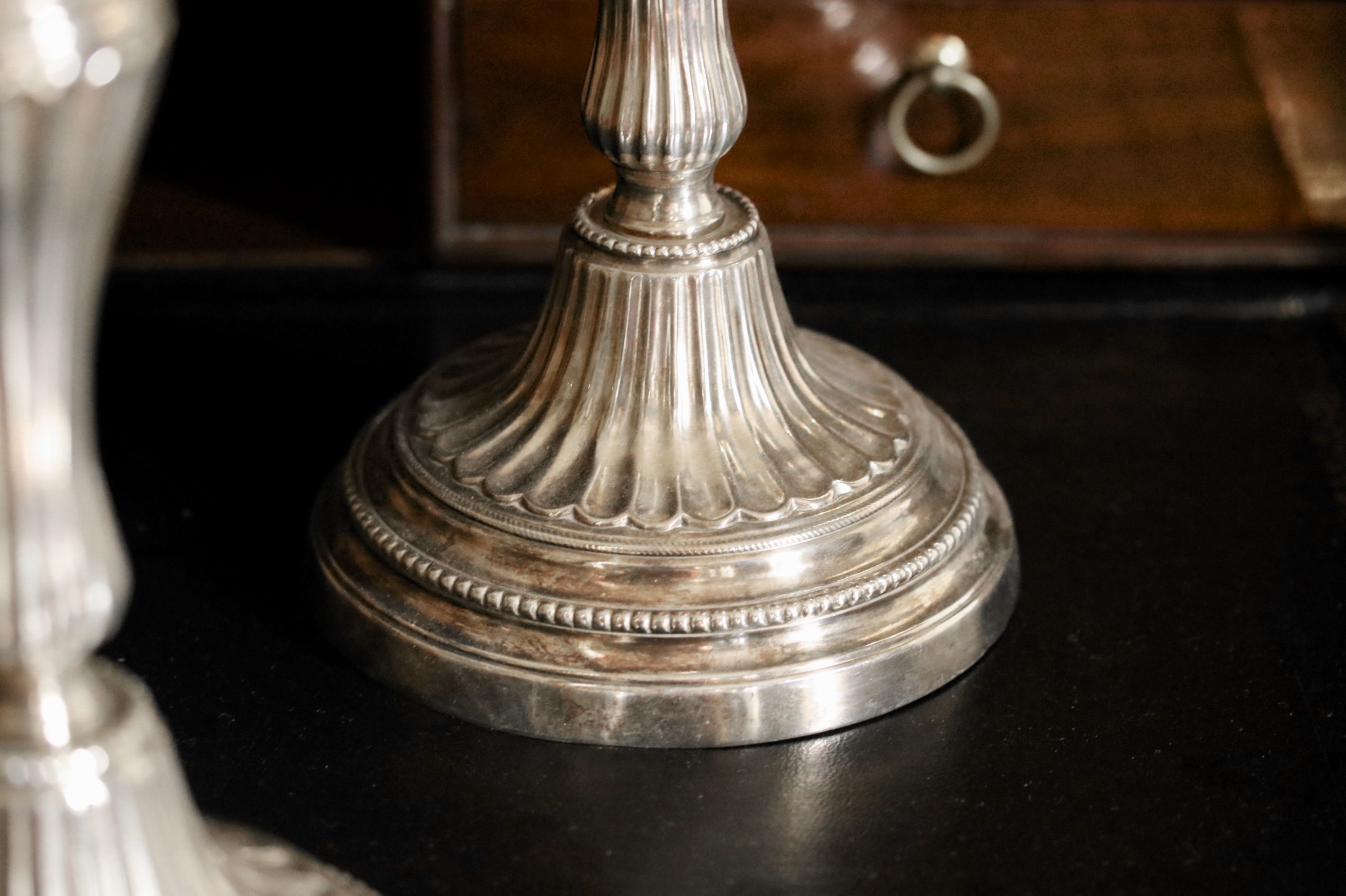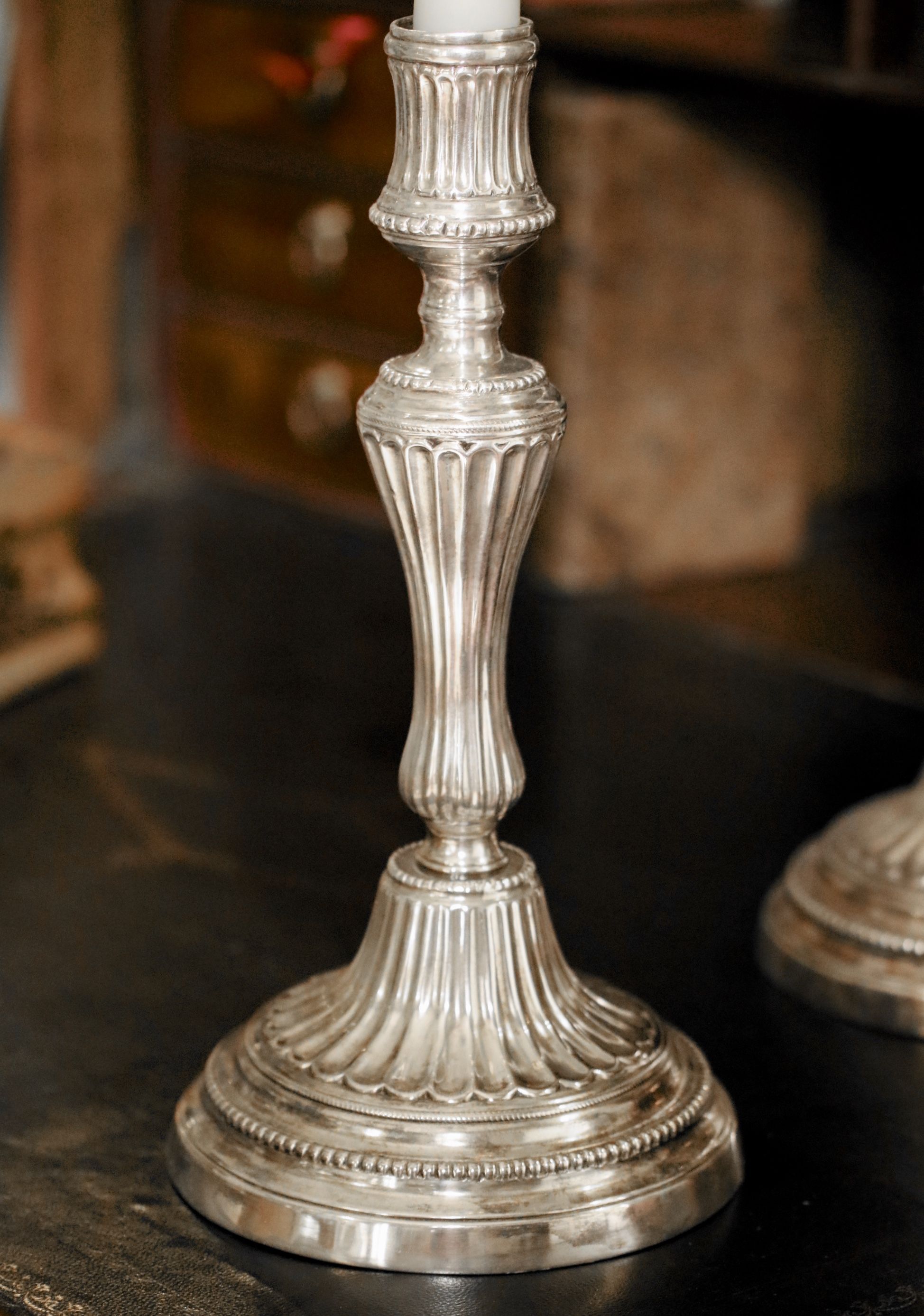 Paire de bougeoirs en métal argenté. Vers 1770 Restaurations d'usage H. 27 x D. 13,5 cm