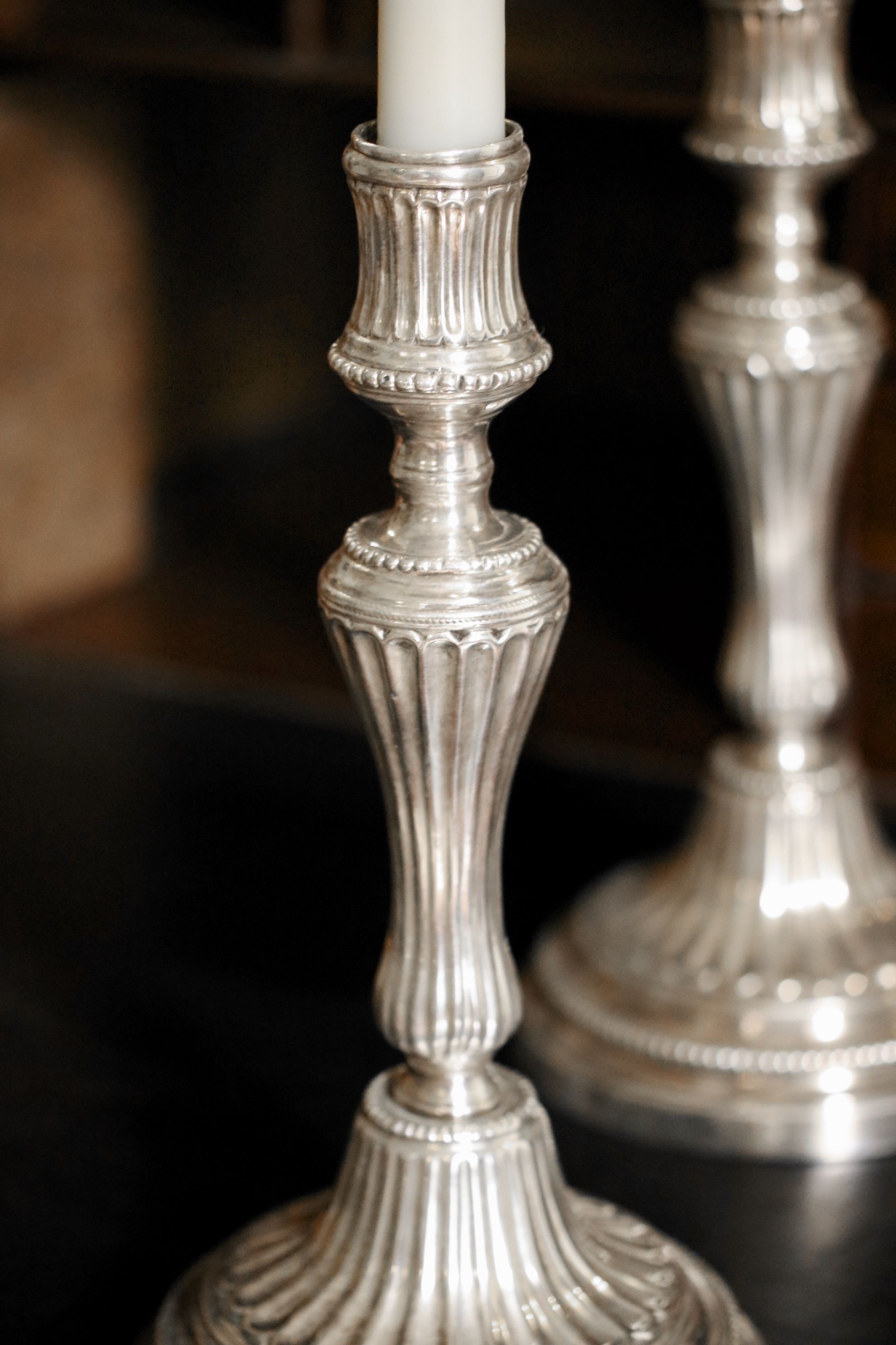 Ce modèle serait un héritage classicisant du travail de l’ornemaniste Meissonier, un italien qui émigre en France, pour devenir, en 1724, « orfèvre du roi ». Son goût pour un rocaille très exubérant ne lui permet pas de faire sa place dans les arts majeurs comme l’architecture, mais son travail d’ornemaniste laisse une empreinte profonde dans les arts décoratifs. Notre paire de bougeoirs pourrait s’inspirer du flambeau rocaille au modèle de tulipe, tel celui gravé par Huquier dans son OEuvre de Meissonier . Sur l’objet de notre étude, les rinceaux d’acanthes ont laissé place à un décor à canaux assagi mais qui suit, sur le vase et le fût du flambeau, un mouvement concave rappelant les galbes du modèle de Meissonier (Chandeliers et Flambeaux du XVIIIe siècle français, Bérengère Disdier Defaÿ).