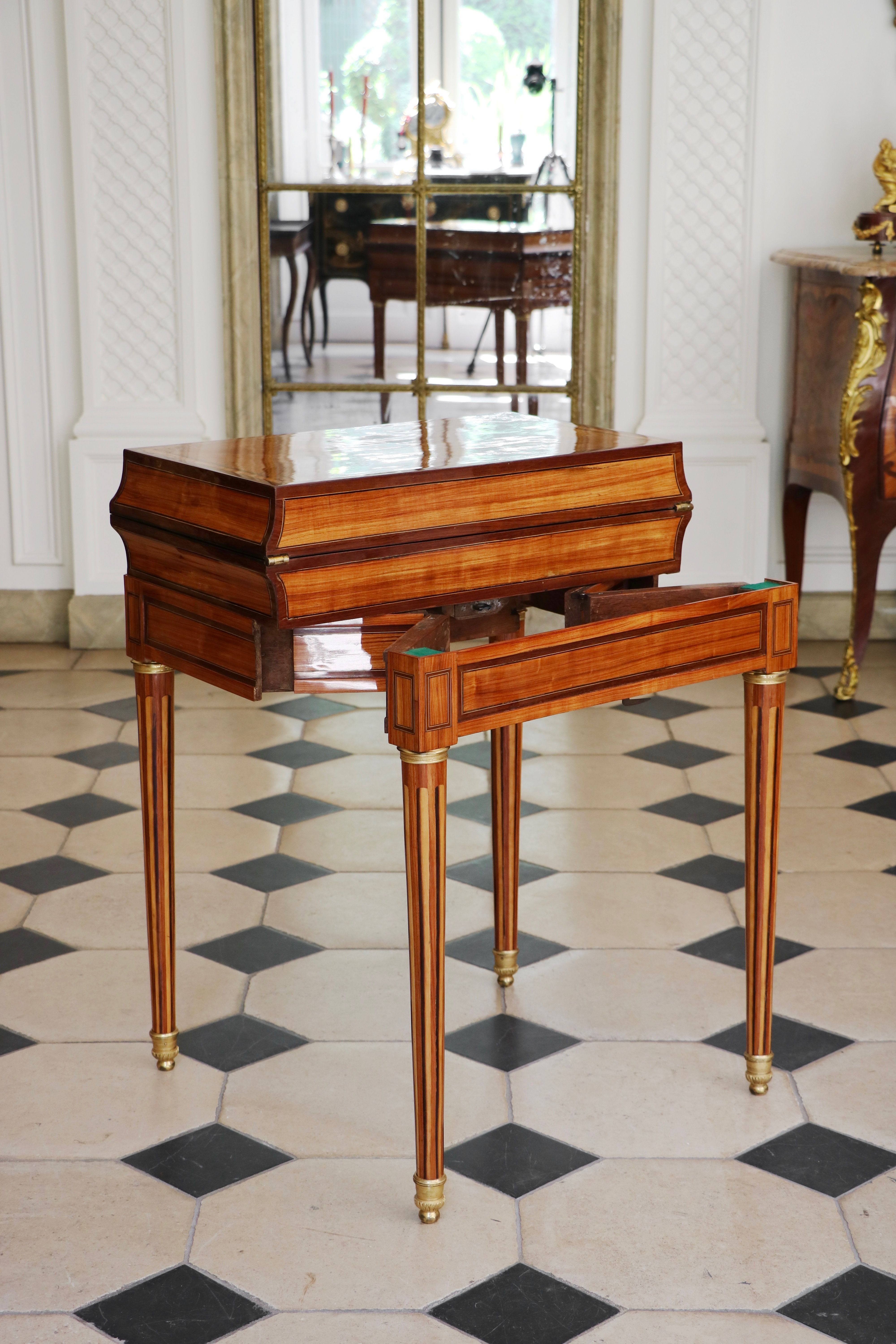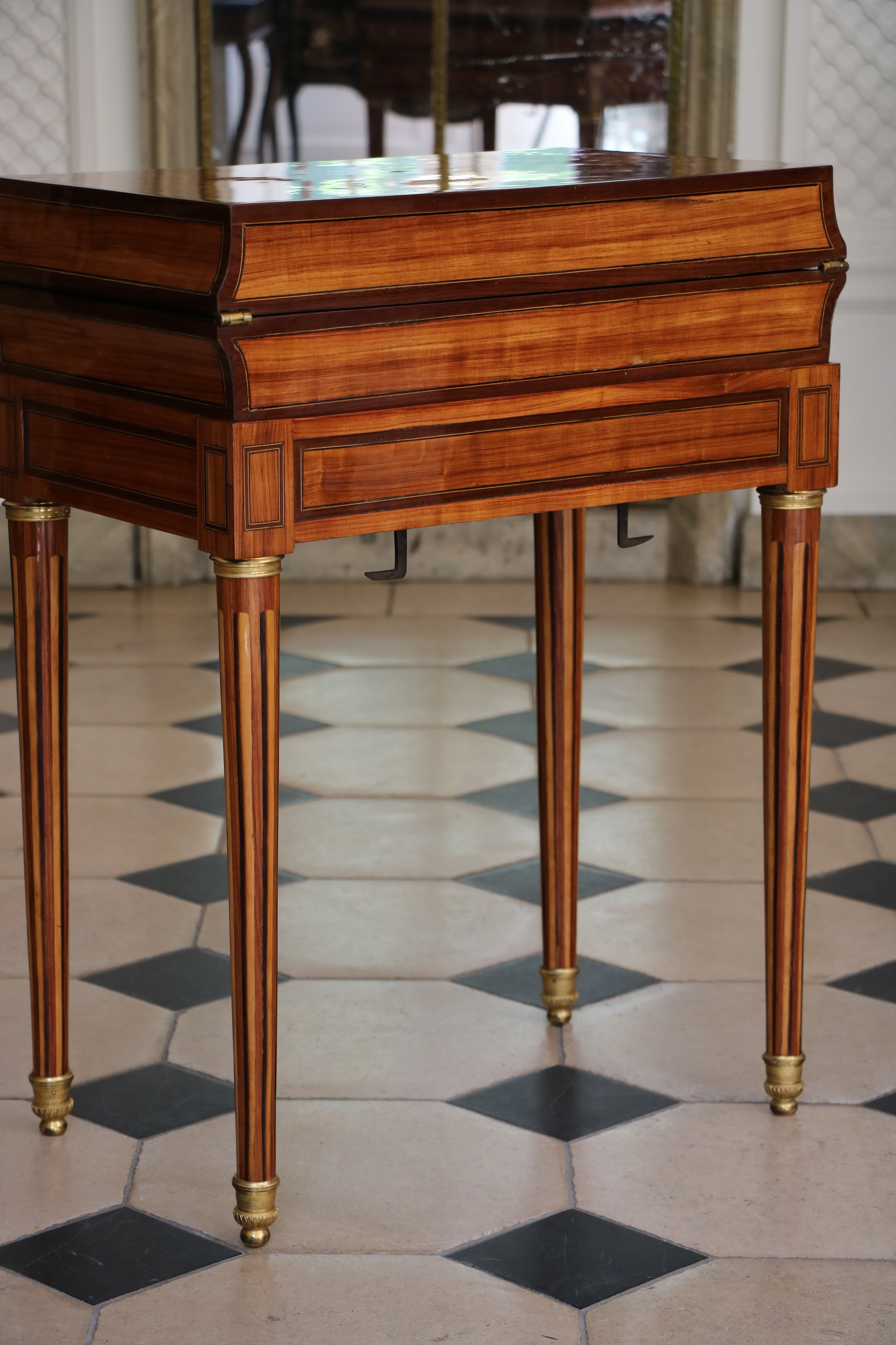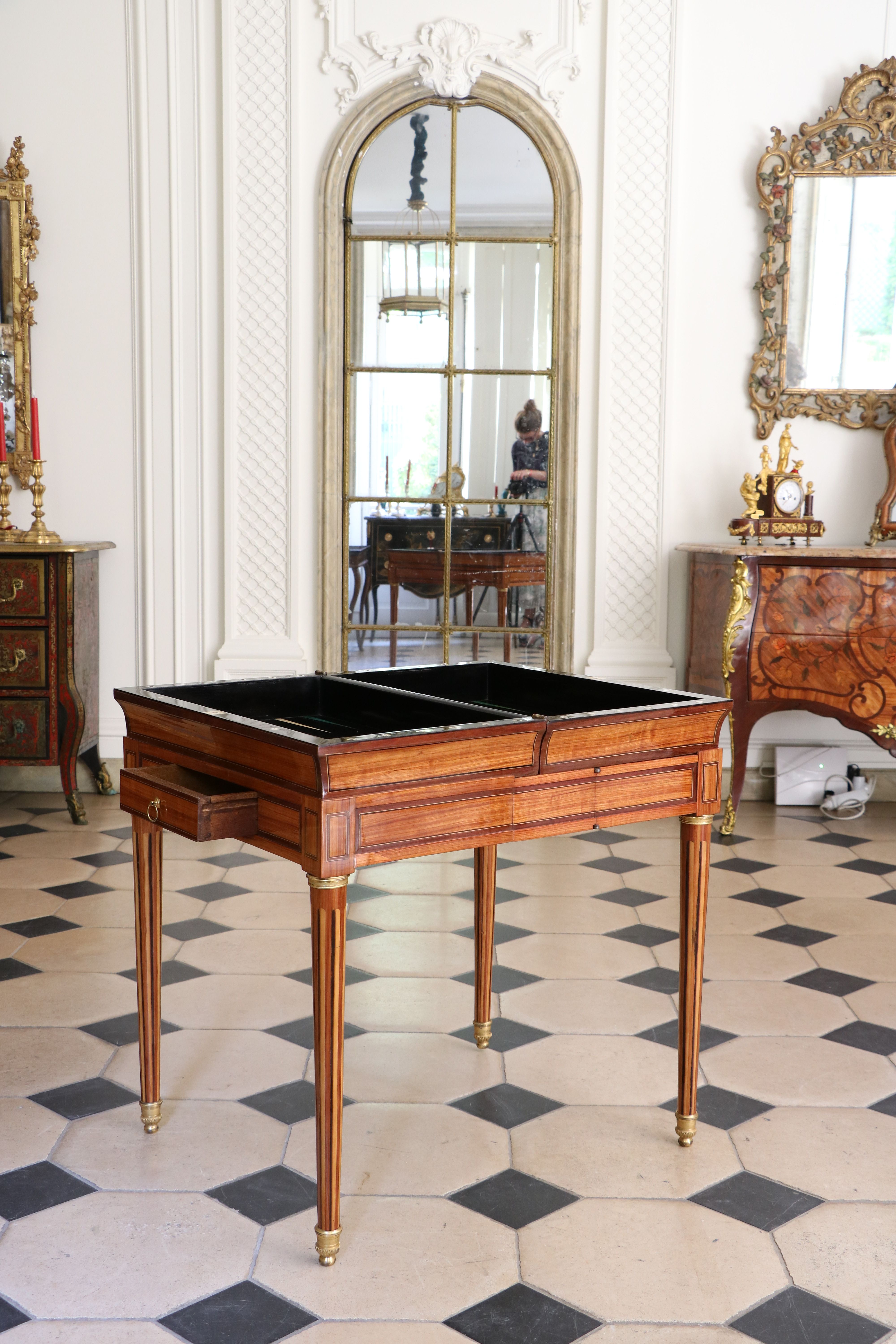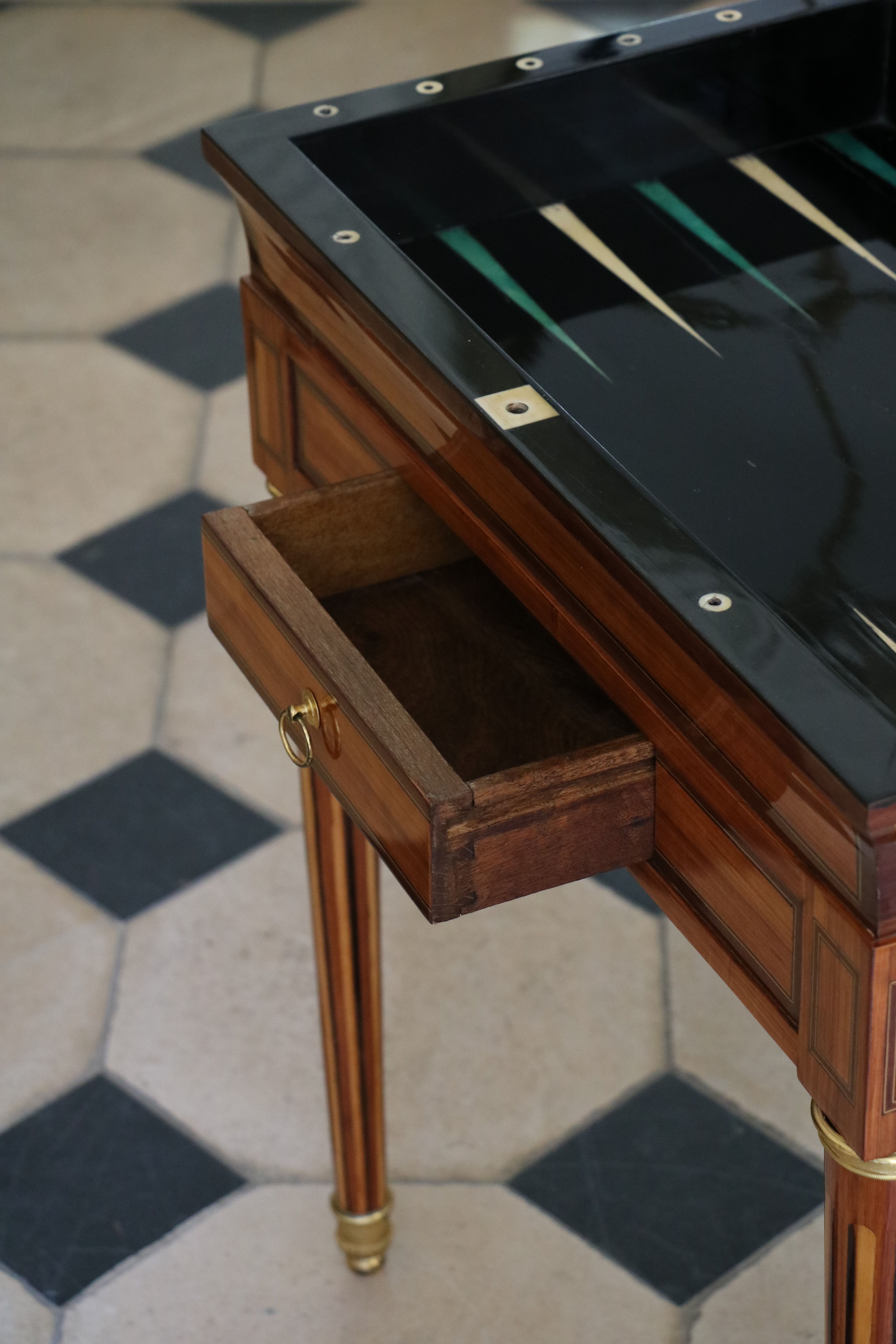Rare table tric-trac marquetée de bois de rose, d’amarante, d’ébène, et d’os en partie teintée en vert. Les marqueteries sont en réserves et forment des filets rectangulaires. Elle repose sur quatre pieds fuselés marquetés de fausses cannelures. La partie haute s'ouvre et laisse entrevoir un tric-trac. Cette partie du coffre repose alors sur les pieds articulés qui se déplient. La table à jeux est garnie de bronzes dorés et ciselés en sabot et en bague au-dessus des pieds. Estampillée Avril Epoque Louis XVI Restaurations d’usage H. 60 x L. 37 x P. 74 cm