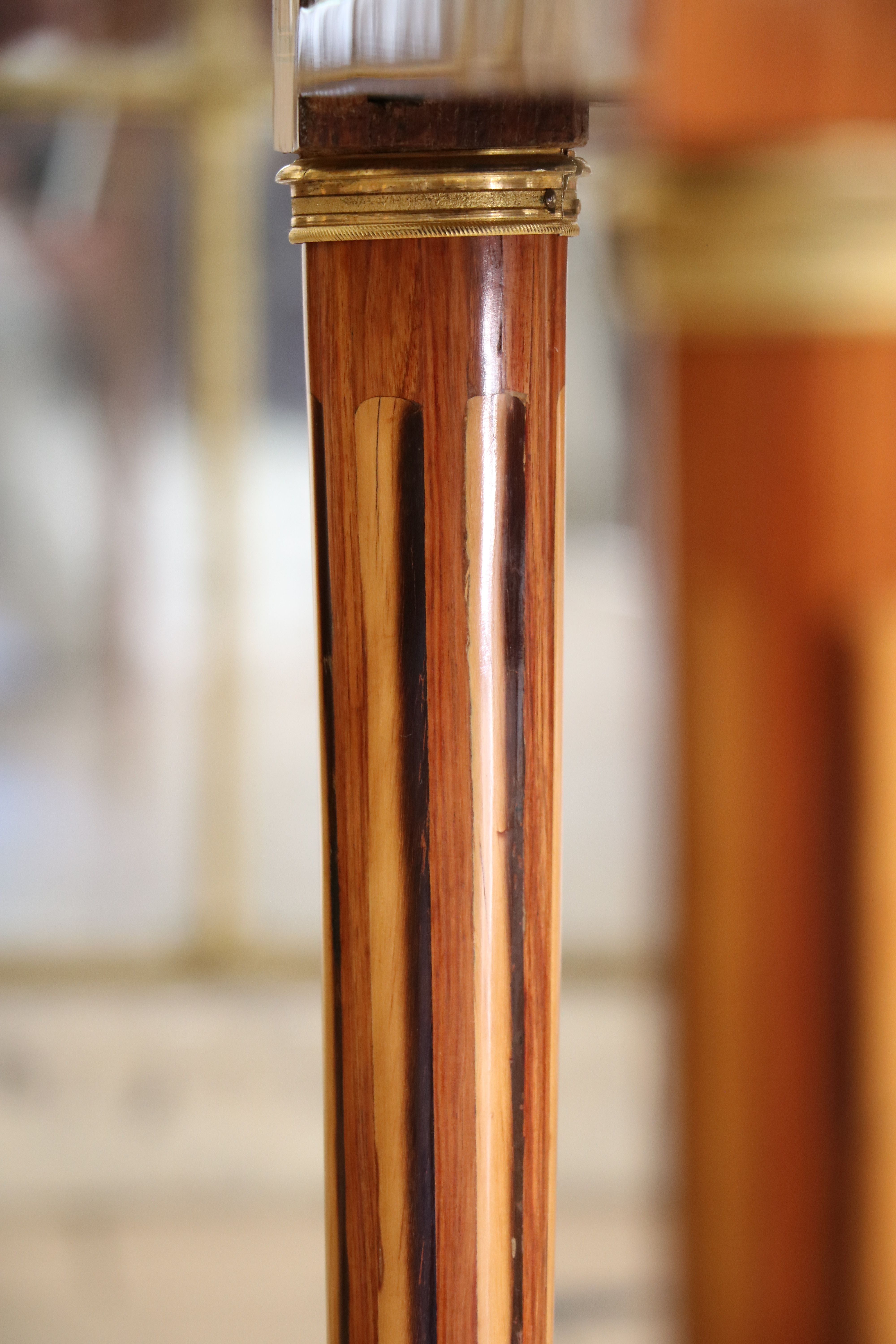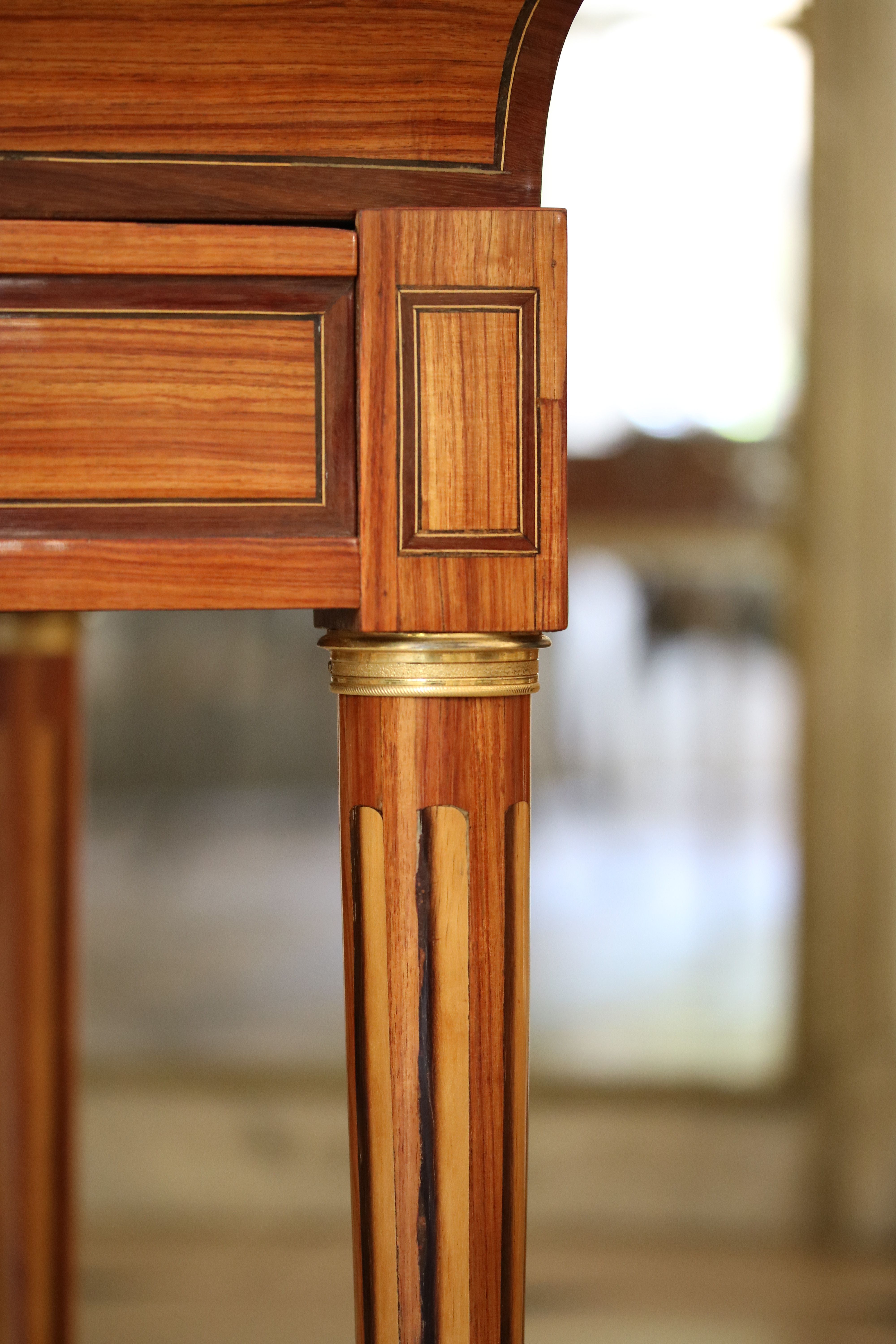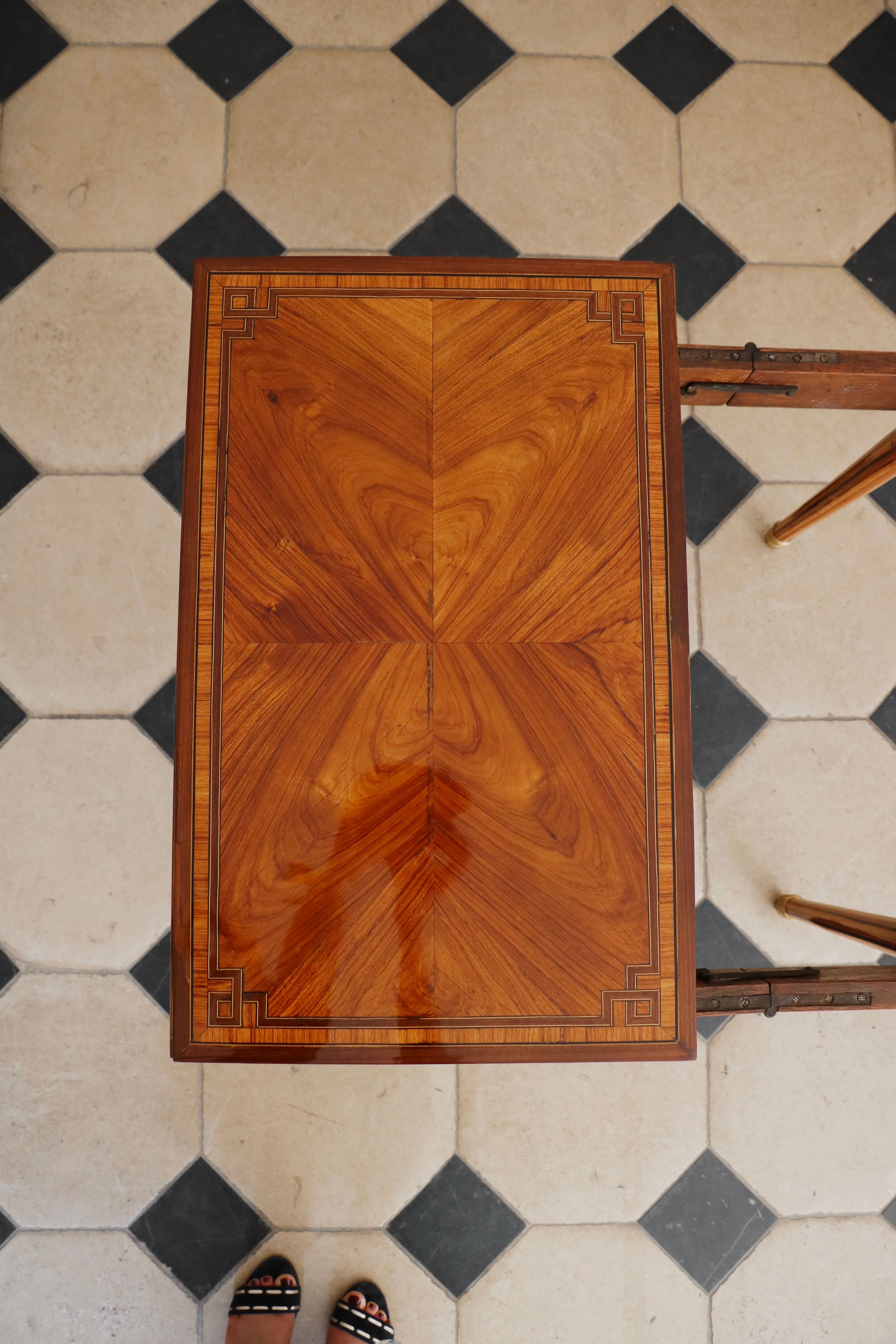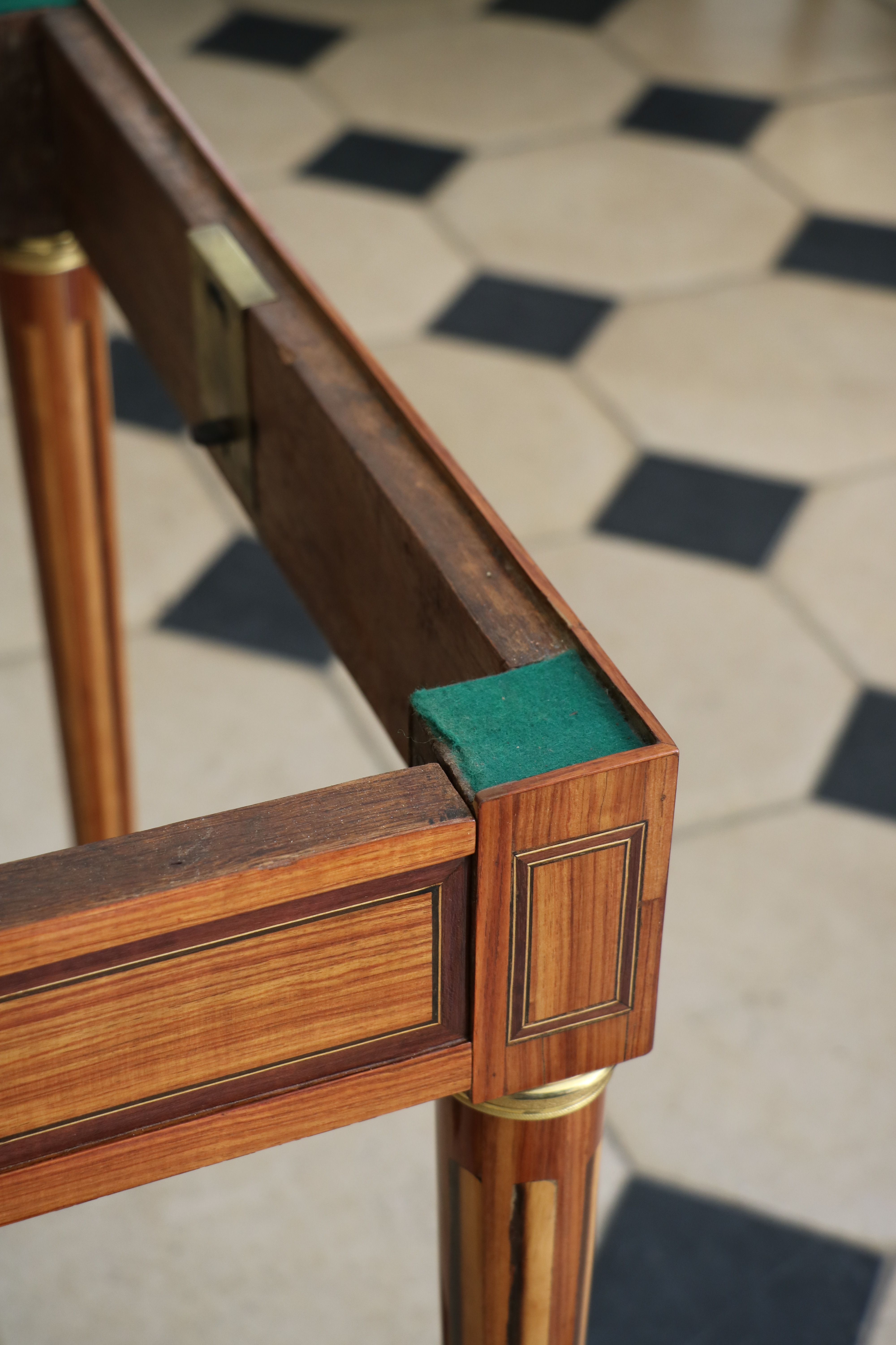 Rare table tric-trac marquetée de bois de rose, d’amarante, d’ébène, et d’os en partie teintée en vert. Les marqueteries sont en réserves et forment des filets rectangulaires. Elle repose sur quatre pieds fuselés marquetés de fausses cannelures. La partie haute s'ouvre et laisse entrevoir un tric-trac. Cette partie du coffre repose alors sur les pieds articulés qui se déplient. La table à jeux est garnie de bronzes dorés et ciselés en sabot et en bague au-dessus des pieds. Estampillée Avril Epoque Louis XVI Restaurations d’usage H. 60 x L. 37 x P. 74 cm