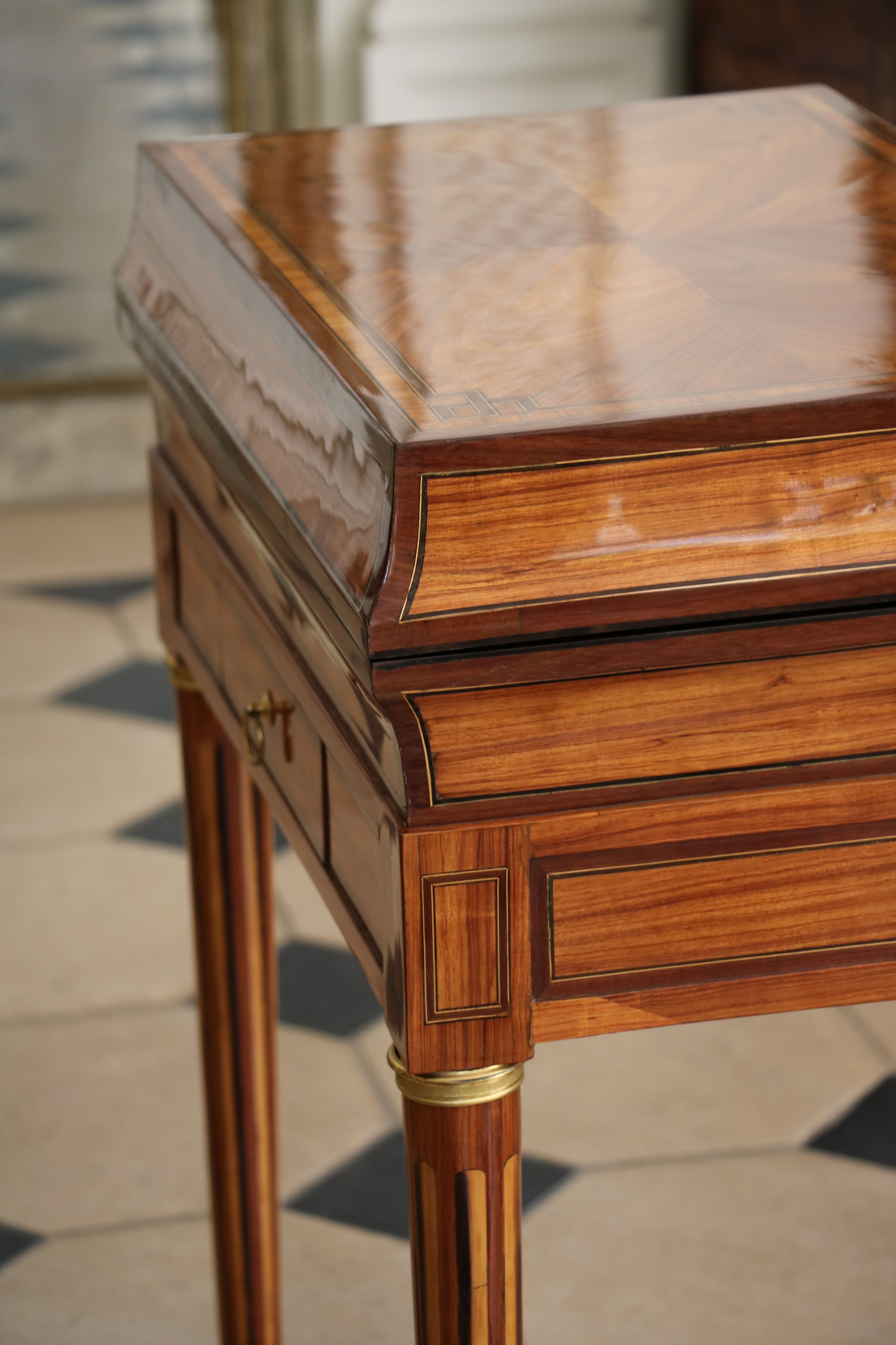 Le meuble de notre étude est étonnant. De première abord, il possède déjà des qualités esthétiques évidentes : sa marqueterie respectant la simplicité Louis XVI mais témoin d’un attachement aux détails remarquables tels que nous le montre les fausses cannelures sur les pieds, les encadrements sur le coffre du tric-trac. Cependant lorsque vous ouvrez ce bijoux, c’est avec grande surprise que vous découvrirez amusé l’ingéniosité de l’artisan qui l’a pensé. En effet, les pieds se plient et se déplient sous le jeu sans que fasse paraitre la structure instable ou l’installation du meuble éphémère. Qu’il soit sous forme de table ou de jeux, ce meuble est abouti. Ainsi, notre meuble présente un cas unique dans la production de l'ébéniste, en alliant son goût pour les meubles à mécanisme, et une production importante de tables à jeux. La production d’Avril se caractérise par une utilisation massive de l’acajou et du bois de rose. Reçut maître en 1774, Etienne Avril pratique le meuble à transformation, une performance mécanique tout à fait intéressante. Cela témoigne en effet de l’intérêt du siècle pour la Science jusqu’à l’intégrer dans les Arts décoratifs. On lui connaît ainsi un secrétaire ingénieux, à système de double-abattant. Longtemps prohibés, les jeux font leur réapparition sous le Régent et restent à la mode jusque sous Louis XVI. Ce dernier installe d’ailleurs un salon des jeux dans son appartement, où il joue volontiers au tric-trac, tandis que ses frères pratiquent le whist et le billard. Le jeu est une activité très en vogue chez les élites, qui y voient une occasion de faire appel à un certain civisme, et à des facultés de réflexion.