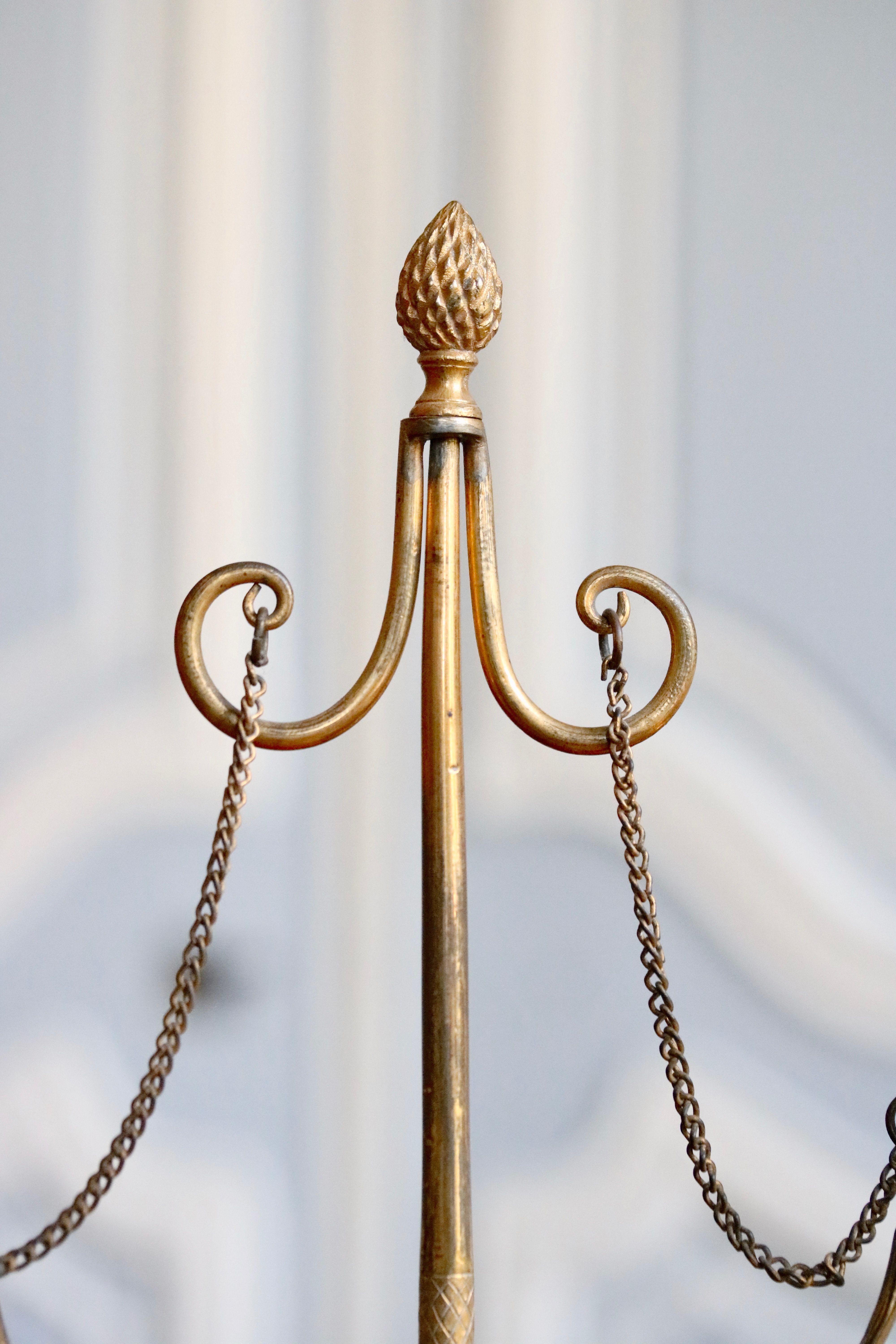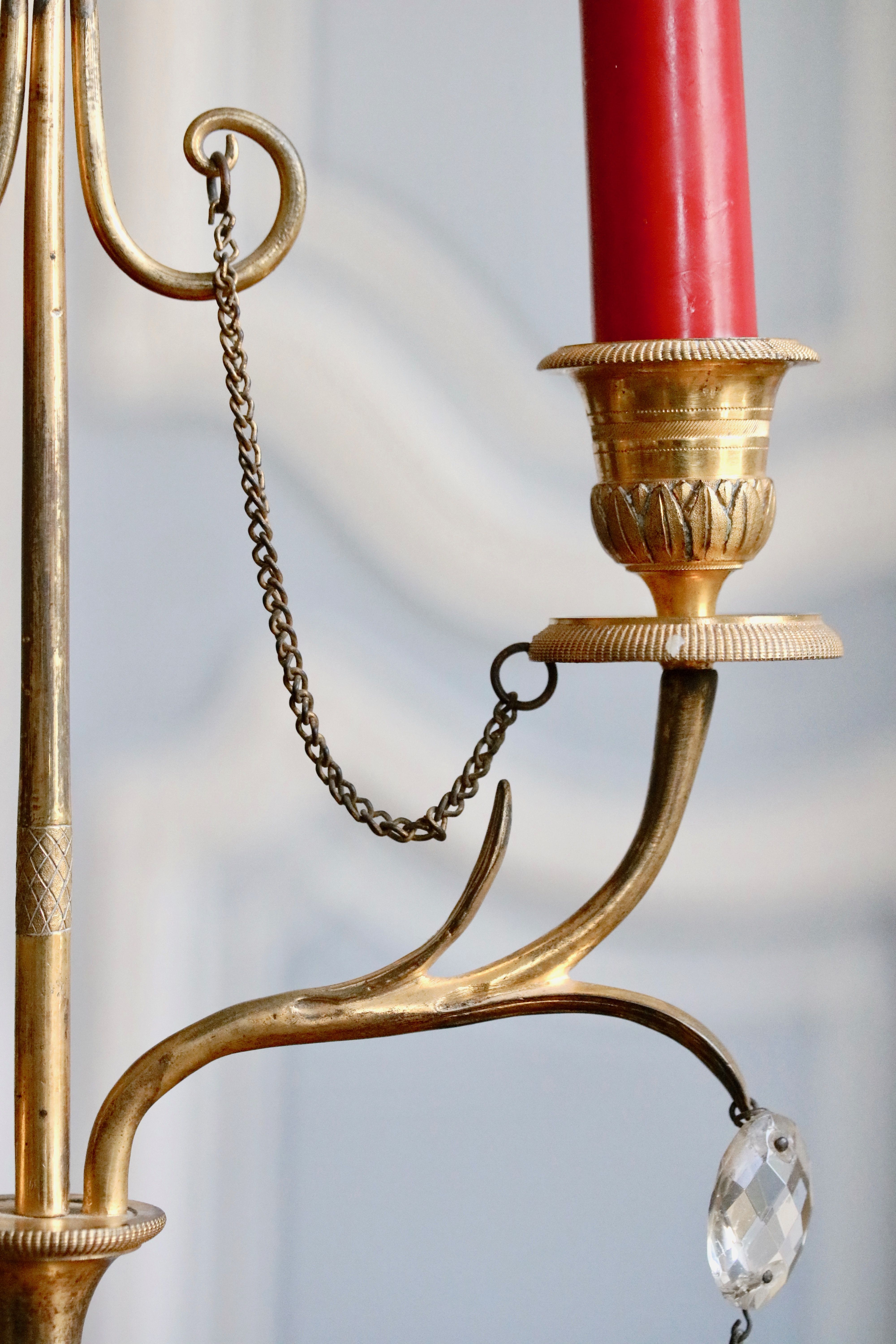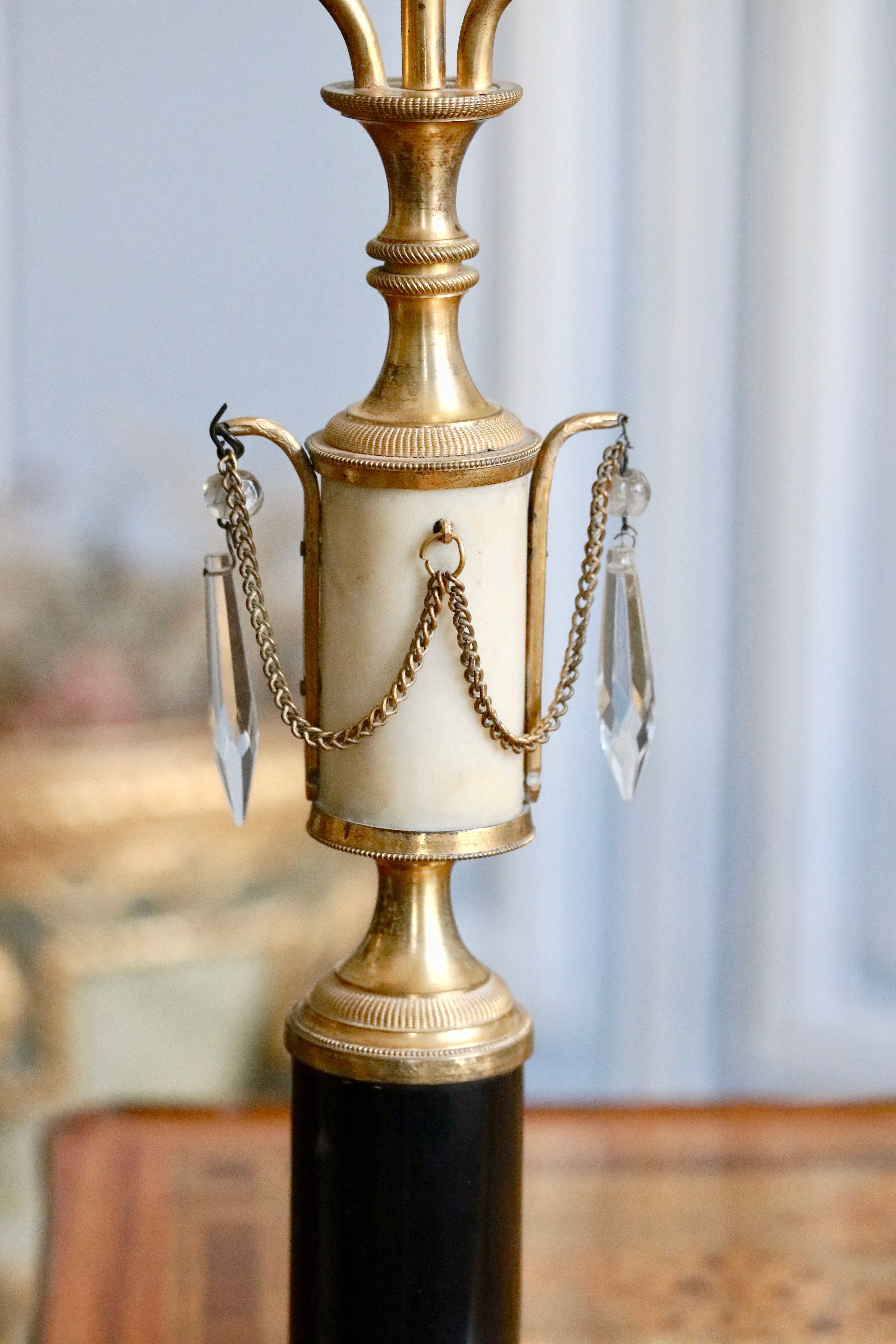 Paire de candélabres à deux bras de lumière en bronze doré et ciselé et ornée de pampilles en cristal. Les candélabres sont surmontés d’une pomme de pin. Les binets sont à décors de palmettes. Le fût est composé de colonnes raccourcies, l’une en marbre blanc ornée de chainettes dorées et de pampilles en cristal, l’autre en marbre noir. Les candélabres reposent sur une base circulaire montée sur socle carré en marbre blanc. Travail suédois Epoque Louis XVI Restaurations d’usage H. 48,5 x L 17 cm