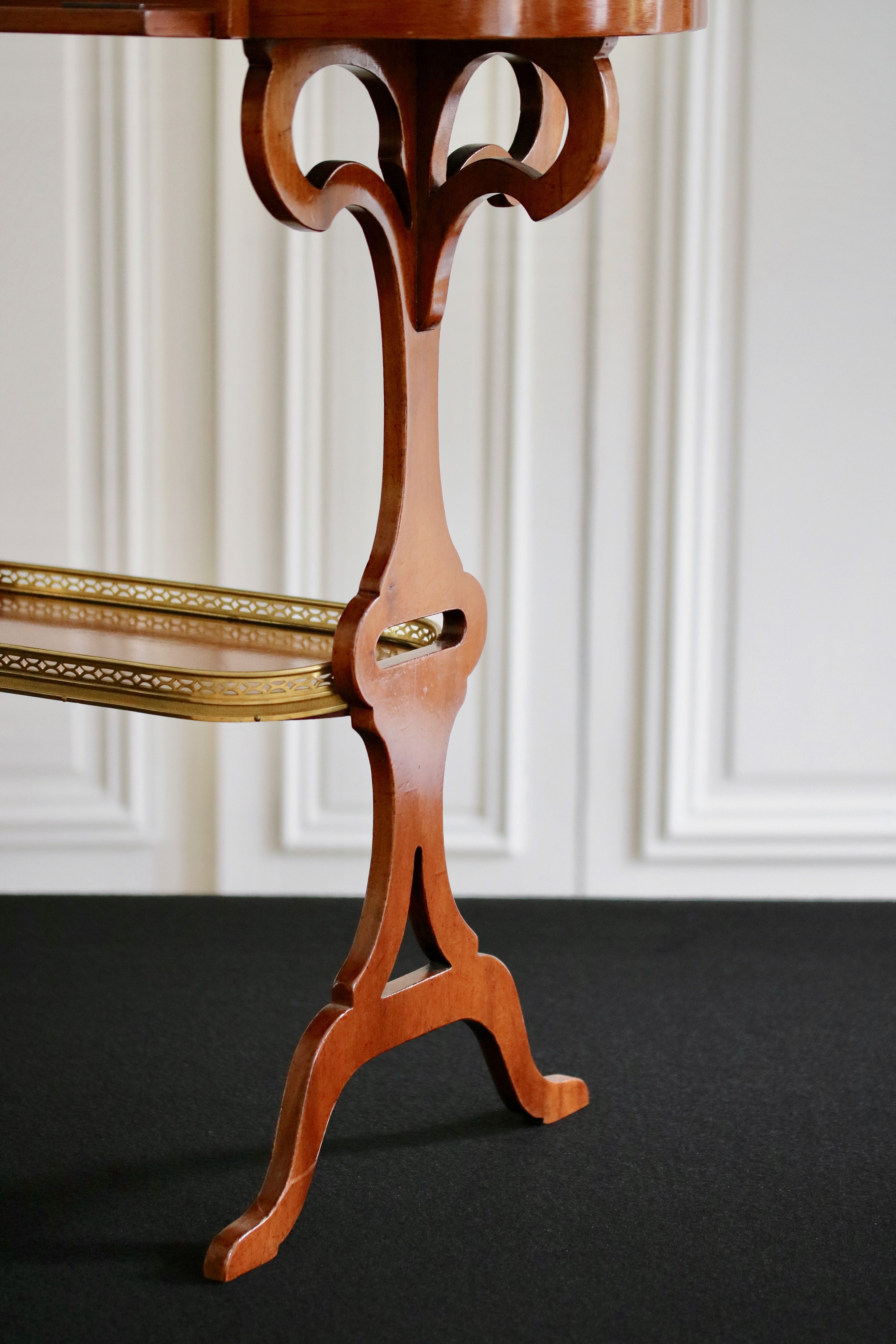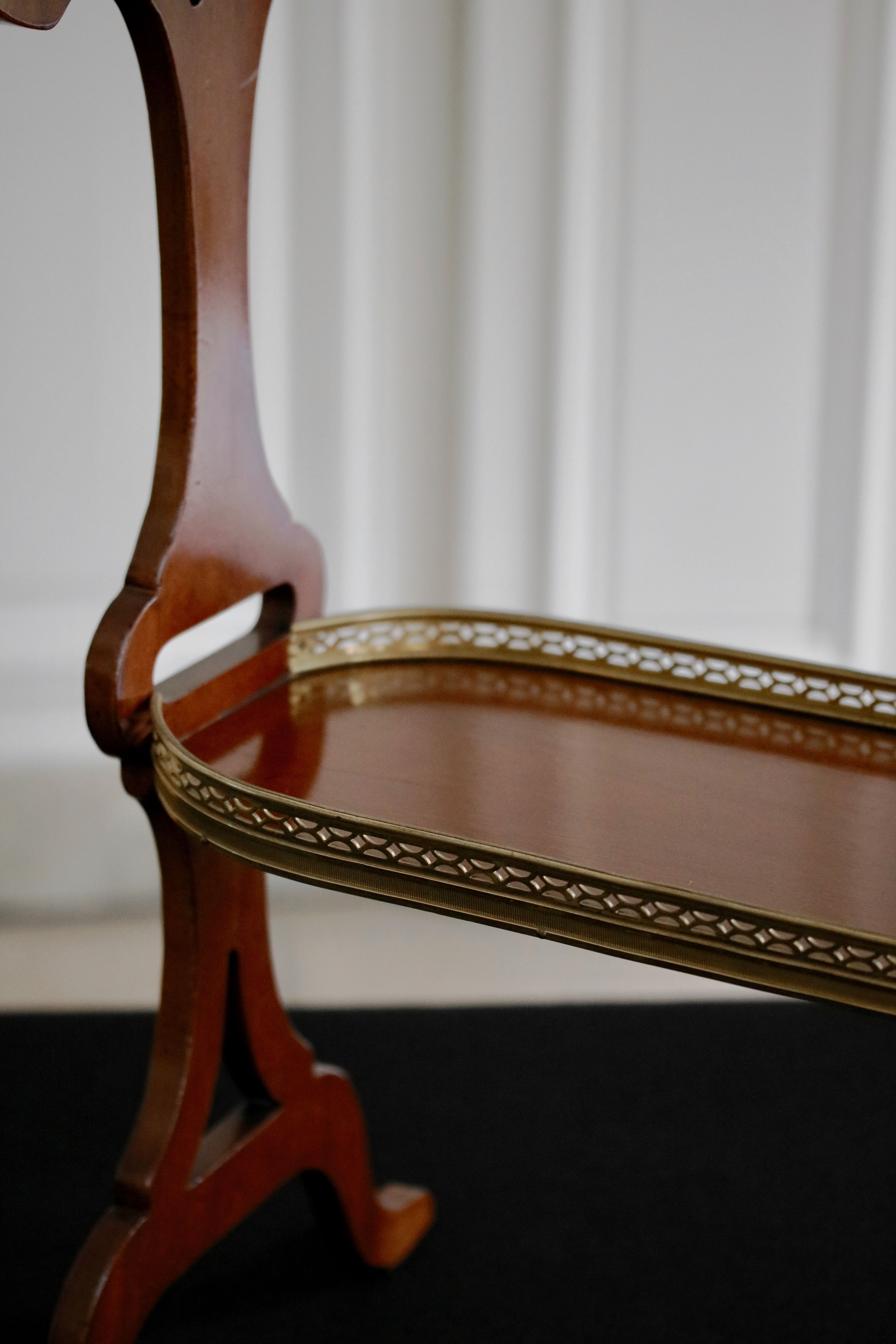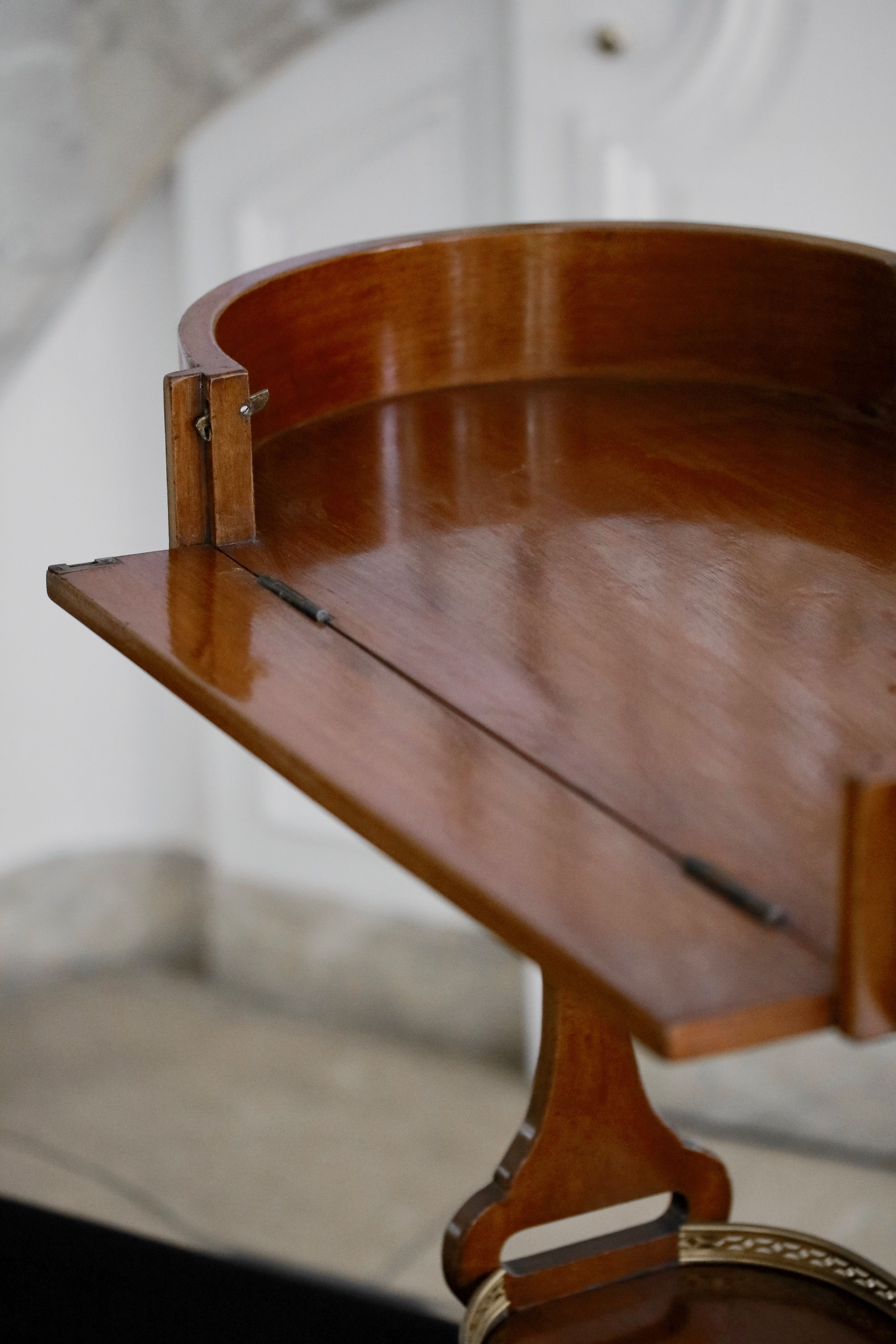 Tricoteuse en acajou et placage d’acajou reposant sur quatre pieds patins. Elle se compose de deux montants ajourés réunis par un plateau orné d’une galerie de bronze formant entretoise. Les montants se terminent chacun d’eux par trois consoles inversées recevant la partie haute. Cette dernière est formée par un plateau muni de haut bord et à ressaut. L’un des côtés est basculant. Époque Louis XVI Restaurations d’usage H. 71 x L. 79 x P. 6 cm