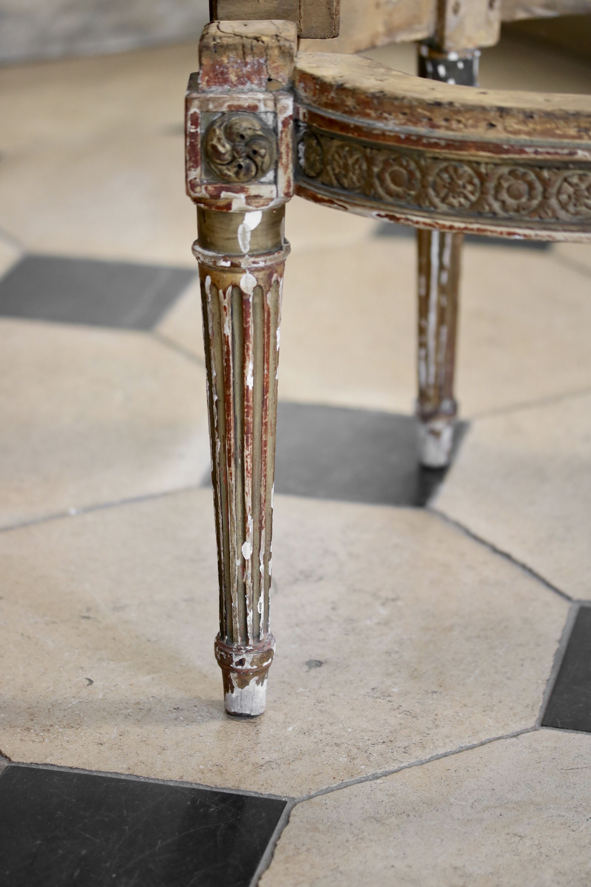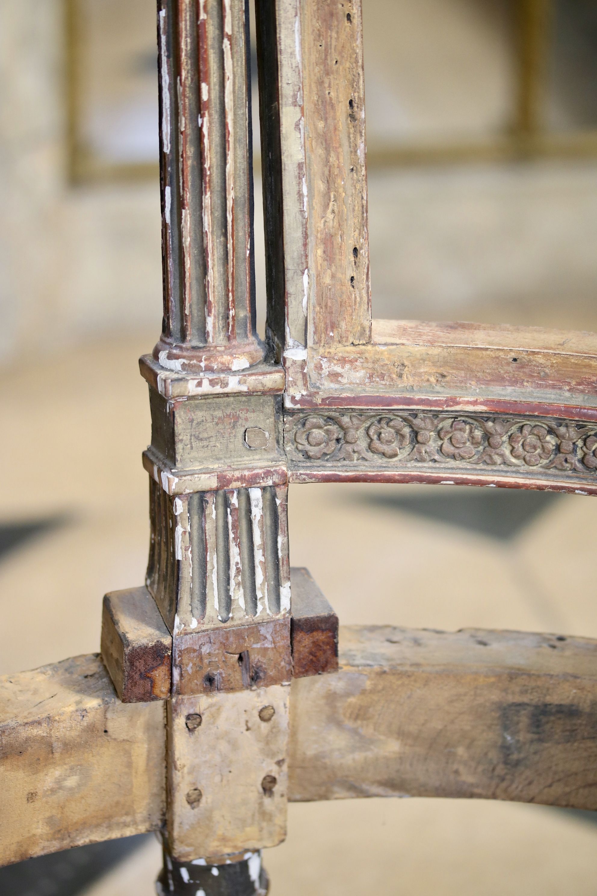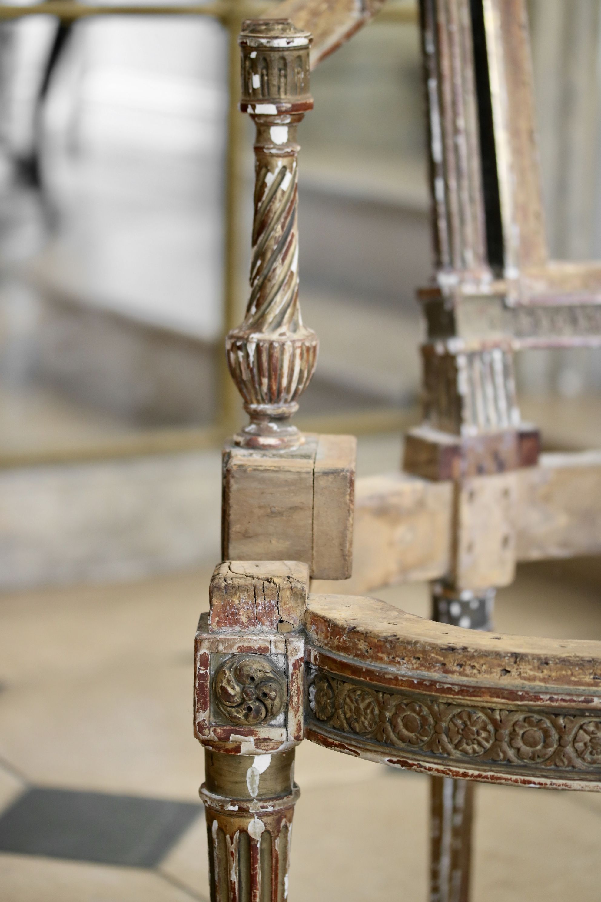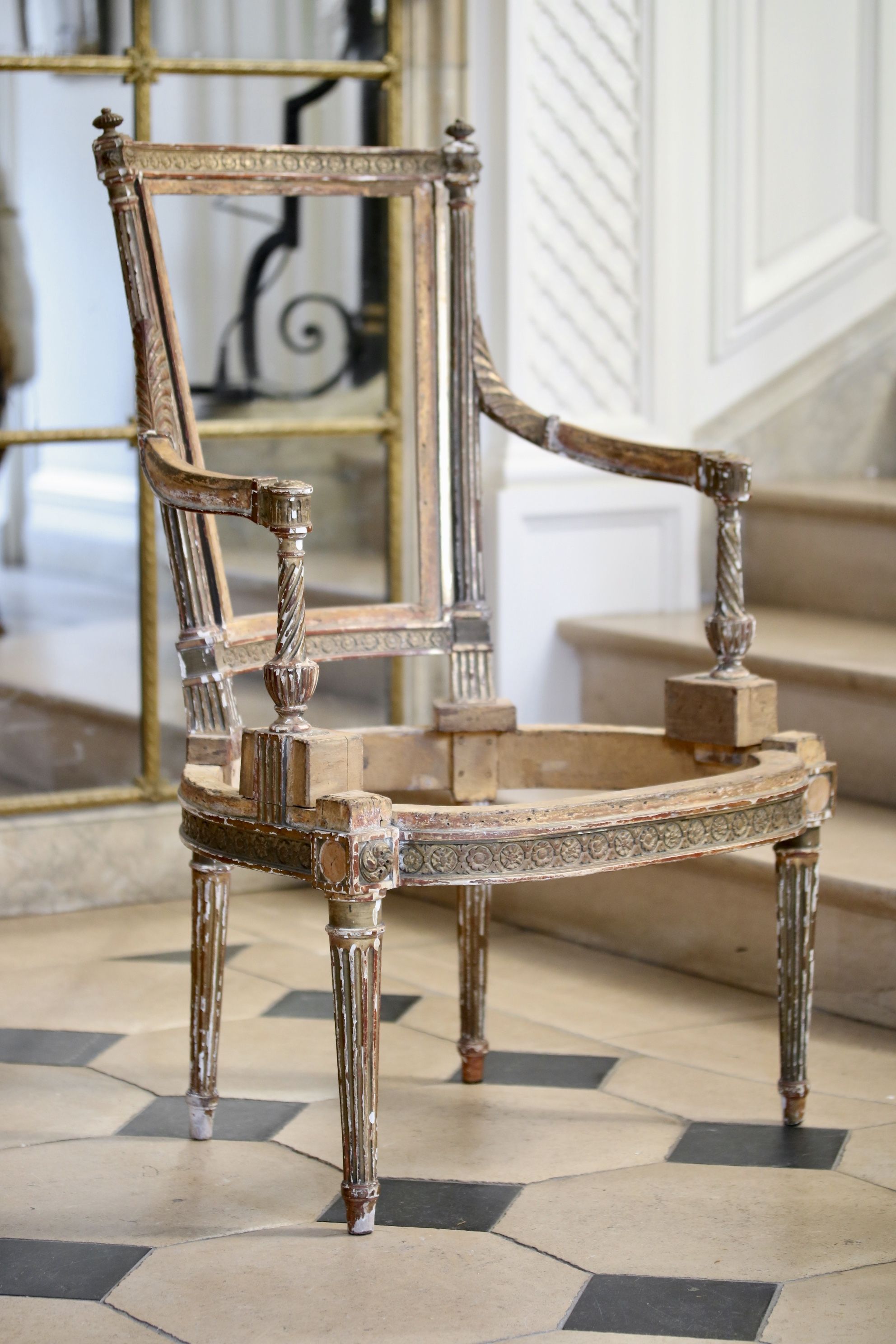 Fauteuil en cabriolet en bois doré reposant sur quatre pieds cannelés surmontés de dés de raccordements enfermant une rosace. Dossier en cabriolet, sommé aux épaulements d’une urne stylisée. Traverses du dossier et ceinture parcourues de rosettes en frise. Montants du dossier ne colonnes détachées. Supports d’accotoirs en balustres à cannelures torses en opposition surmontées d’une fleurette. Epoque Louis XVI Restaurations d’usage, sans garniture, éclats à la dorure et restaurations à prévoir H. 90 x L. 58 x P. 47,5 cm