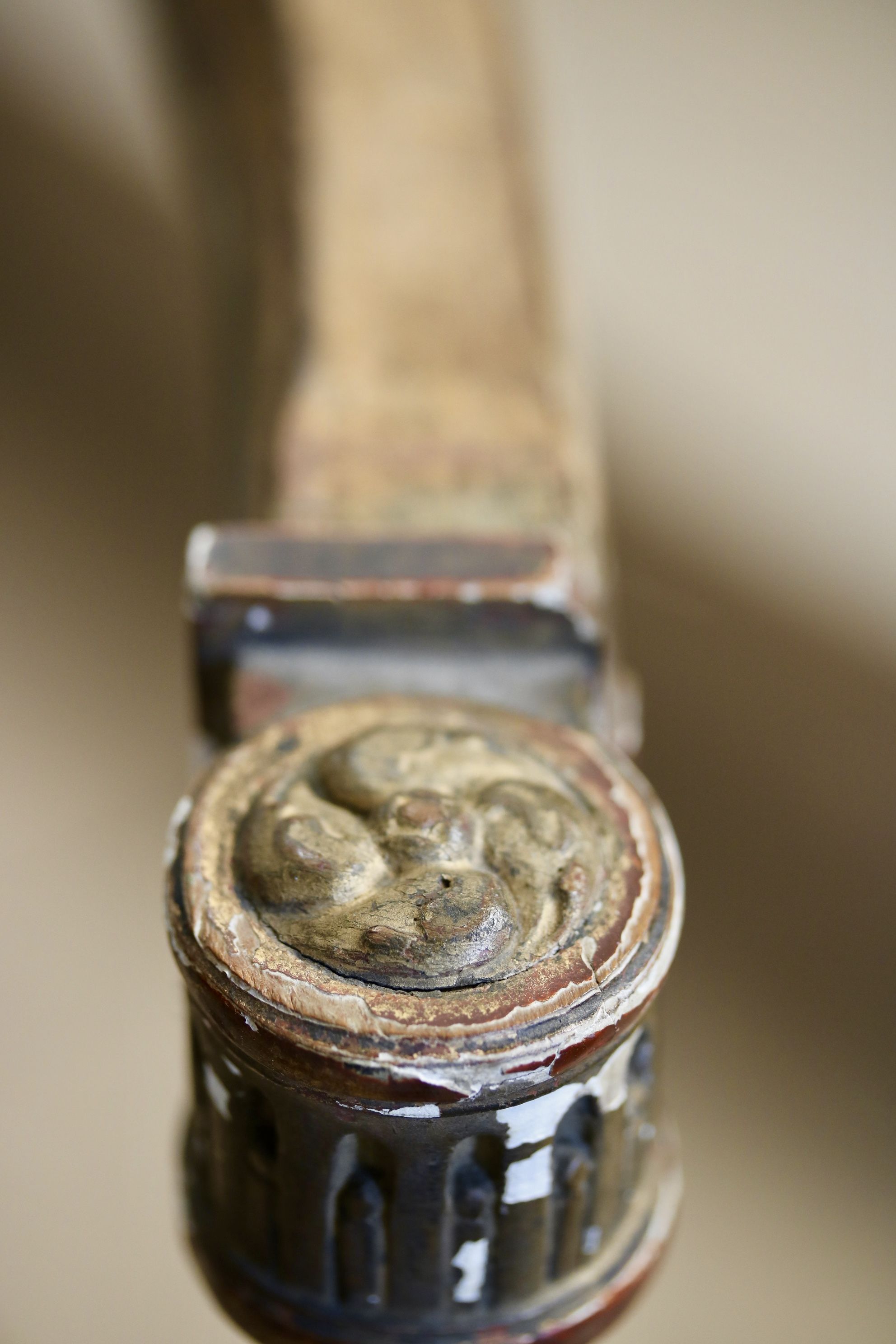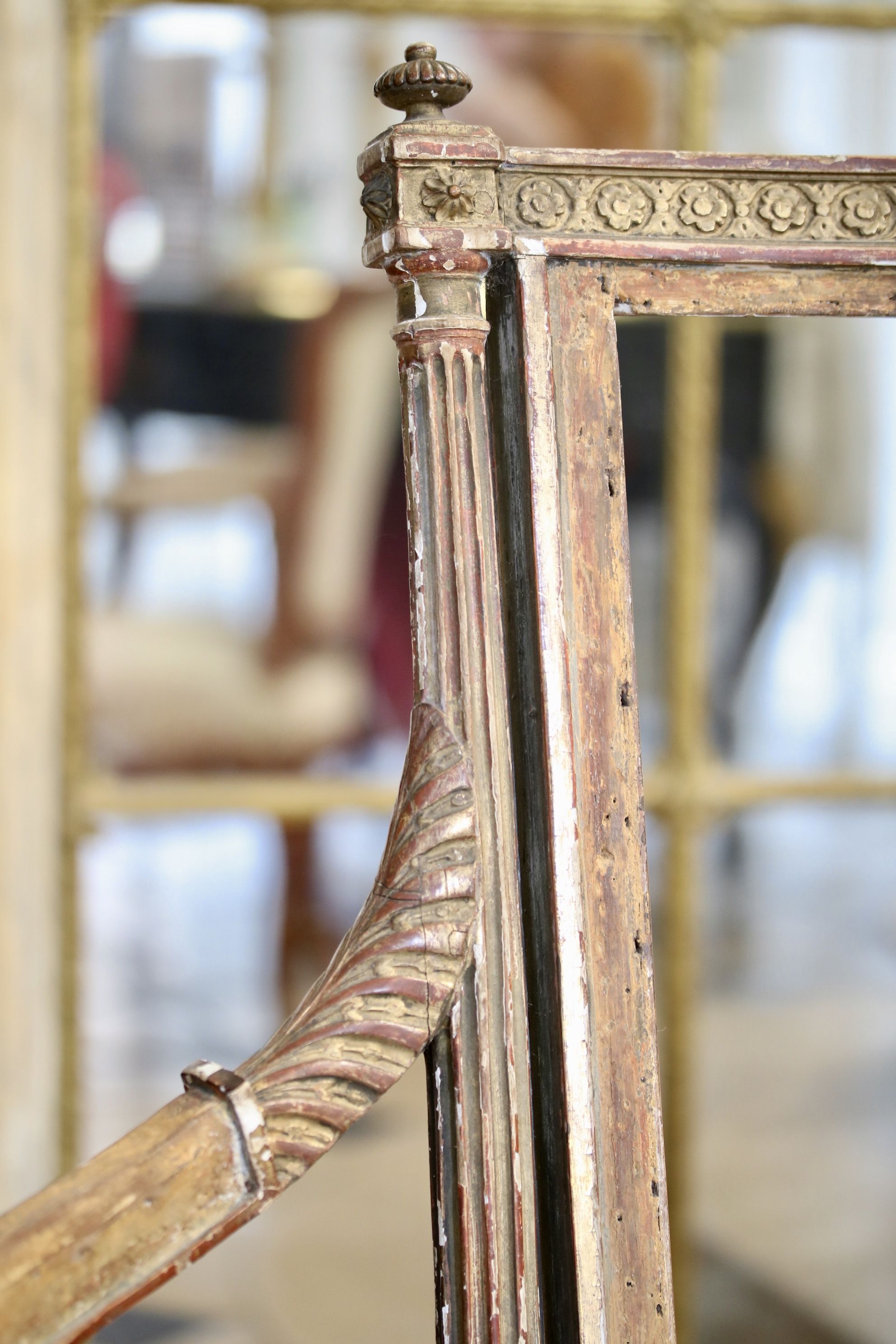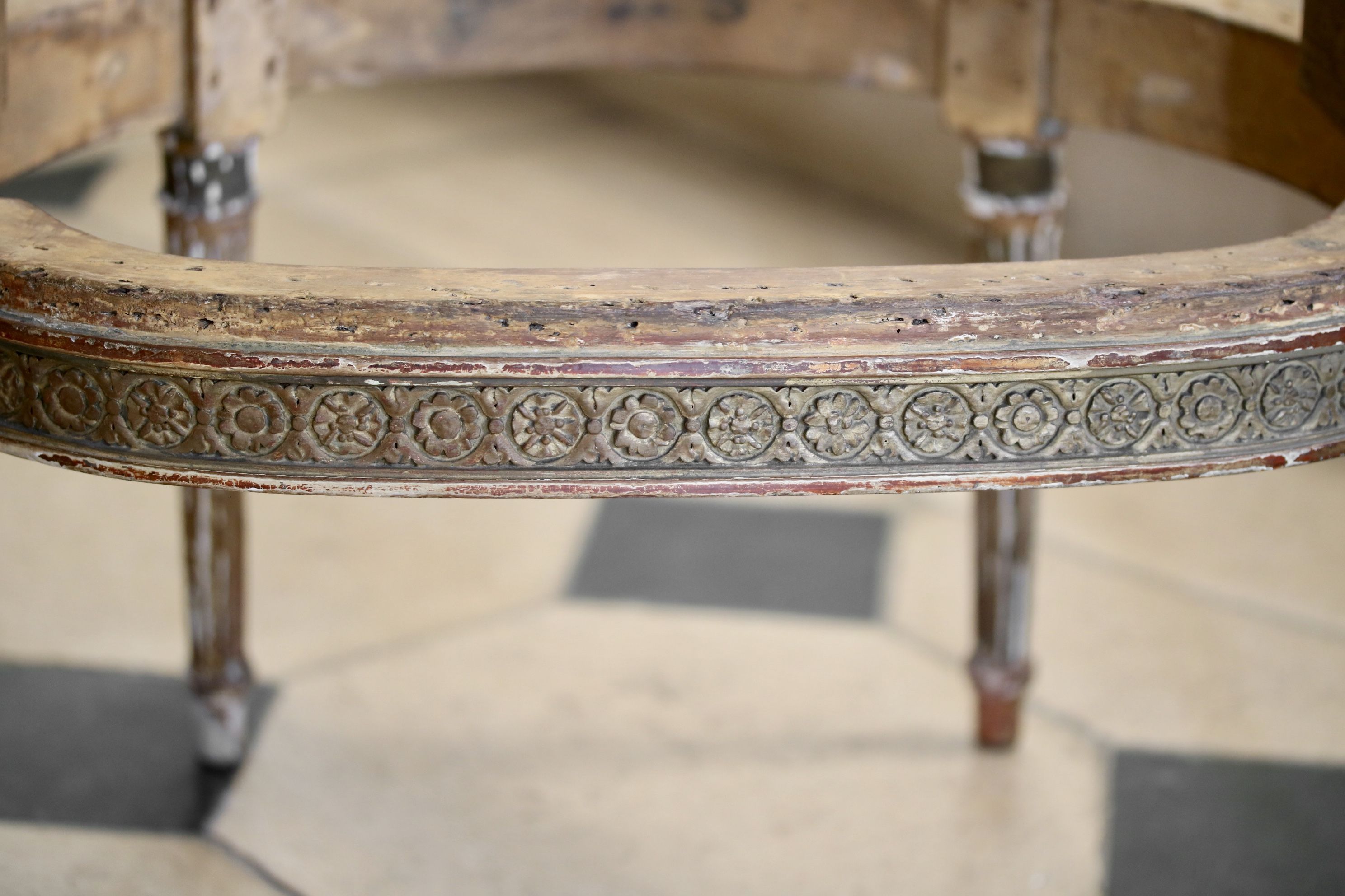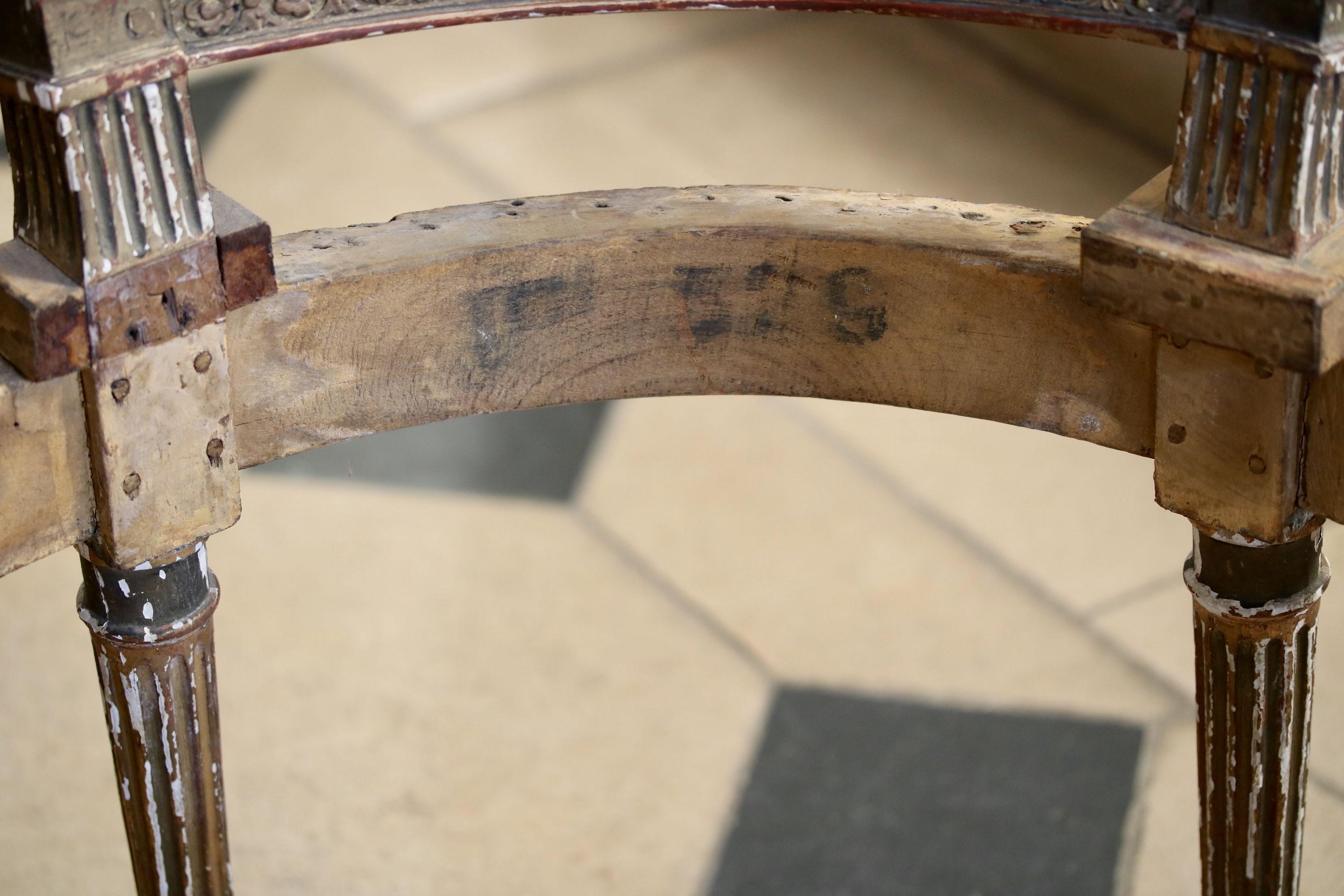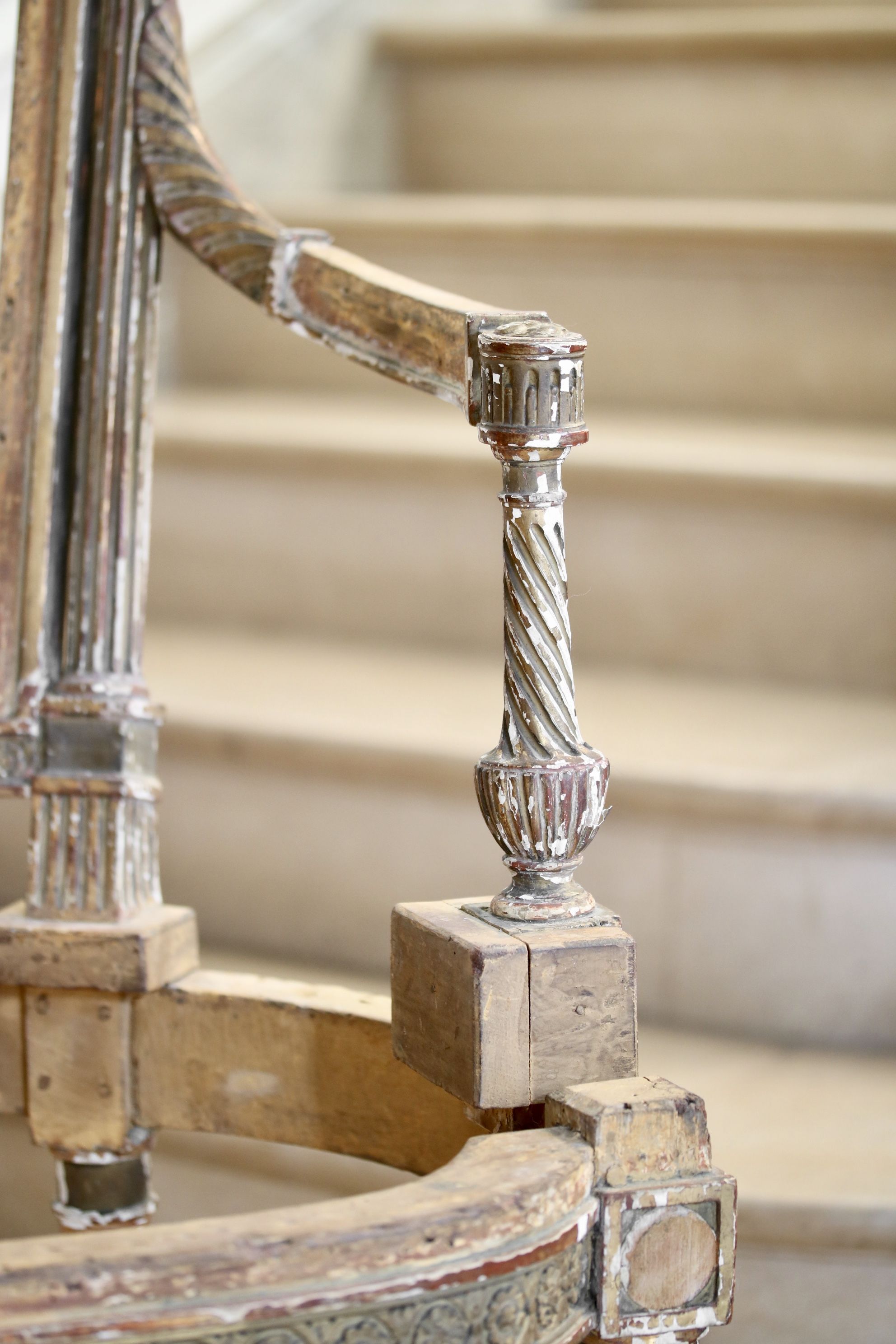 Fauteuil en cabriolet en bois doré reposant sur quatre pieds cannelés surmontés de dés de raccordements enfermant une rosace. Dossier en cabriolet, sommé aux épaulements d’une urne stylisée. Traverses du dossier et ceinture parcourues de rosettes en frise. Montants du dossier ne colonnes détachées. Supports d’accotoirs en balustres à cannelures torses en opposition surmontées d’une fleurette. Epoque Louis XVI Restaurations d’usage, sans garniture, éclats à la dorure et restaurations à prévoir H. 90 x L. 58 x P. 47,5 cm