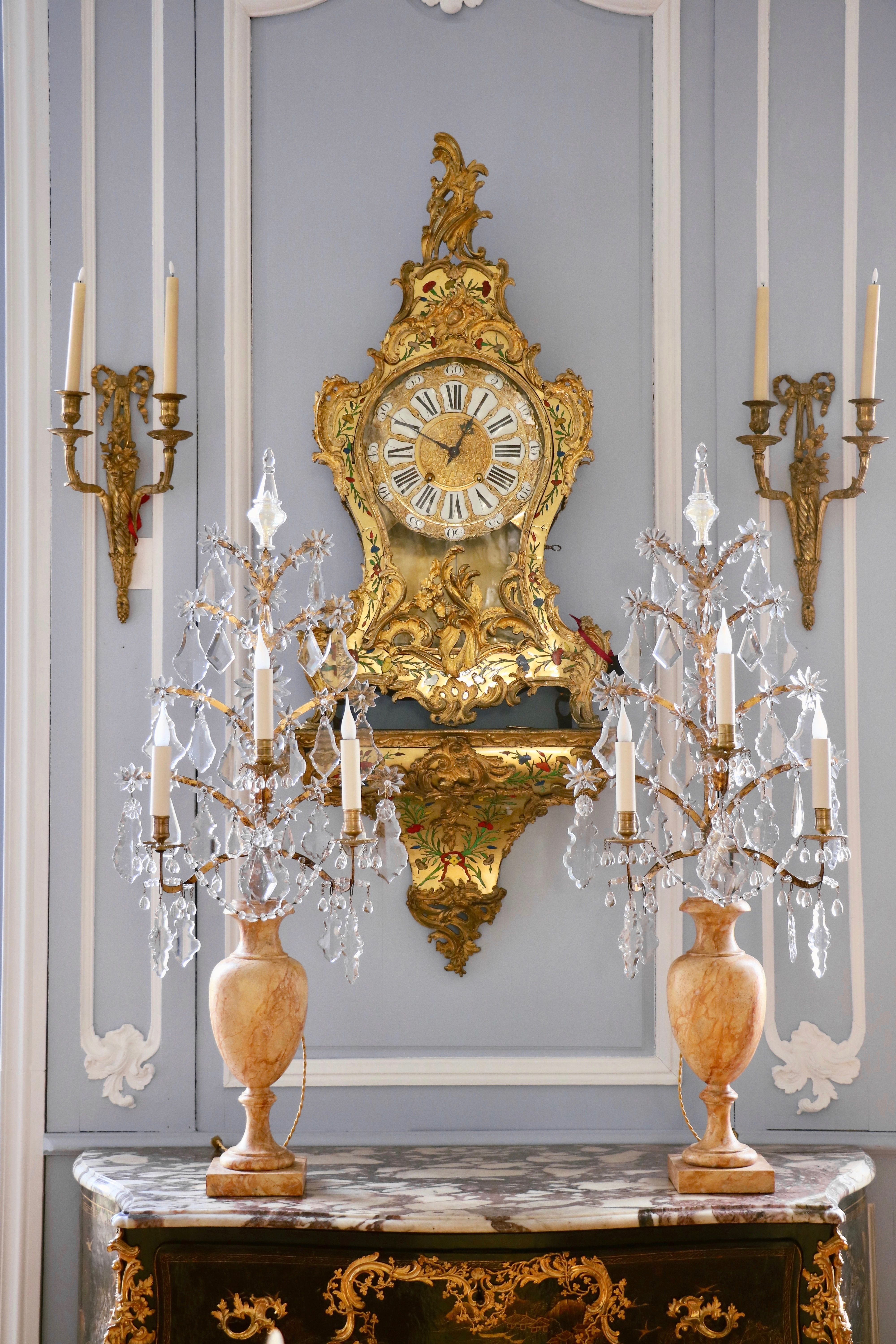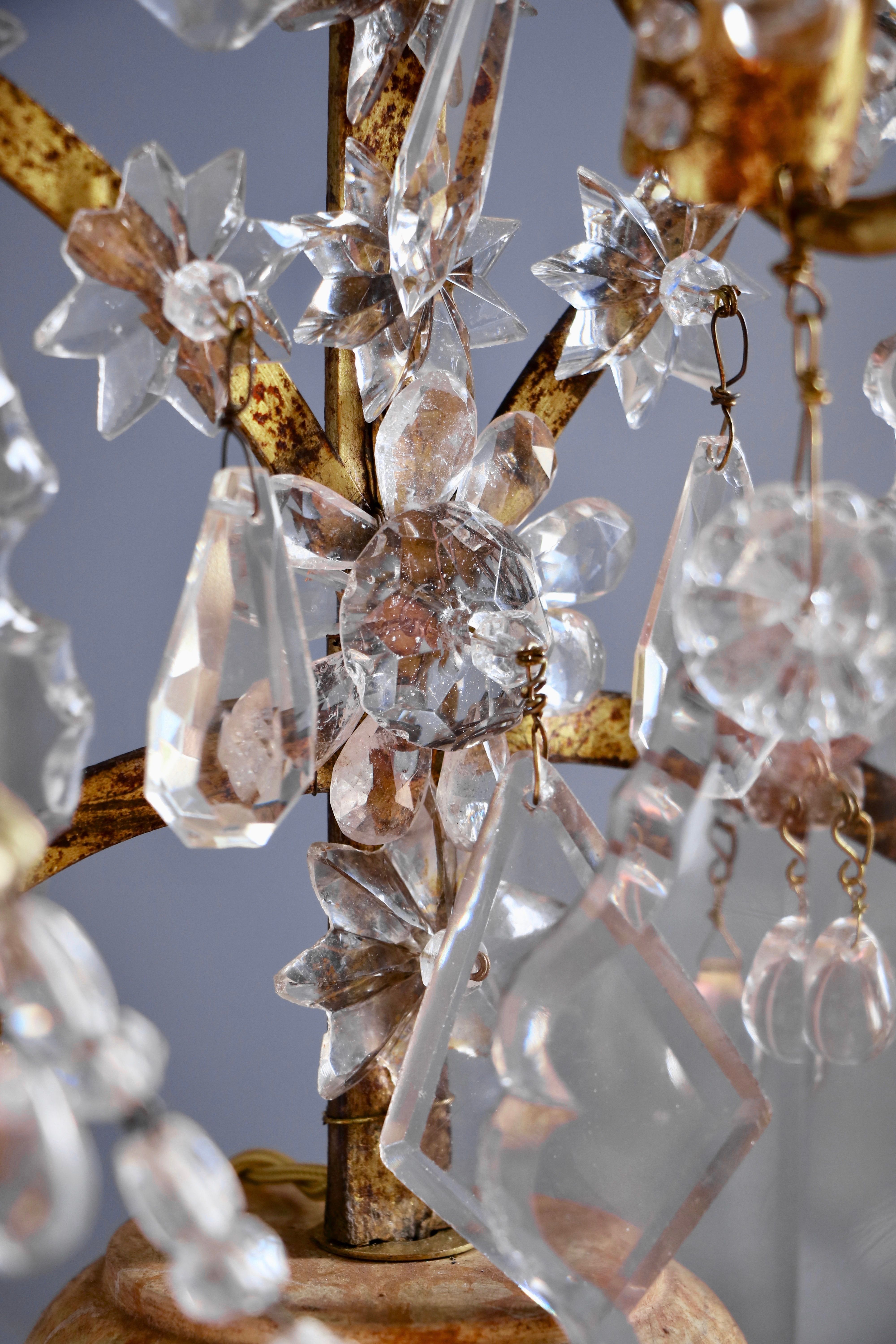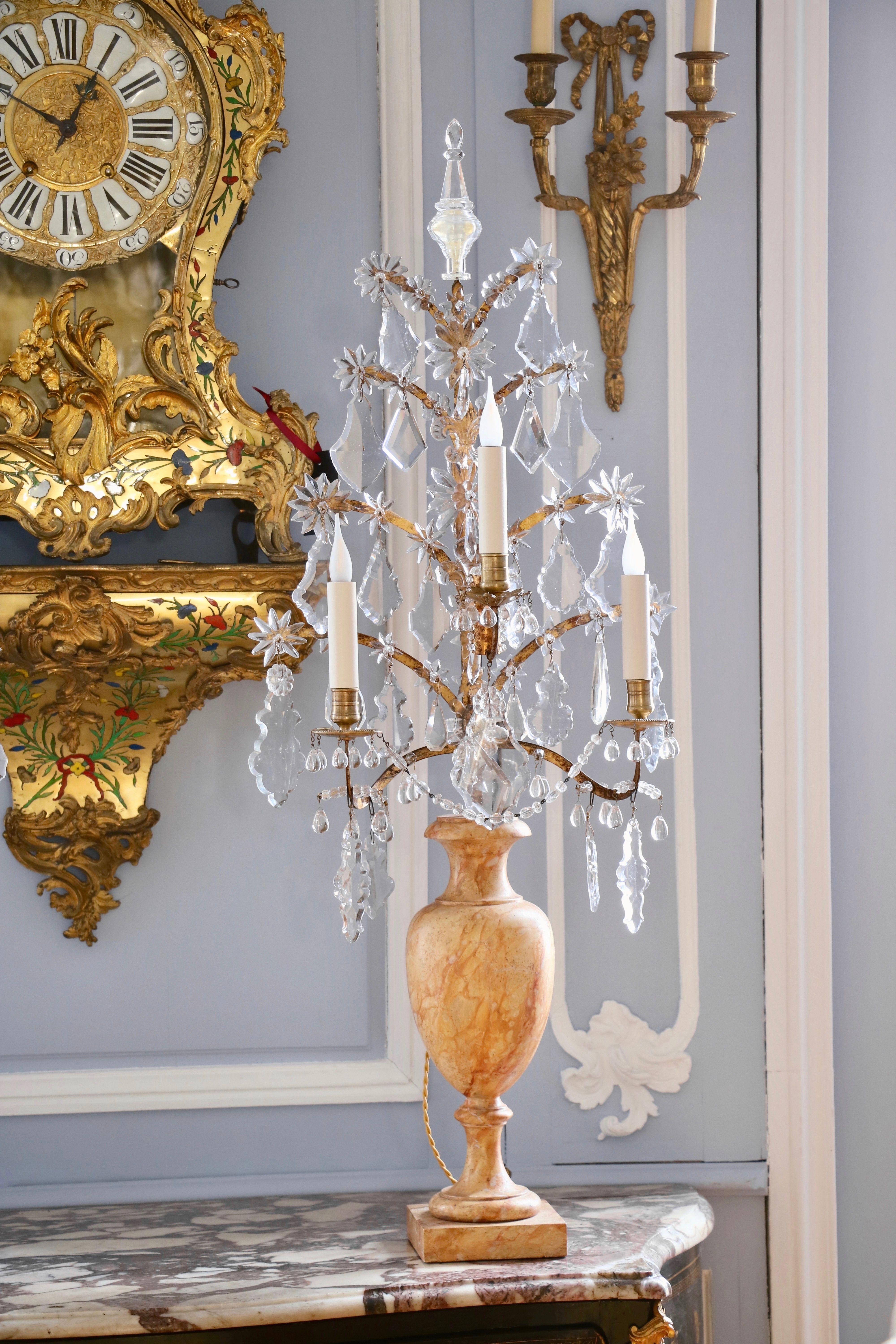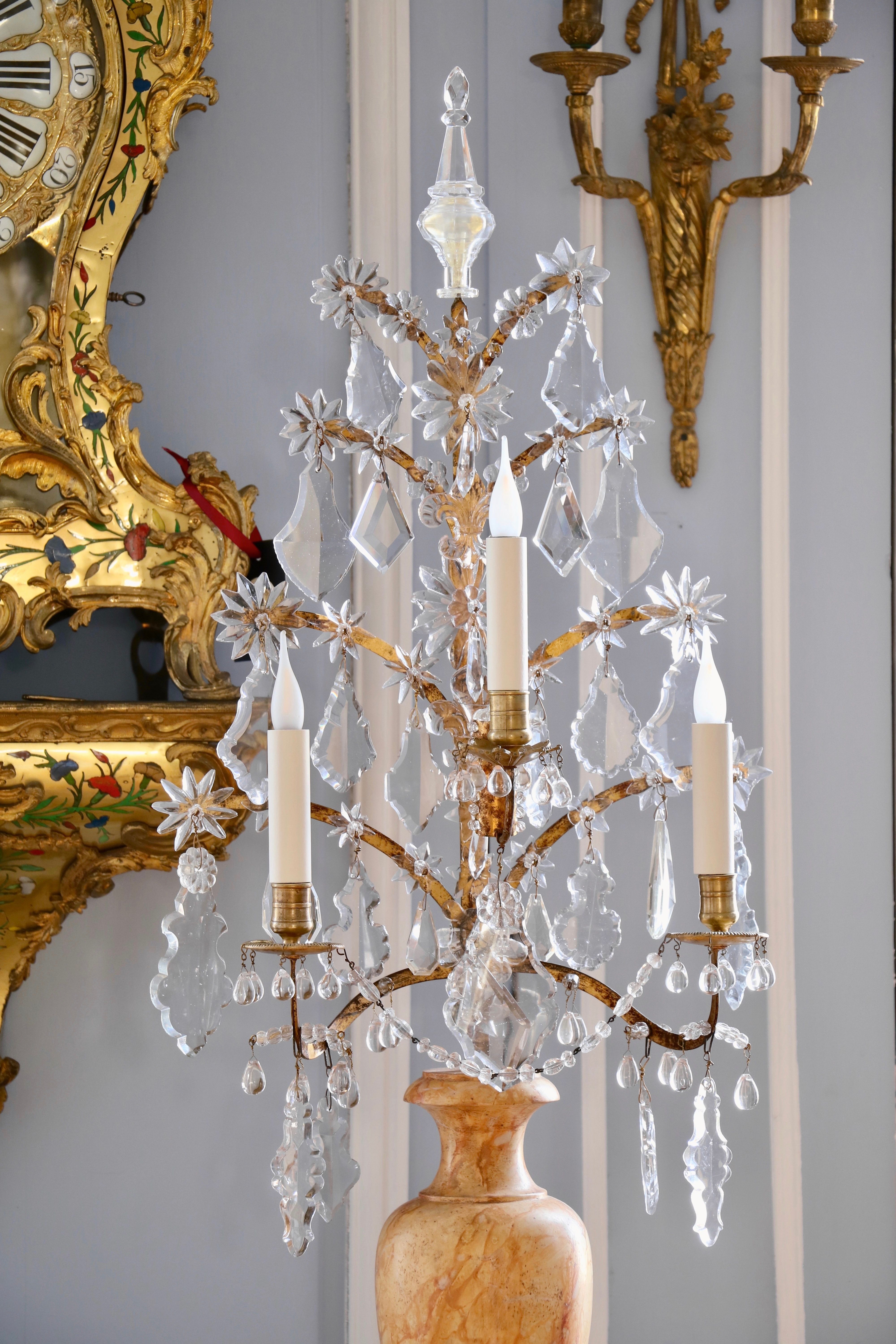 Impressionnante paire de girandoles à trois bras de lumières formant lampe. Elles sont composées de pendeloques, de fleurs de lys, de fleurettes et de plaquettes en cristal réunies par une structure en bronze doré. La partie haute repose sur un vase à l’imitation du marbre. Epoque XVIIIe siècle Restaurations d’usage, électrifiée, vases postérieures H. 110 x L. 44 x P. 14 cm