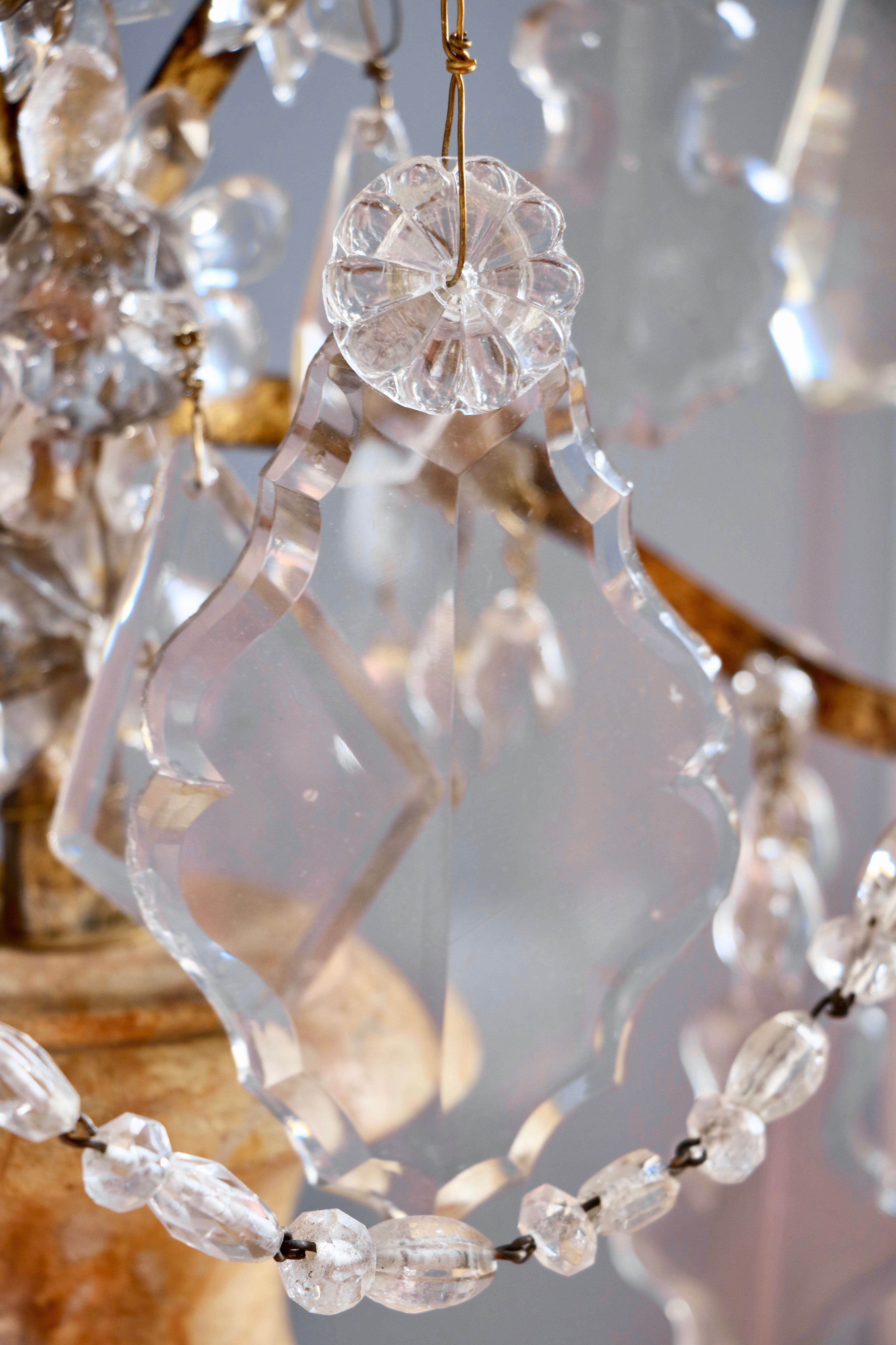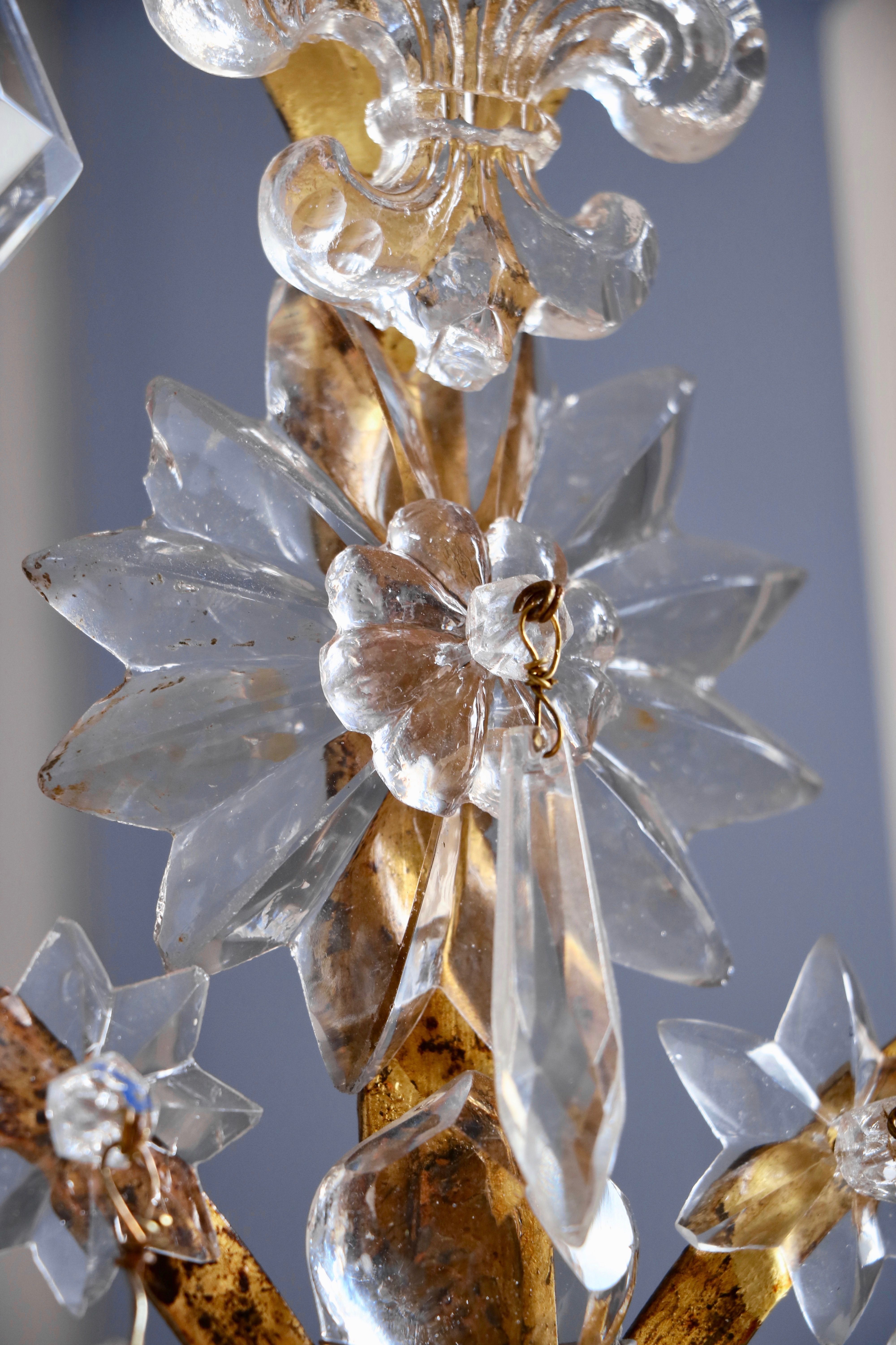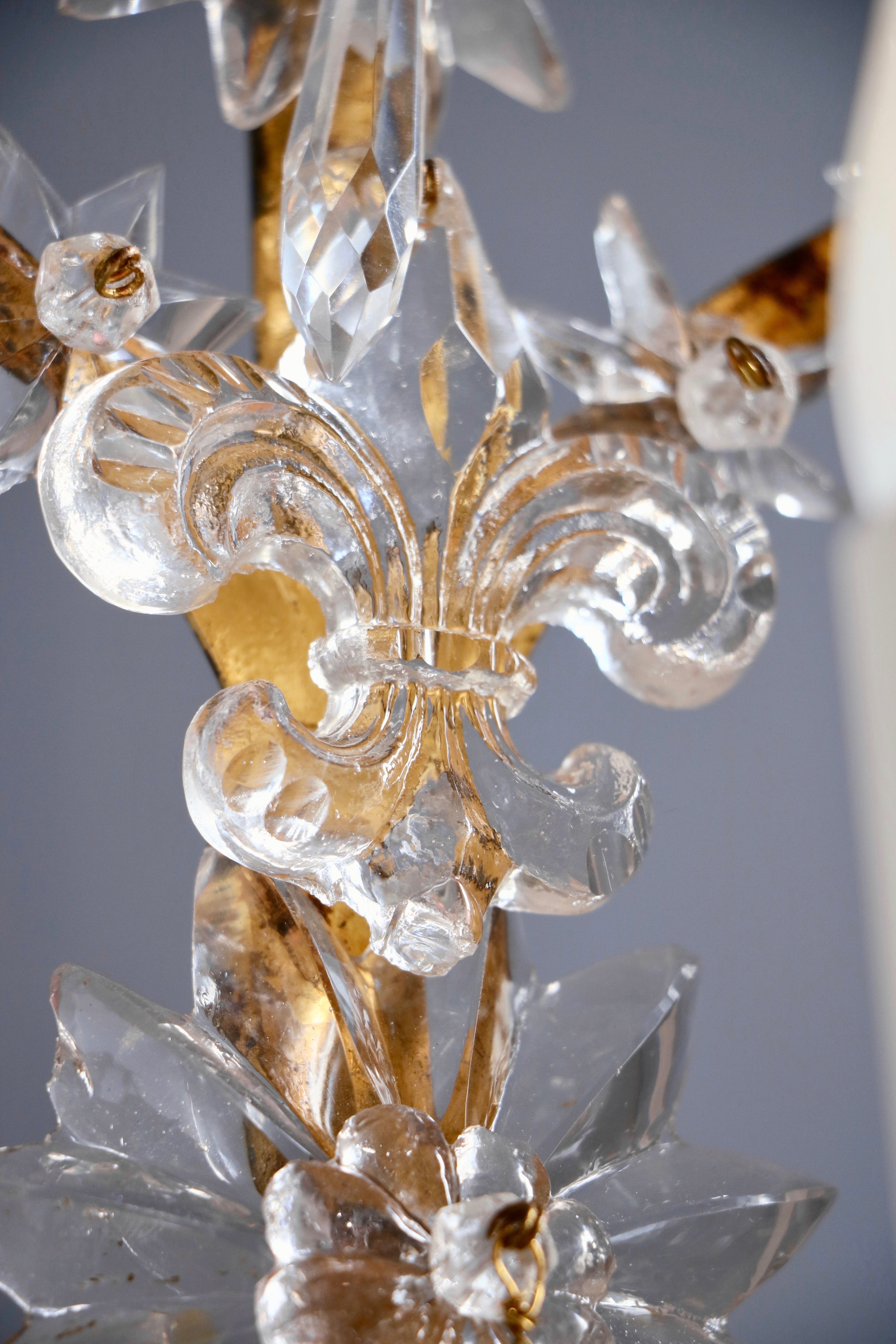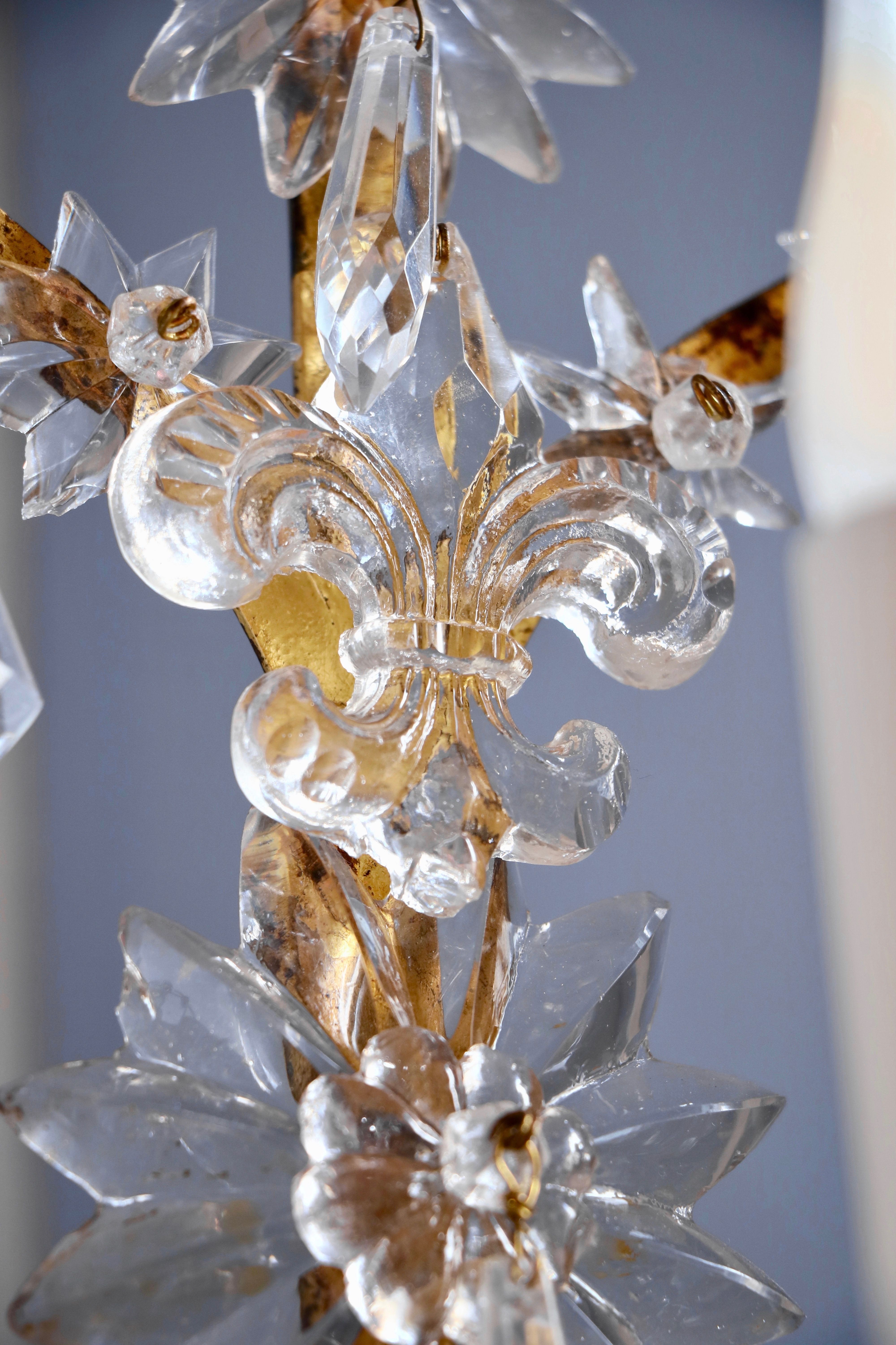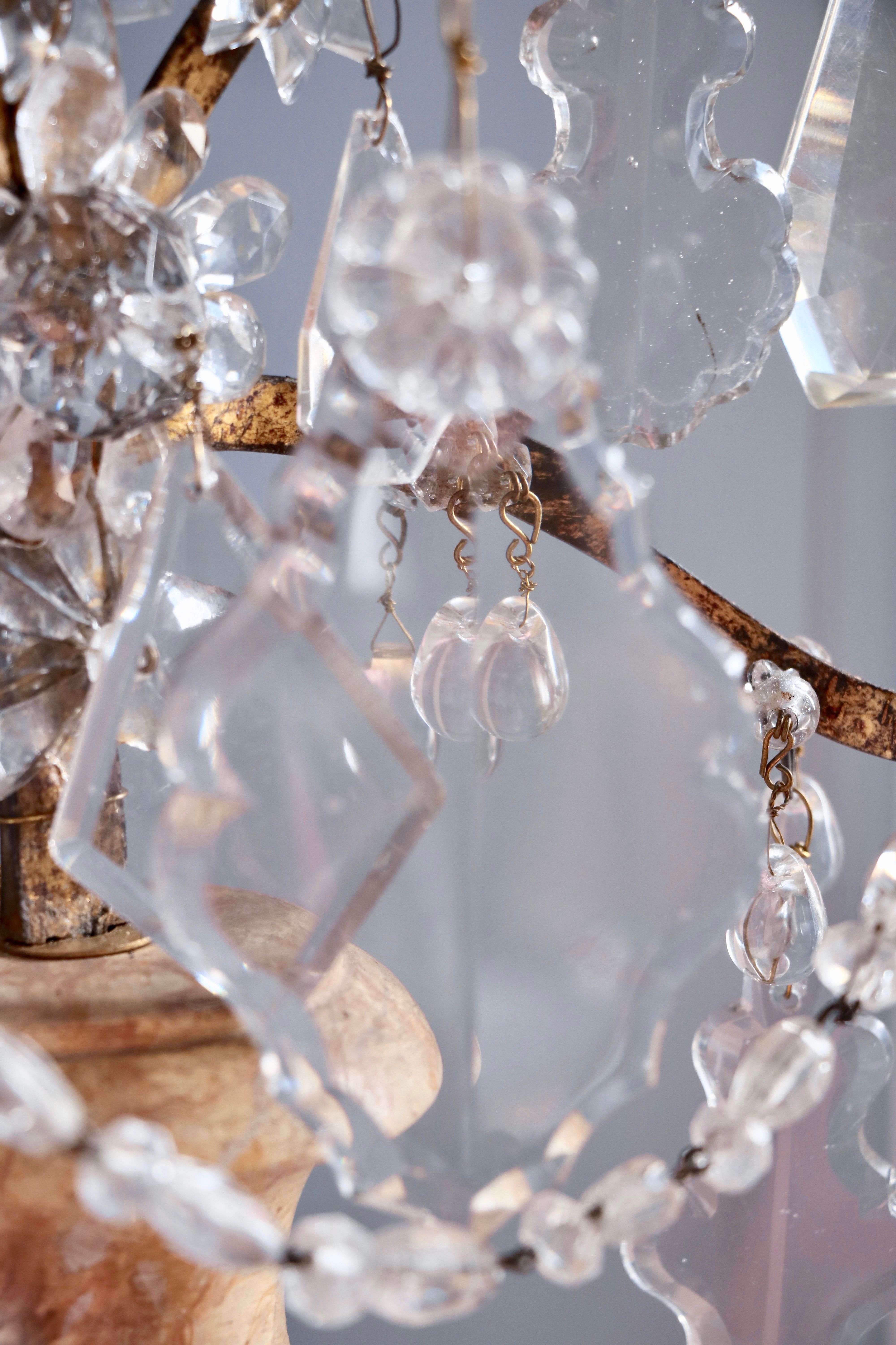 Impressionnante paire de girandoles à trois bras de lumières formant lampe. Elles sont composées de pendeloques, de fleurs de lys, de fleurettes et de plaquettes en cristal réunies par une structure en bronze doré. La partie haute repose sur un vase à l’imitation du marbre. Epoque XVIIIe siècle Restaurations d’usage, électrifiée, vases postérieures H. 110 x L. 44 x P. 14 cm