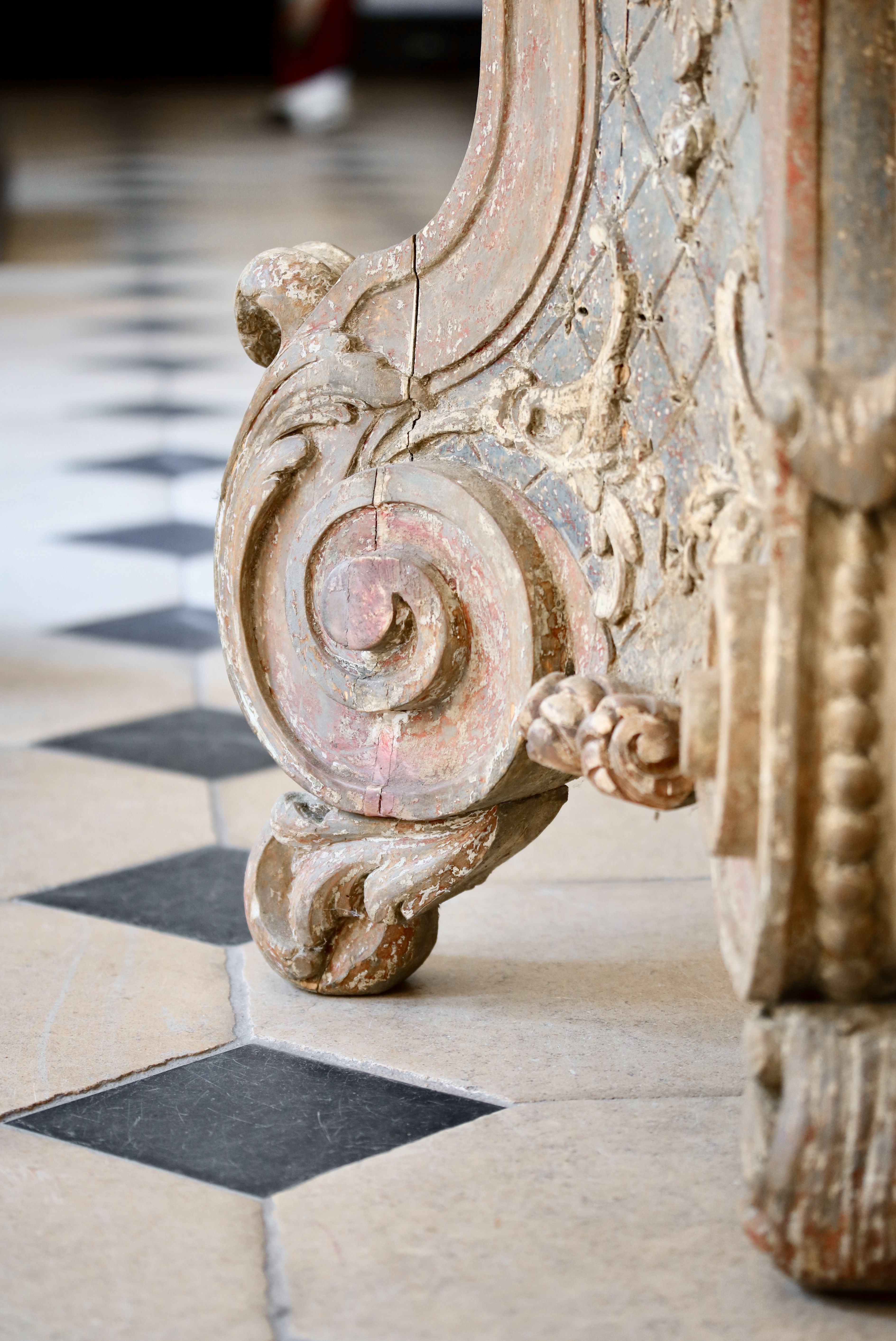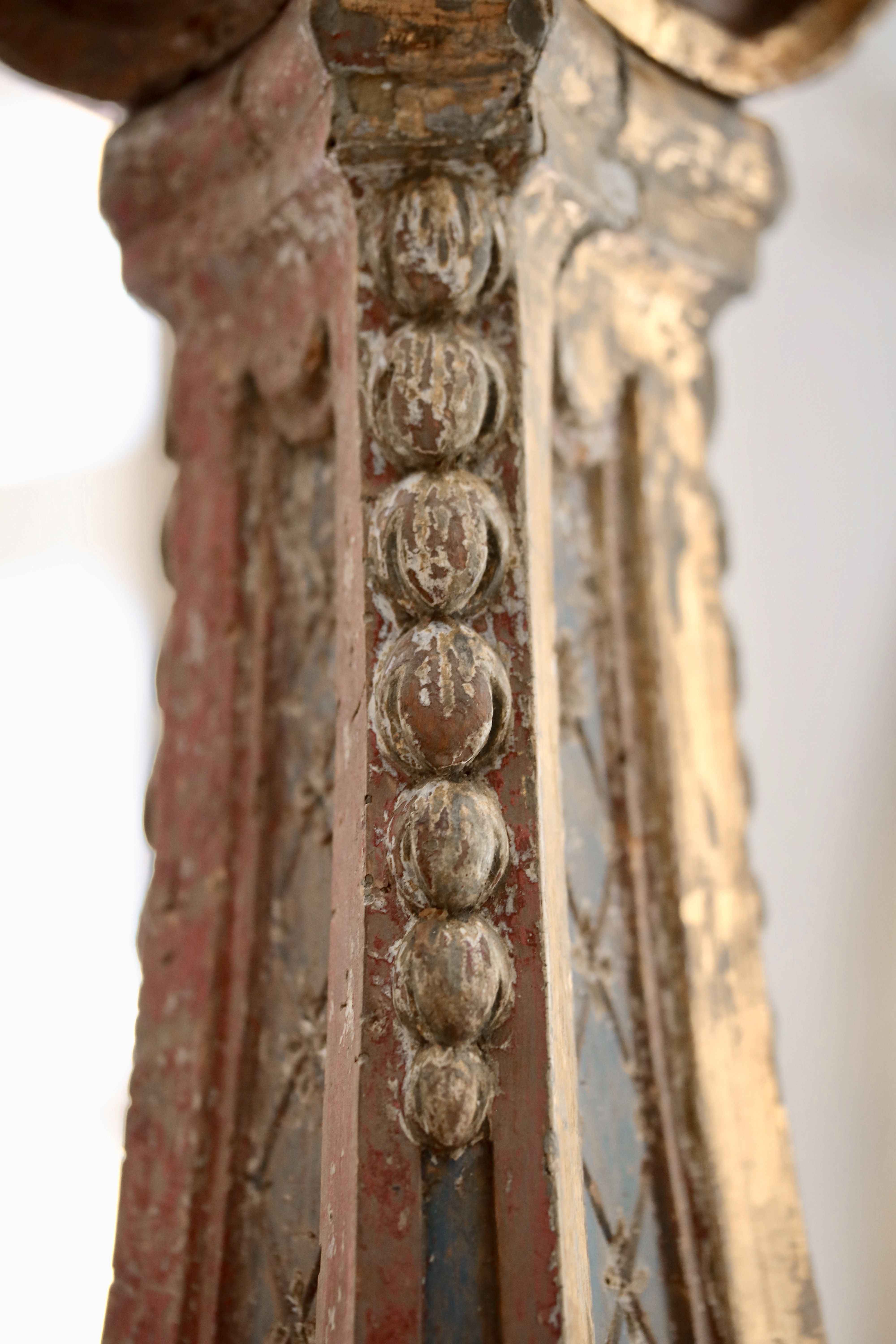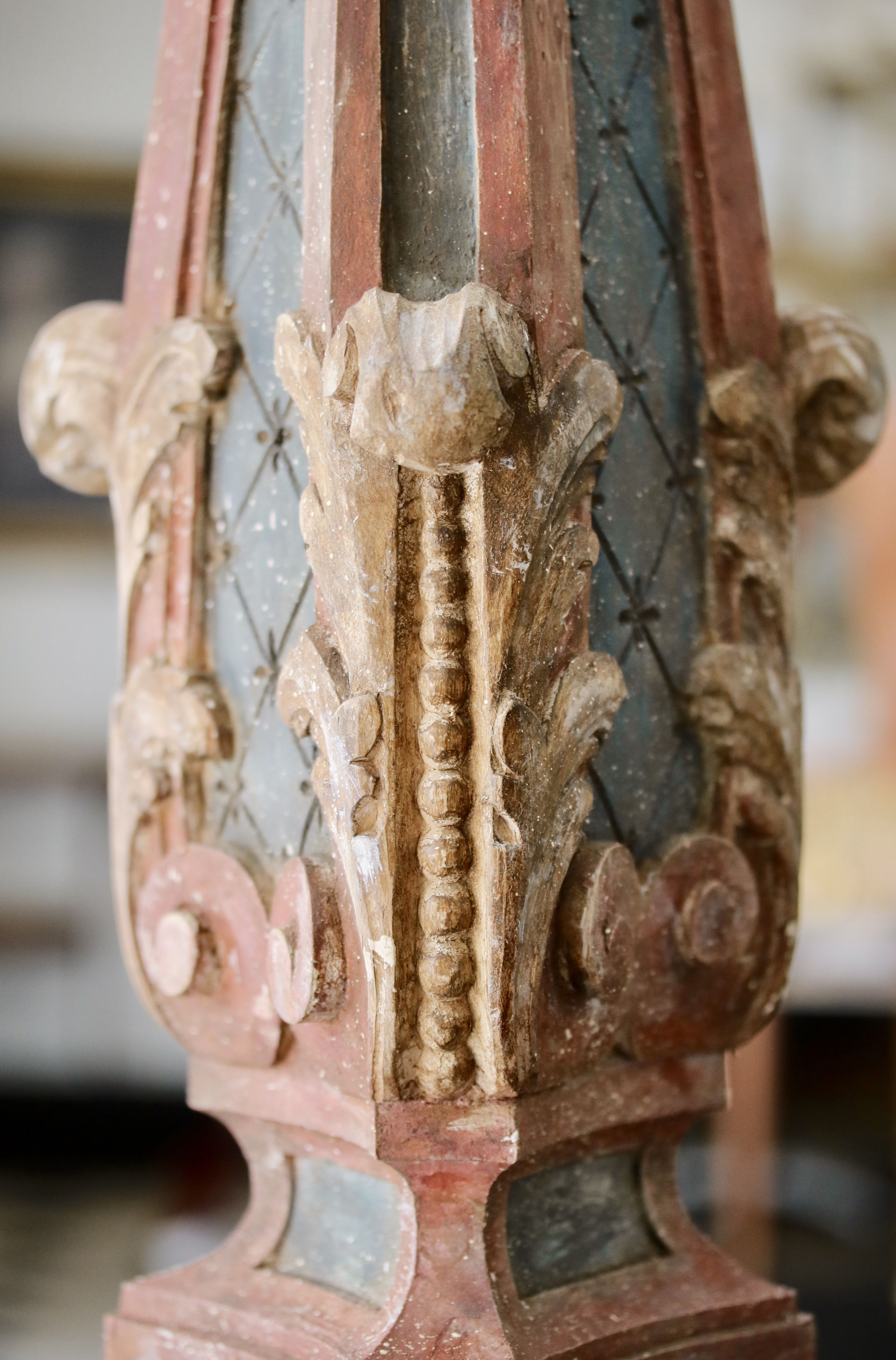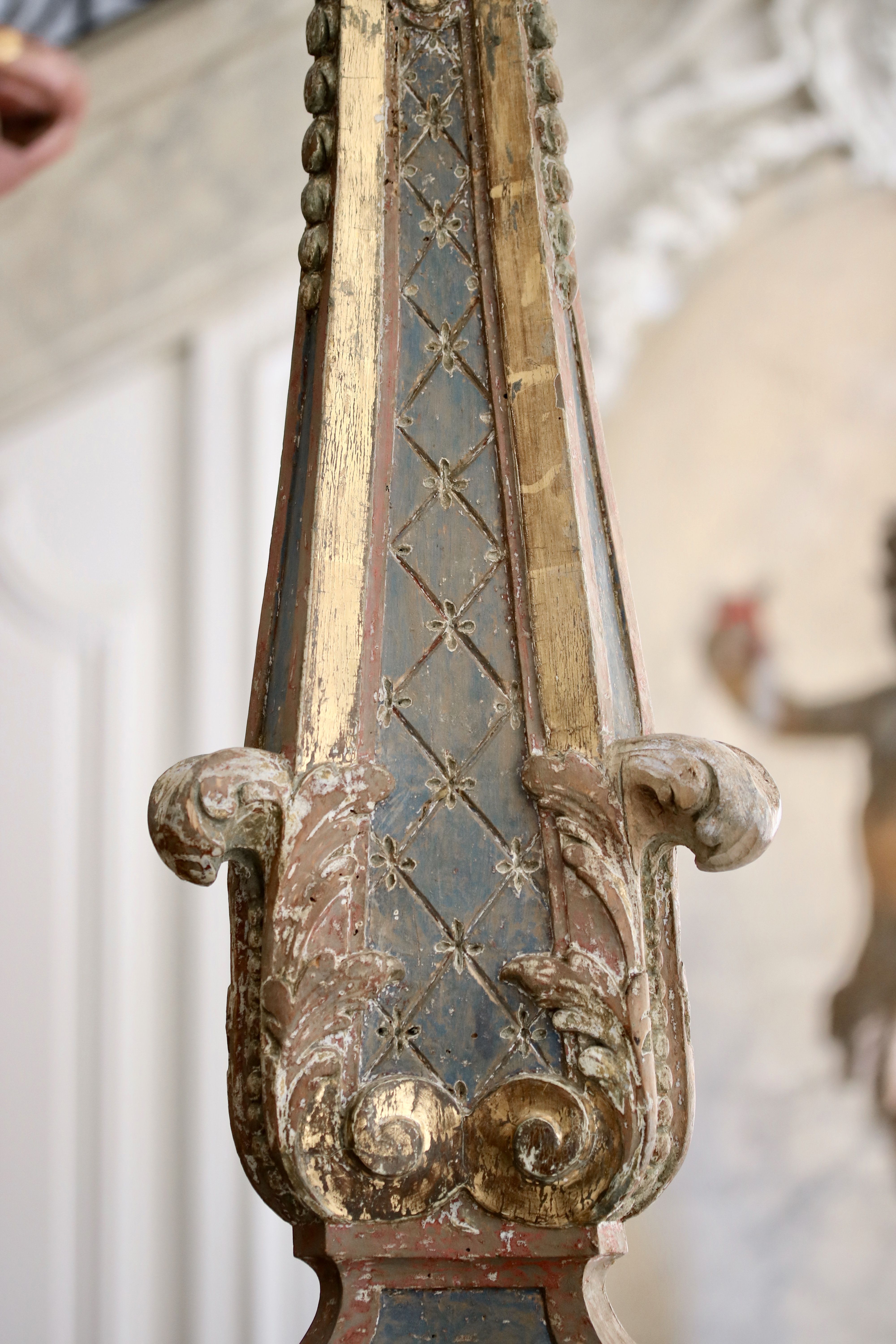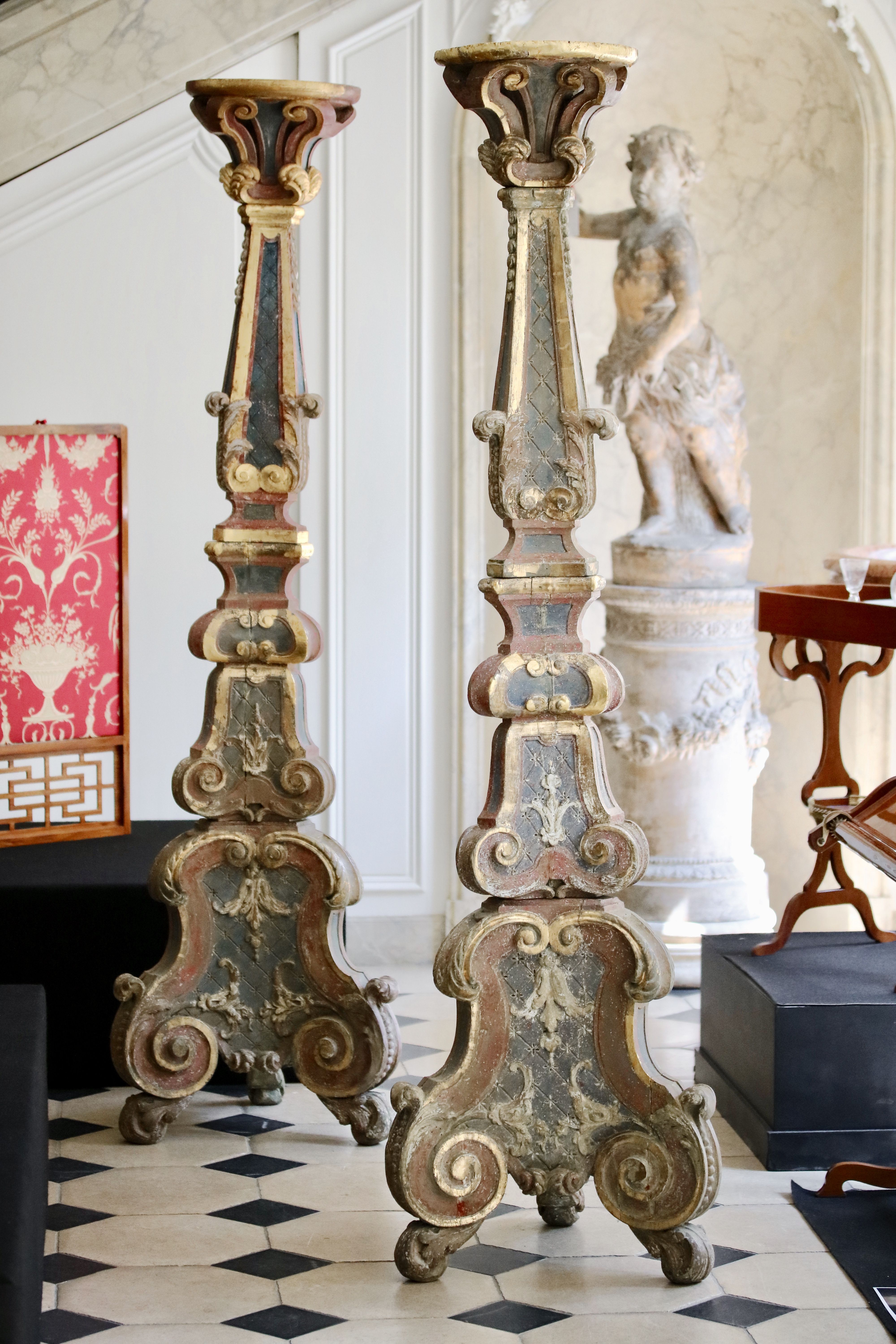 Paire de porte-torchères en bois peint polychrome et doré sculpté. Le fût en balustre, composé de trois parties distinctes, est richement décoré de divers éléments sculptés : volutes, feuilles d’acanthes, godrons et palmettes. Il repose sur un piétement tripode en console décoré de feuilles d’acanthes et de volutes. Epoque du XVIIIe siècle Restaurations d’usage, la partie haute d’une des deux portes-torchères est postérieure et sera restaurée H. 190 x D. 52 cm