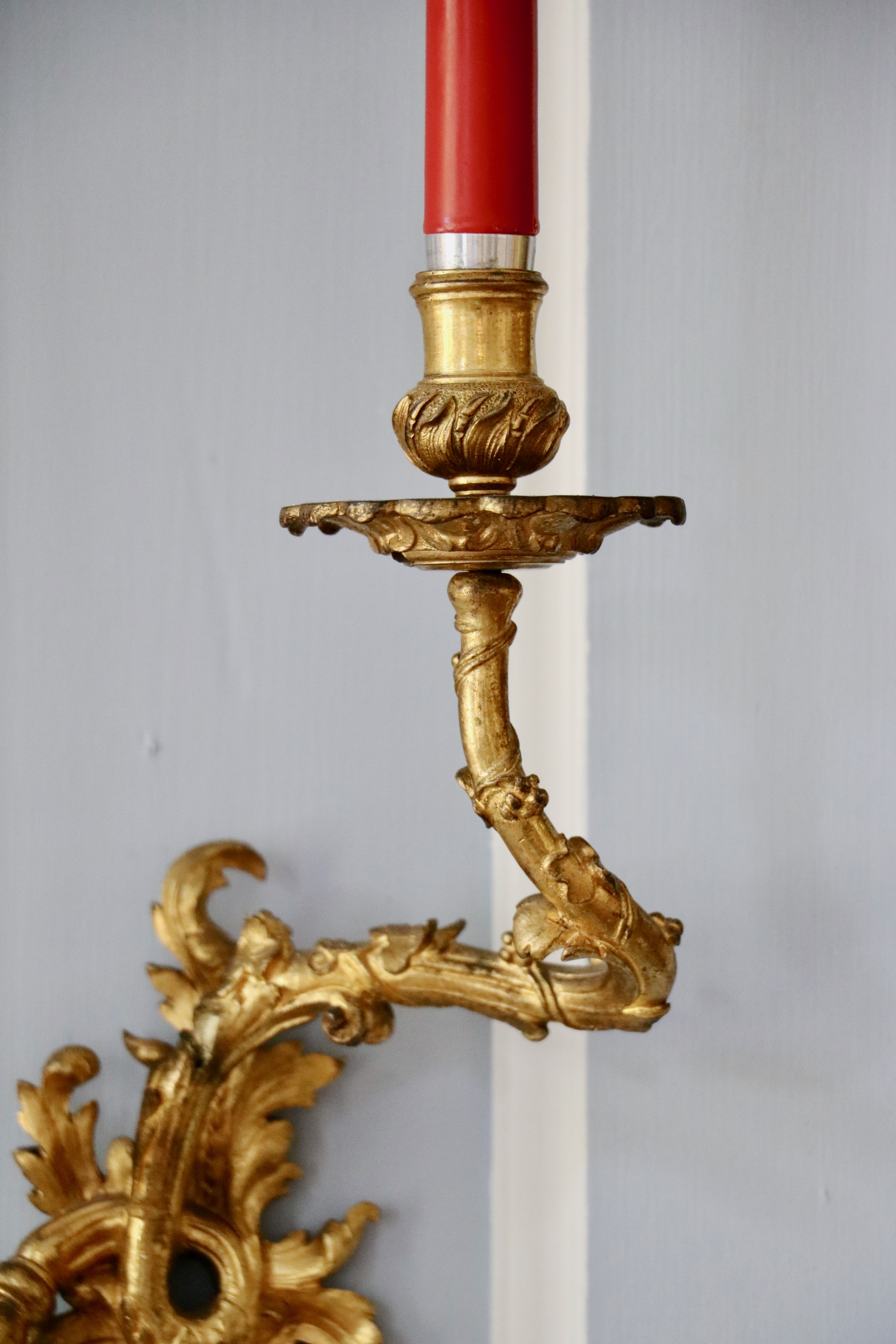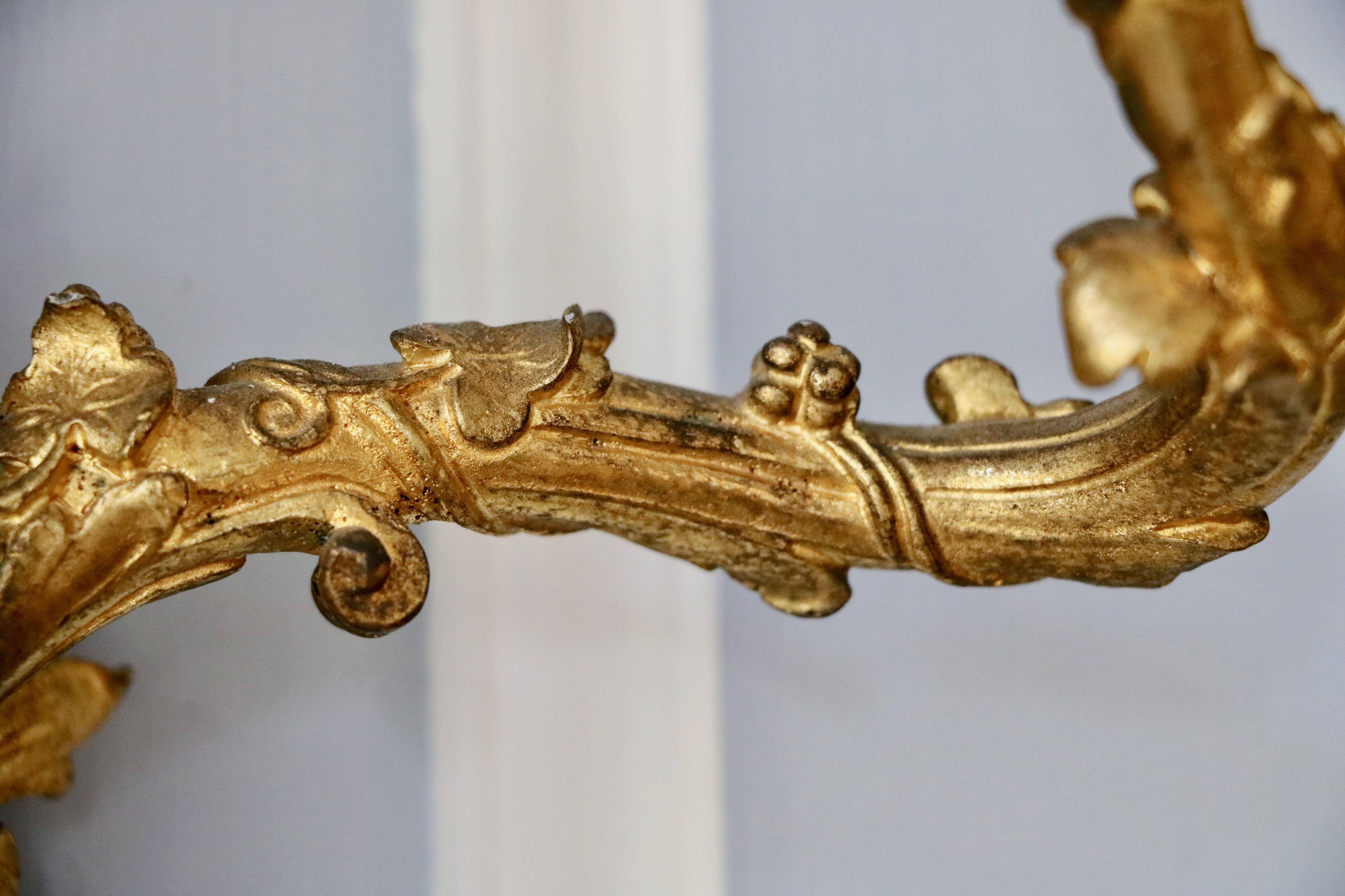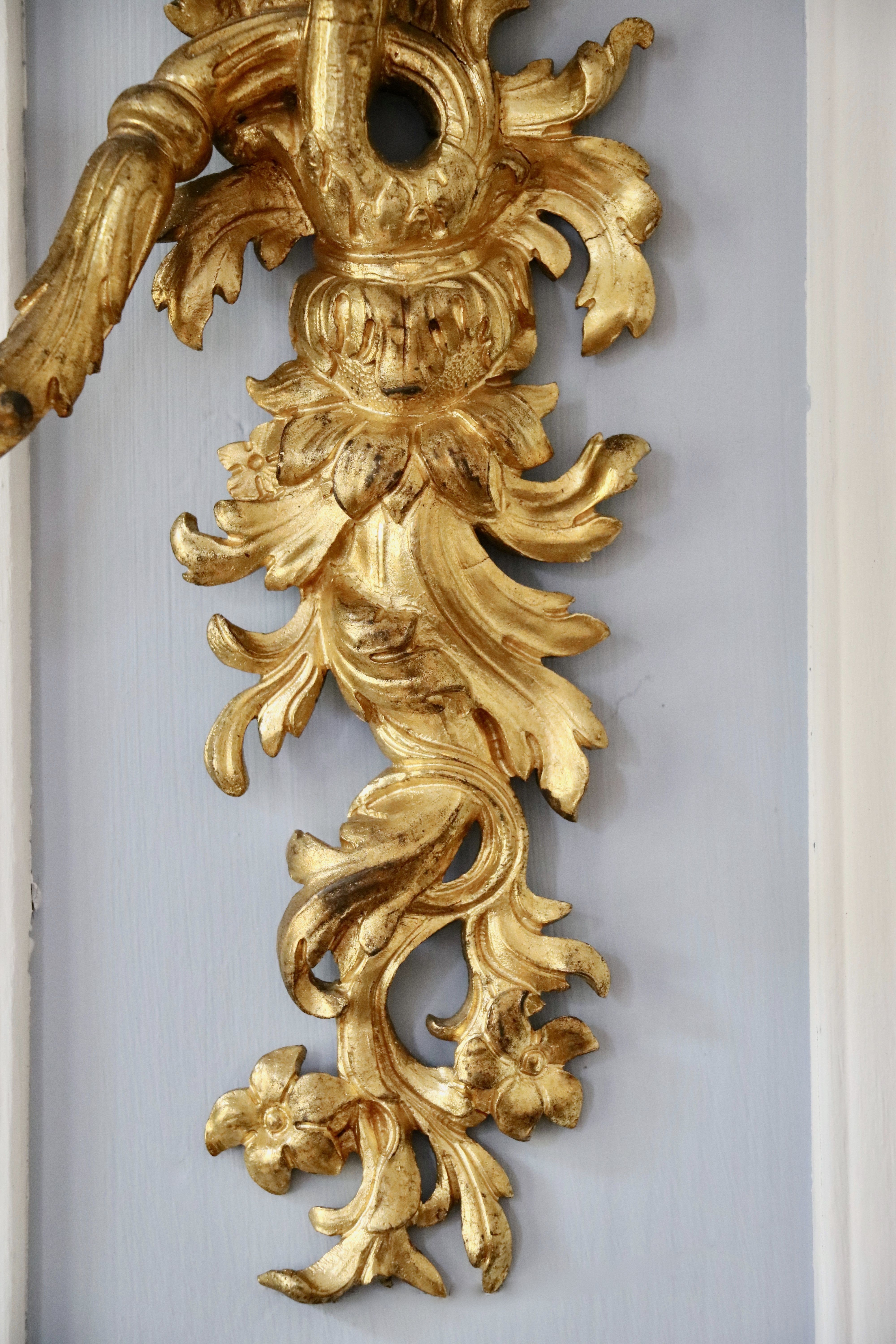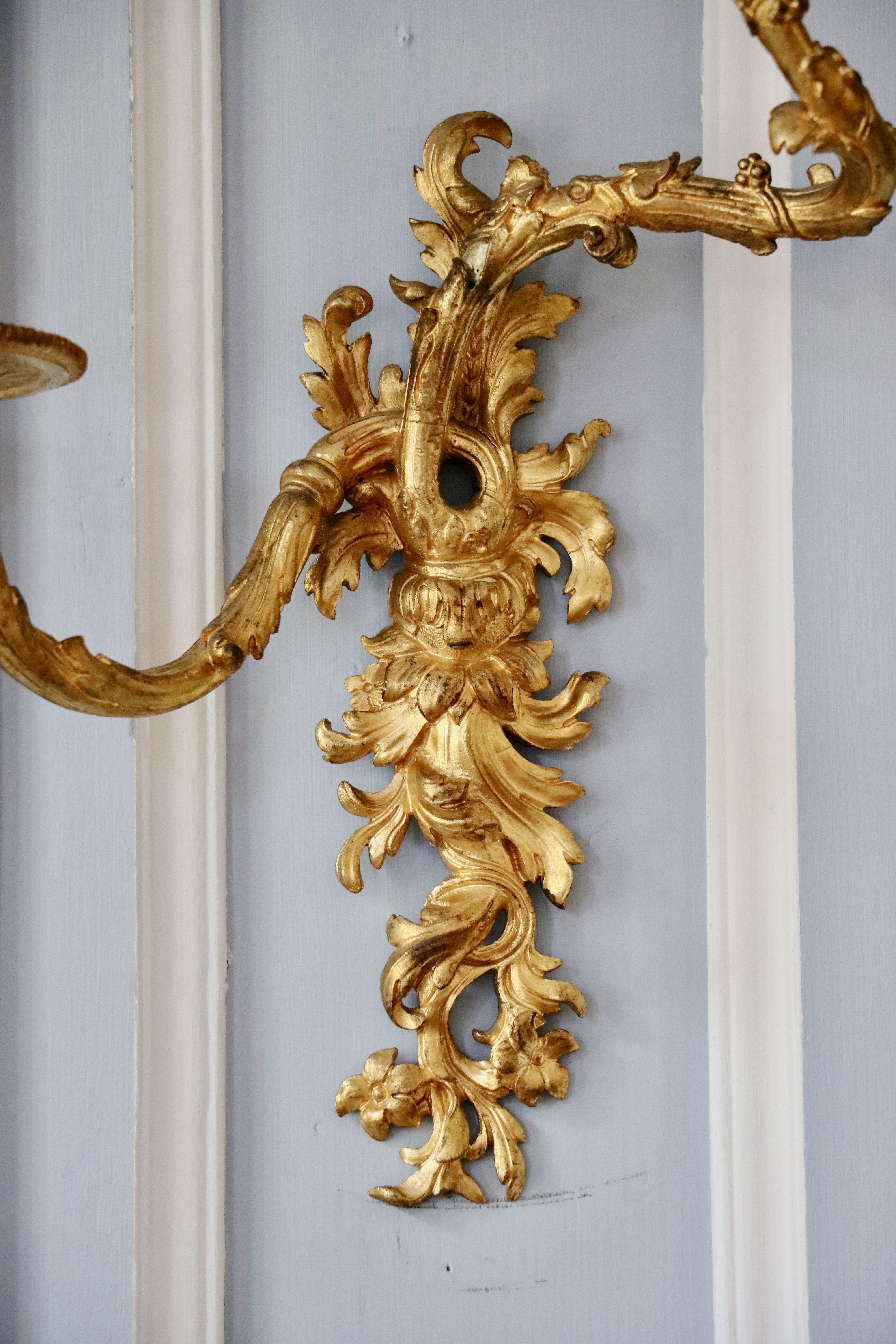 La paire d’appliques de notre étude peut être rapprochée des modèles d’André-Charles Boulle qui sont restés à l’état de projet ou qui sont aujourd’hui non répertoriés, et qui nous sont parvenus grâce aux dessins du célèbre ébéniste. Ces planches sont un témoignage très précieux pour le maître, car aucun ébéniste n’avait publié un corpus de ses créations et de ses projets. Parmi ces planches, retenons la numéro 8, puisque le maître y a représenté des appliques ainsi que des bras « de grands cabinets et des bras pour cheminée » qui font écho à notre paire. Cette planche fut commandée par Pierre-Jean Mariette qui les publie vers 1707 dans un ouvrage intitulé « Nouveaux dessins de meubles et ouvrages de bronze et de marqueterie inventés et gravés par André-Charles Boulle ». Nous retrouvons des appliques avec une composition qui s’en rapproche au J. Paul Getty Museum à Malibu, ainsi qu’au Musée du Louvre. Un détail nous frappe dans la composition de ces appliques : les bobèches sont différentes sur les deux bras, il s’agit d’un élément typique de sa production comme nous pouvons le remarquer sur une paire d’appliques reproduite dans le livre « André-Charles Boulle - un nouveau style pour l’Europe » écrit sous la direction de Jean Nérée Ronfort (pages 272-273) et aujourd’hui conservé au Musée des Arts décoratifs. Fait rare qui mérite d’être souligné, André-Charles Boulle fond ses propres bronzes. C’est une exception dans le système corporatif très cloisonné de l’Ancien Régime, où les menuisiers ne peuvent en aucun cas sculpter leurs sièges, ni même les tapissiers monter leur propres bâtis. Or André-Charles Boulle porte bien le titre d’ « Ebéniste, scizeleur et marqueteur ordinaire du roy ». Jouissant de la protection royale, les jurés et maîtres ne peuvent pénétrer à tout venant en ses ateliers comme ils sont habilités à le faire ailleurs. Sa familiarité avec le travail du bronze lui permet donc de proposer non seulement des meubles richement ornés, mais également, comme l’objet de notre étude l’atteste, des éléments décoratifs entièrement en bronze.