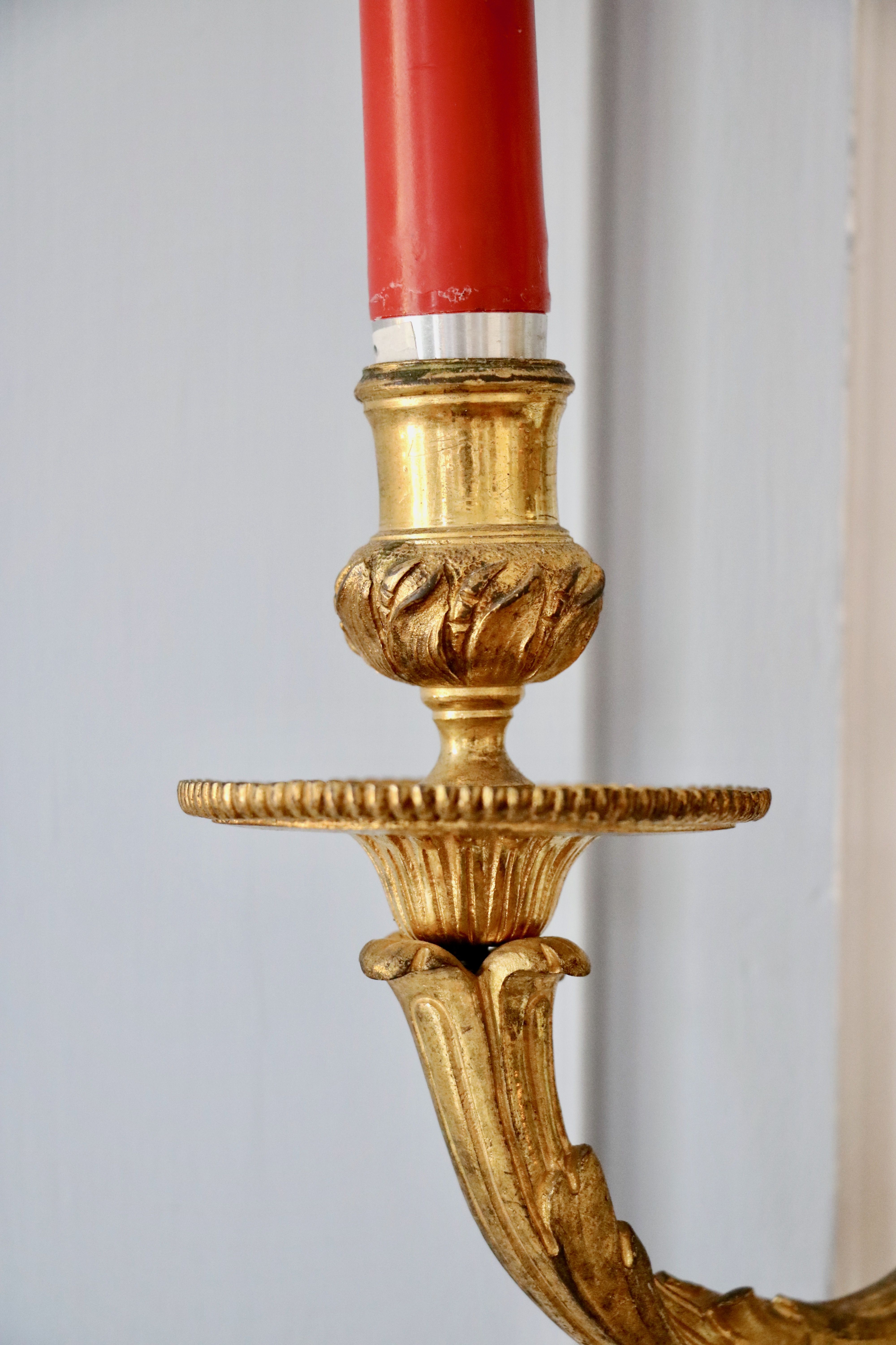 Paire d’appliques à deux bras de lumières en bronze doré et ciselé à décors de fleurs, de volutes, de feuilles d’acanthe. Chacun des deux bras propose une bobèche différente. Modèle d’André-Charles Boulle Epoque Régence Restaurations d’usage H. 35 x L. 27 cm