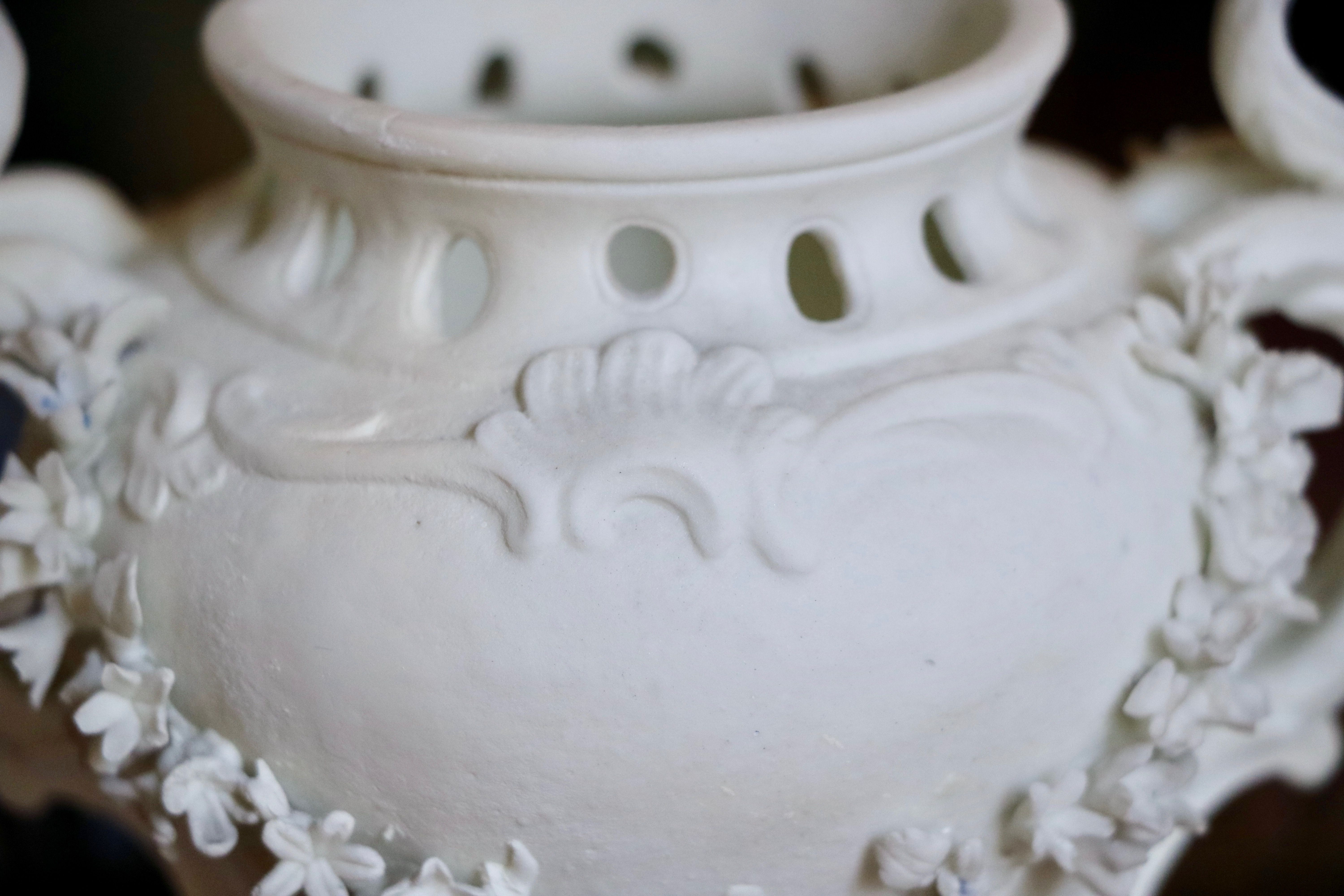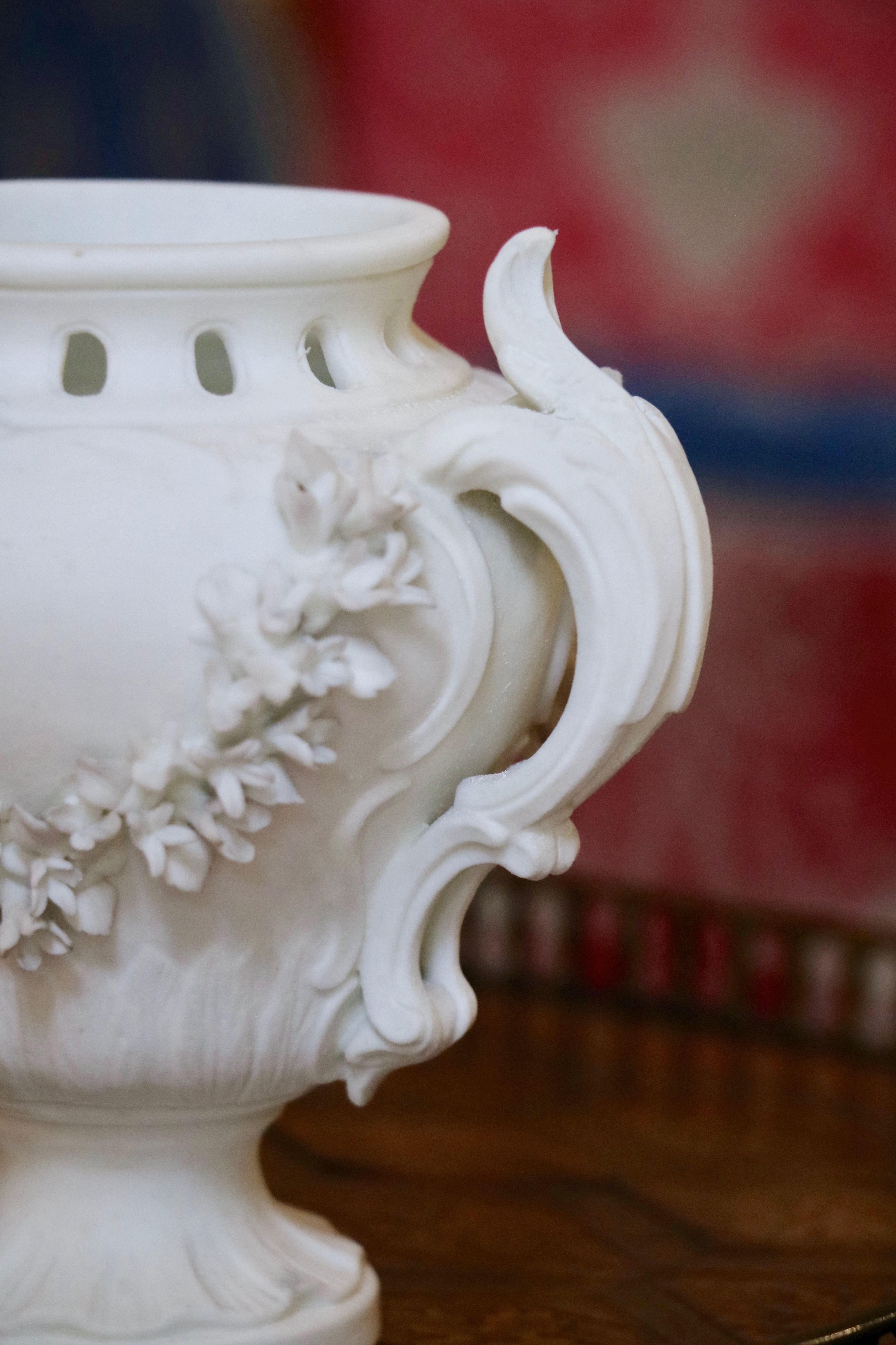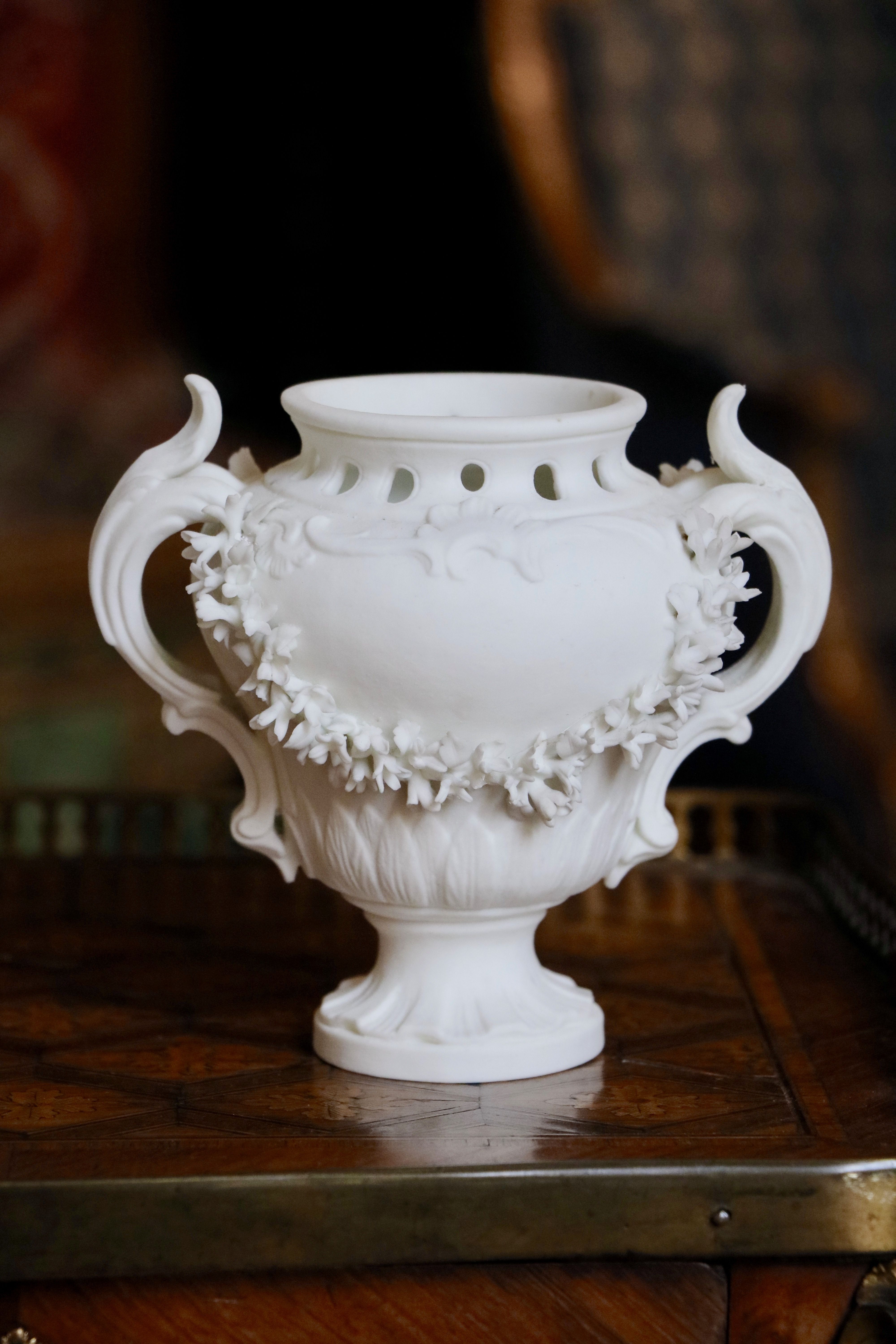 Paire de pots-pourris en biscuit. Le col est ajouré et les feuilles d’acanthe en courbes et contre-courbes forment des anses, la panse du vase est ornée de chaque côté d’une guirlande de fleurs. Décor végétal. Epoque Louis XV Restaurations d’usage H. 14 x D. 10,5 cm