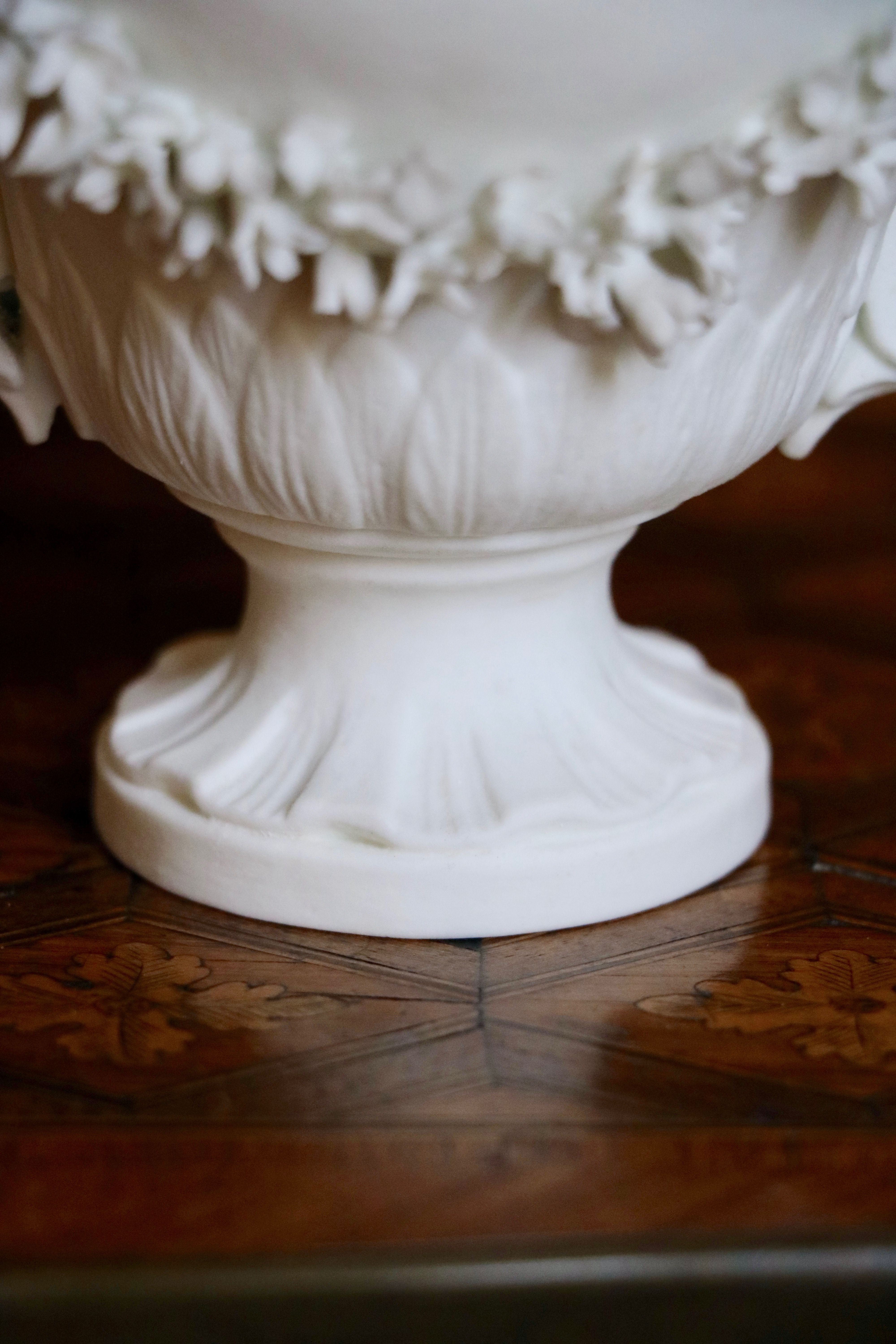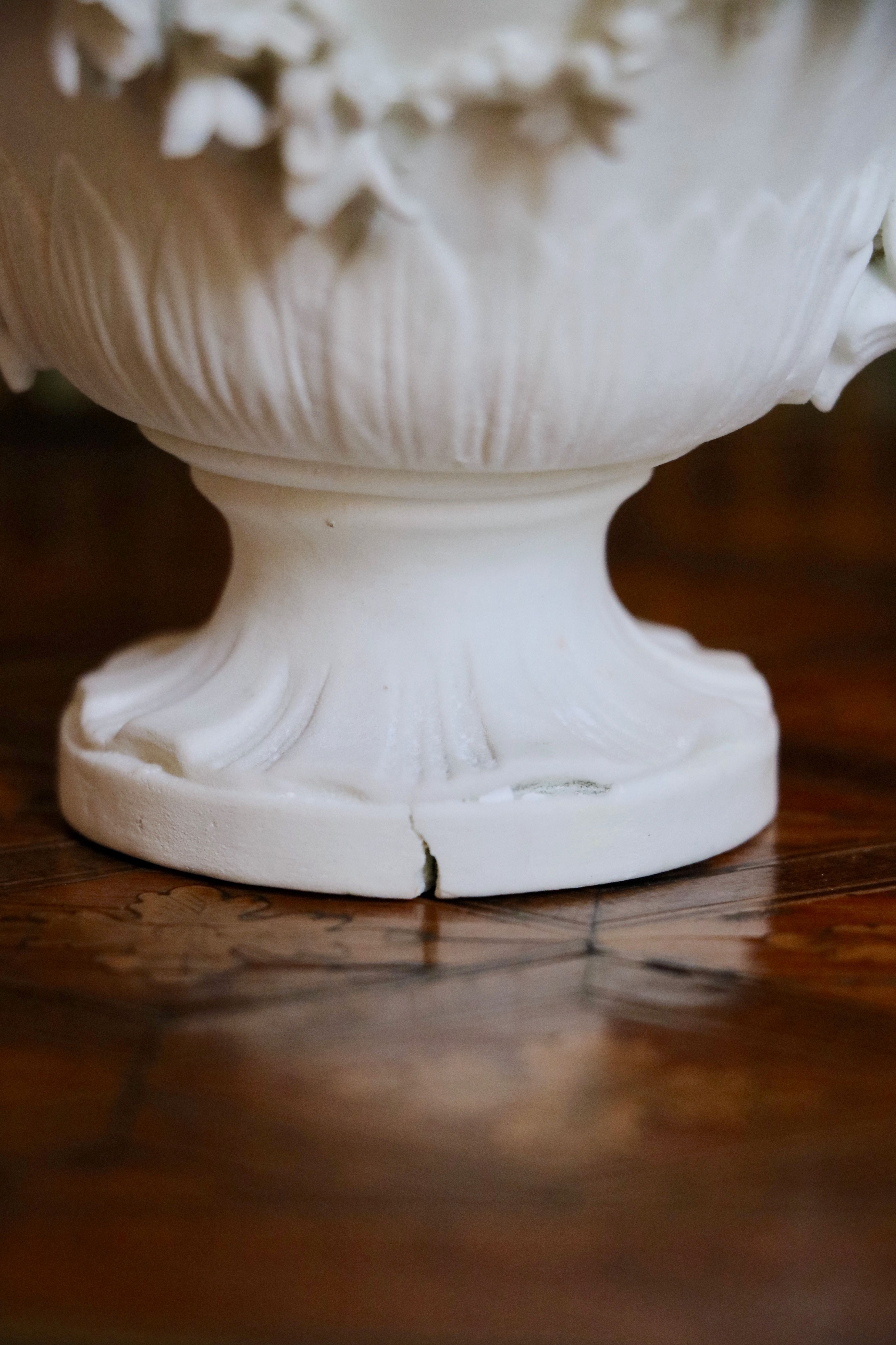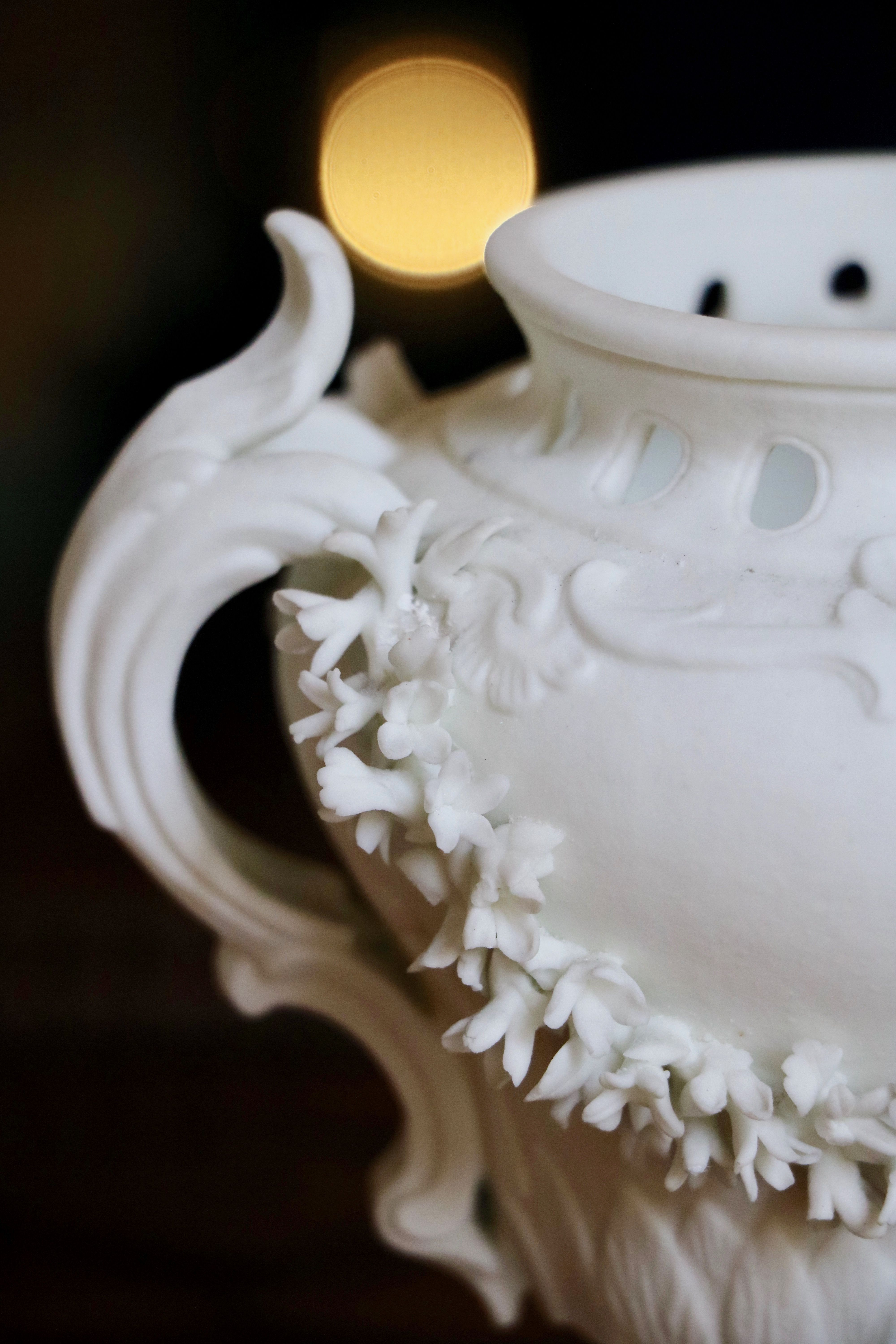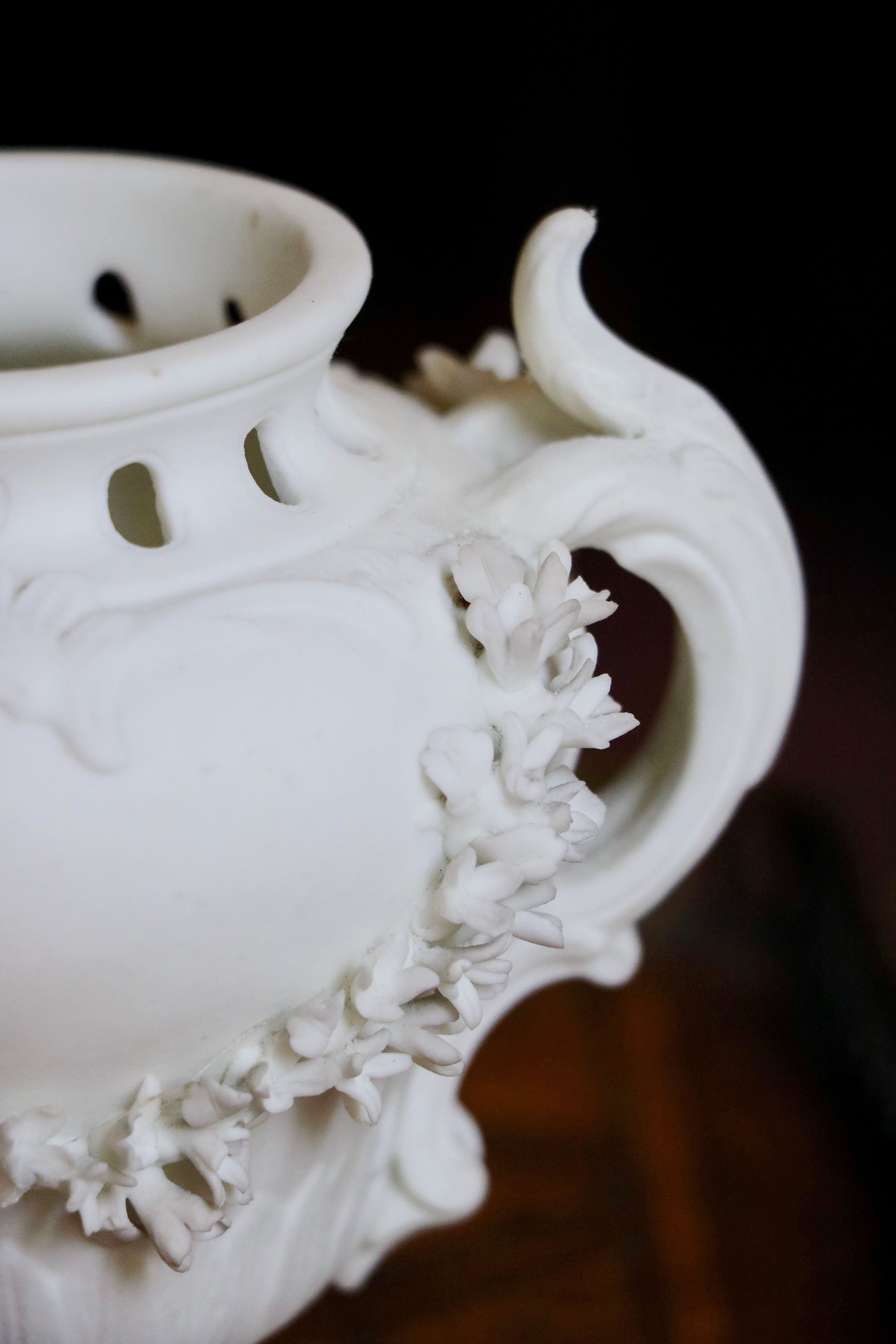 Paire de pots-pourris en biscuit. Le col est ajouré et les feuilles d’acanthe en courbes et contre-courbes forment des anses, la panse du vase est ornée de chaque côté d’une guirlande de fleurs. Décor végétal. Epoque Louis XV Restaurations d’usage H. 14 x D. 10,5 cm