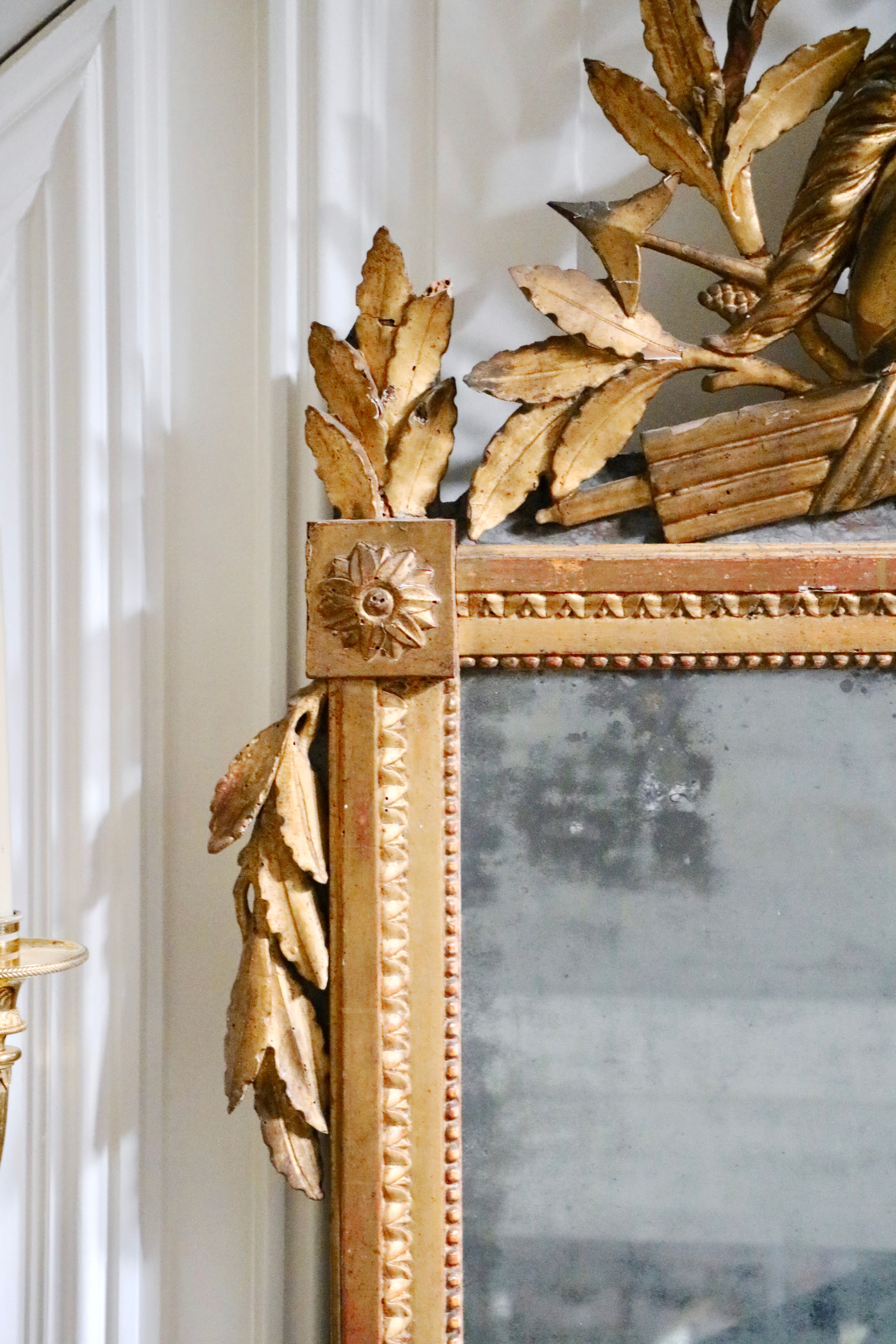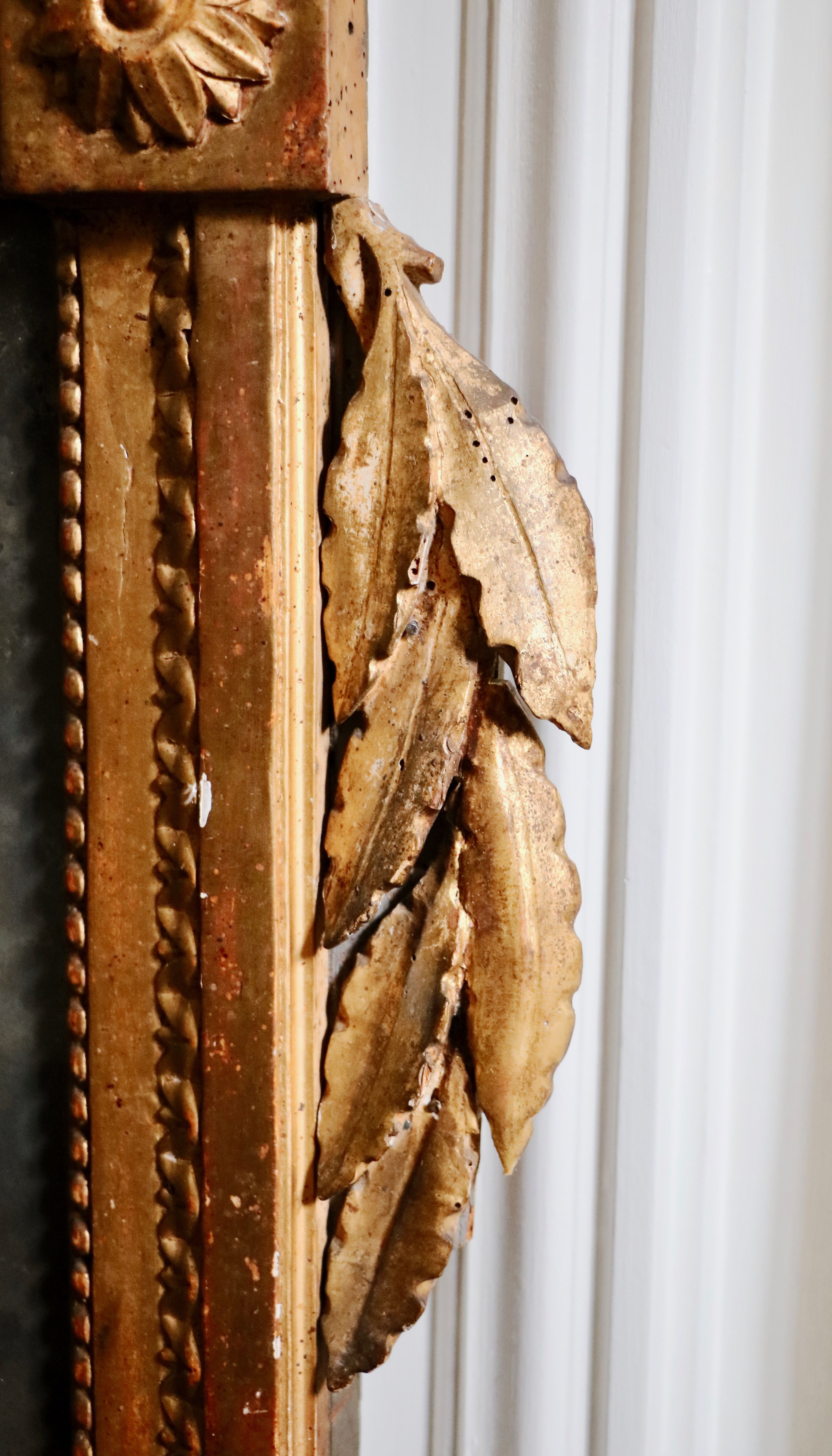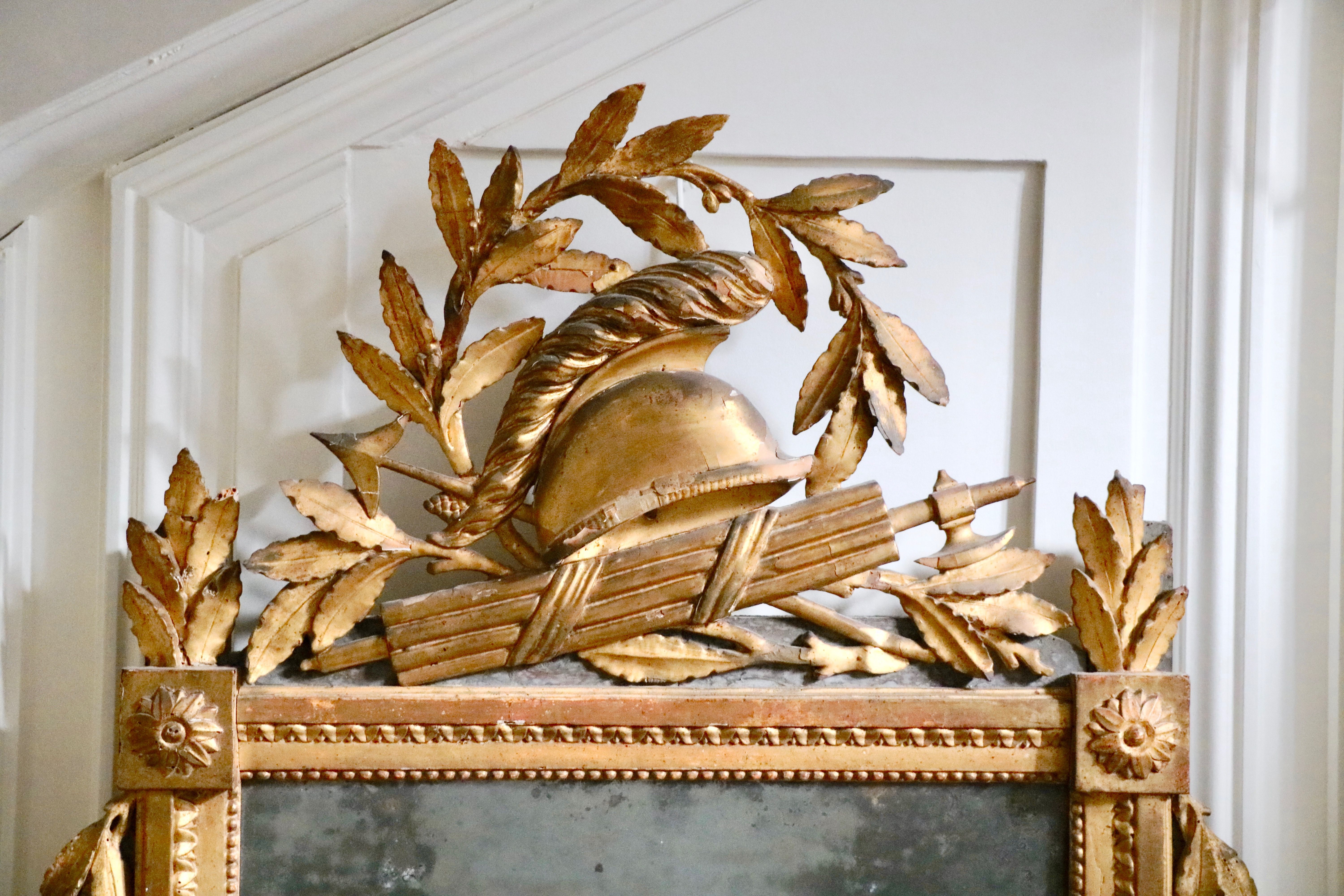 Miroir en bois doré surmonté par un fronton représentant un trophée composé d’un casque, d’une flèche et d’un faisceau de licteur encadrés par des branches de lauriers. Le cadre du miroir est sculpté de rangs de perles et est mouluré sur son pourtour. Aux quatre angles, le miroir est agrémenté d’une fleur. La partie basse est sculptée de feuilles de chêne encadrées par deux pommes de pin. Epoque Louis XVI Restaurations d’usage, éclats à la dorure H. 152 x L. 80 cm