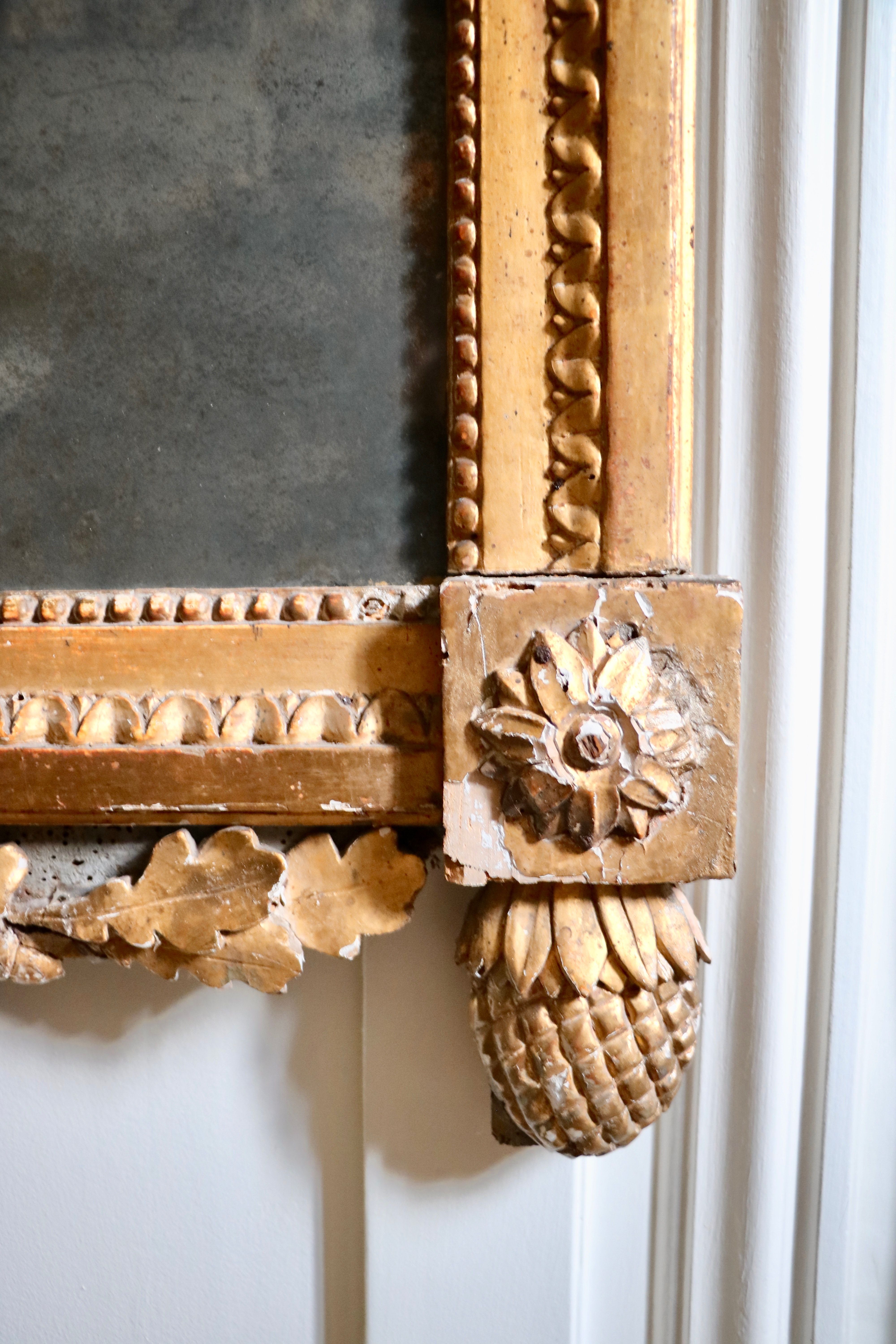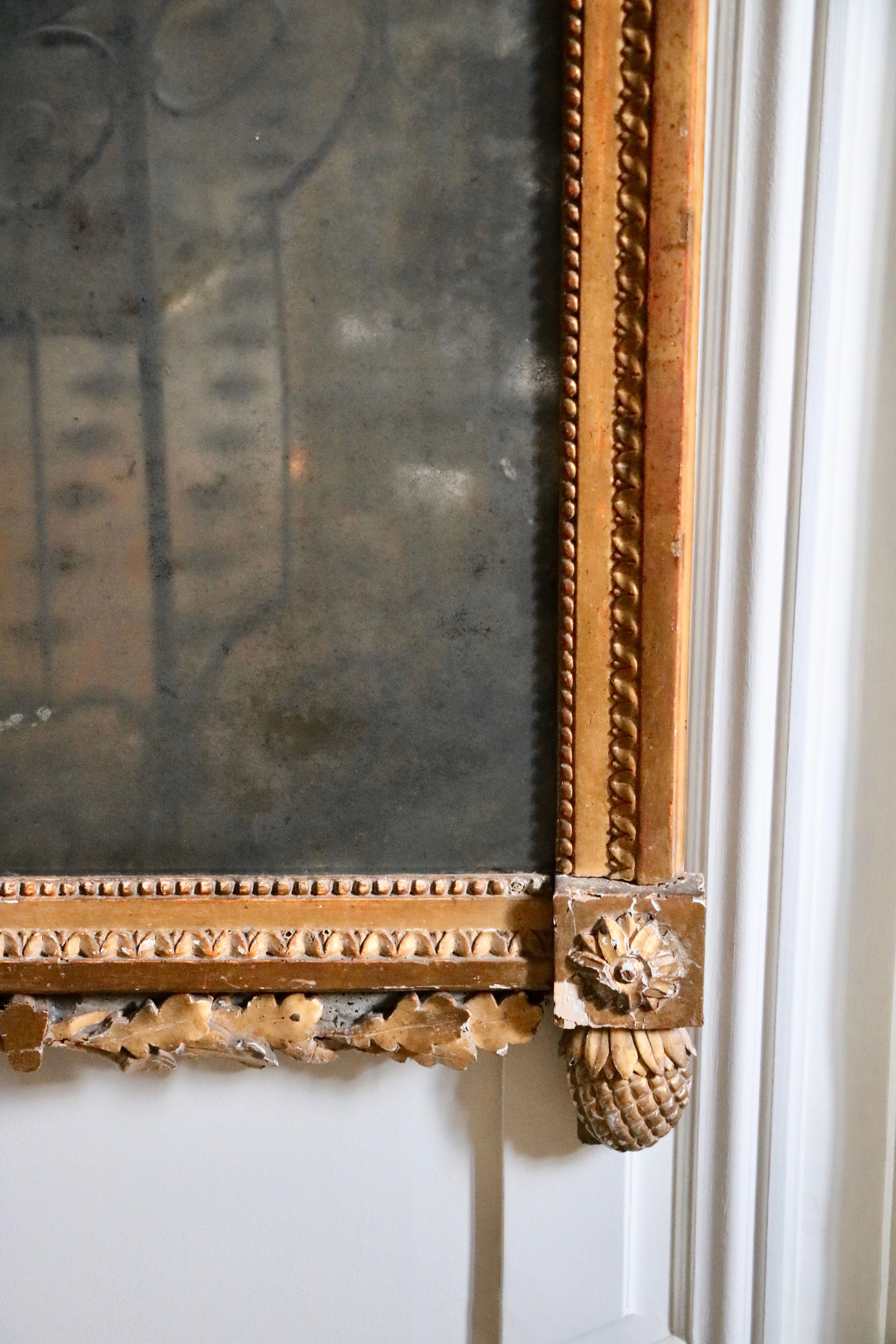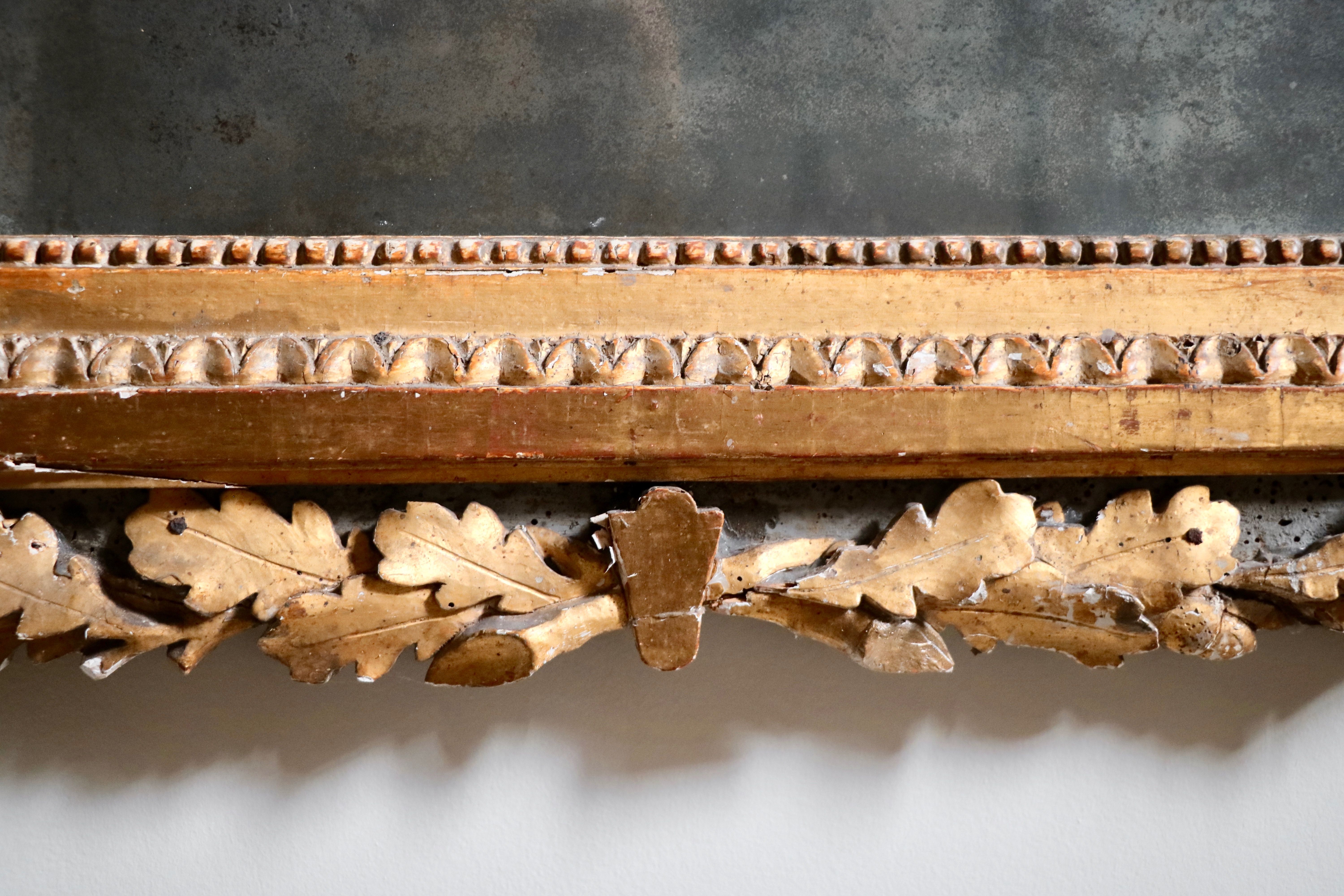 Miroir en bois doré surmonté par un fronton représentant un trophée composé d’un casque, d’une flèche et d’un faisceau de licteur encadrés par des branches de lauriers. Le cadre du miroir est sculpté de rangs de perles et est mouluré sur son pourtour. Aux quatre angles, le miroir est agrémenté d’une fleur. La partie basse est sculptée de feuilles de chêne encadrées par deux pommes de pin. Epoque Louis XVI Restaurations d’usage, éclats à la dorure H. 152 x L. 80 cm