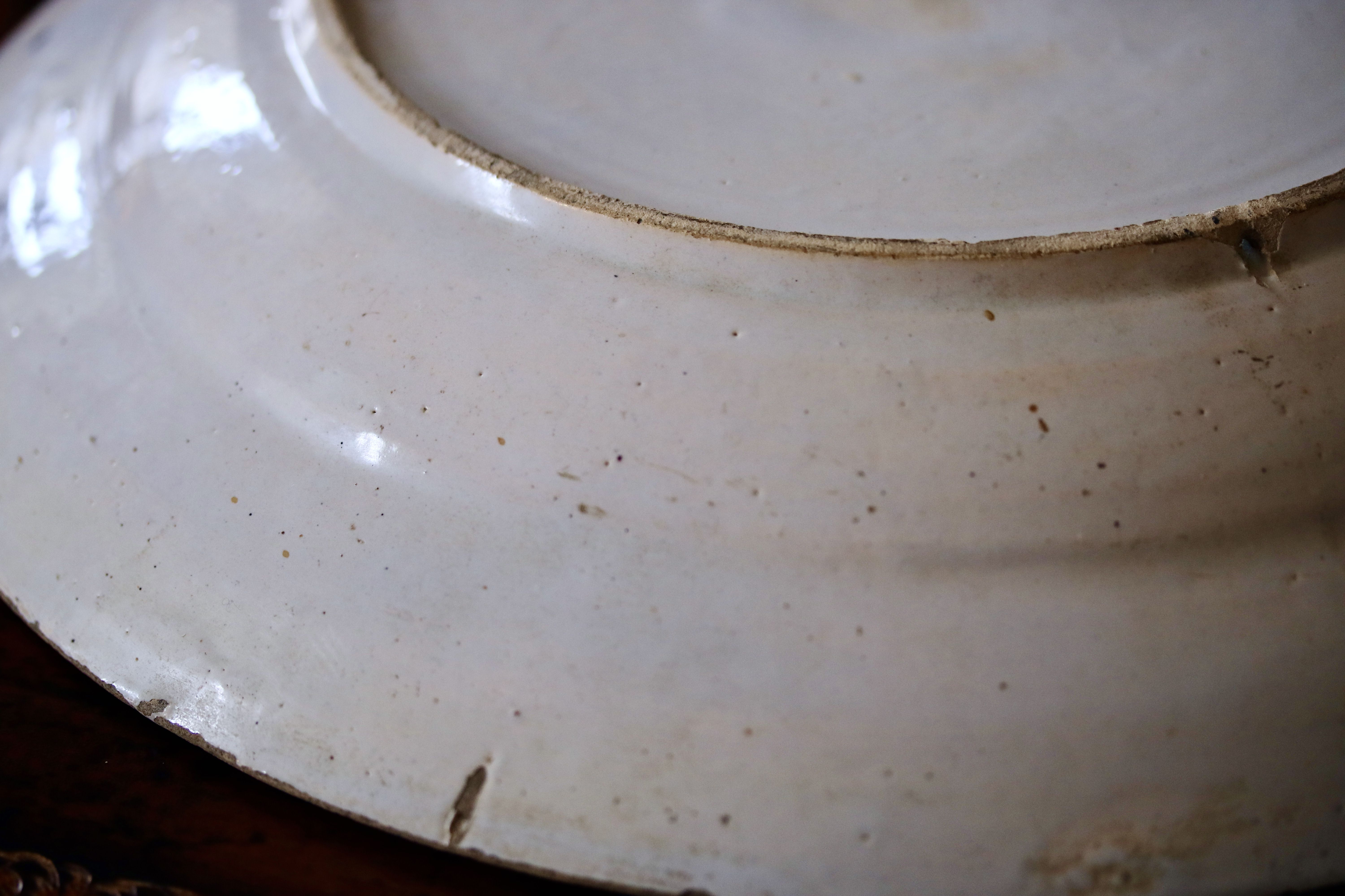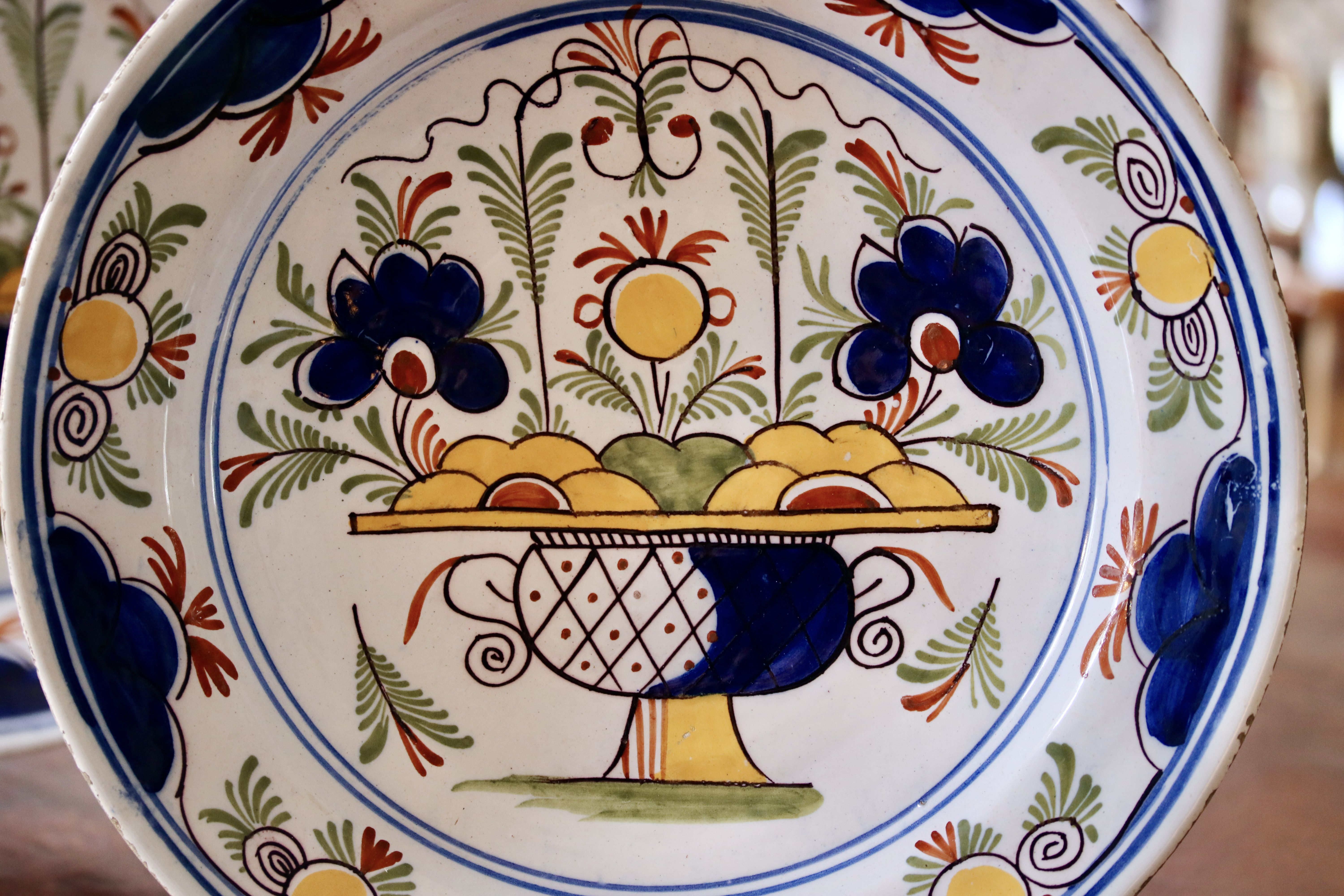Paire de plats en faïence de Delft polychromes. Les décors bleus, jaunes, rouges, verts sur fond blanc représentent une coupe stylisée entourée de motifs feuillagés et géométriques. Epoque XVIIIe siècle Restaurations d’usage, légèrement accidentés D. 34,5 cm