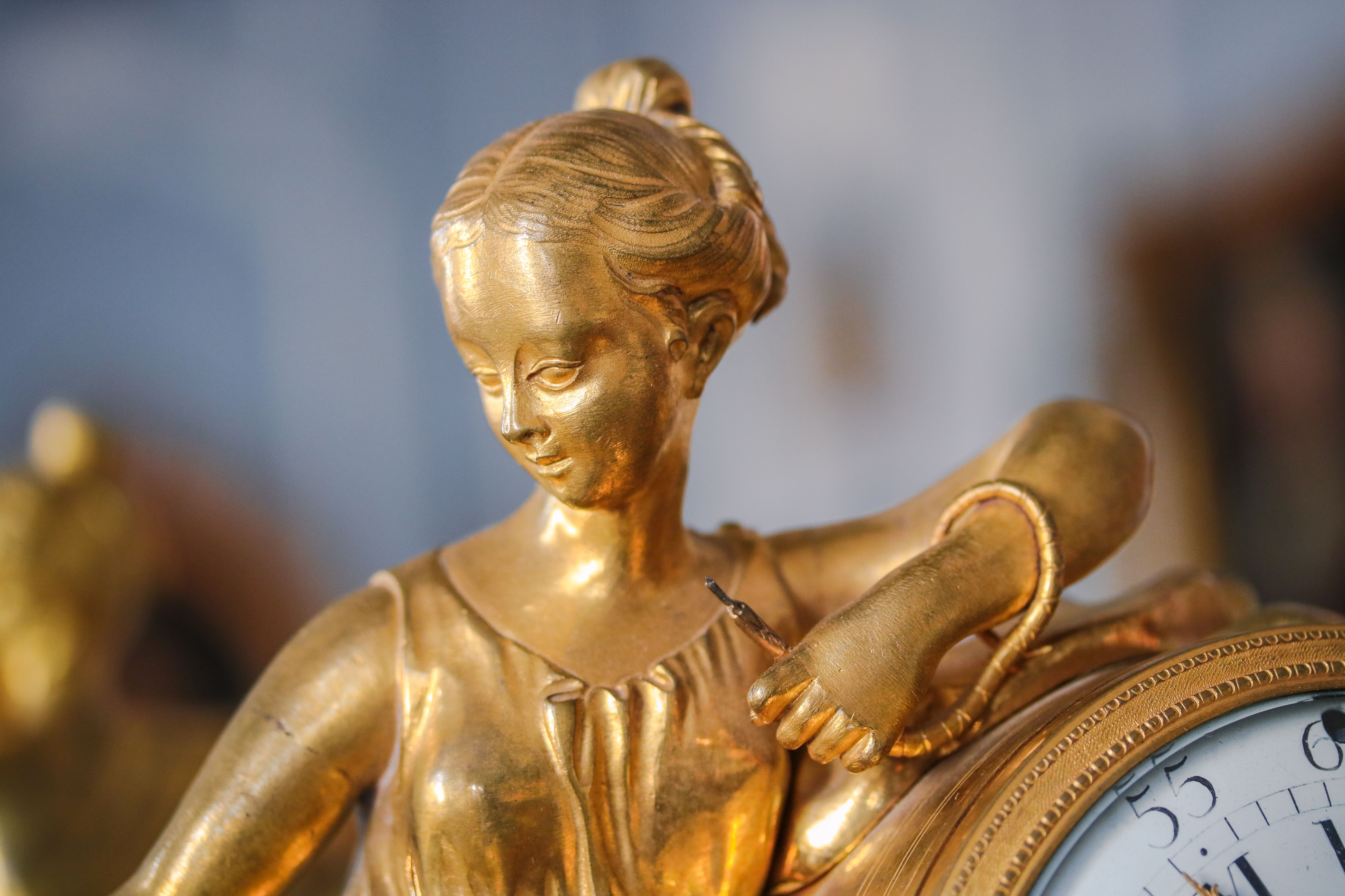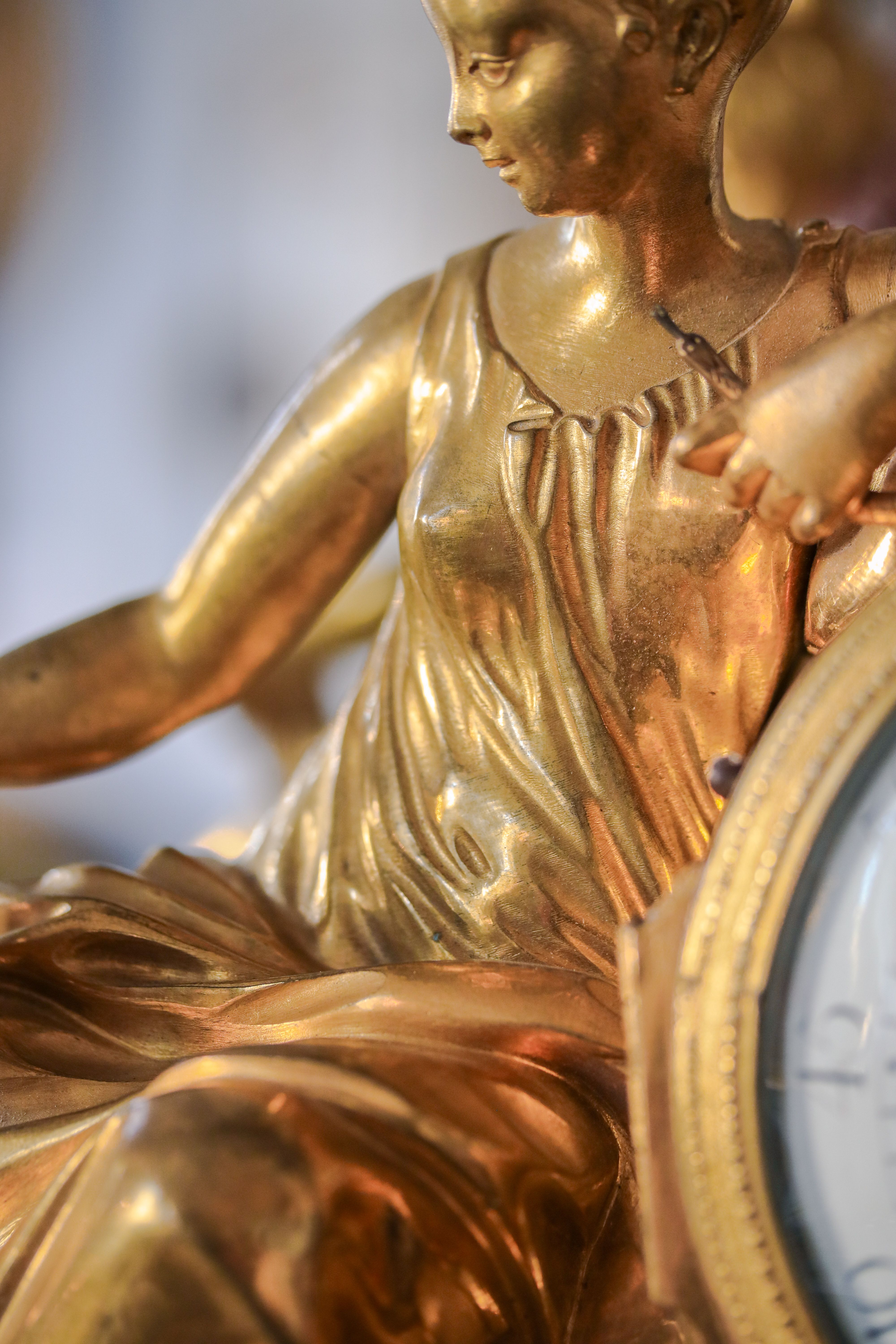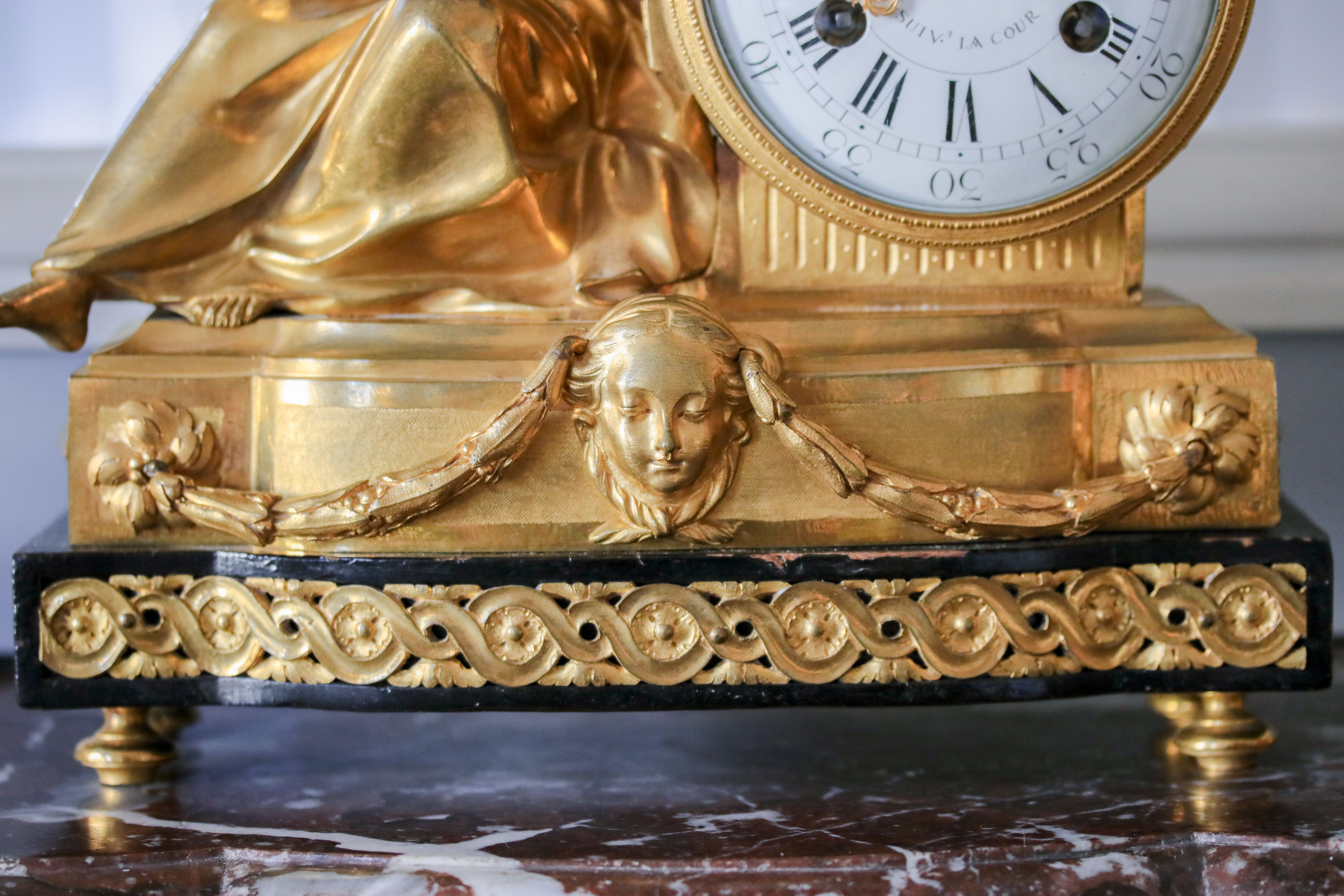 Pendule représentant la Prudence en bronze doré et ciselé reposant sur un socle en bois noirci. La pendule repose sur quatre petits pieds en bronze doré. Mouvement de « Causard horloger du roi - Suivant à la cour » D’après un dessin d’Antoine Foullet Epoque Louis XVI Restaurations d’usage H. 32 x L. 29 x P. 13 cm