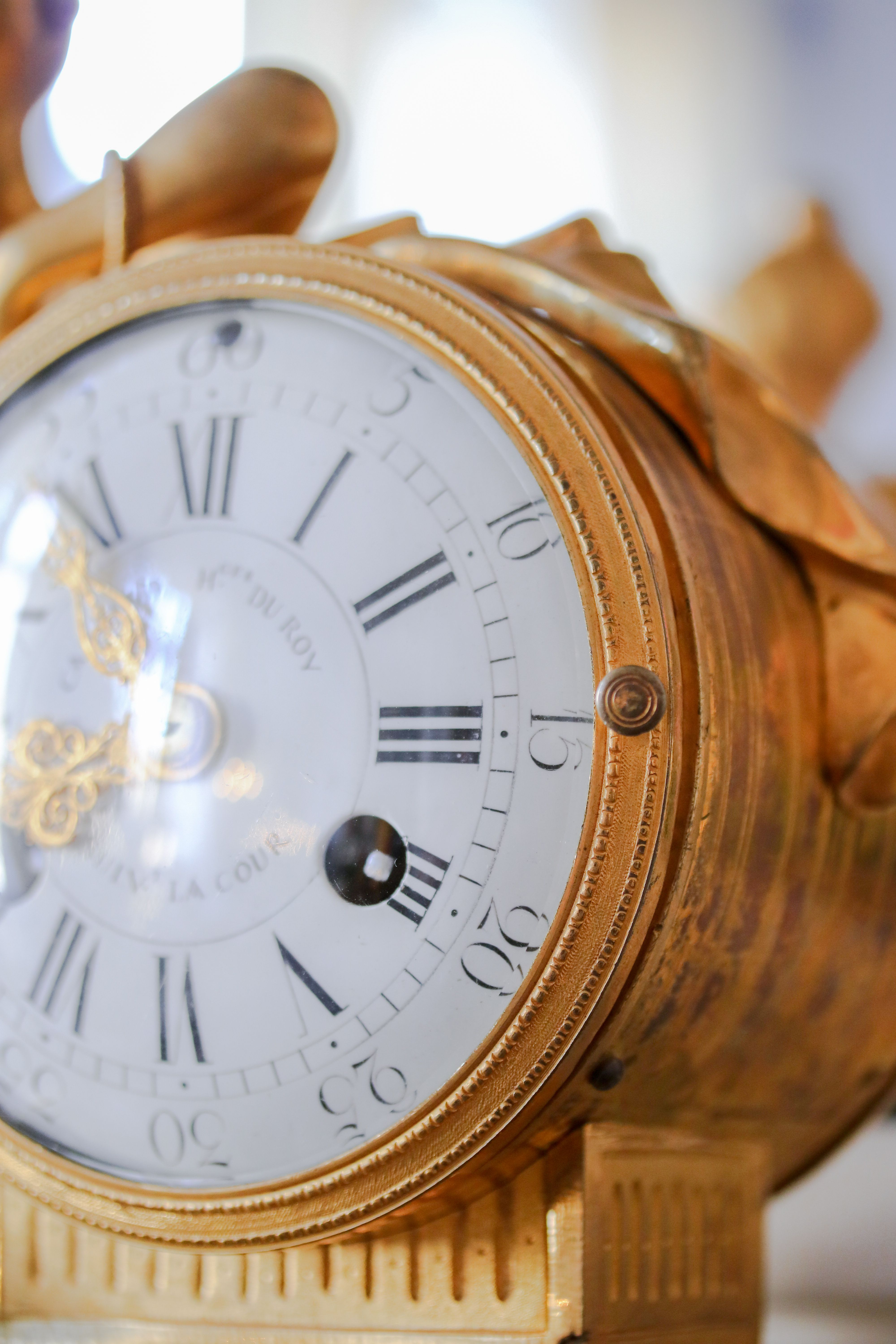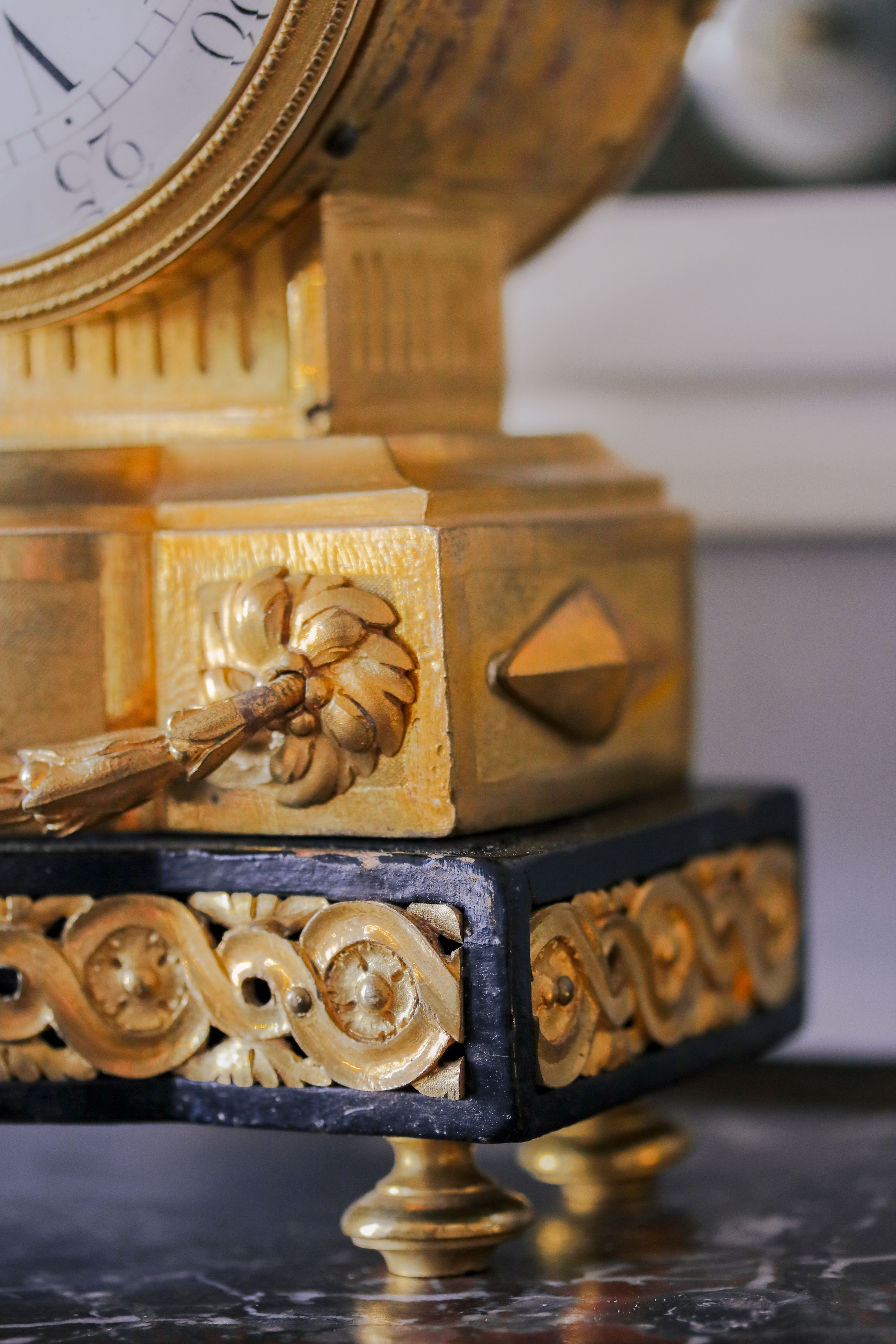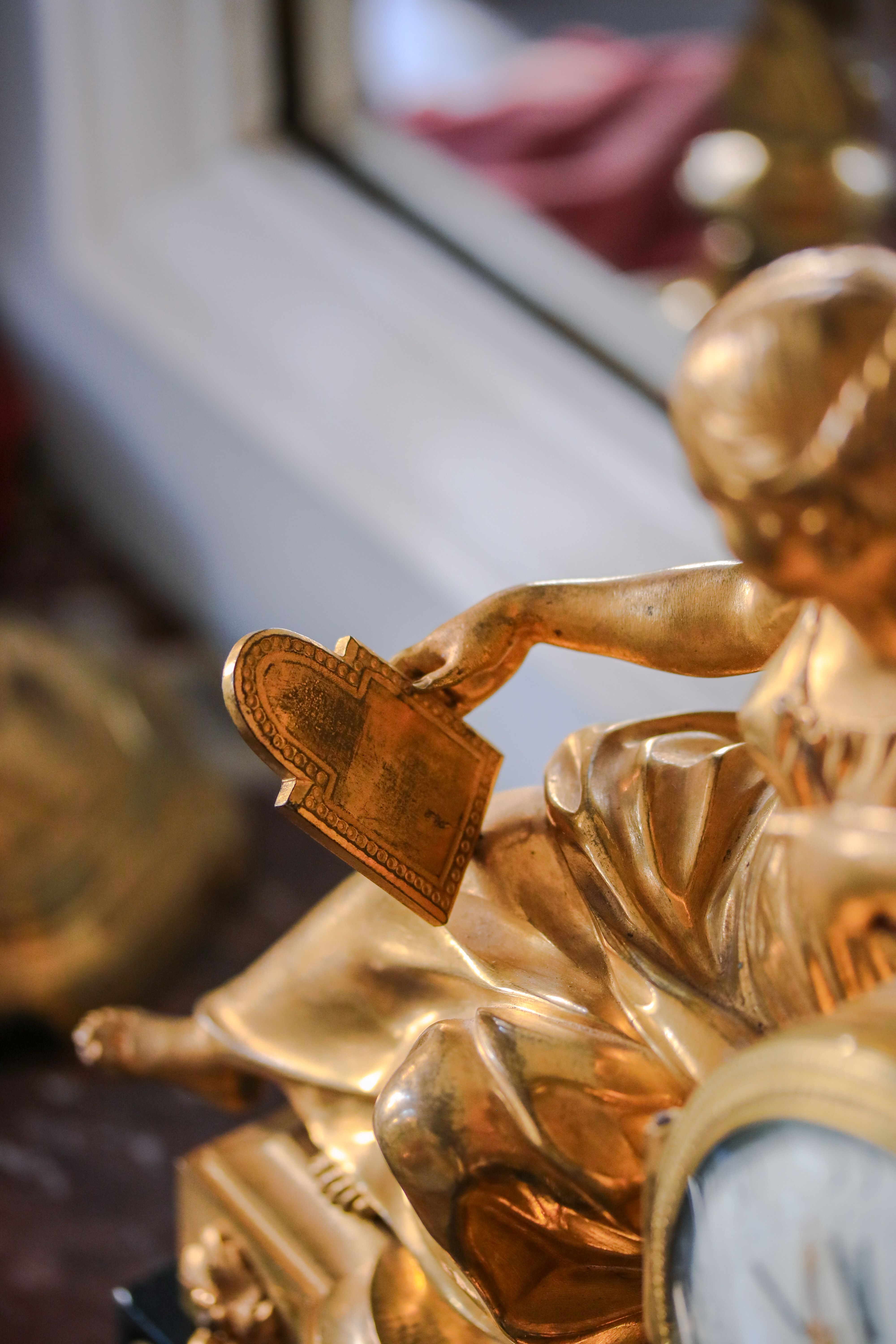 Pendule représentant la Prudence en bronze doré et ciselé reposant sur un socle en bois noirci. La pendule repose sur quatre petits pieds en bronze doré. Mouvement de « Causard horloger du roi - Suivant à la cour » D’après un dessin d’Antoine Foullet Epoque Louis XVI Restaurations d’usage H. 32 x L. 29 x P. 13 cm