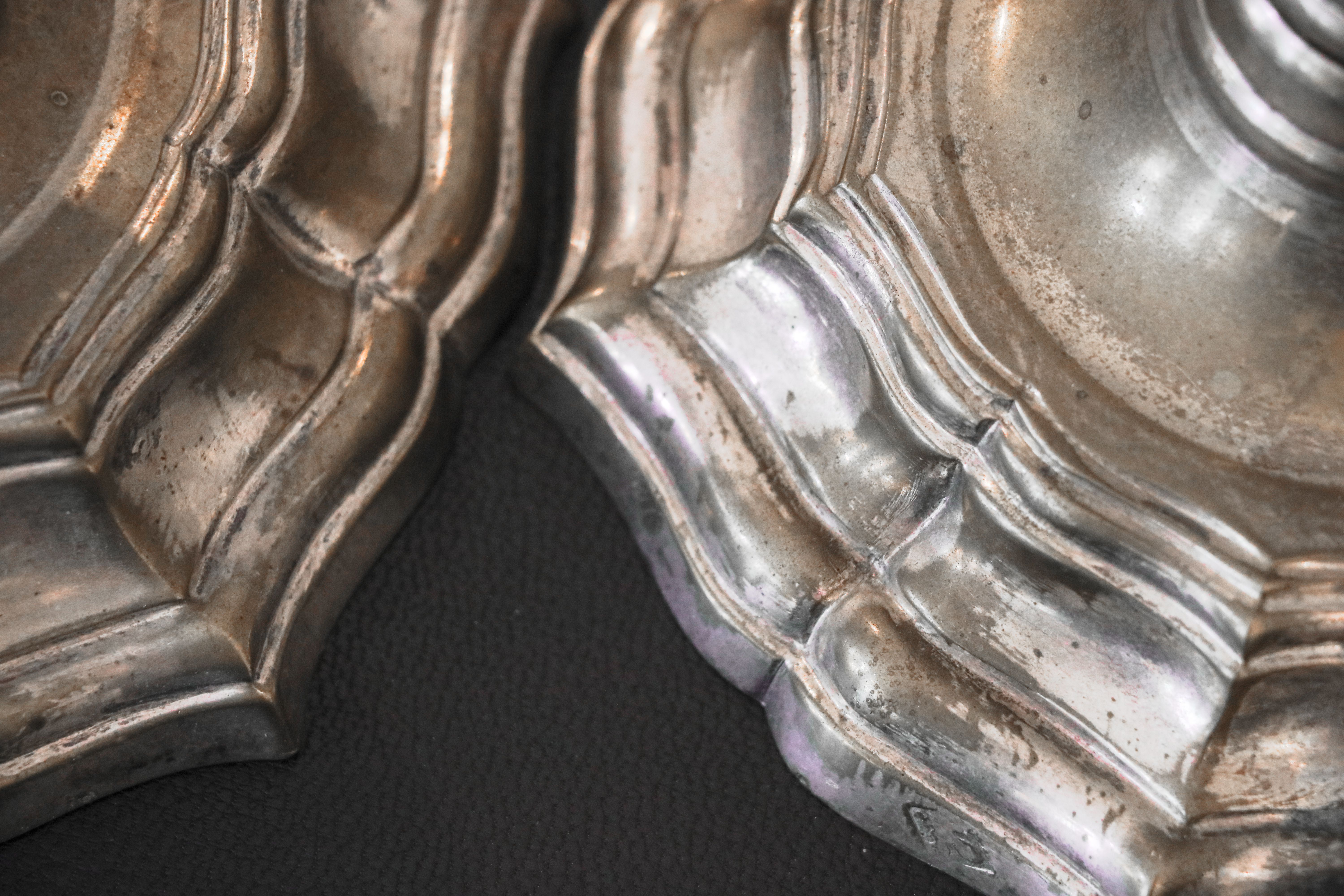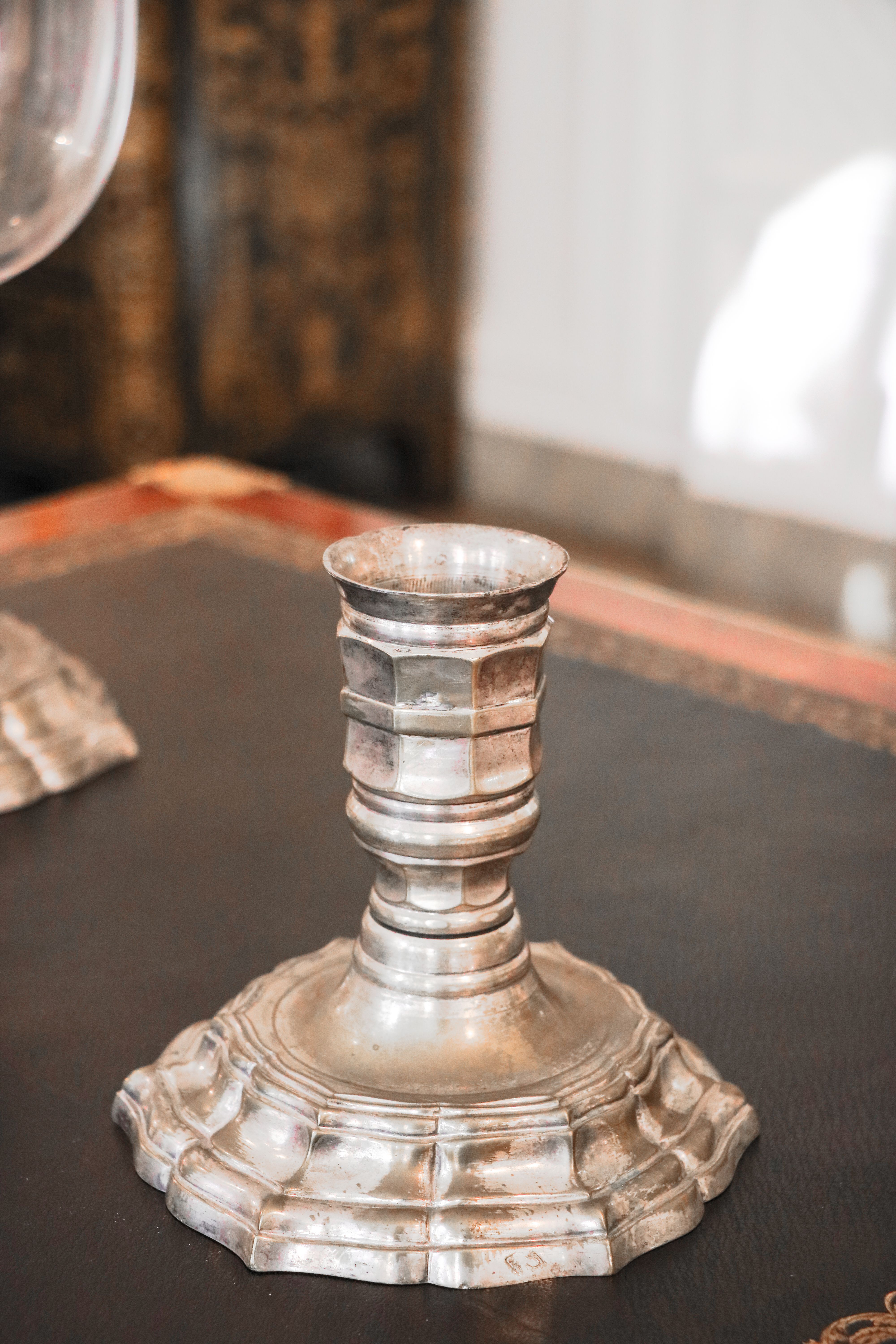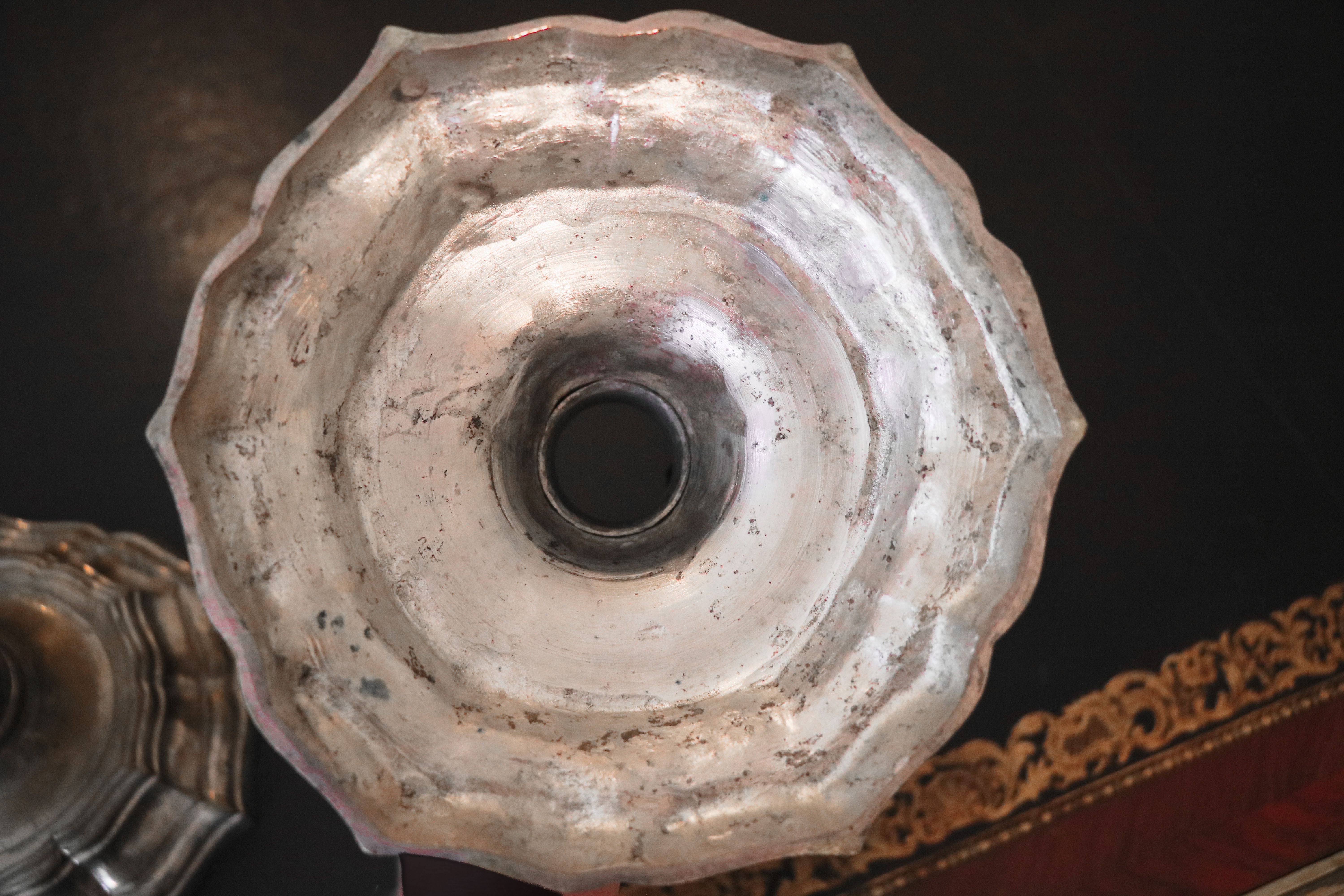 Paire de photophores en bronze doré. Poinçon orné d’une fleur de lys inscrit dans un losange Epoque du début du XVIIIe siècle Restaurations d’usage, verres postérieurs, usures à la dorure H. 51,5 x D. 18 cm
