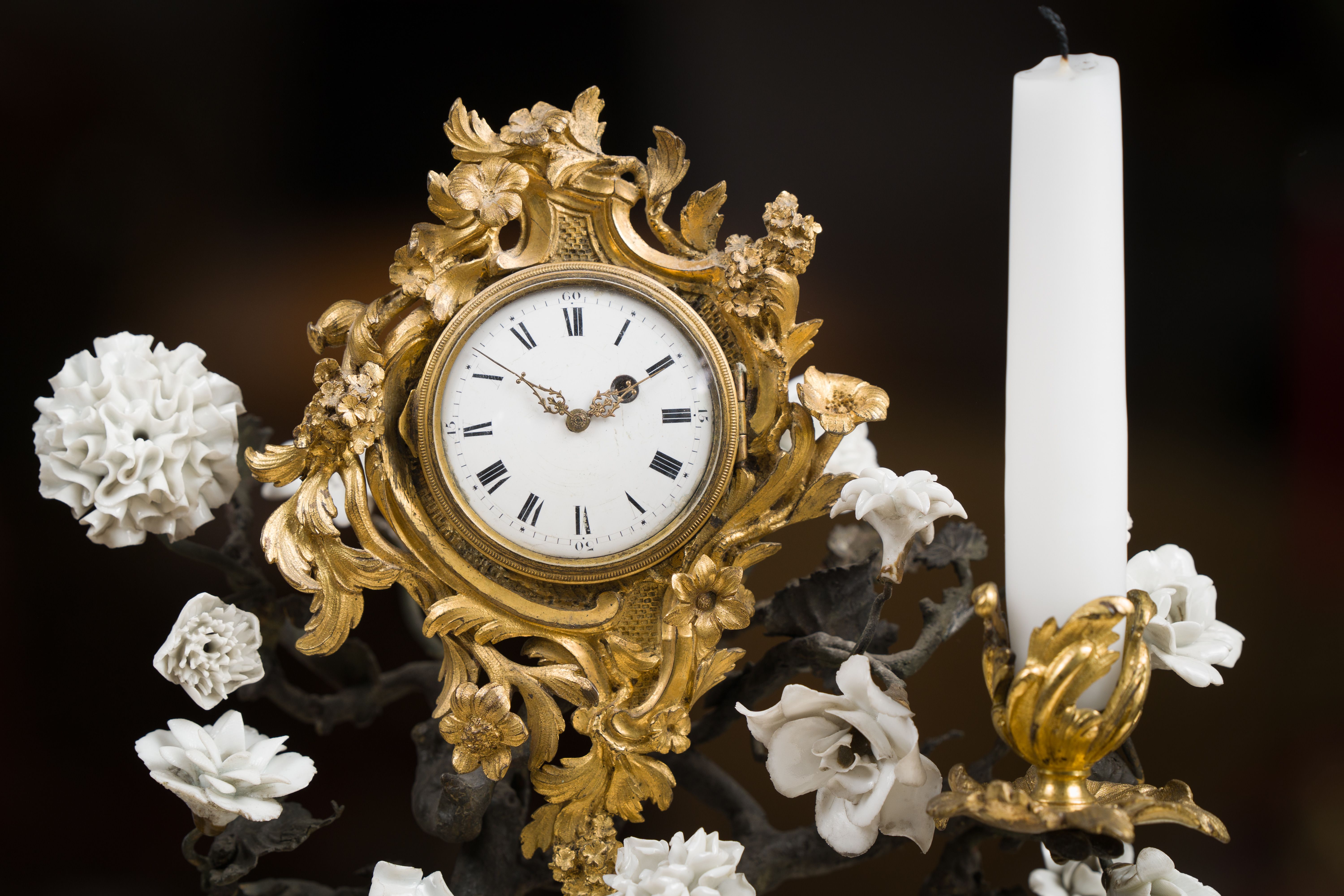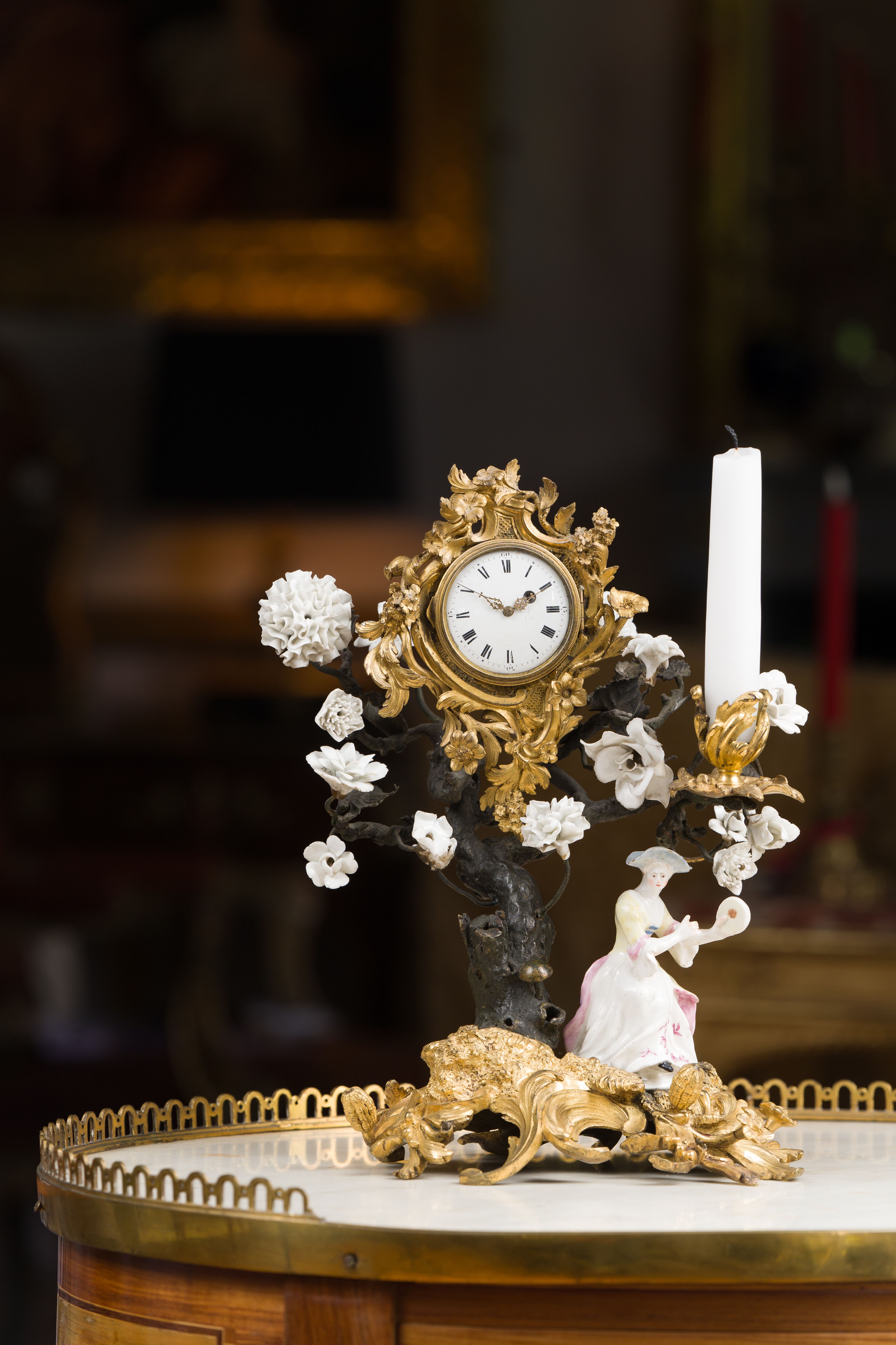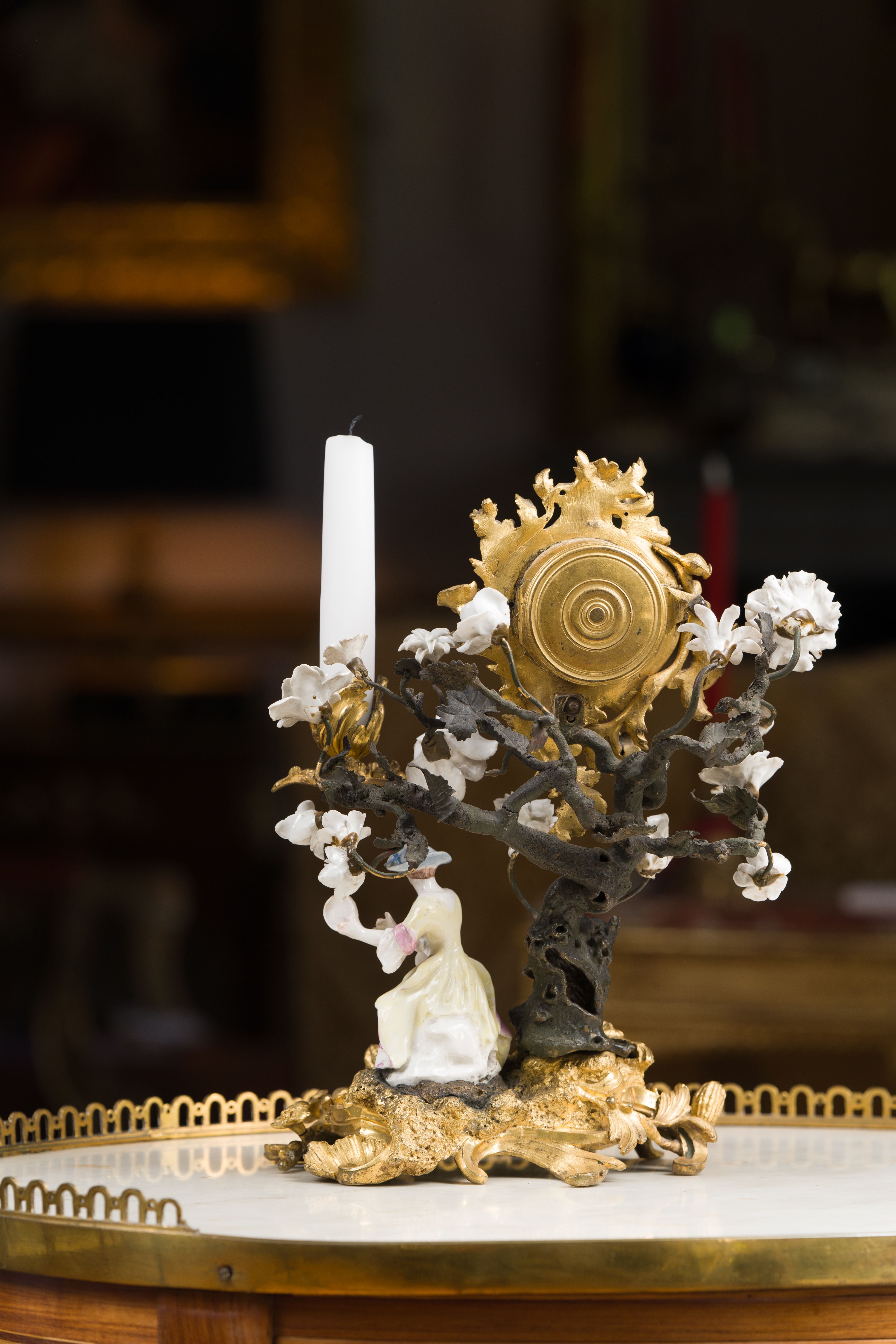 La pendule de notre étude est d’une délicatesse rare. Il suffit d’observer en premier lieu la composition générale pour comprendre que nous avons à faire à une pendule d’une qualité remarquable. Il s’agit de l’imitation astucieuse d’un arbre tenant un cartel miniature entre ses branches. Tout est fait pour amuser le regard : le sol reprend la texture de la terre, nous remarquons le petit champignon qui pousse au pied de l’arbre, les fleurs en bronze doré sur le cartel sont autant de détails que d’éléments décoratifs plaisants. Ce mélange de matériaux si cher aux marchands merciers en fait un véritable bijoux. Le personnage en Meissen donne de la vie à cette scène que nous pouvons qualifier de sculpture. Nous pouvons avoir l’impression que les fleurs en porcelaine blanche viennent d’éclore au bout des branches. La fragilité de la porcelaine s’oppose à la force et la solidité du bronze présent dans la structure. Les couleurs également forment un contraste important entre le bronze doré et patiné qui sont rarement utilisées dans de telles pendules. En plus de cet esthétisme travaillé, la pendule présente deux originalités certaines : le bras de lumières et sa taille. Les pendules mélangeant le bronze doré et la porcelaine munie de personnages sont toujours très appréciés. Cependant, la taille très réduite de cette pendule en fait un élément important dans sa description. Pierre Kjellberg, dans son livre « Encyclopédie de la pendule française » (aux Editions de l’Amateur ), évoque en effet la rareté des pendules de ce type n’excédant pas les 30 cm. Elles sont donc dotées d’un mouvement de montre d’où l’appellation « porte-montre ». Le bras de lumière est également un élément intéressant à relever. Cet objet complet possède quelques « soeurs » avec lesquelles nous pouvons effectuer une comparaison. Ainsi, une pendule munis de deux bras de lumières est reproduite page 148 du livre de Pierre Kjellberg. Une autre présentant aussi un petit personnage en Meissen et des fleurs en porcelaine est reproduite dans le livre « La pendule française » (1ere partie, aux Editions Tardy, page 176). Enfin, la maison de vente Christie’s a présenté une pendule cette fois-ci avec quatre bras de lumières, un personnage et des fleurs le 27 novembre 2018 sous le numéro 504. De cette manière, cette pendule est particulièrement représentatif à la fois du goût Rocaille, et de l’importance des marchands merciers dans la production des objets d’art. Décorateurs avant l’heure, ils suscitaient des créations originales qui avaient souvent pour caractéristique d’allier des matériaux luxueux : le laque, le bronze, ou la porcelaine pour laquelle les élites sont prises d’un véritable engouement, à l’instar de Madame de Pompadour qui en collectionna une quantité importante. Il faut en effet se rappeler que la production de porcelaine européenne est une révolution artistique survenue au tournant des années 1710, et qui restera très recherchée par tous les amateurs d’art jusqu’à la veille de la Révolution. Les pendules telles que la nôtre sont souvent rapprochées du commerce du marchand-mercier Lazare-Duvaux, qui s’était fait une spécialité de ce type d’objets. Il affectionnait la porcelaine, qu’il posait sur beaucoup de meubles et objets.