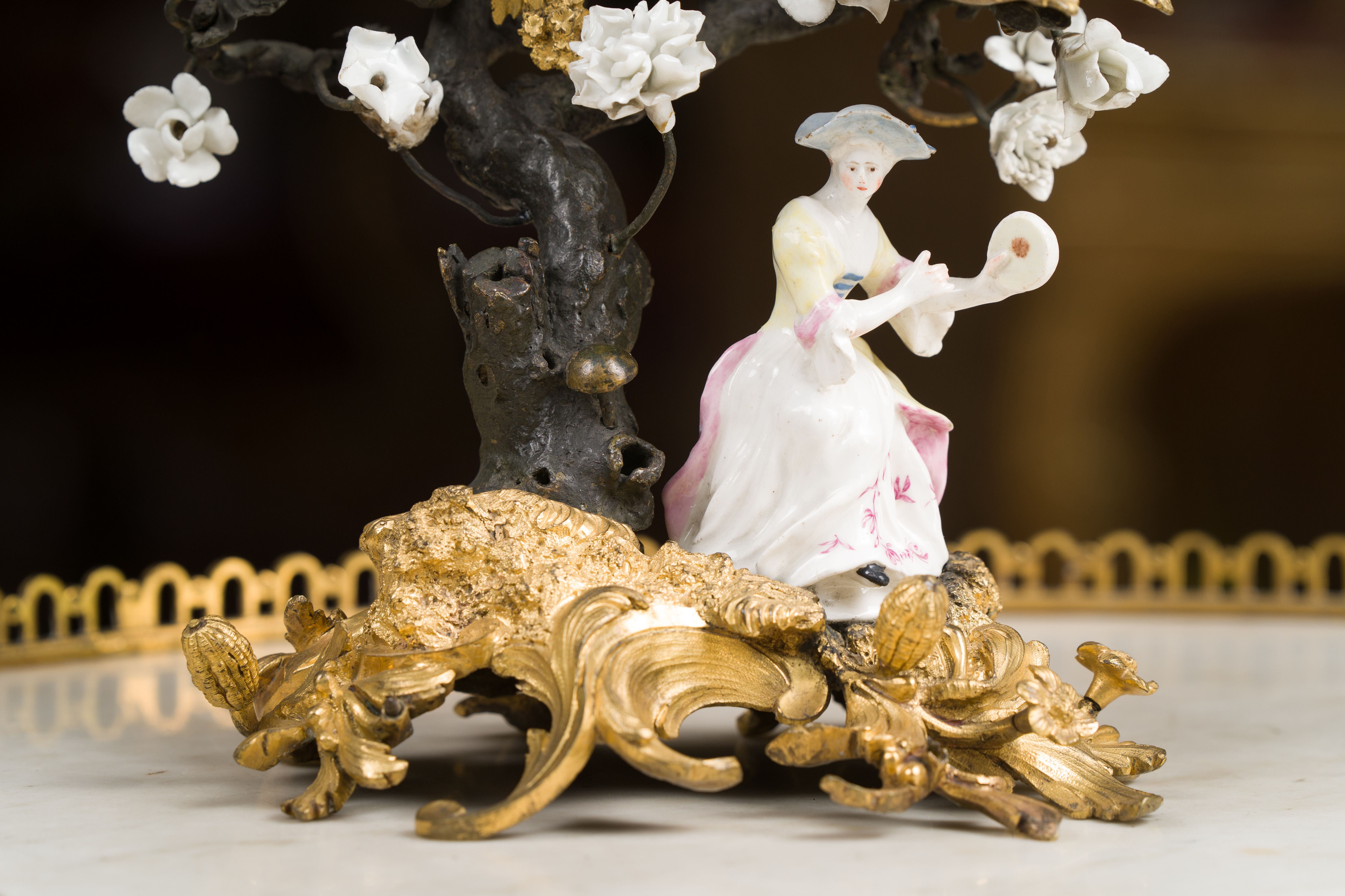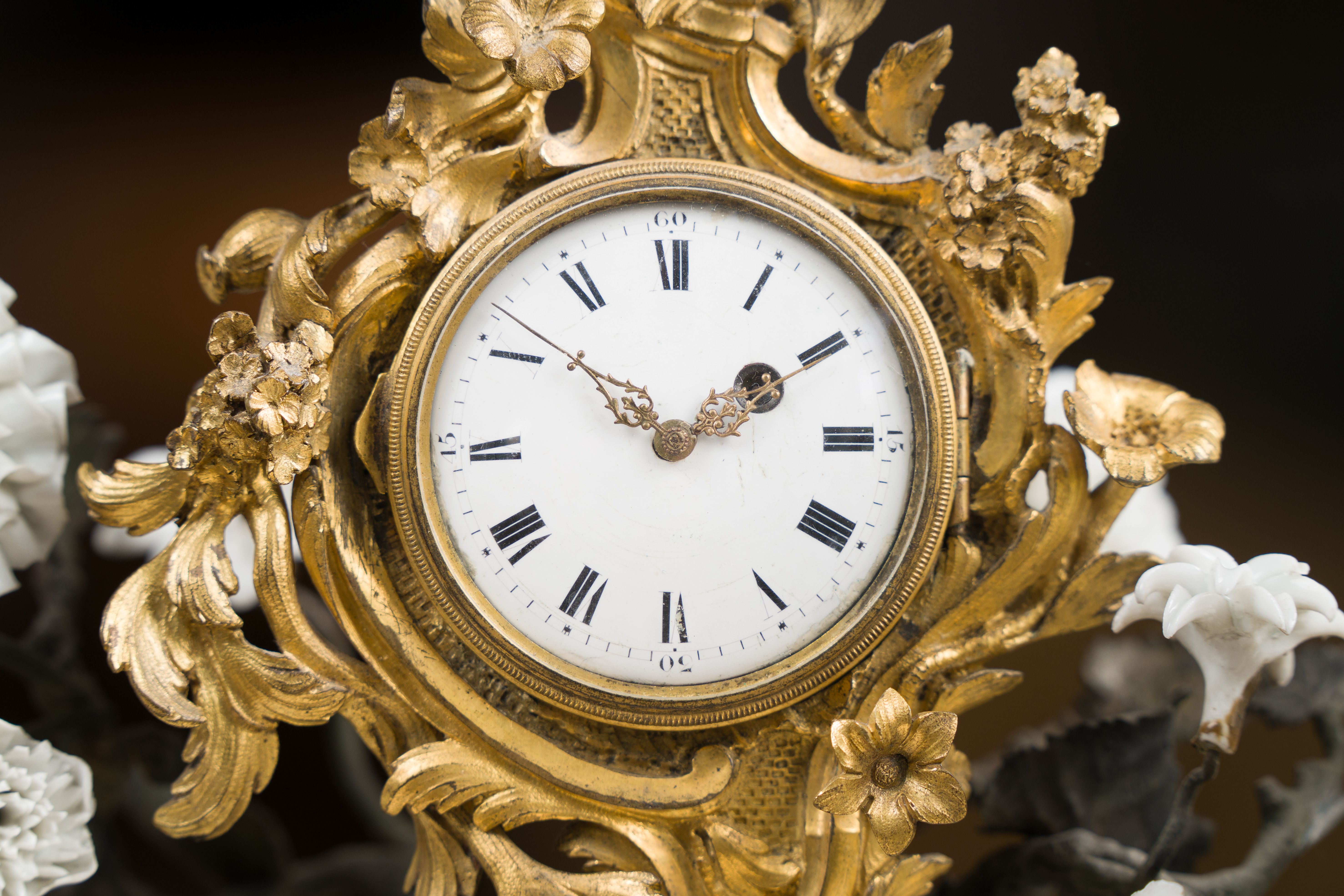 Rare petite pendule dite porte-montre formant bougeoir en bronze doré et patiné. La pendule est composée d’un arbre stylisé en bronze patiné soutenant un cartel miniature finement ciselé orné de fleurs et un bras de lumière en bronze doré, ainsi que des fleurs blanches en porcelaine de Meissen ou de Vincennes/Sèvres. La pendule repose sur une terrasse imitant le sol en bronze doré également richement décorée de fleurs et de motifs Rocaille. Elle reçoit un petit personnage féminin tenant un tambourin, probablement en porcelaine de Meissen. Epoque Louis XV Le mouvement d’époque louis XIV est signé au dos « Befson à St … » Restaurations d’usage, cadran postérieur à remplacer H. 30 x L. 25 x P. 18 cm