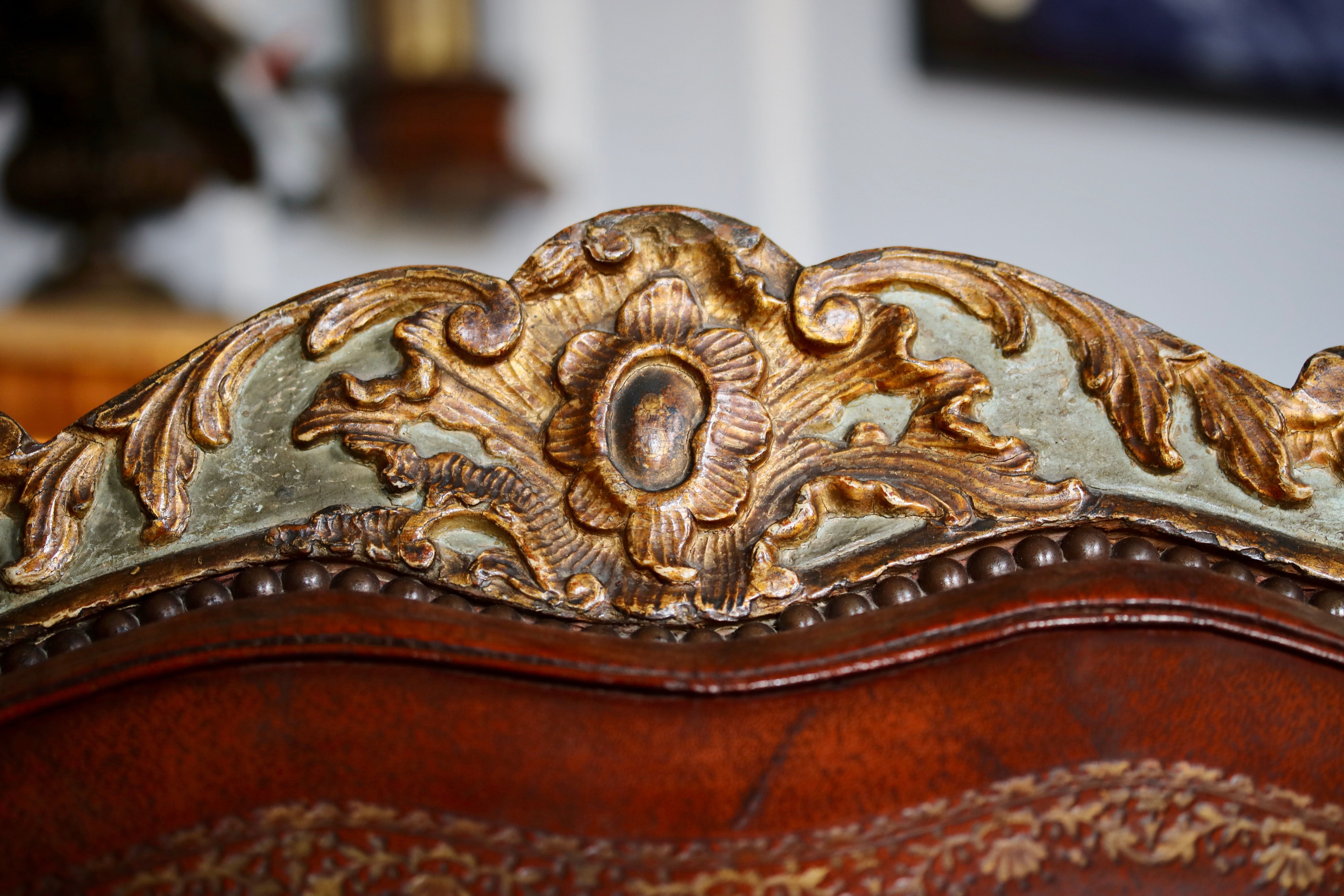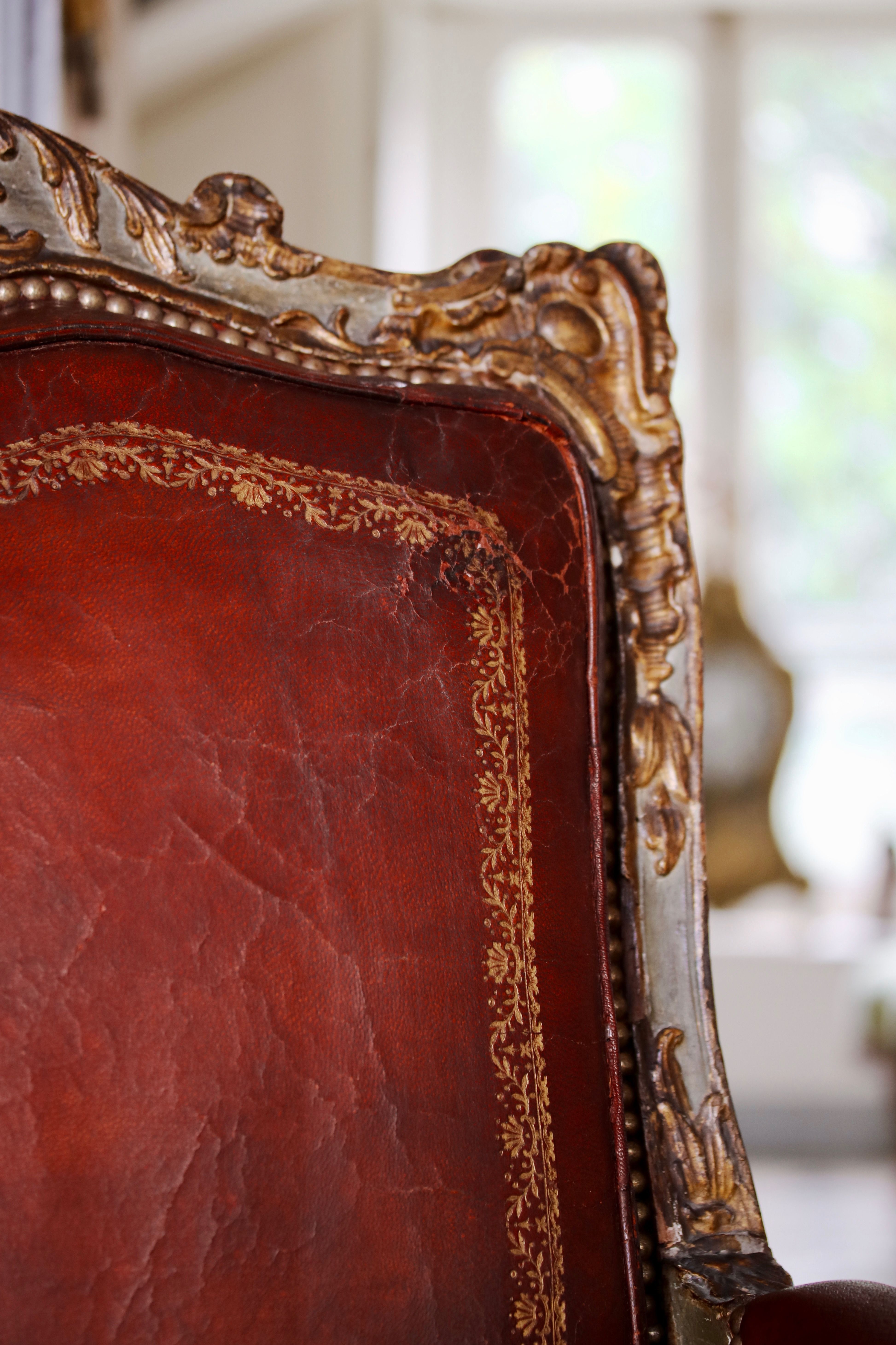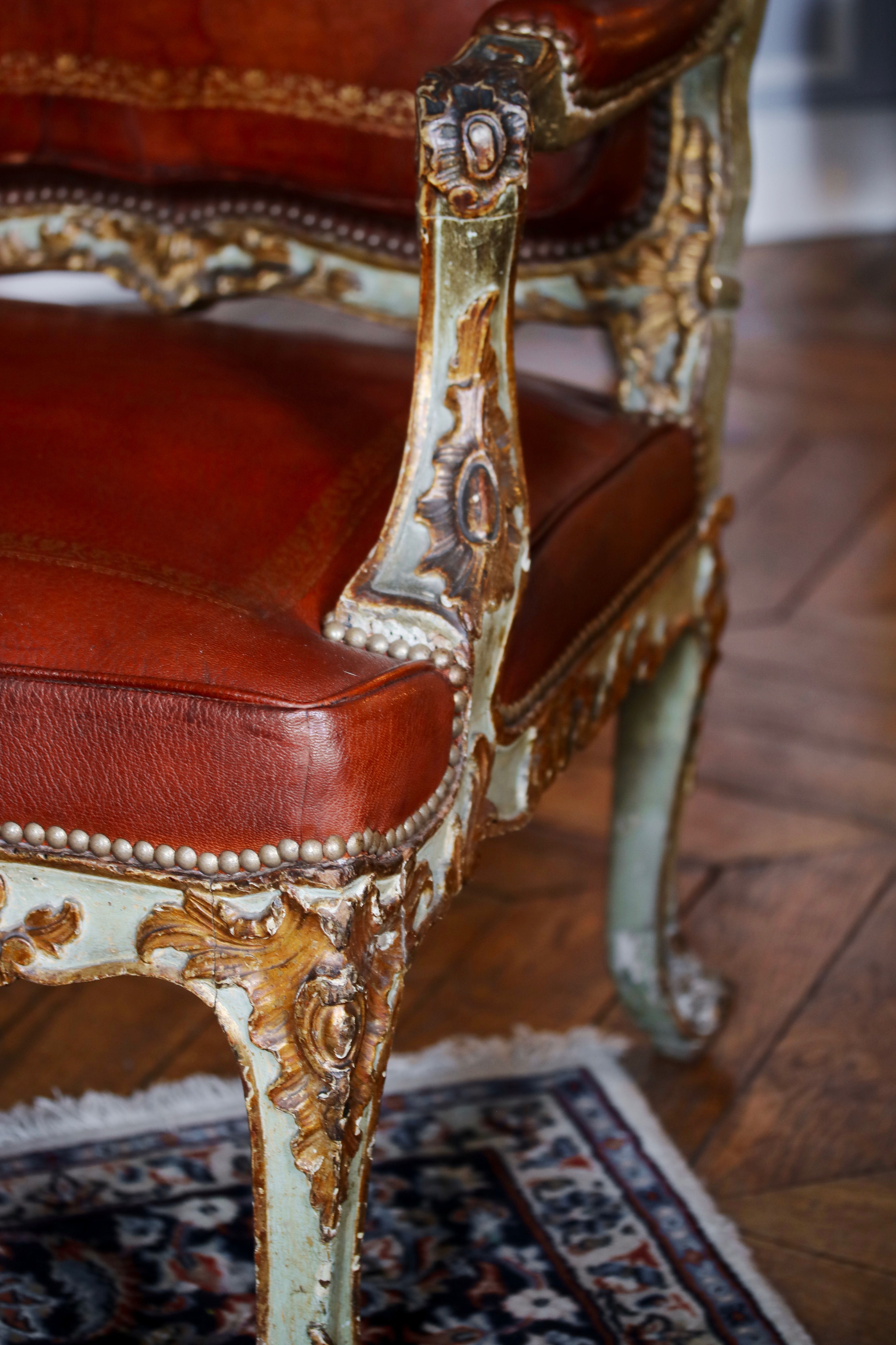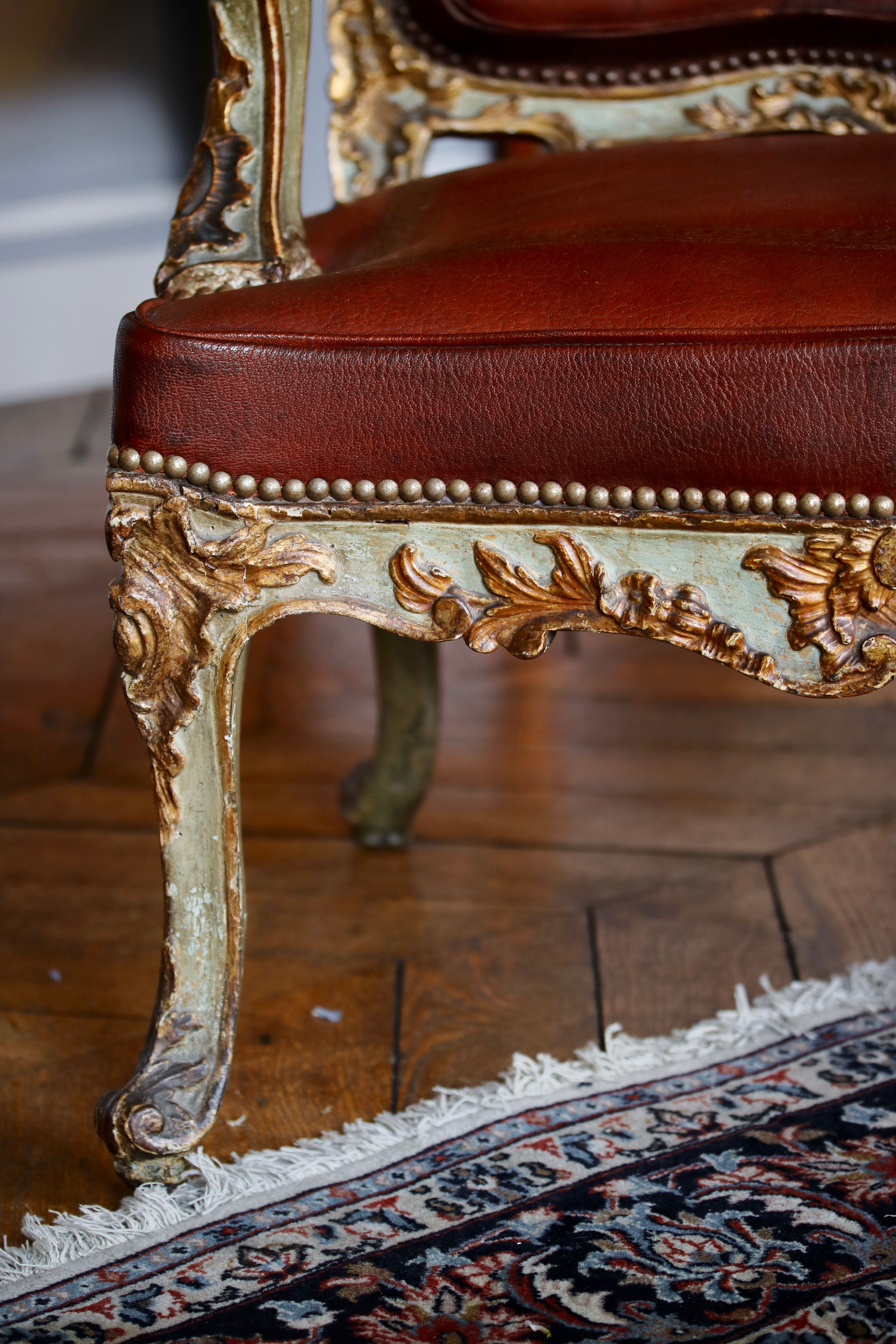 Impressionnante paire de fauteuils à la reine laqués et dorés richement sculptés. Le dossier mouvementé est sculpté dans sa partie haute d’un cartouche fleuri et de nombreuses feuilles d’eau. Les accotoirs et la ceinture reprennent les motifs sculptés de la parte supérieure. Les fauteuils reposent chacun sur quatre pieds cambrés également sculptés de motifs feuillagés. Travail allemand Epoque Louis XV Restaurations d’usage, cuir moderne H. 105 x L. 75 x P. 58 cm