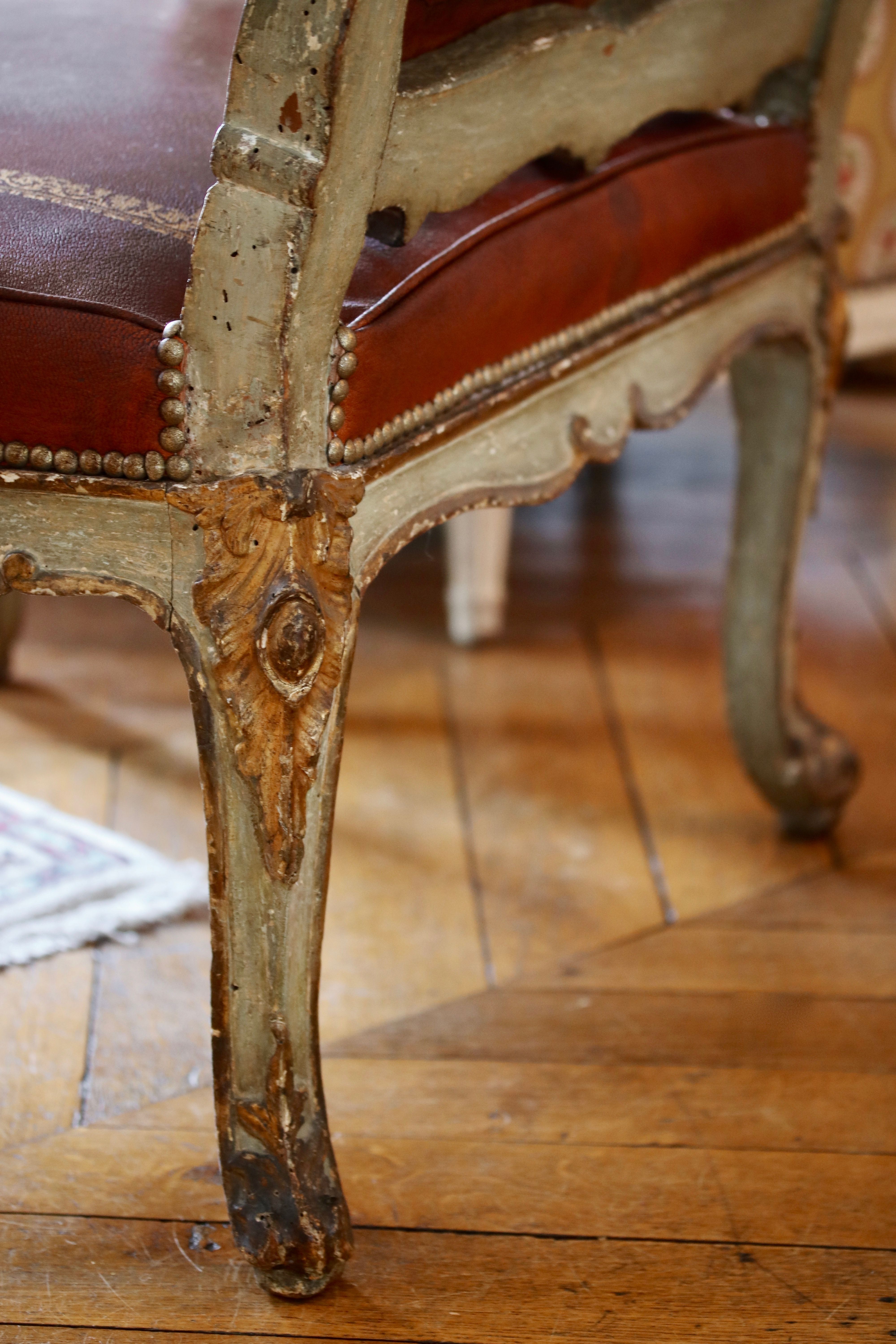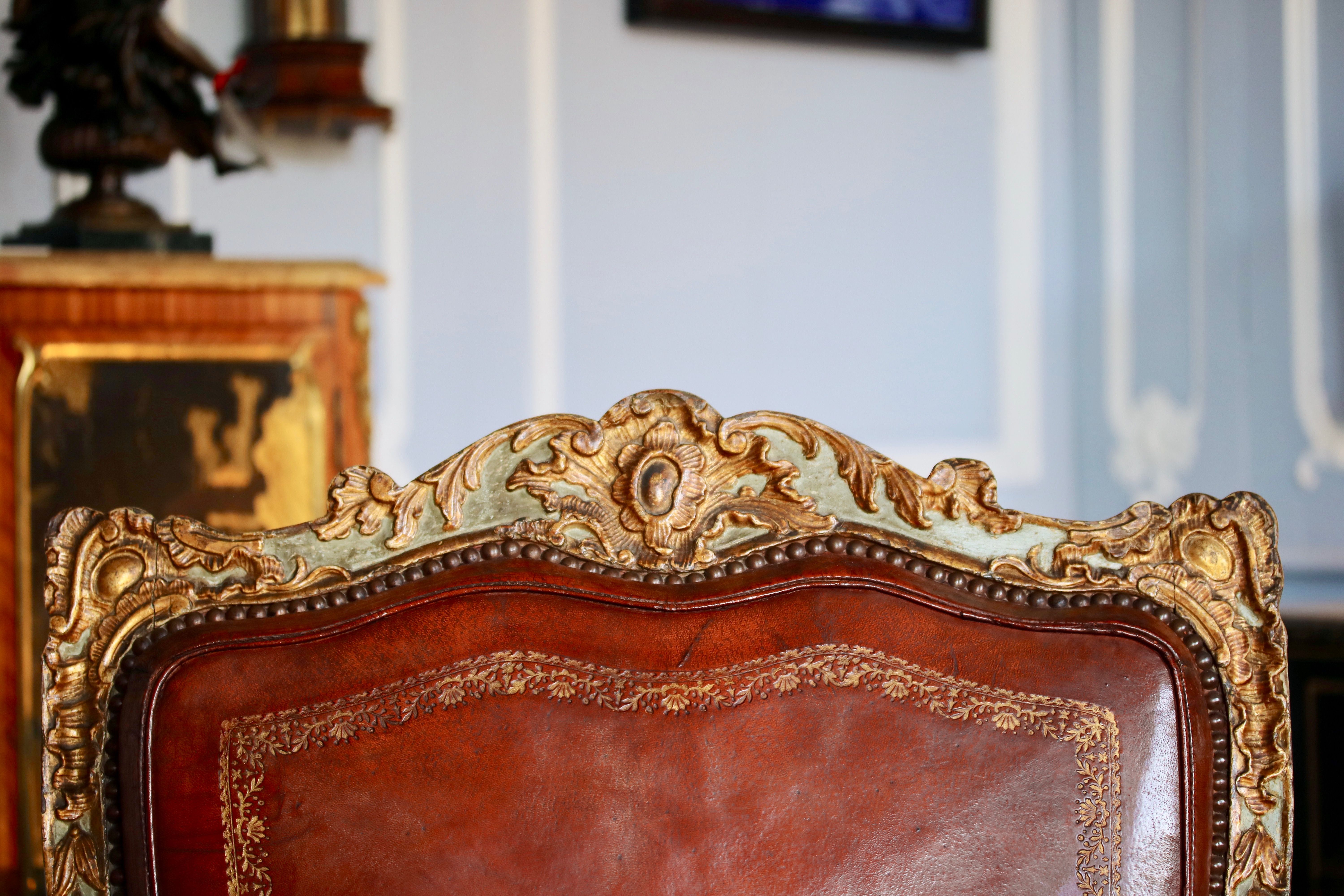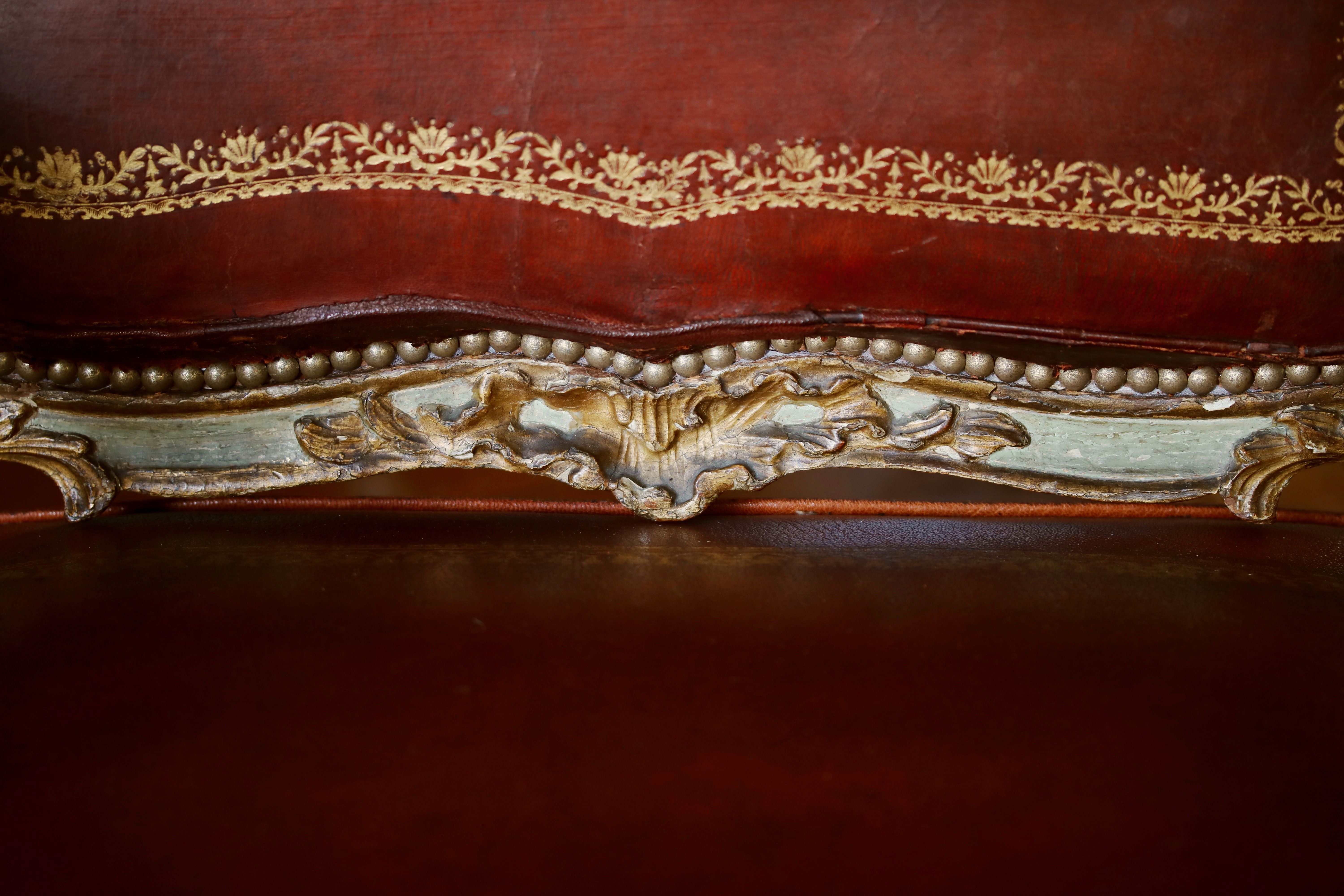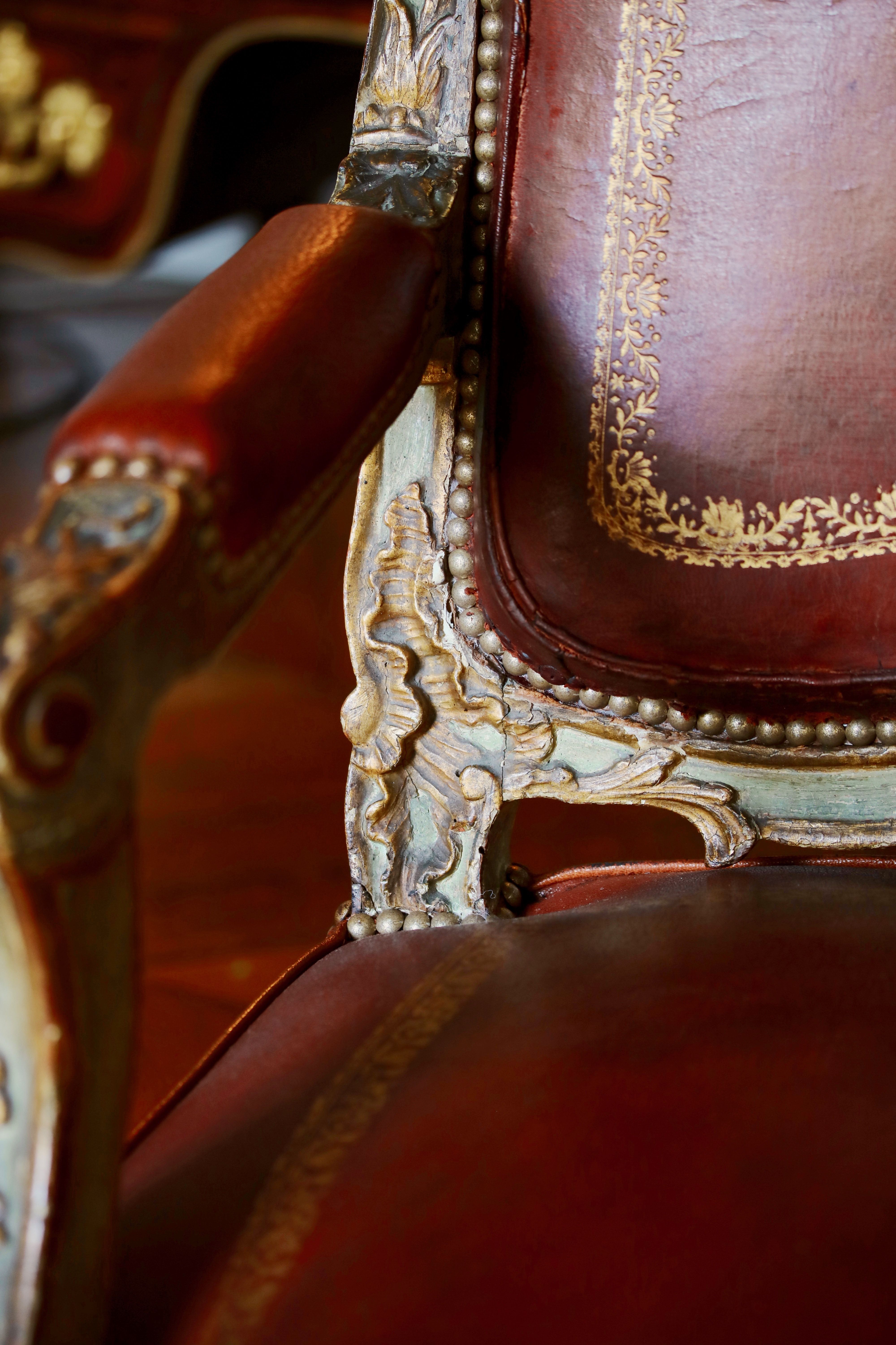Impressionnante paire de fauteuils à la reine laqués et dorés richement sculptés. Le dossier mouvementé est sculpté dans sa partie haute d’un cartouche fleuri et de nombreuses feuilles d’eau. Les accotoirs et la ceinture reprennent les motifs sculptés de la parte supérieure. Les fauteuils reposent chacun sur quatre pieds cambrés également sculptés de motifs feuillagés. Travail allemand Epoque Louis XV Restaurations d’usage, cuir moderne H. 105 x L. 75 x P. 58 cm