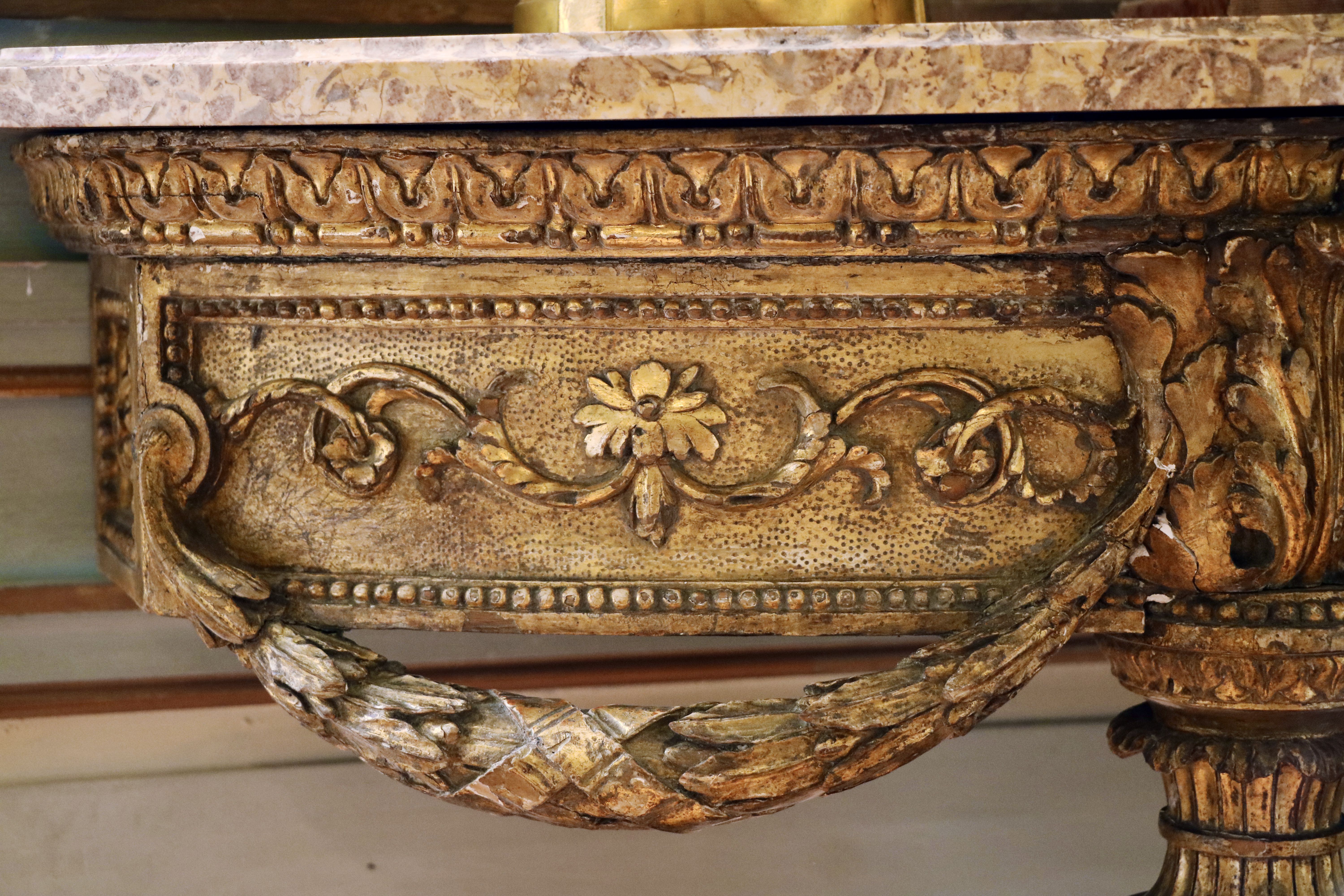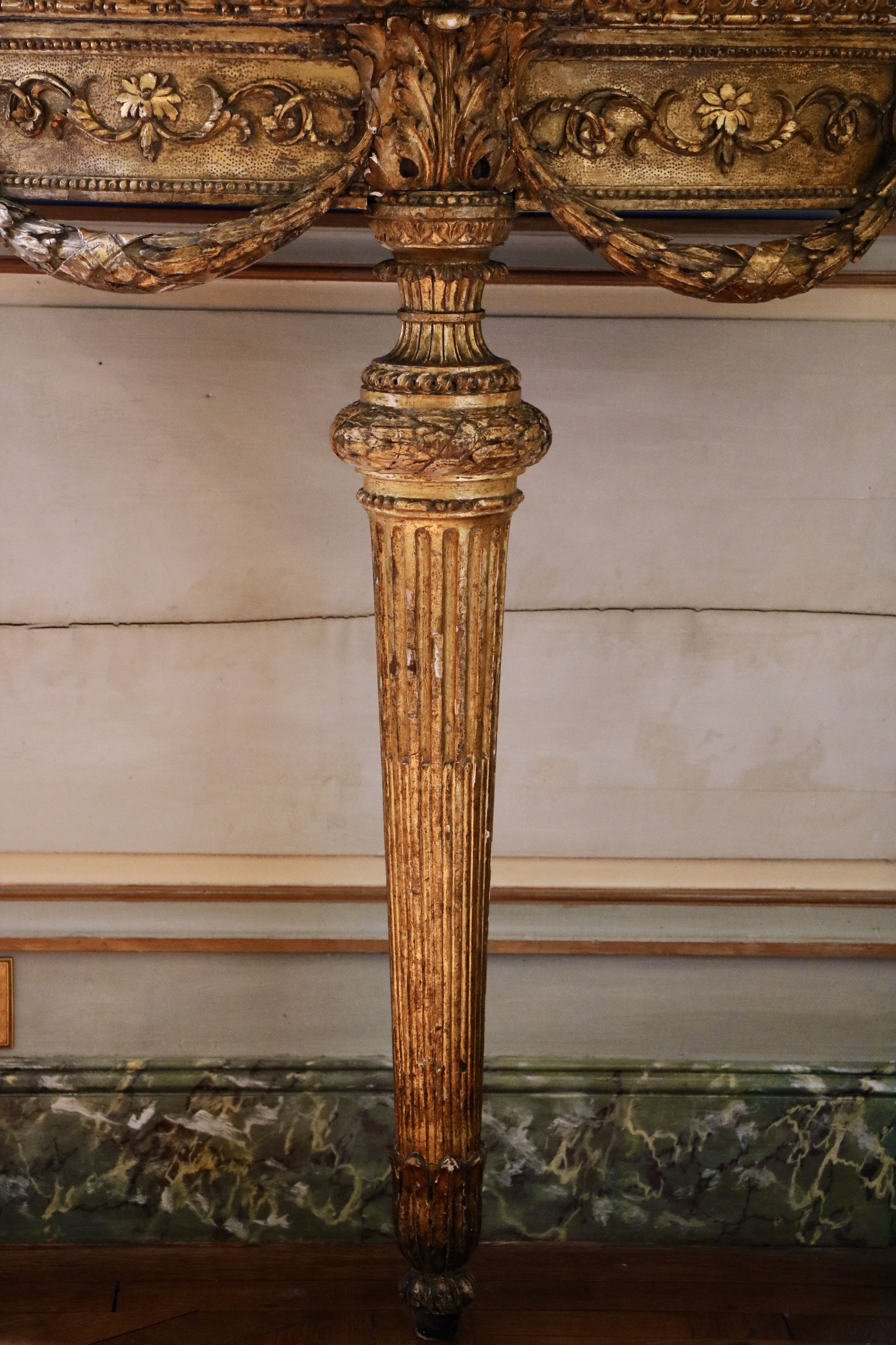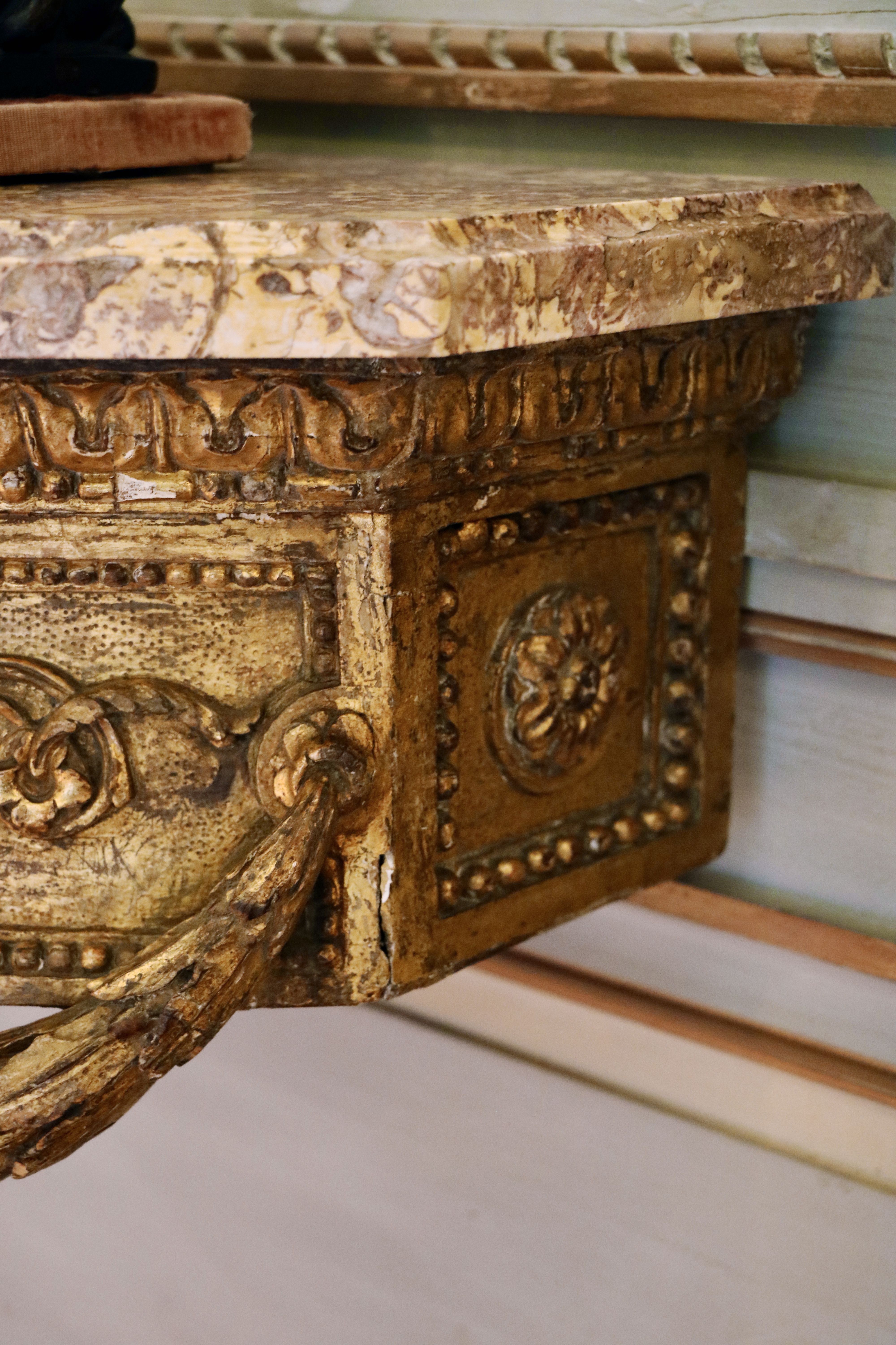Console d’applique en bois doré reposant sur un pied fuselé cannelé et rudenté. La partie haute en forme de demi-lune est richement sculptée d’entrelacs fleuris, de feuilles d’acanthe, de rangs de perles et est agrémentée de deux guirlandes de lauriers. La console est surmontée par un dessus de marbre brocatelle violette d’Espagne Epoque Louis XVI Restaurations d’usage H. 97 x L. 76 x P. 35 cm