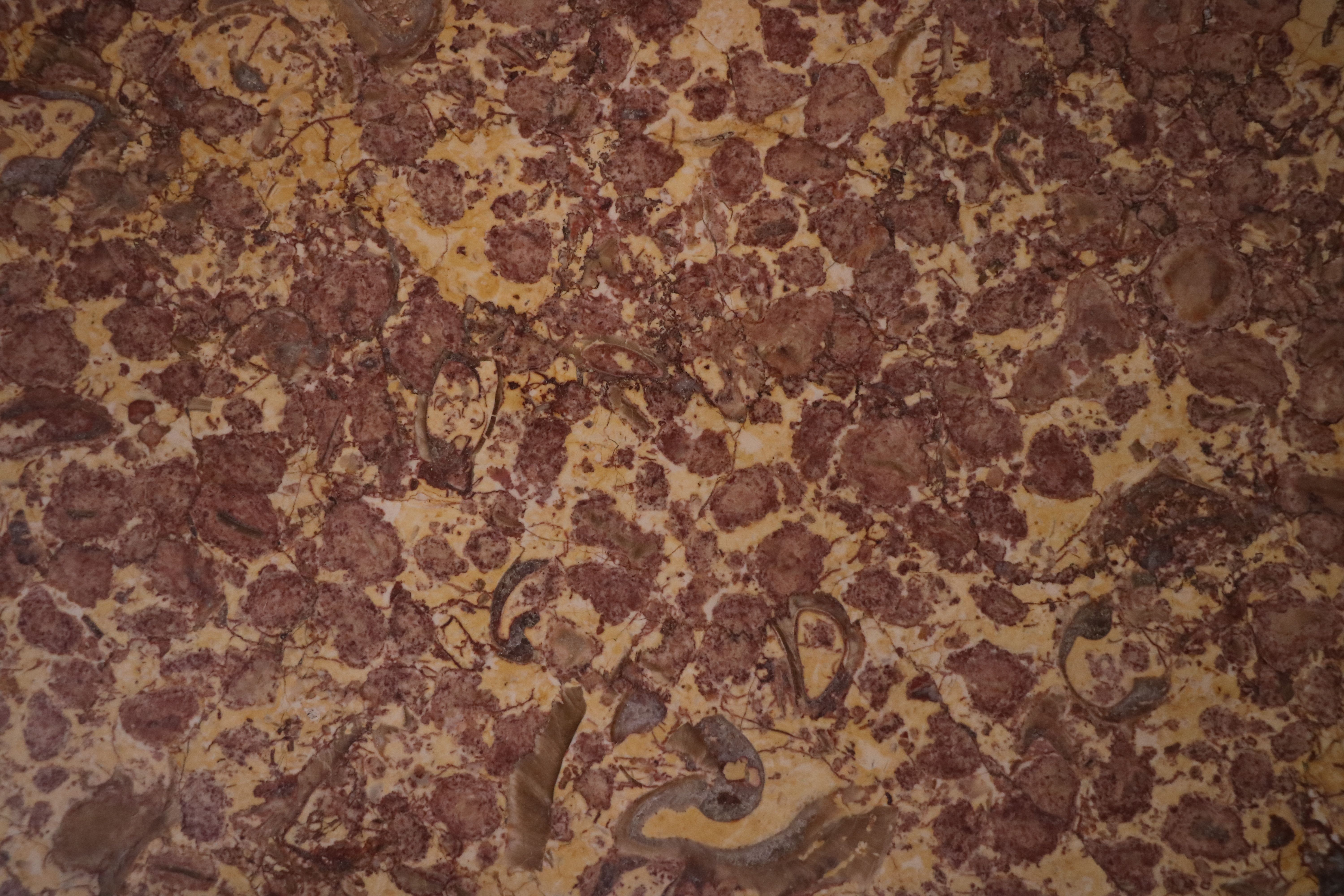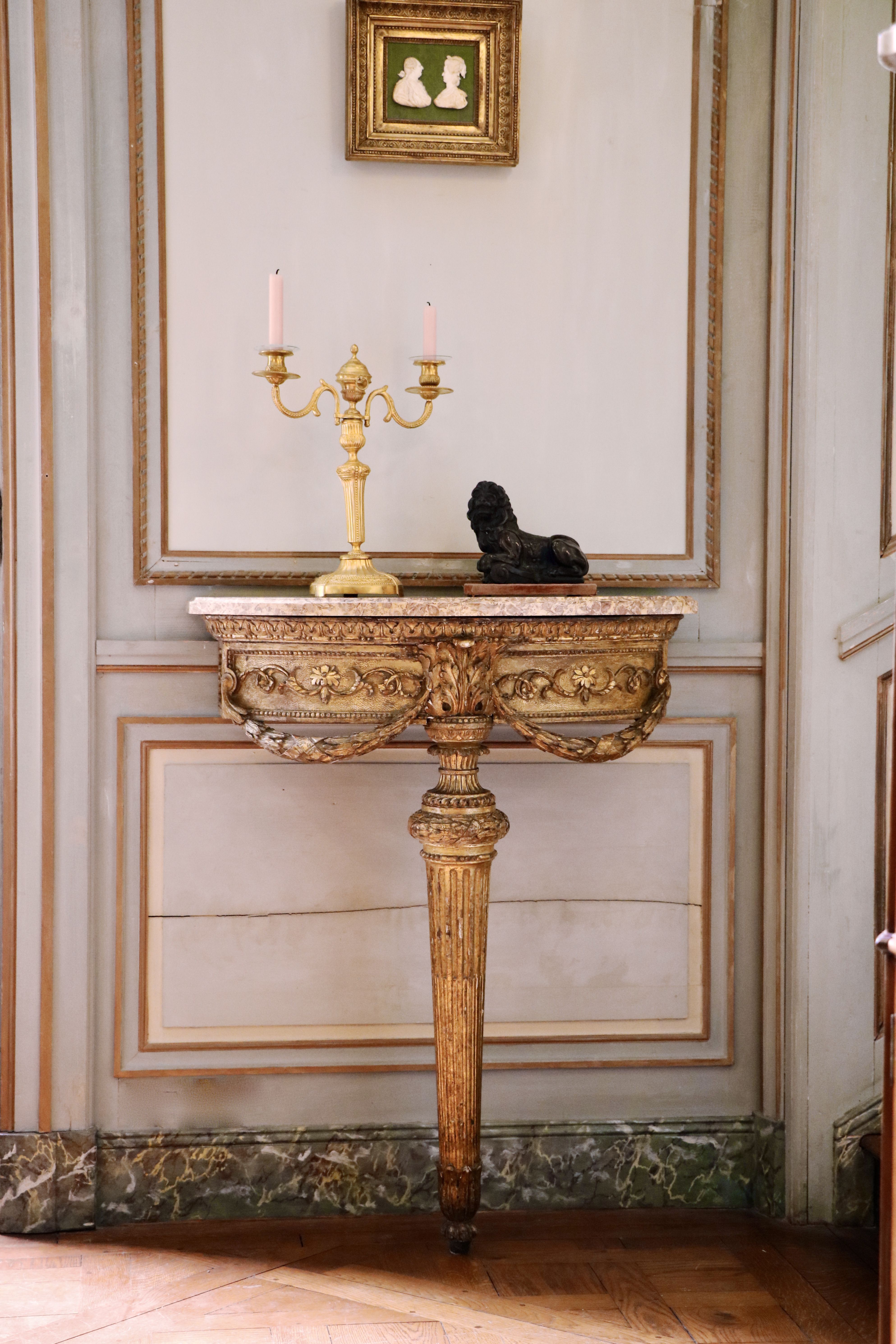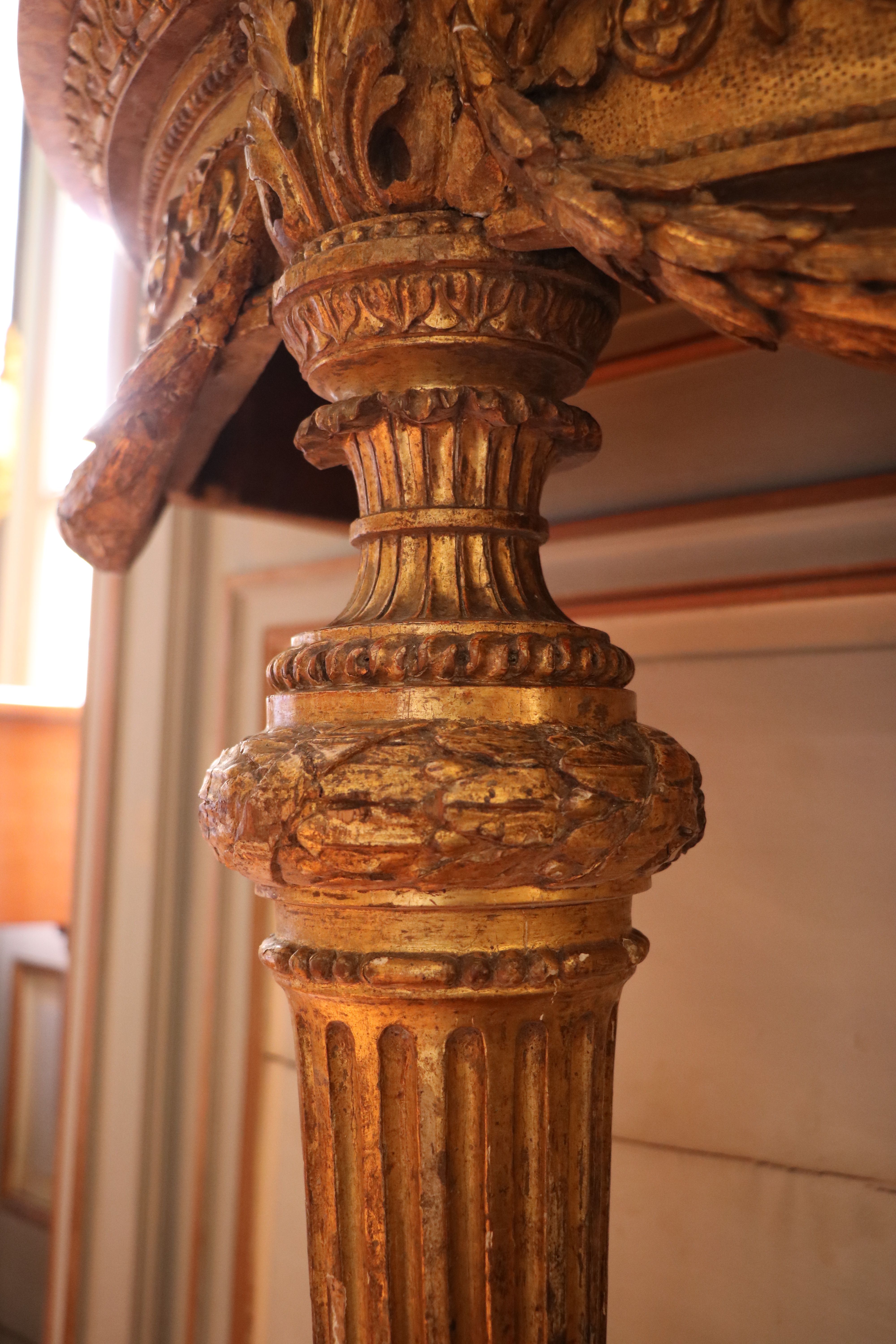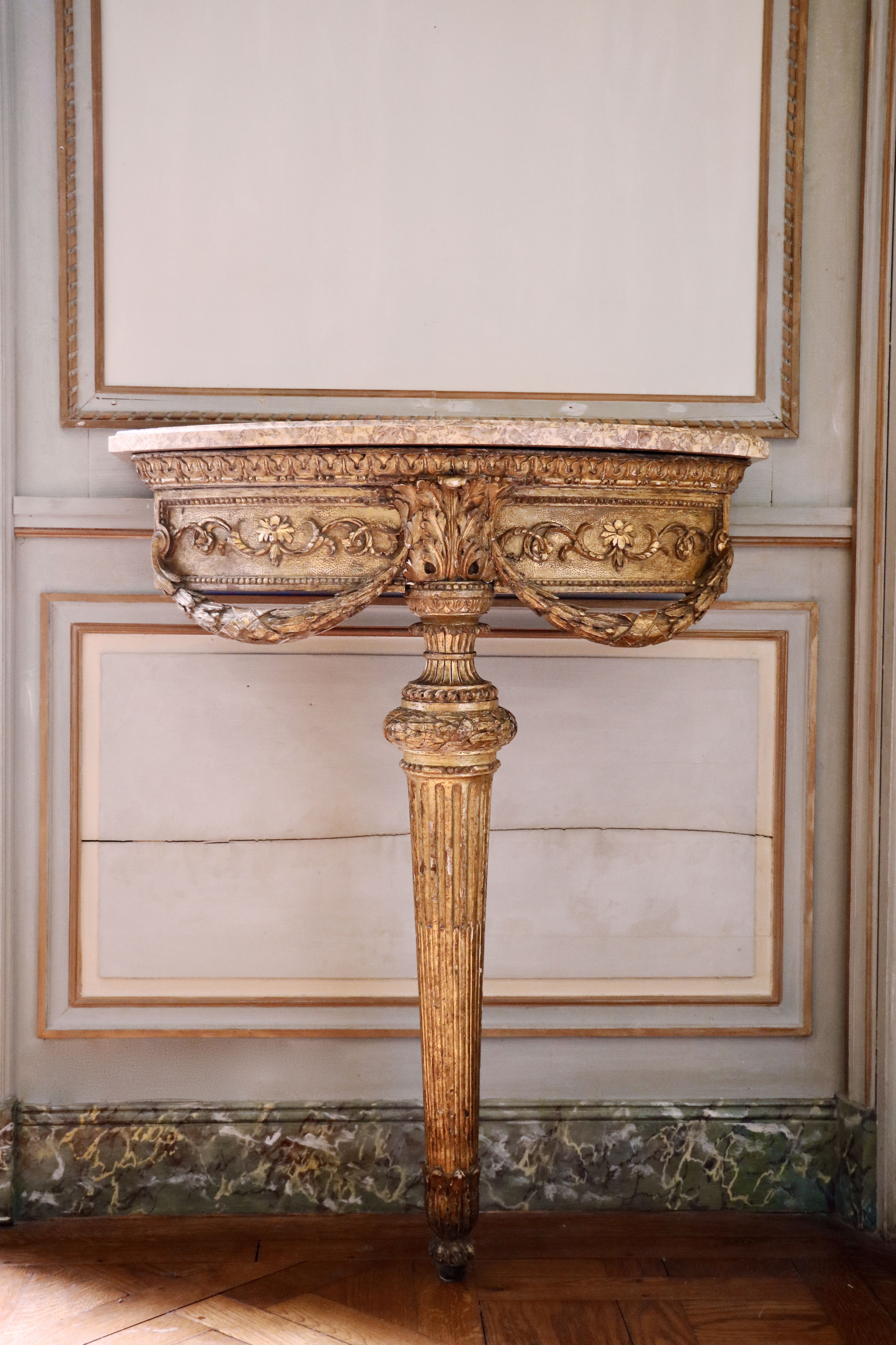 Console d’applique en bois doré reposant sur un pied fuselé cannelé et rudenté. La partie haute en forme de demi-lune est richement sculptée d’entrelacs fleuris, de feuilles d’acanthe, de rangs de perles et est agrémentée de deux guirlandes de lauriers. La console est surmontée par un dessus de marbre brocatelle violette d’Espagne Epoque Louis XVI Restaurations d’usage H. 97 x L. 76 x P. 35 cm