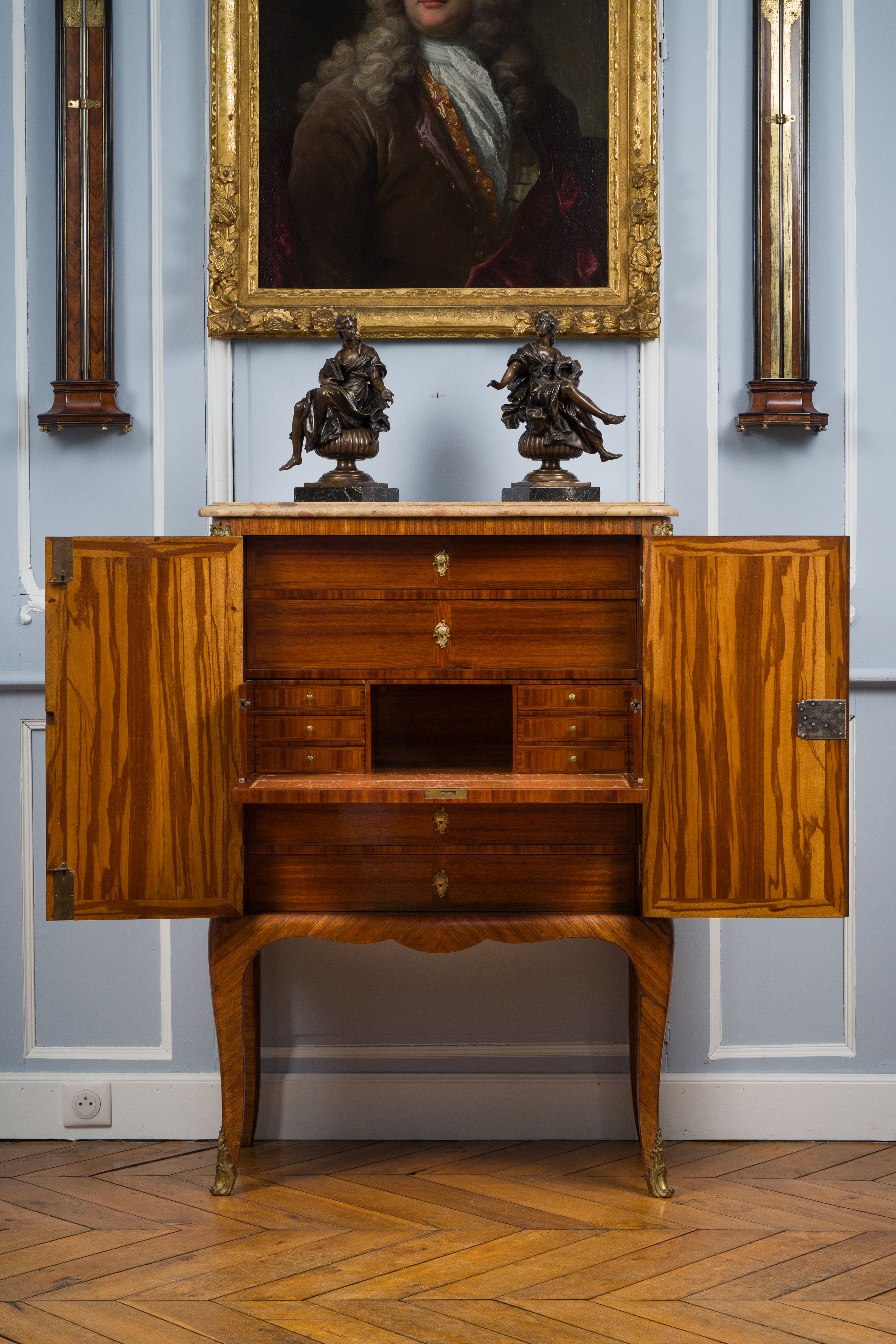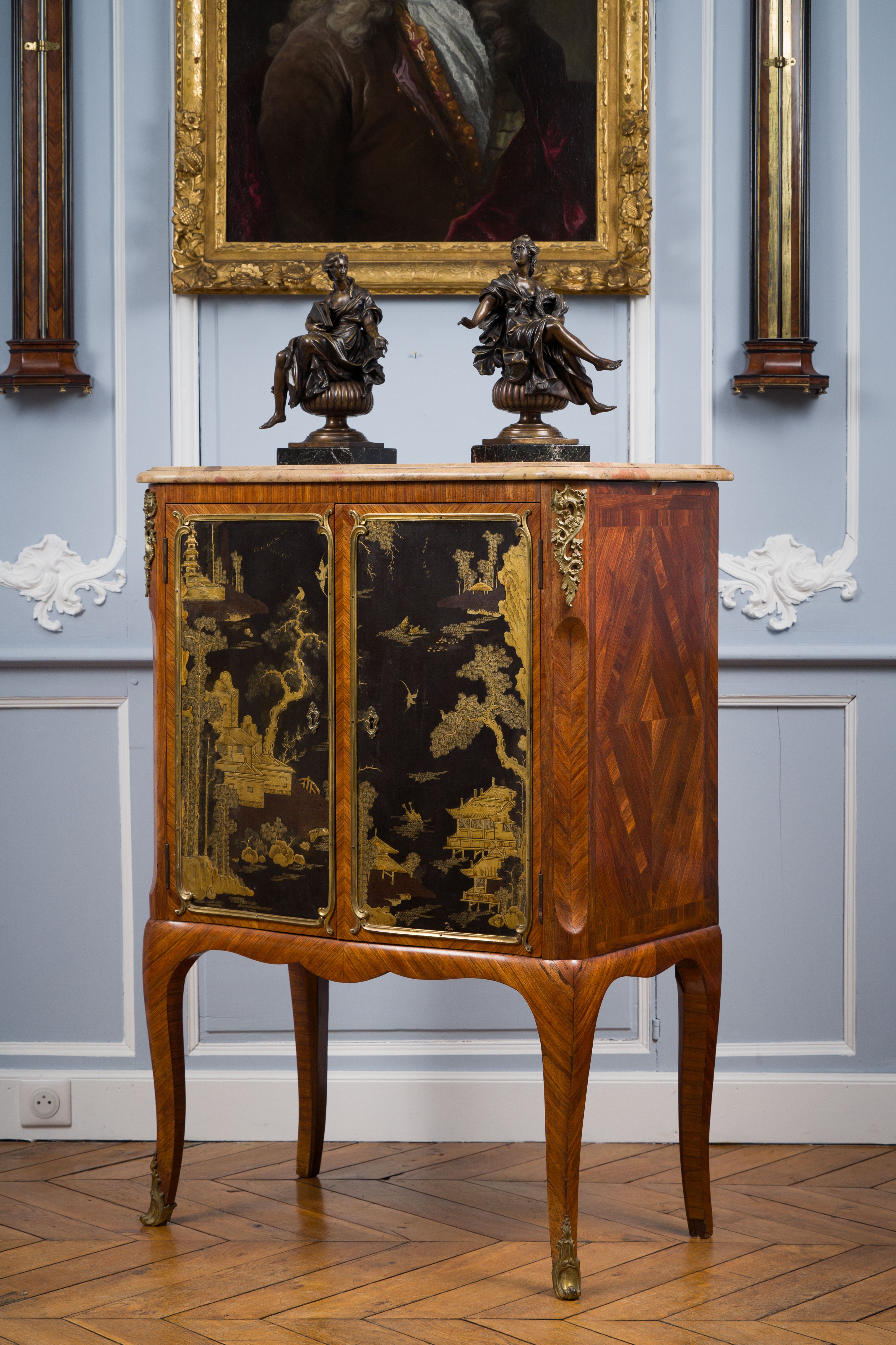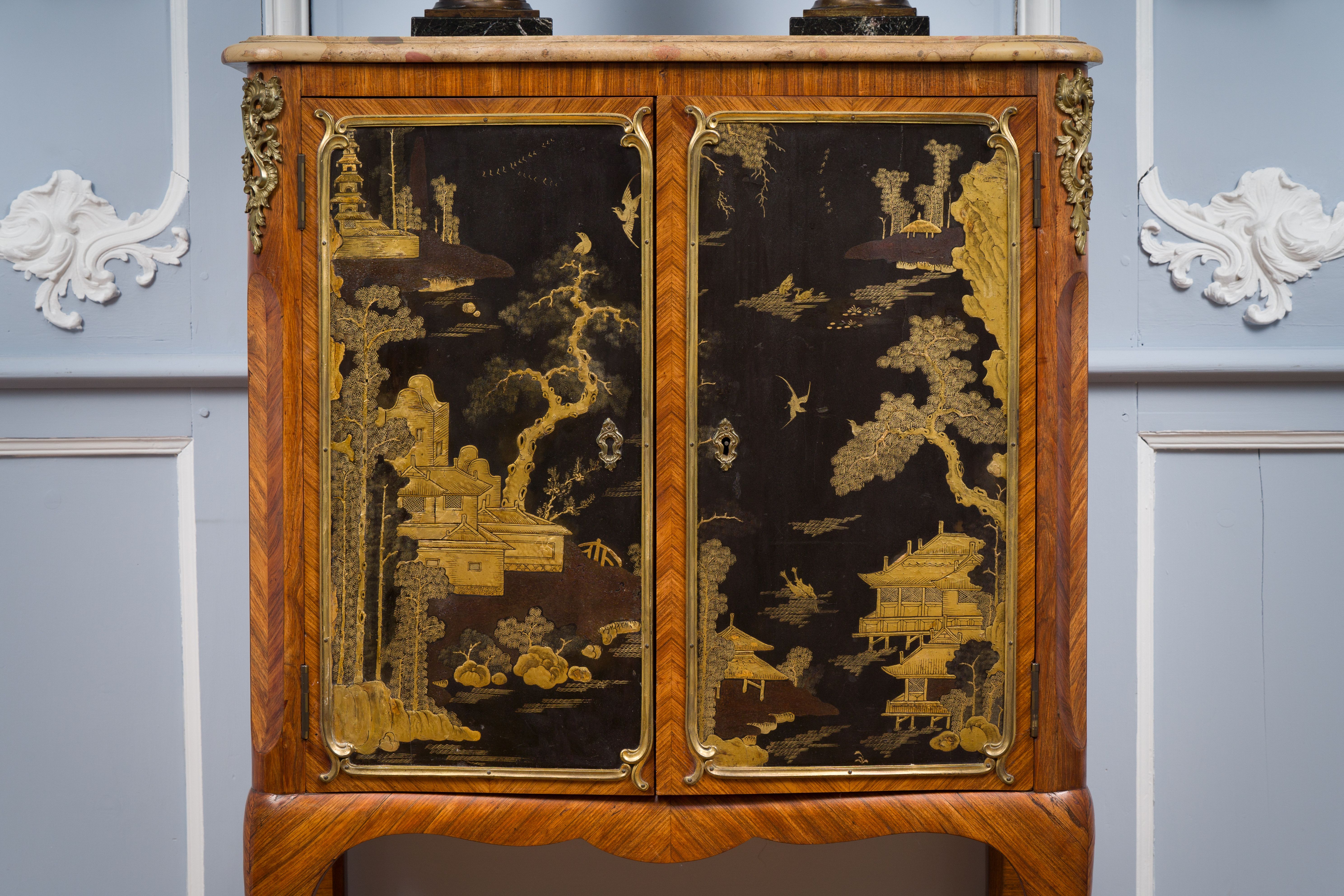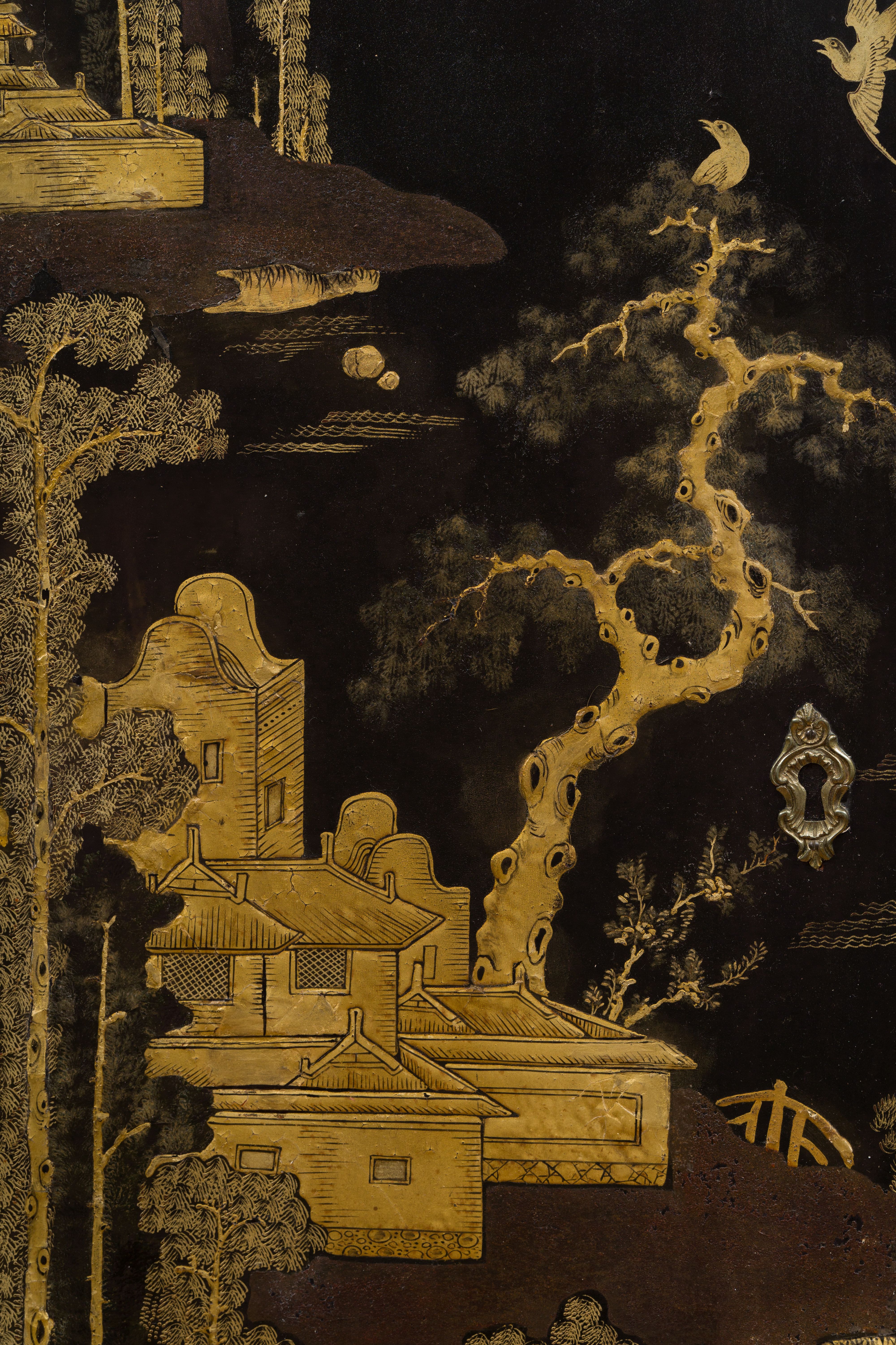 Ce ravissant petit secrétaire en cabinet porte l’estampille de Delorme. Si l’on attribue généralement les meubles Louis XV – Transition à l’ébéniste Adrien Delorme (reçu maître en 1748), sa production aussi parfois confondue avec celle de son père, François Delorme, qui exerce jusqu’en 1768. Or sont retrouvés, dans l’atelier de ce dernier après son décès, de nombreux panneaux de laque. Ce fait rare mérite d’être souligné car à l’époque, les ébénistes se fournissent le plus souvent chez un marchand-mercier pour les laques. Il semble que la famille Delorme ait eut sa propre ressource en la matière ; sont ainsi mentionnés un grand et trois petits cabinets en laque de Chine, des coffres chinois et japonais, tous ces meubles ayant vocation à être démontés puis leurs panneaux utilisés sur les créations de Delorme. Quoique la forme rare de notre secrétaire semble indiquer une commande précise pour un particulier, on avait retrouvé dans les ateliers de François Delorme, avec qui Adrien travaillait, un secrétaire « en armoire », ce qui tend à montrer que cette pratique du secrétaire à vantaux n’était pas étrangère à Adrien Delorme. Par ailleurs, le fin jeu de frisage qui parcours les cartouches de laque et qui orne les côtés évoque le talent d’Adrien Delorme, dont la dextérité s’est souvent illustrée par ce jeu de marqueterie. La renommée de cet ébéniste talentueux n’est plus à faire et il est aujourd’hui exposé dans les meilleures collections du monde : le Louvre, le Getty Museum en Californie, le Calouste Gubenlkian à Lisbonne, ou encore à Waddesdon Manor à Londres.