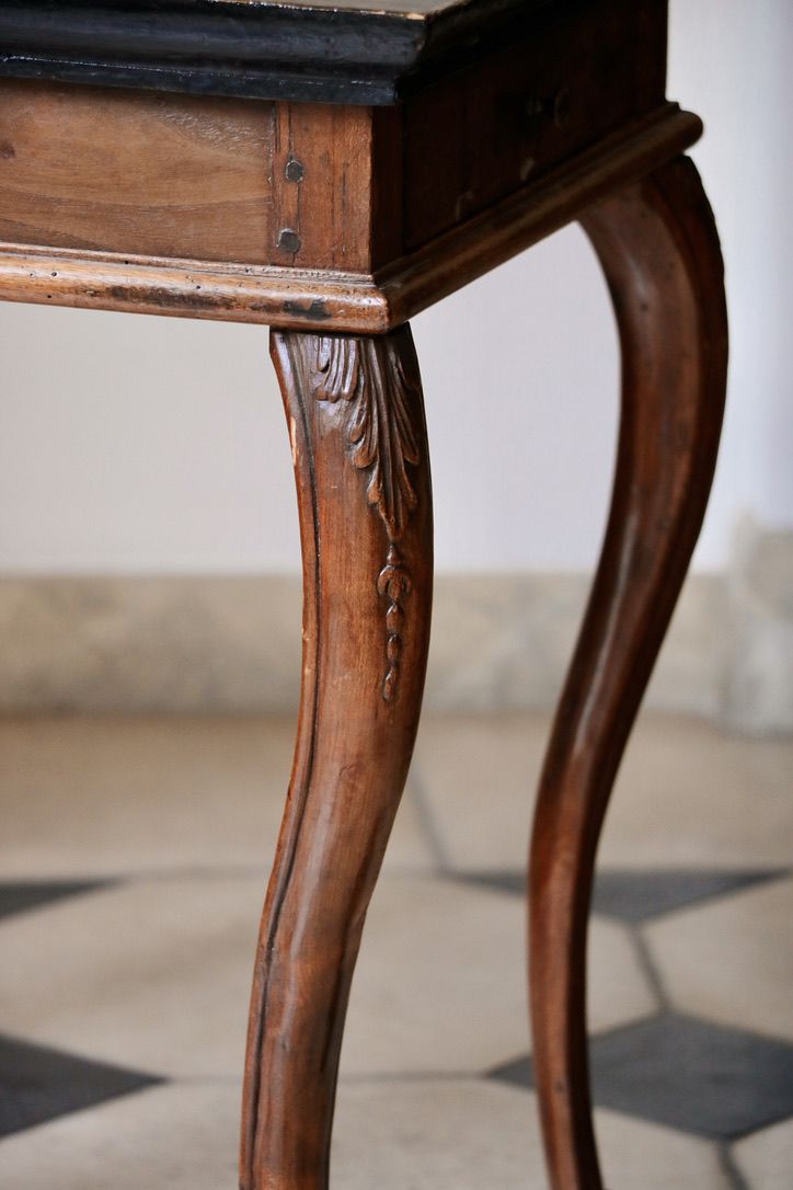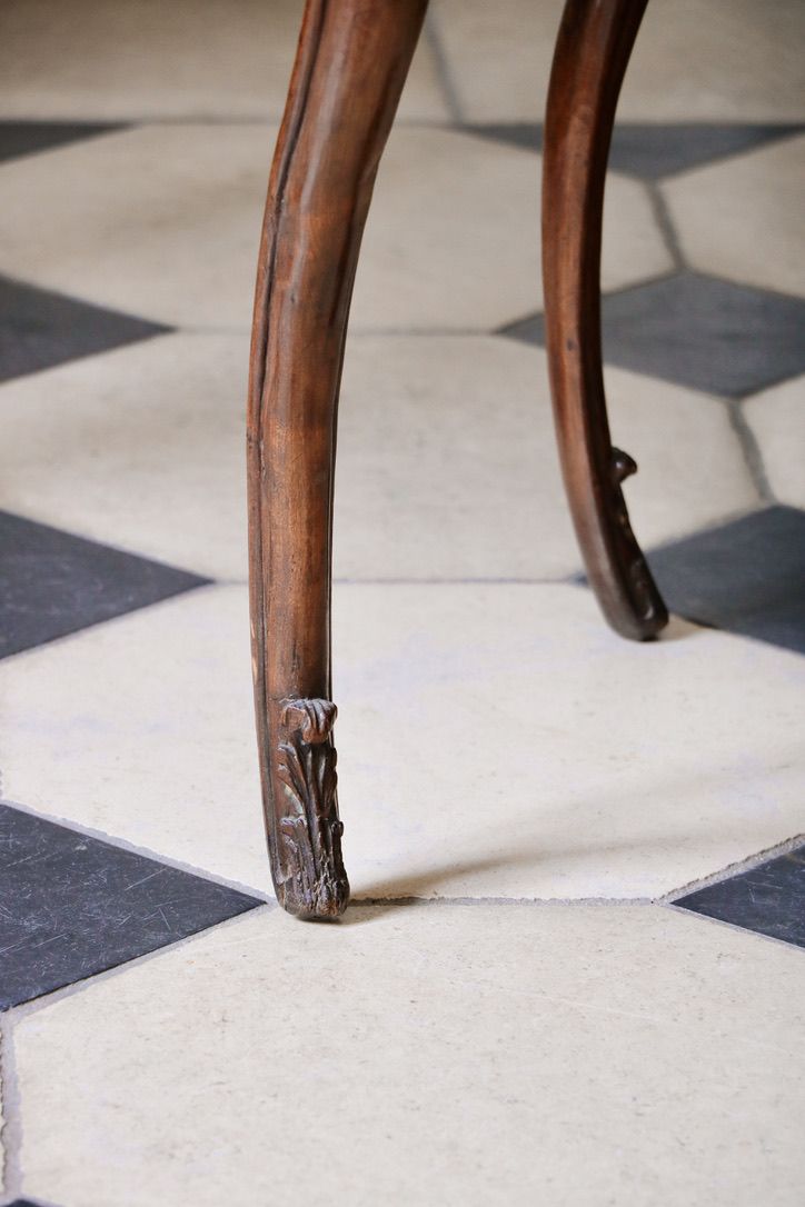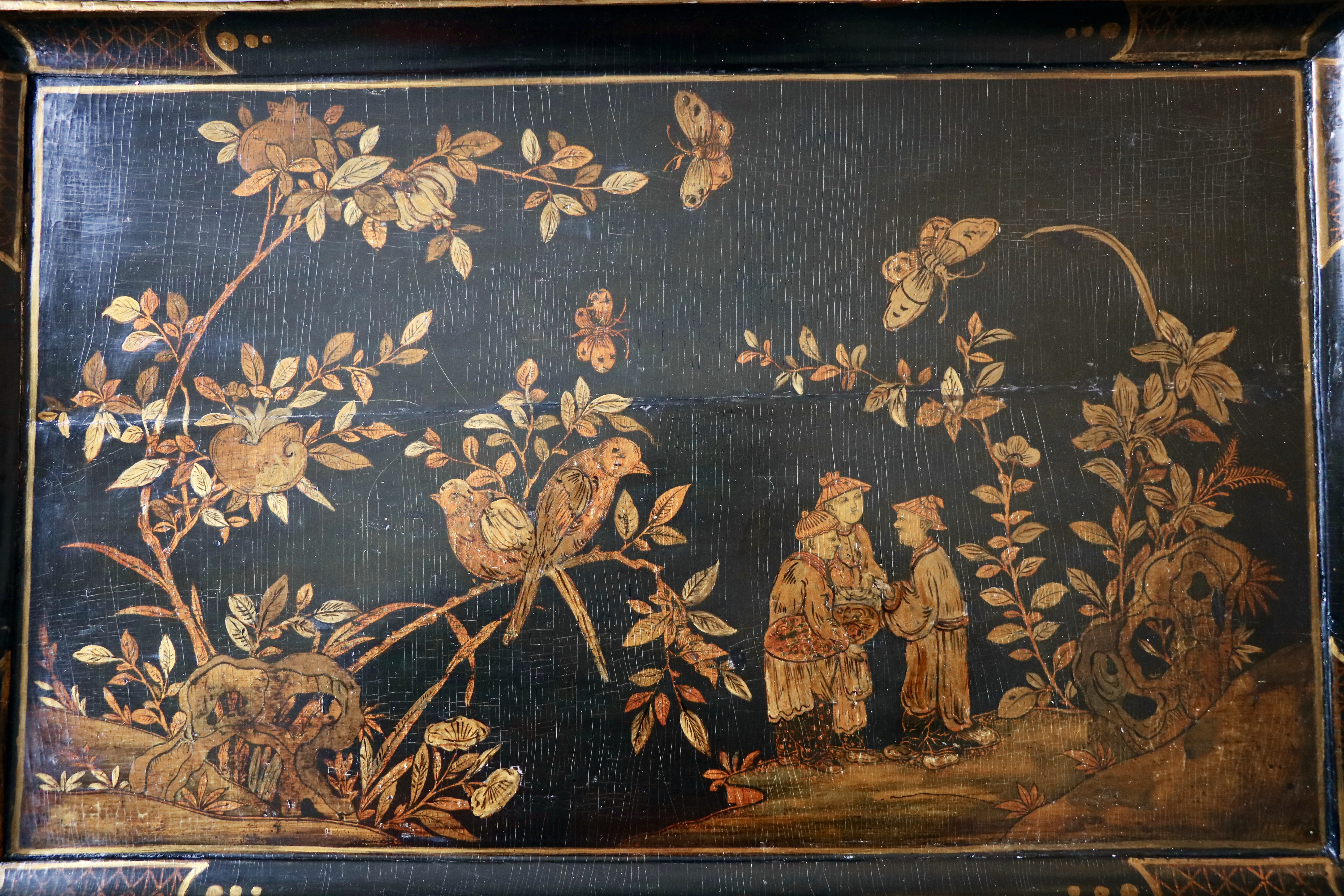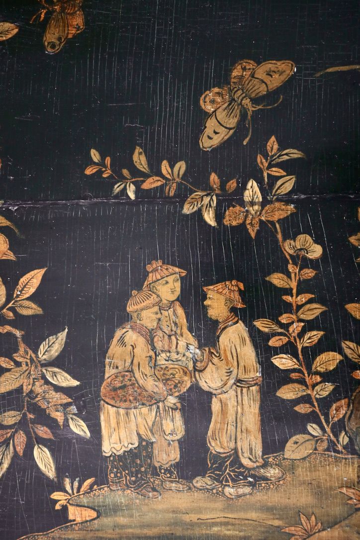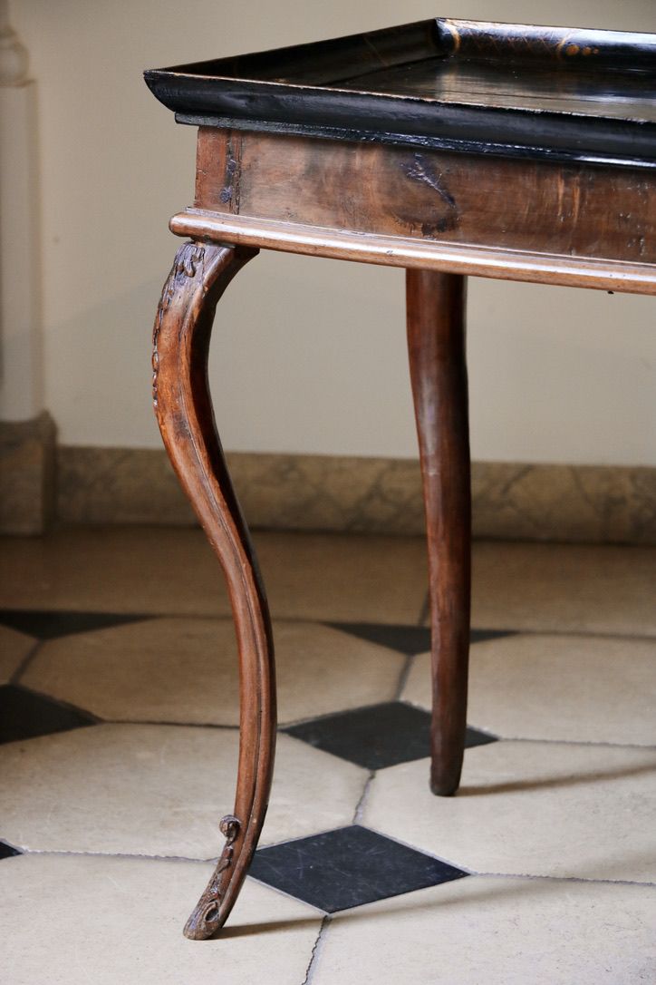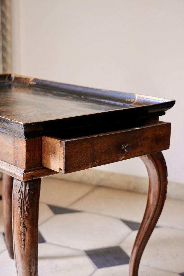 Table cabaret en vernis Martin et en noyer. Le plateau est orné d’un décor couleur or sur fond noir représentant un paysage fleuri, des papillons et trois personnages inspirés de l’Asie. La table repose sur quatre pieds cambrés et sculptés de feuilles d’acanthe. La ceinture ouvre par un tiroir. Epoque Louis XV Restaurations d’usage H. 63,5 x L. 63 x P. 43 cm