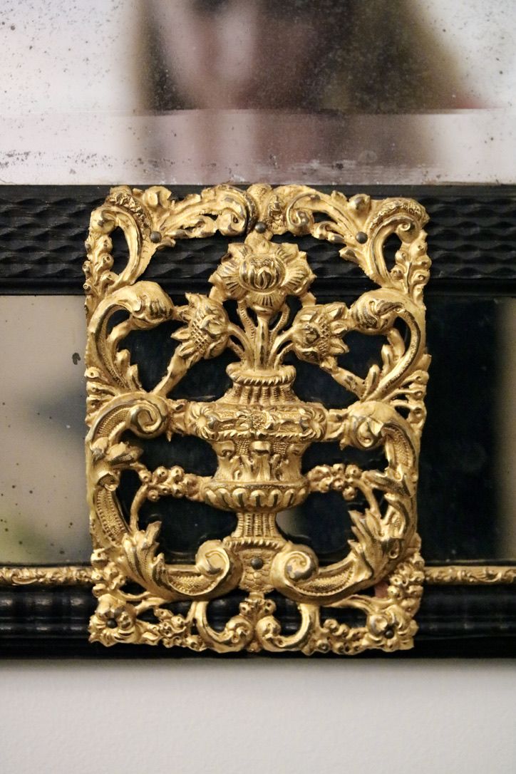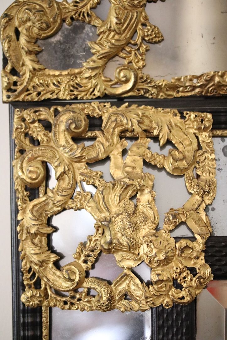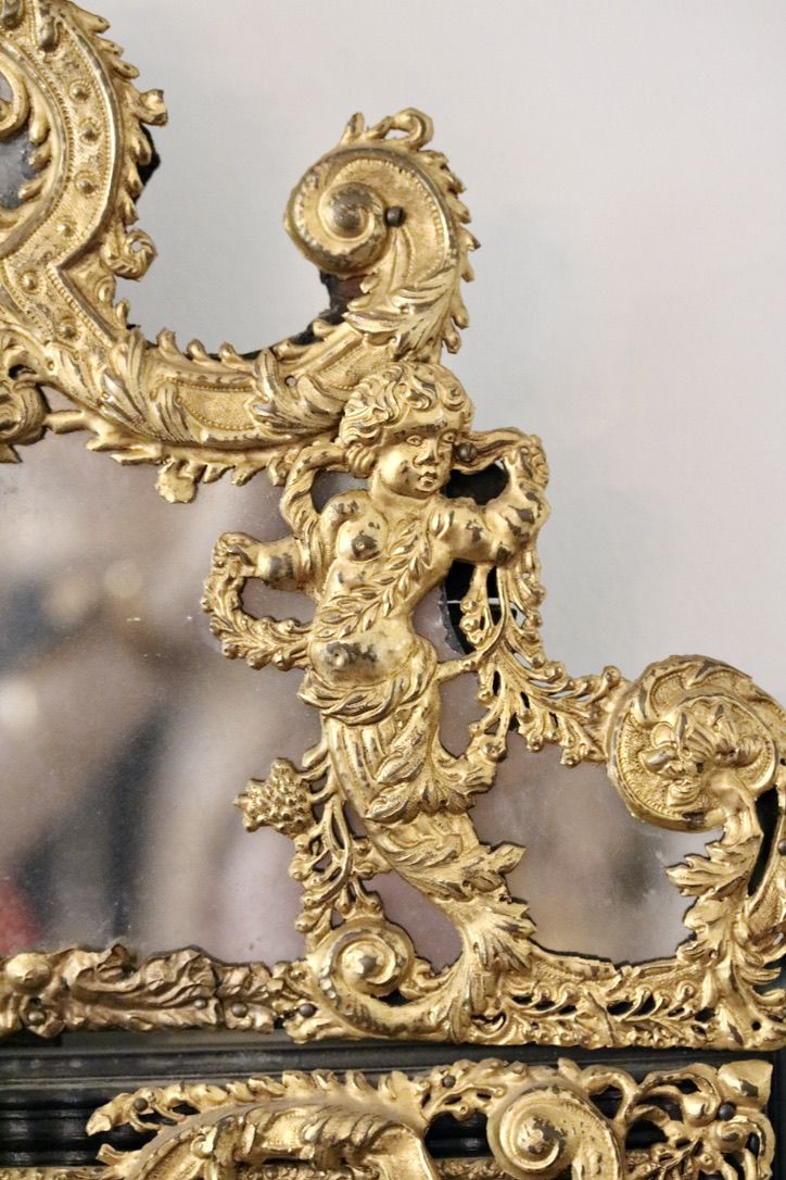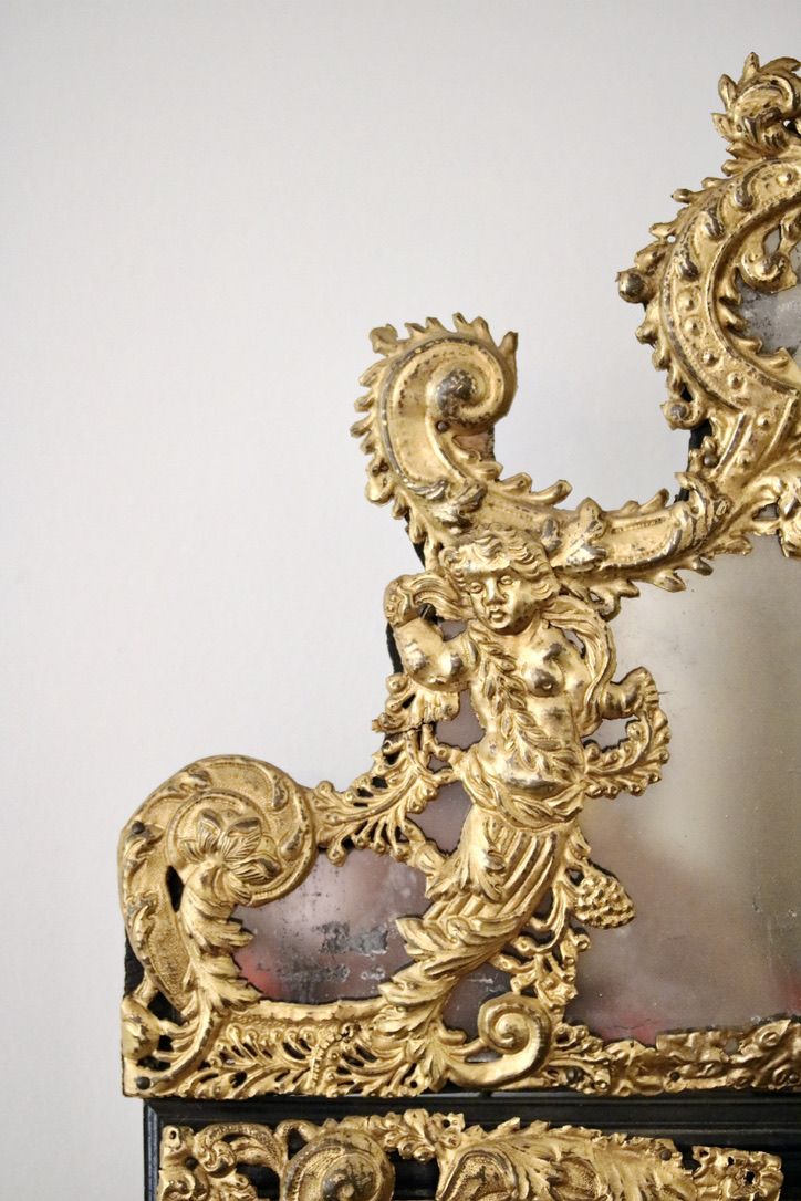 Miroir en laiton repoussé et en ébène. Les écoinçons sont à motif de rinceaux feuillagés, d’urnes fleuries et de personnages romanesques évoquant celui placé au centre du fronton. Celui-ci est décoré en son milieu d’un personnage dansant au son d’une lyre qu’il tient dans ses mains, et sur les côtés de putti à mi-corps. Le personnage central est probablement Orphée, dont on reconnaît l’attribut de la lyre, symbole de la musique et du chant dans lequel Orphée excelle. Travail flamand Vers 1670 Restaurations d’usage H. 104 x L. 62 cm
