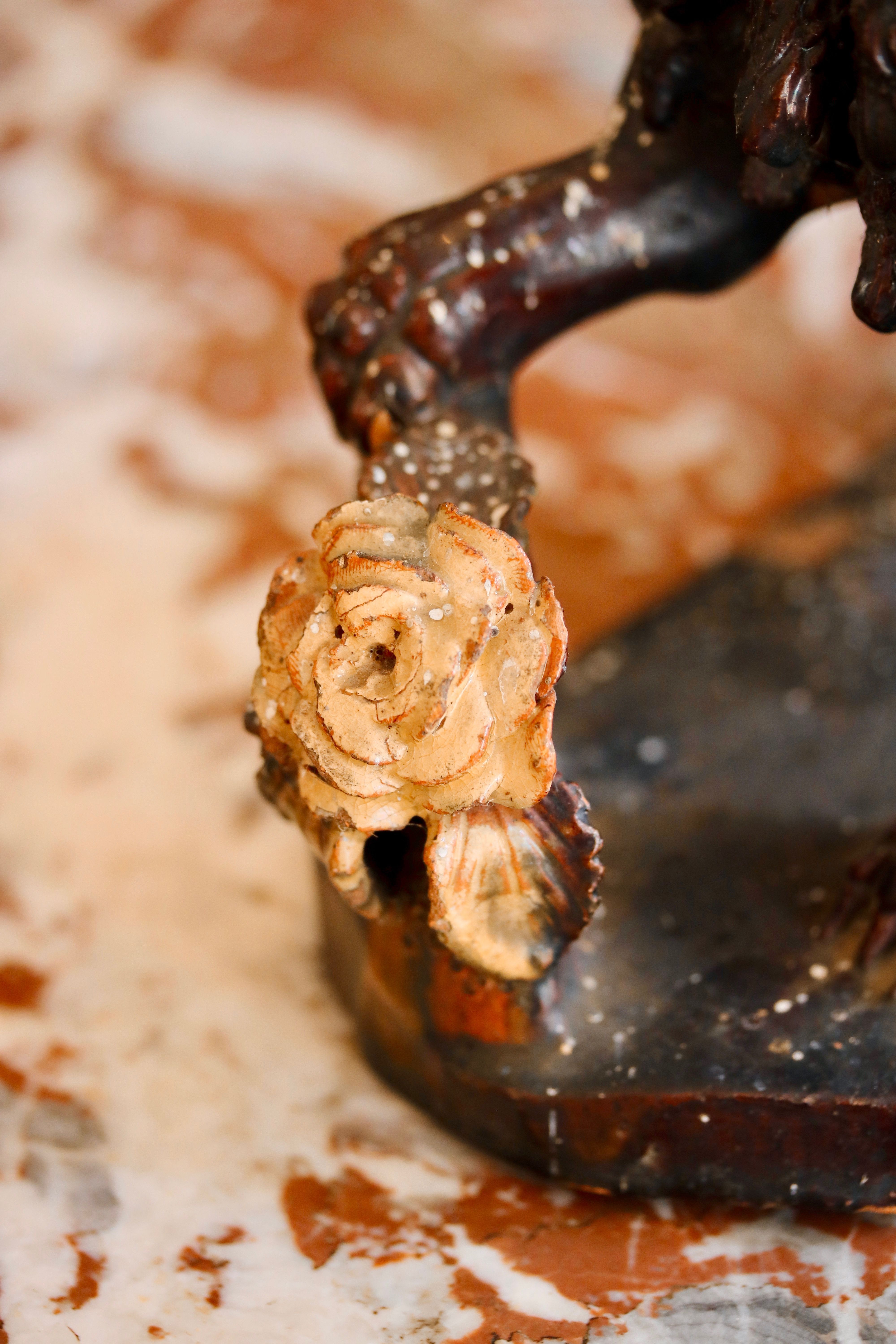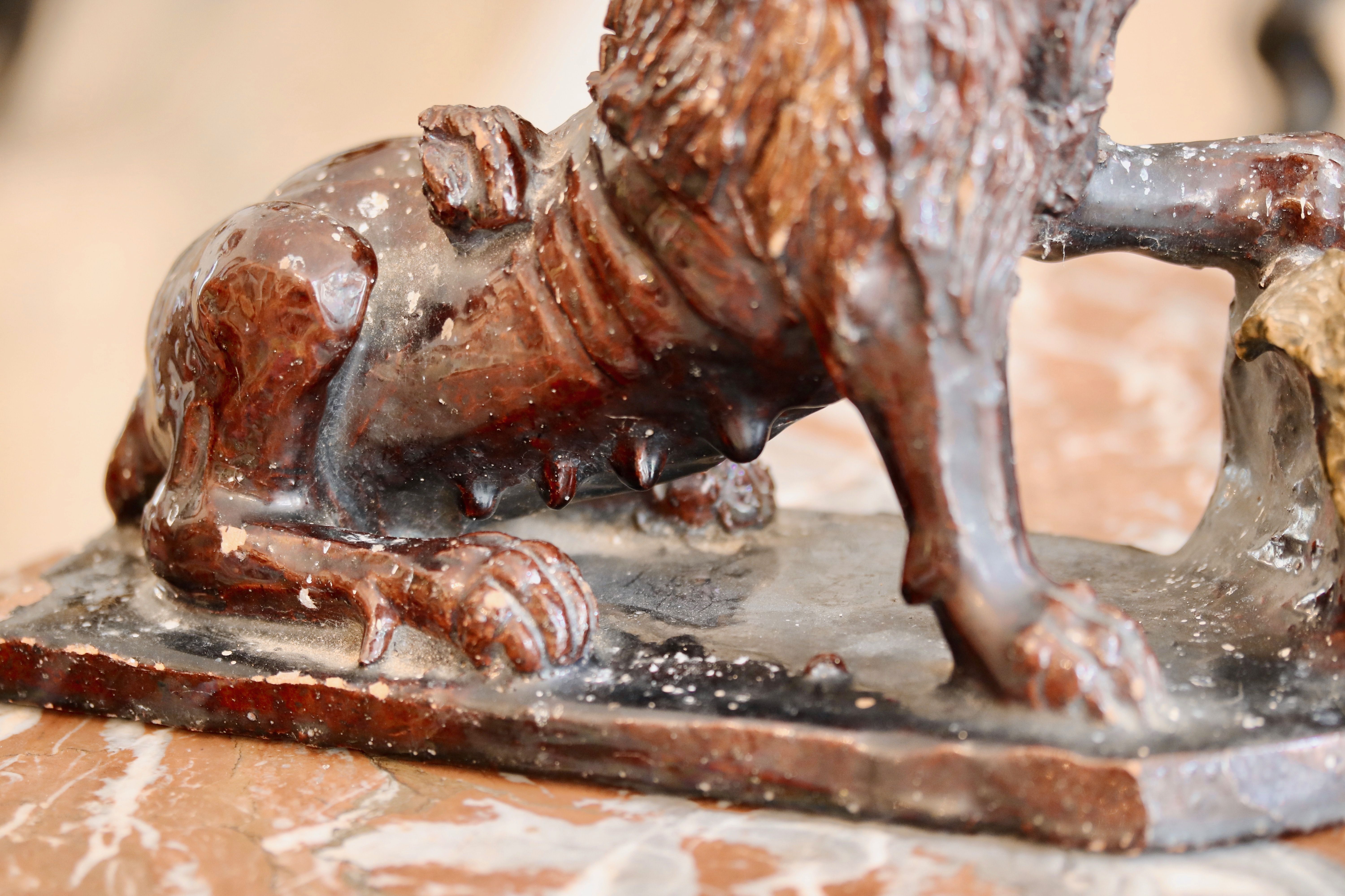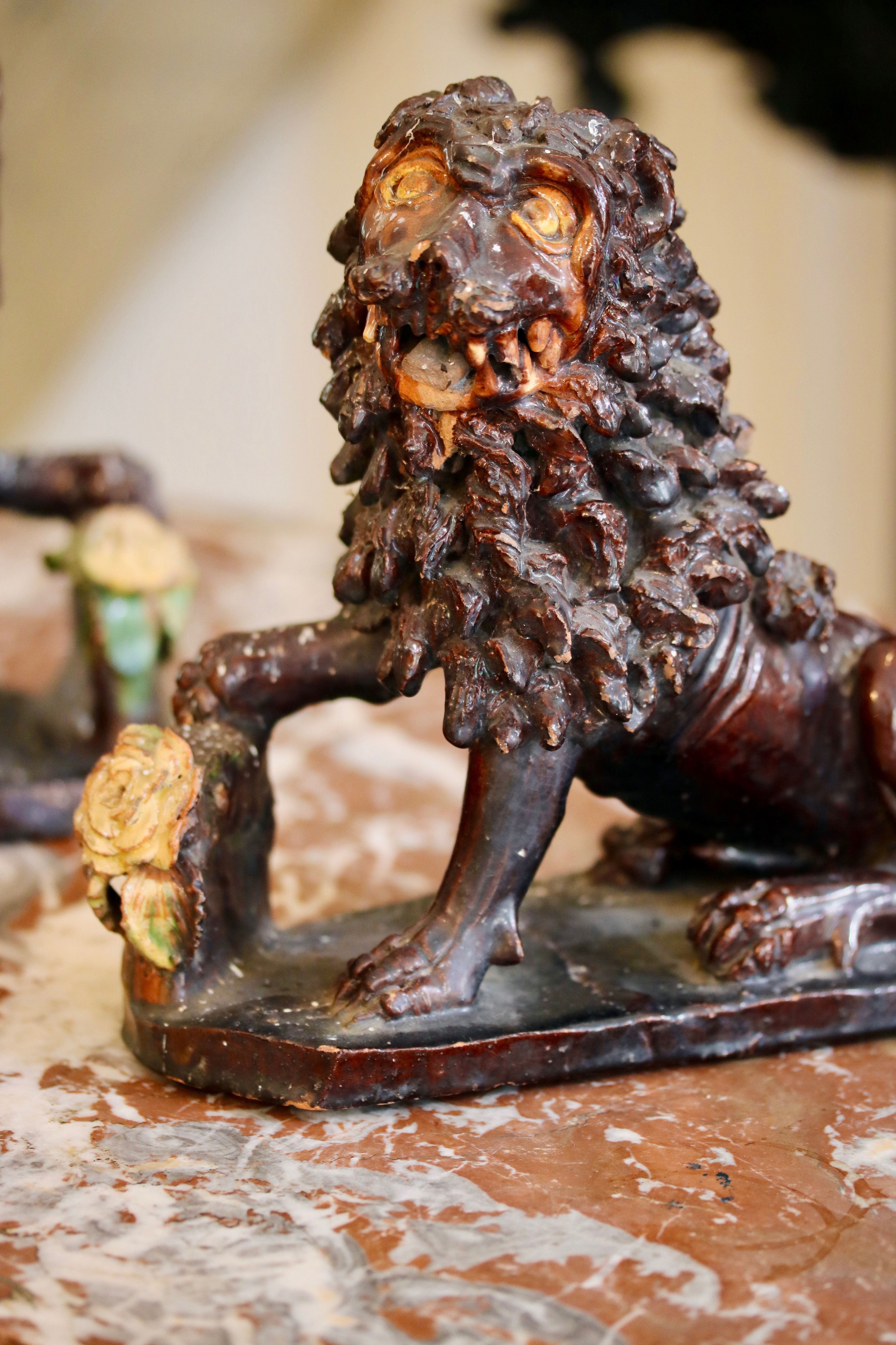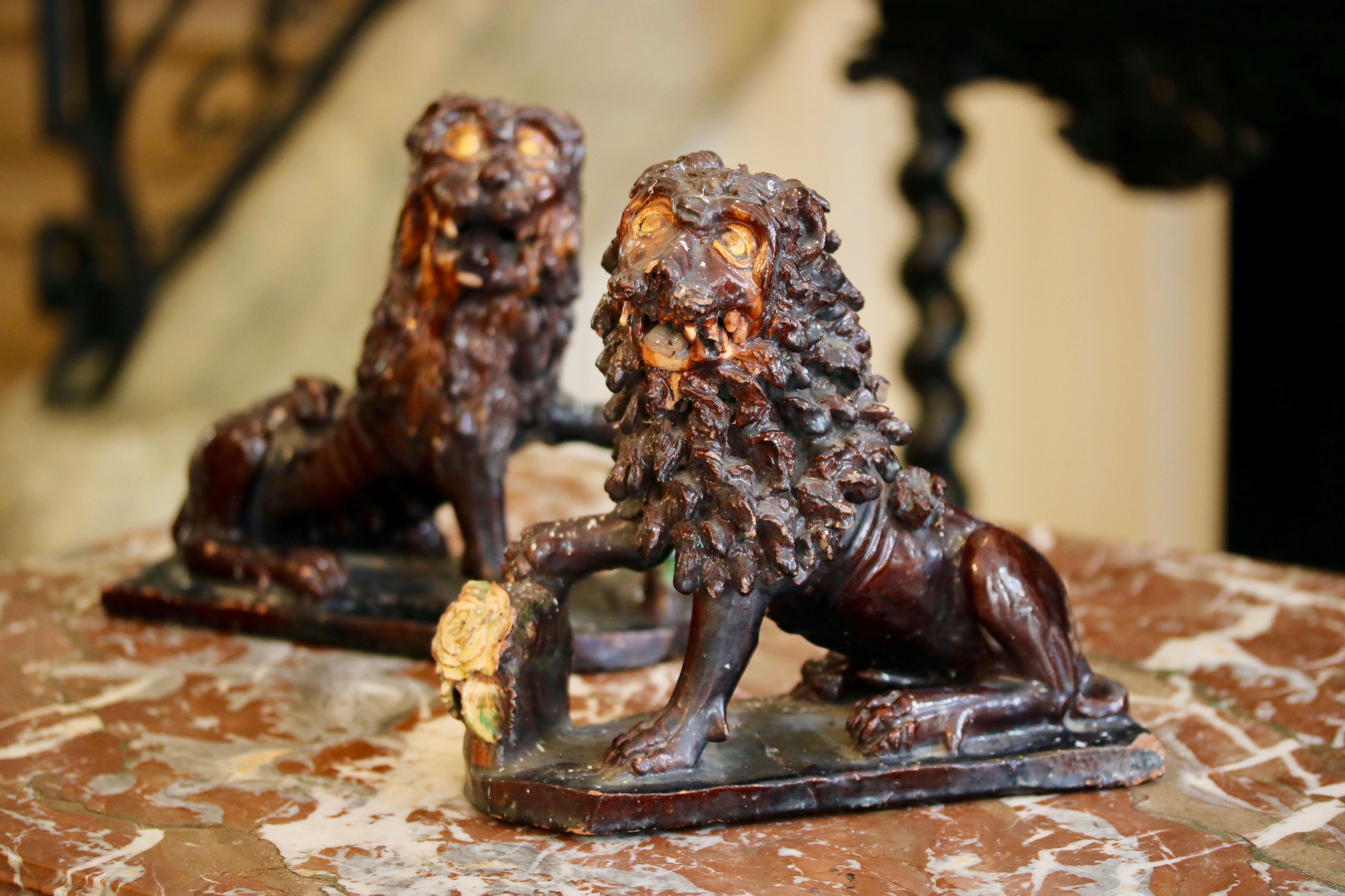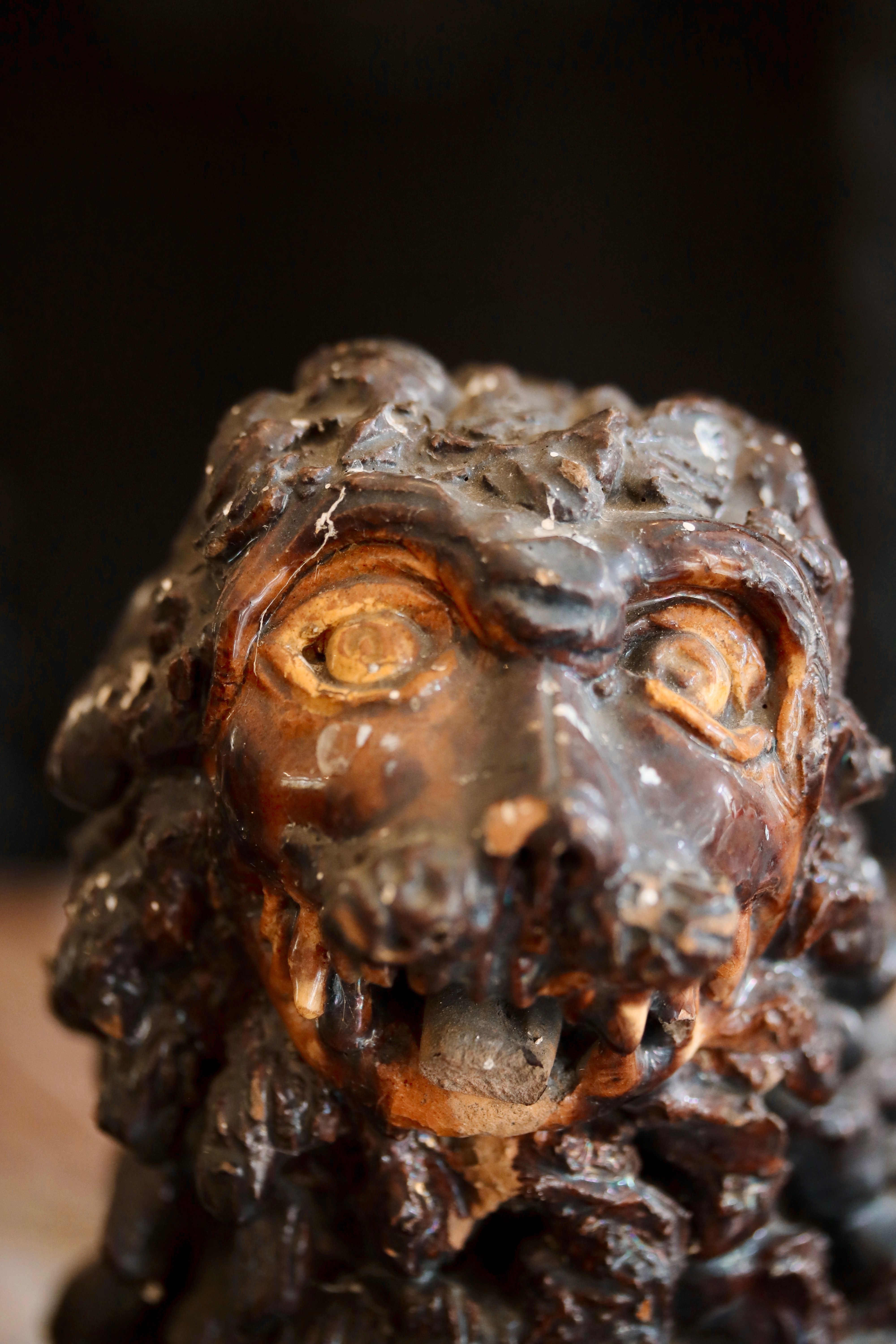 Paire de chiens de Fô en faïence d’Apt représentant le mâle et la femelle. Epoque fin XVIIIe Restaurations d’usage H.23 x L. 23 x P. 10 cm
