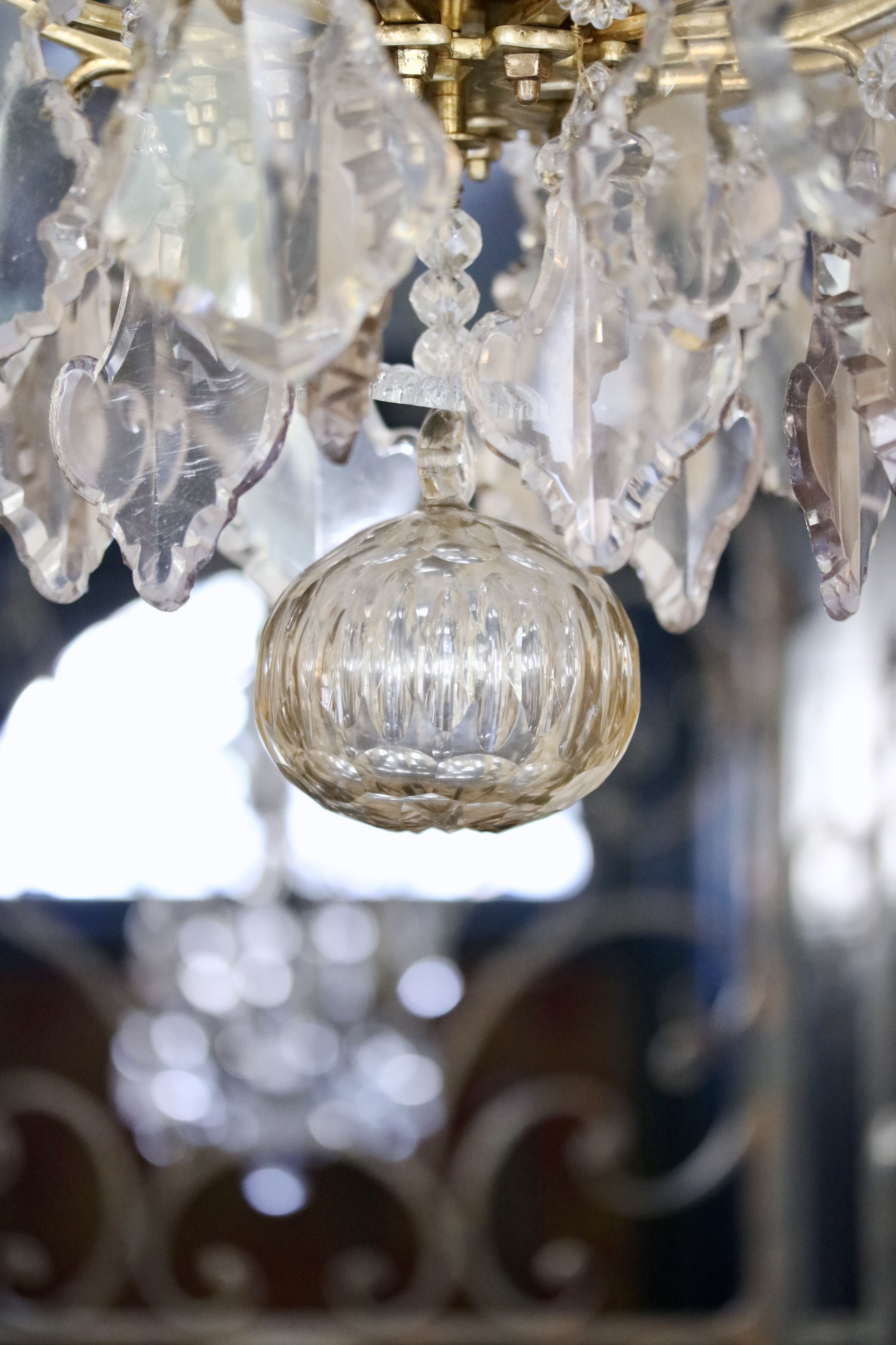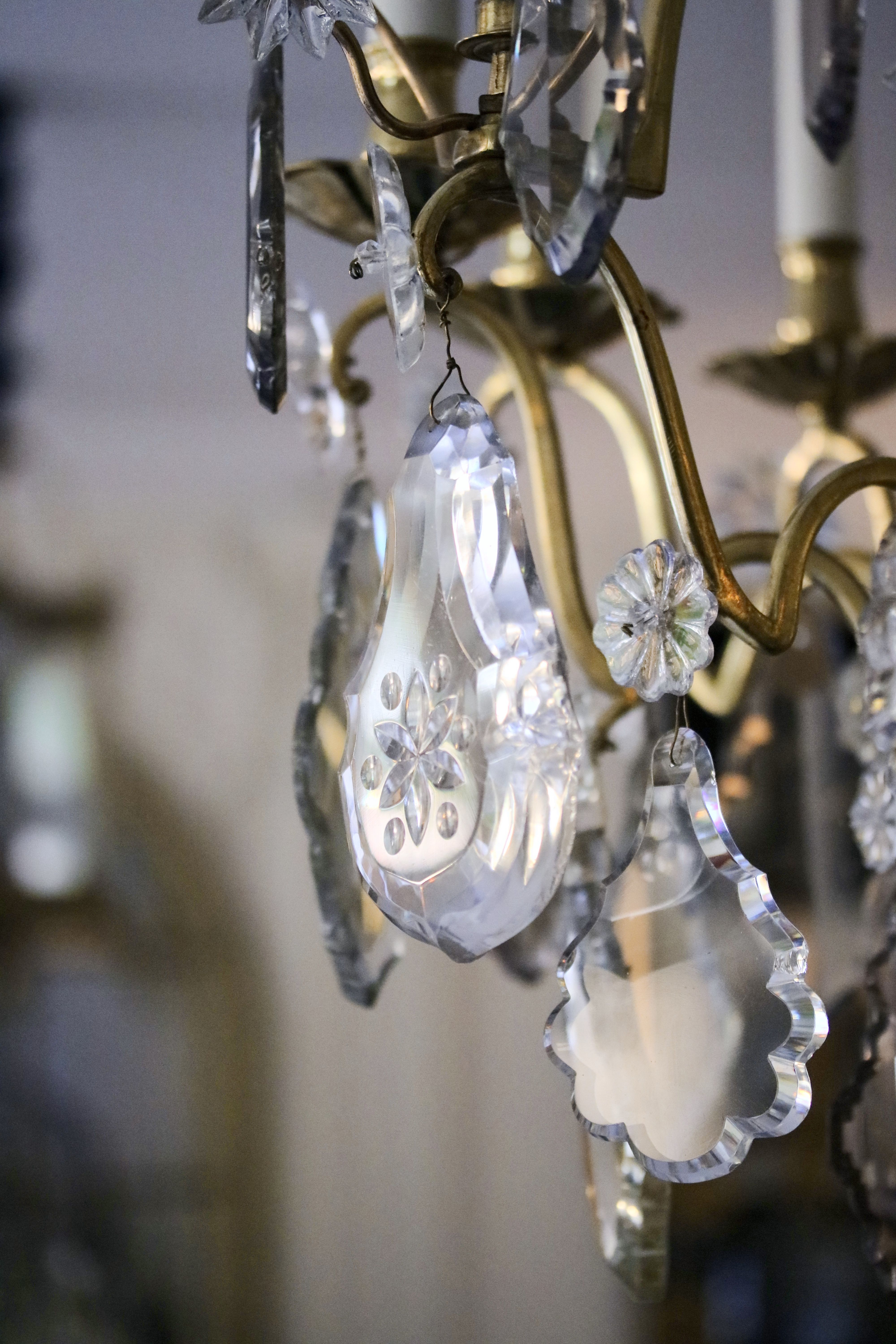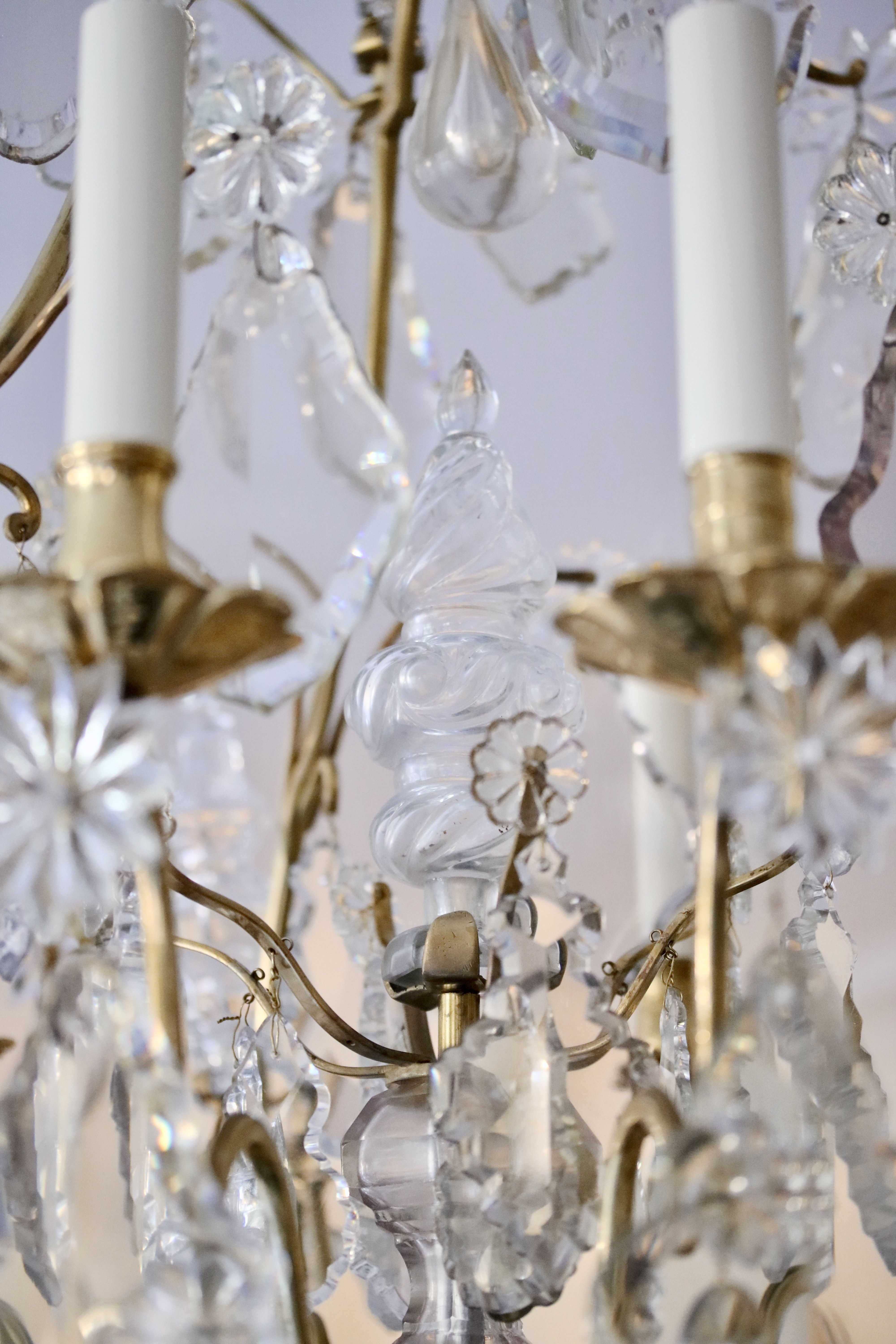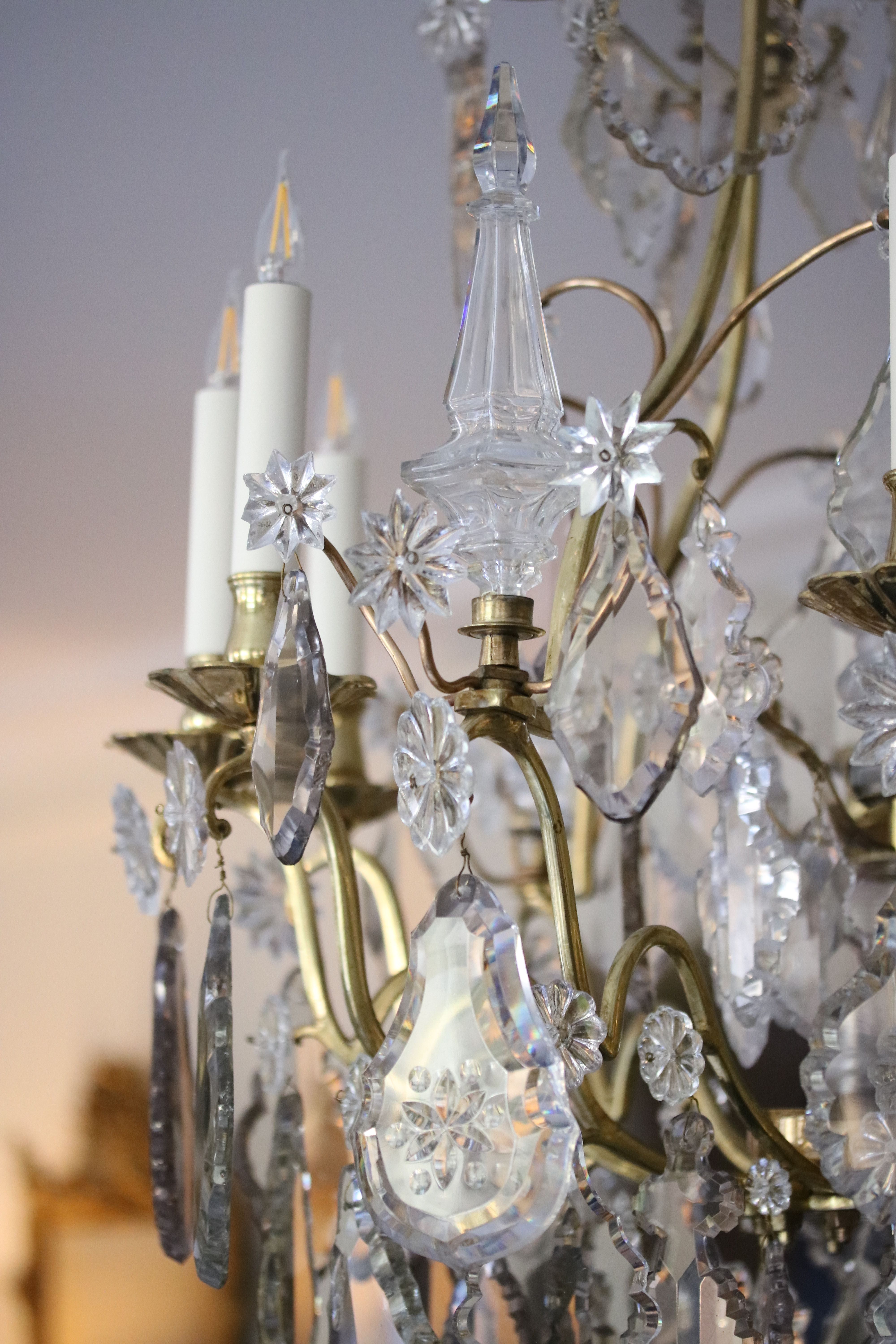 Lustre cage à neuf bras de lumières. Le lustre est garni de pampilles en cristal de différentes formes et couleurs dont des plaquettes et des fleurs réparties sur plusieurs étages ainsi qu’une boule de chute. Le lustre est décoré de poignards, dont un poignard à l’intérieur de la cage qui est surplombé d’une goutte de cristal en poire. Epoque Louis XV Restaurations d’usage H. 120 x D. 76 cm