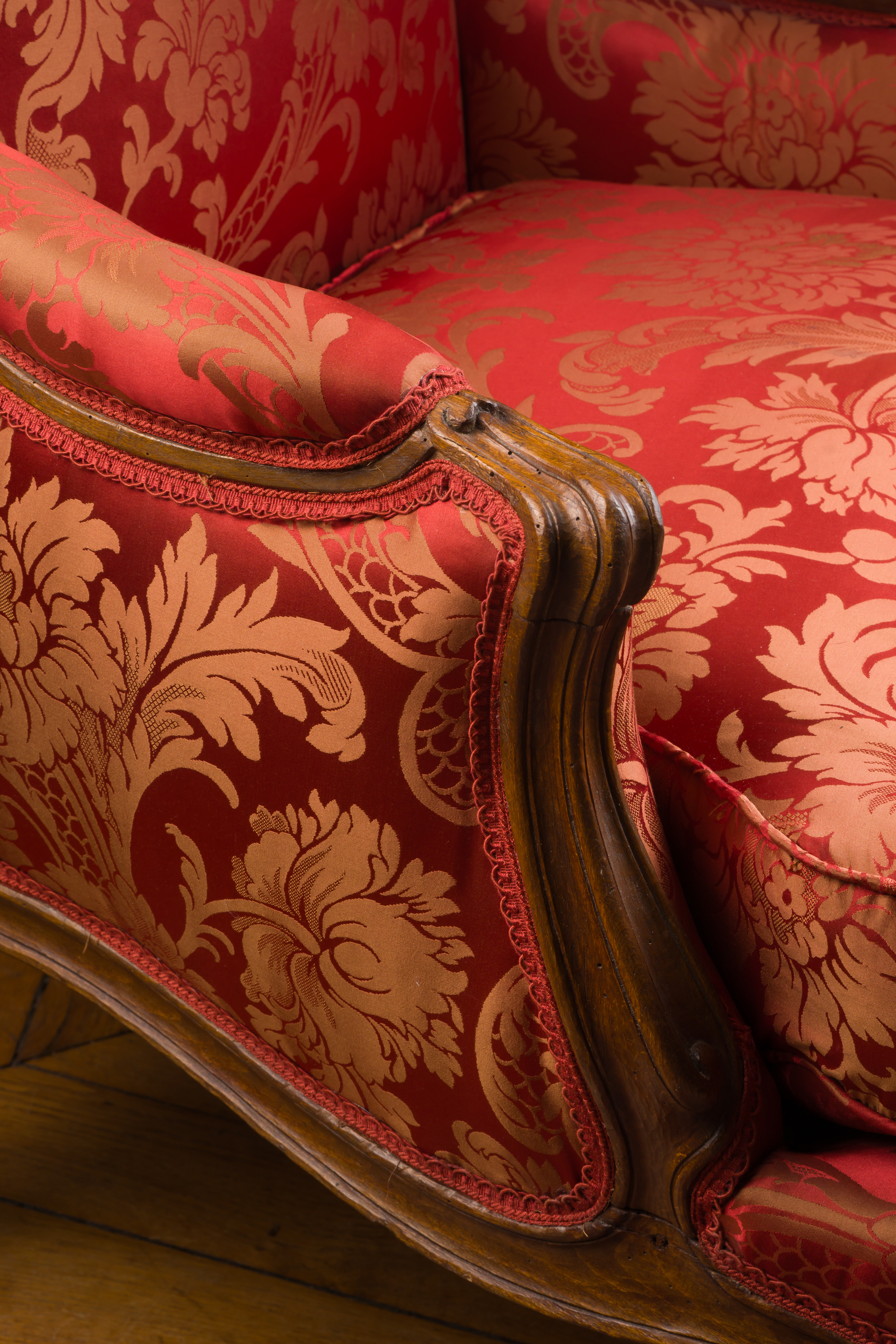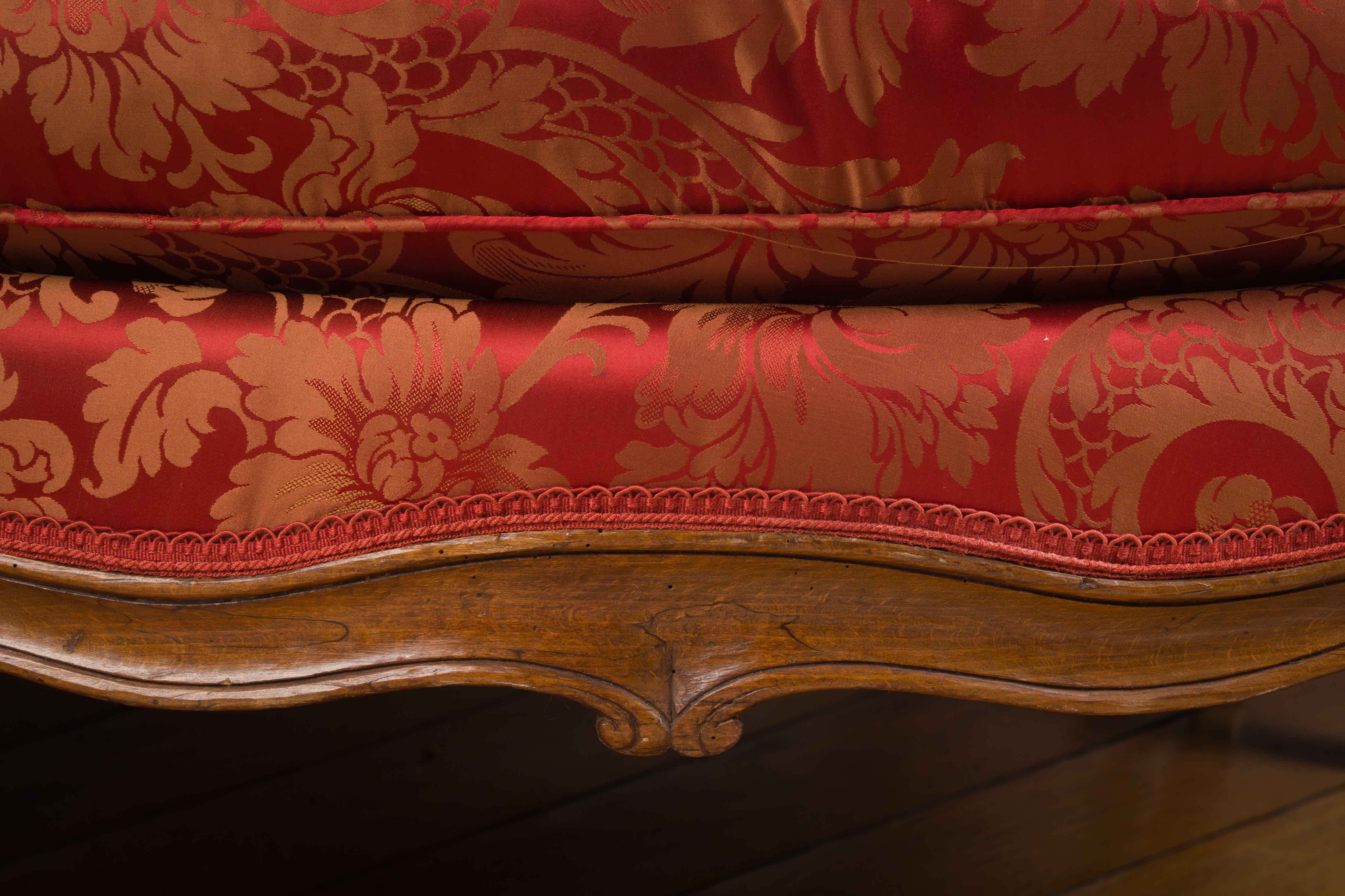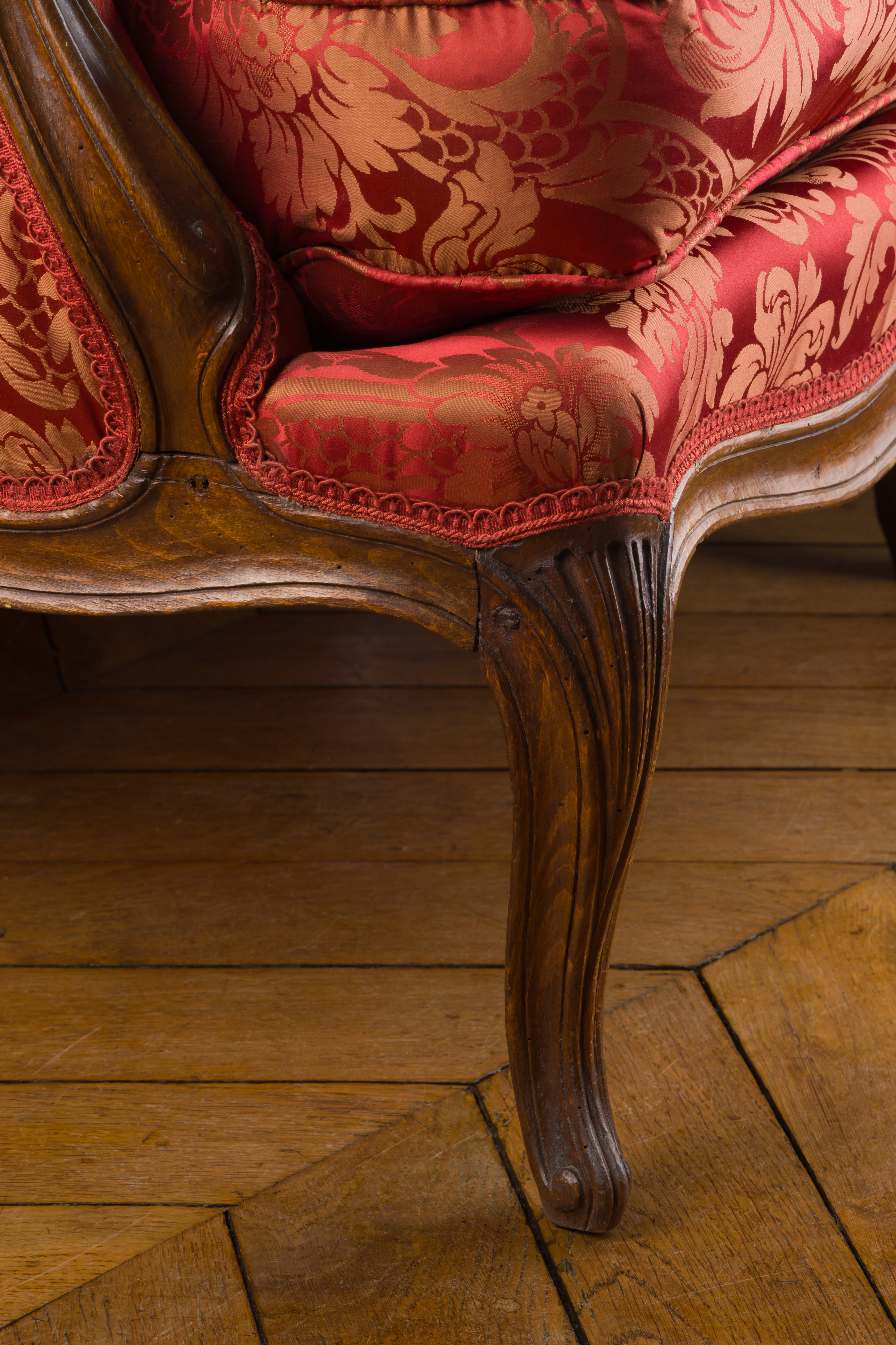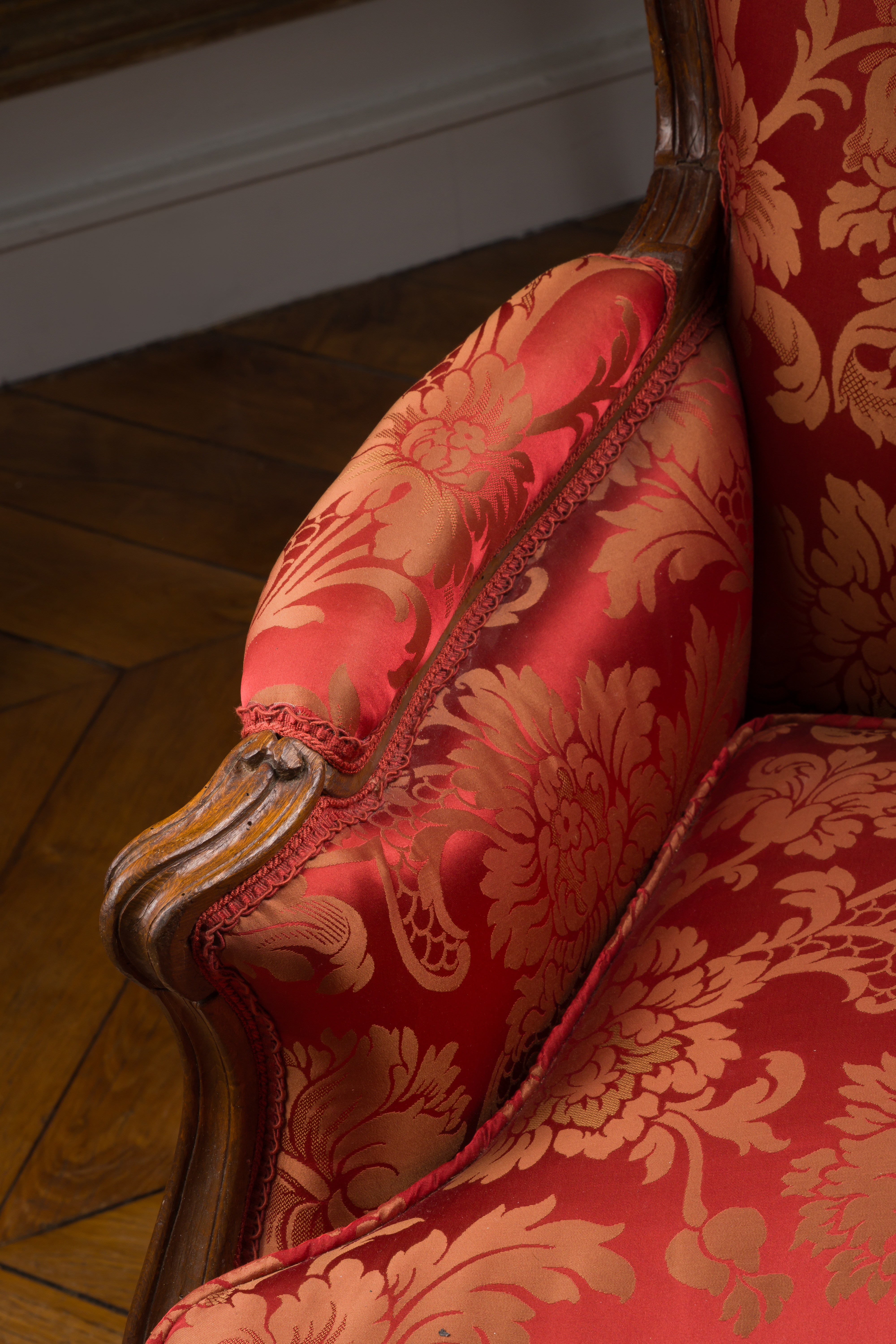 Paire de bergères à la reine en bois naturel reposant sur quatre petits pieds galbés surmontés d’un motif de feuilles plissées. Les accotoirs sont en coup de fouet. Les montants et traverses sont moulurés. Estampillée Jacques Pierre Letellier Epoque Louis XV Restaurations d’usage, garniture moderne H. 91 x L. 74,5 x P. 60,5 cm Jacques Pierre Letellier est un menuisier parisien devenu maître en 1747. Issu d’une famille de menuisiers, il développe son activité au Faubourg Saint Antoine. Sa production est alors essentiellement de style Louis XV. L’ouvrage de Pierre Kjelleberg, « Le mobilier français du XVIIIe siècle » nous indique qu’il réalise à la fois des sièges luxueux mais aussi des sièges qu’on appelle d’usage plus simple. Ainsi, il aurait exécuté dix fauteuils Transition pour le Marquis de Marigny, aujourd’hui détenu dans une collection parisienne.