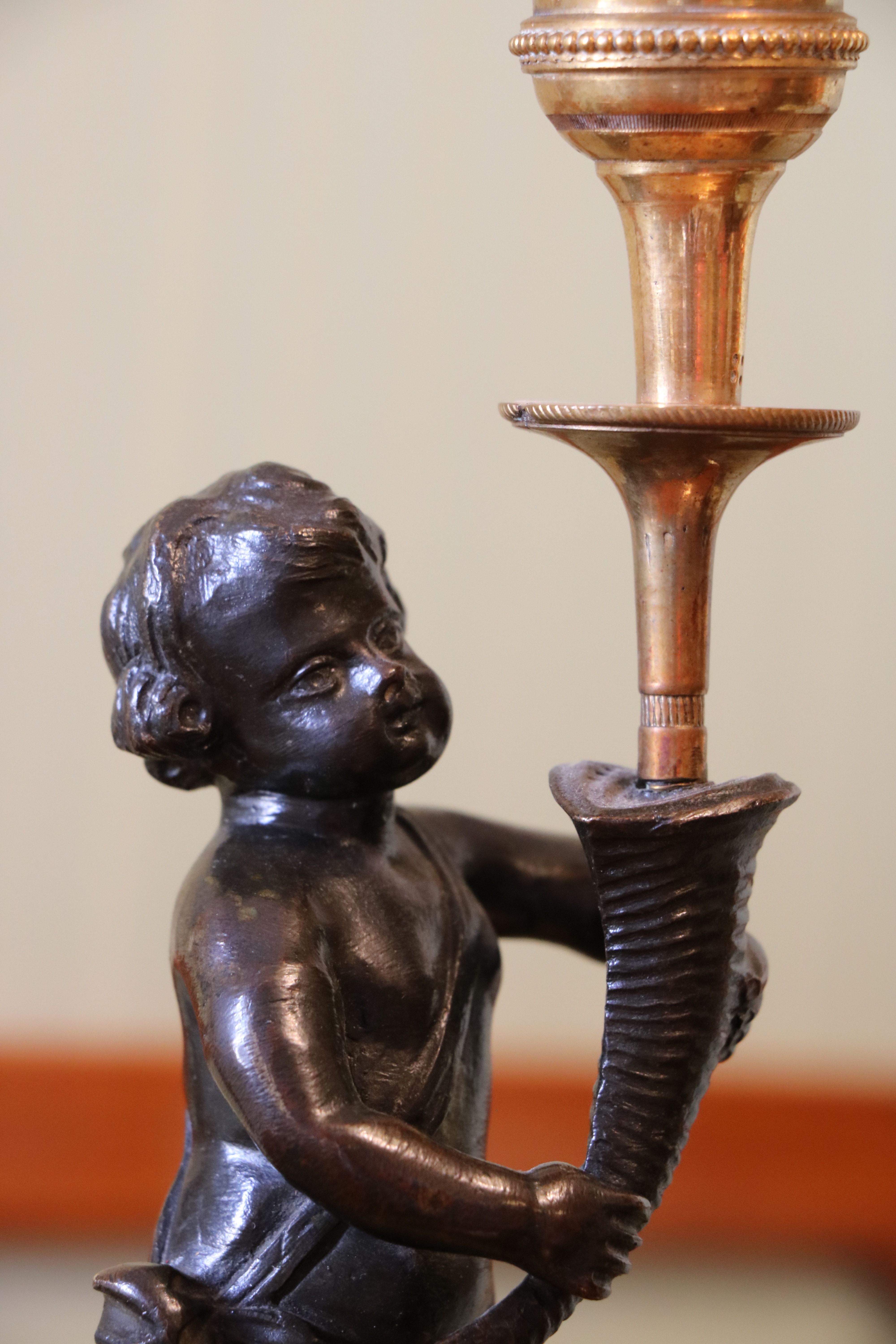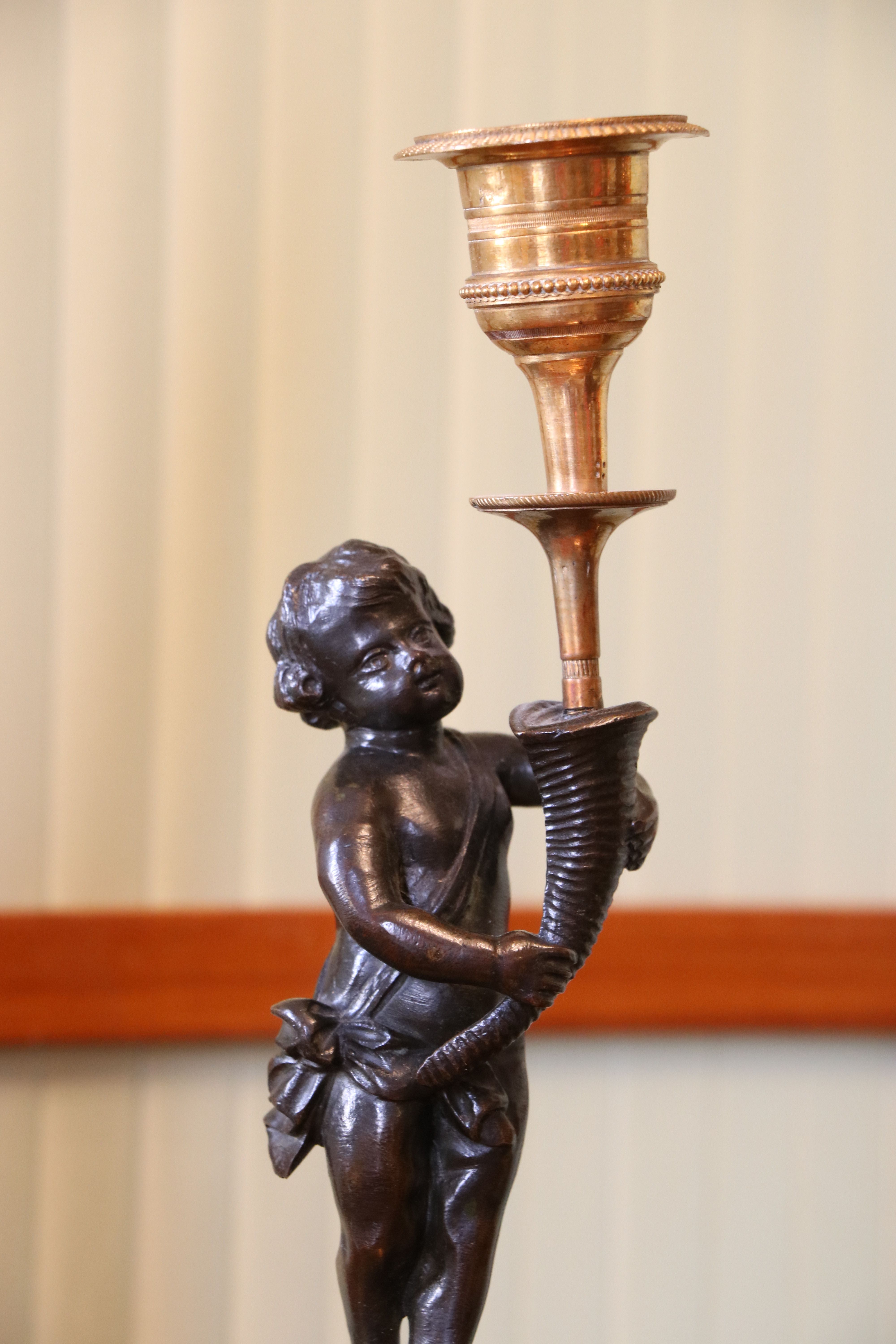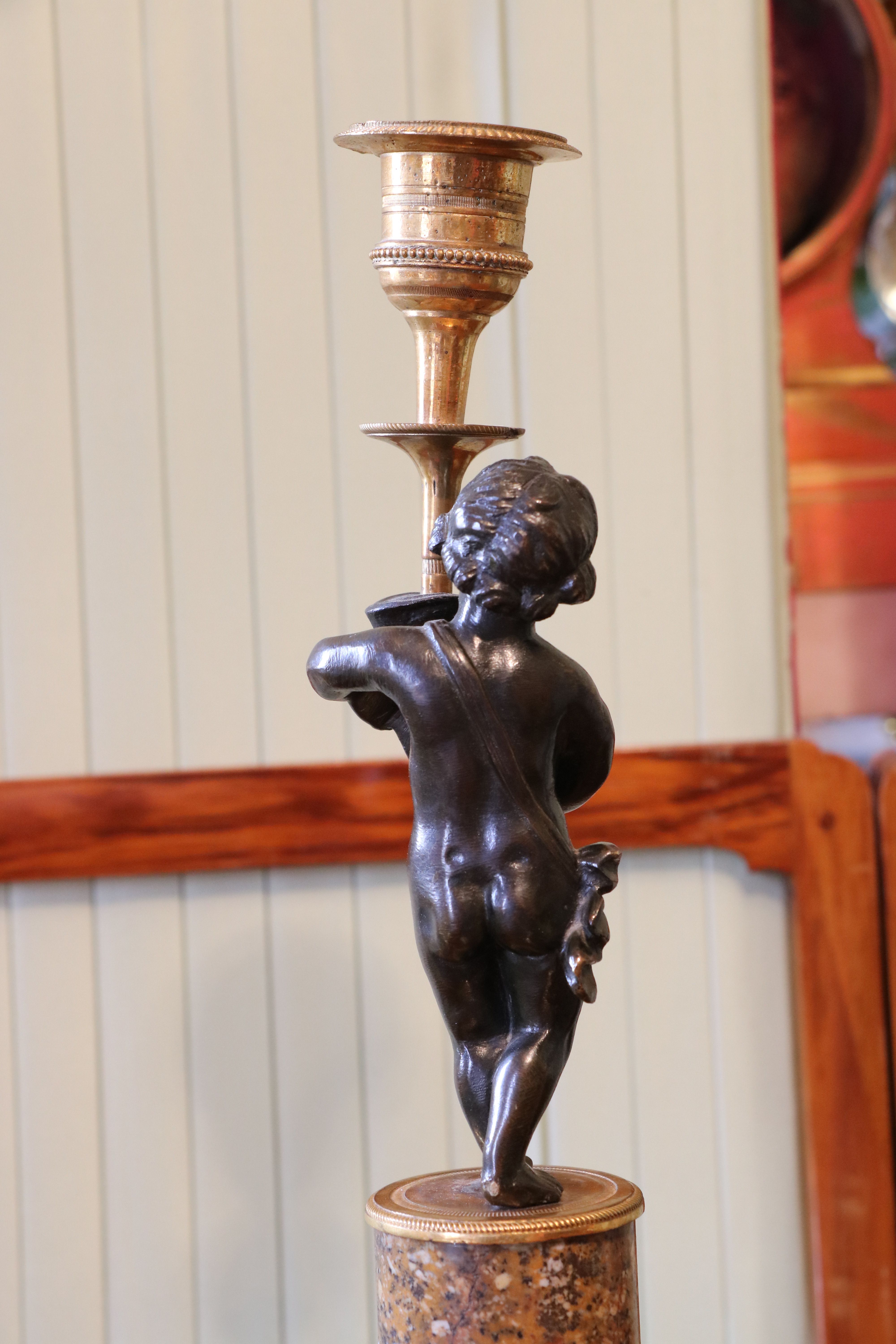Paire de bougeoirs en bronze doré et en bronze patiné représentant un putto tenant une corne d'abondance sur une colonne de marbre Brocatelle Jaune d'Espagne. Le socle à deux évolutions se resserrent sur le fut de la colonne. On retrouve un décors de ciselures fines avec des frise guillochées, de godrons, de torsades ainsi que de perles. Epoque Louis XVI Etat d'usage (marbre fendu) Hauteur : 27 - Diamètre : 8 cm