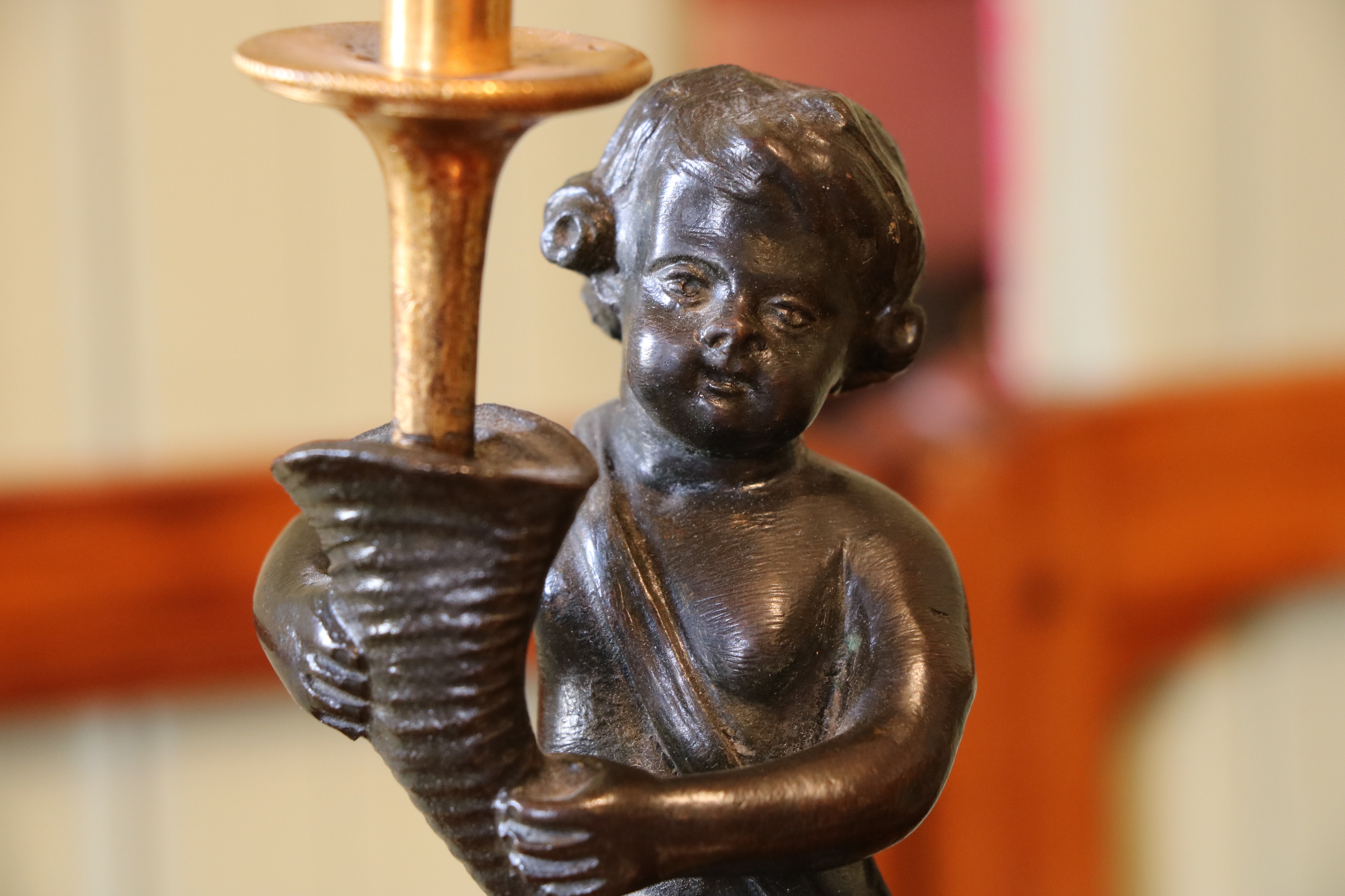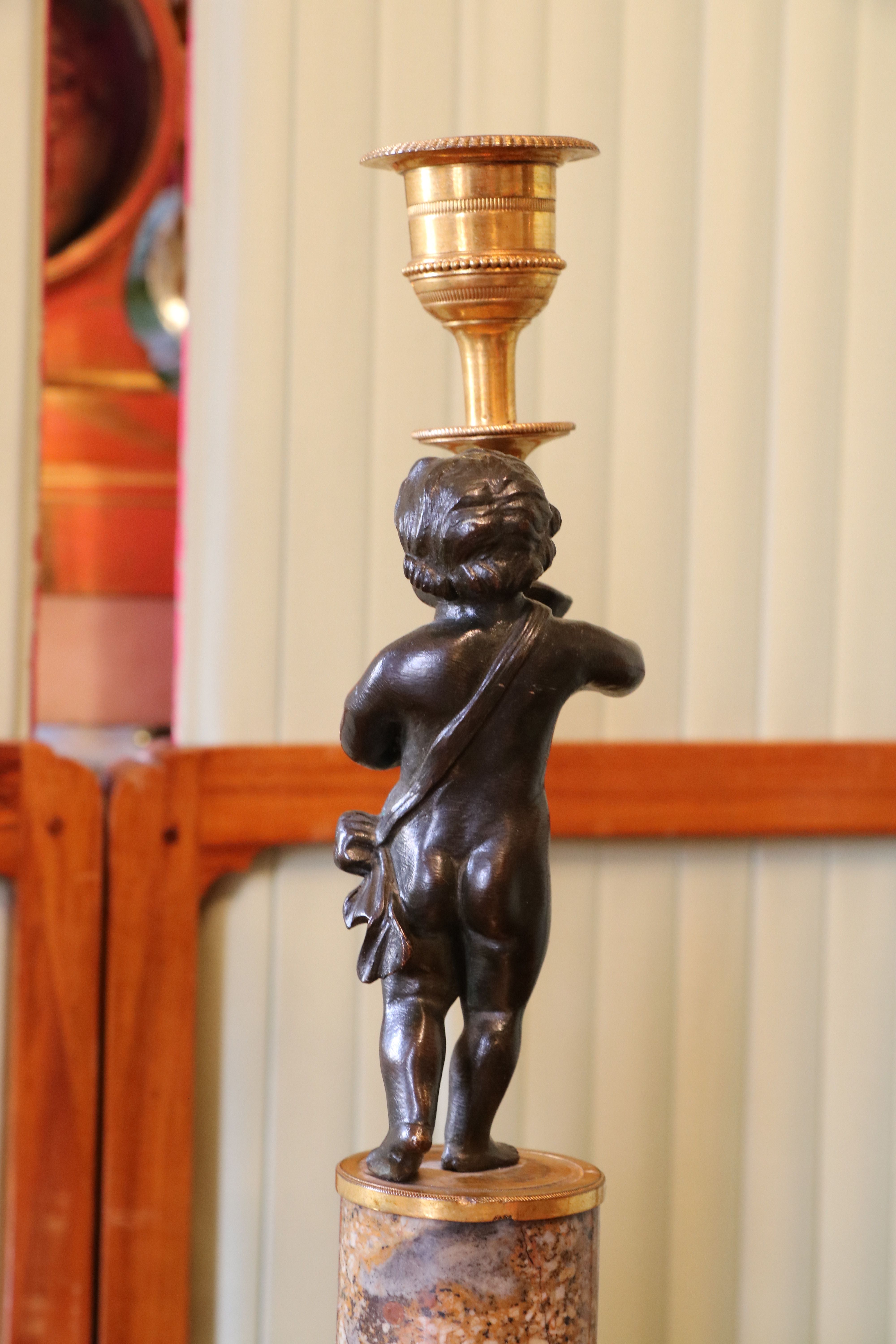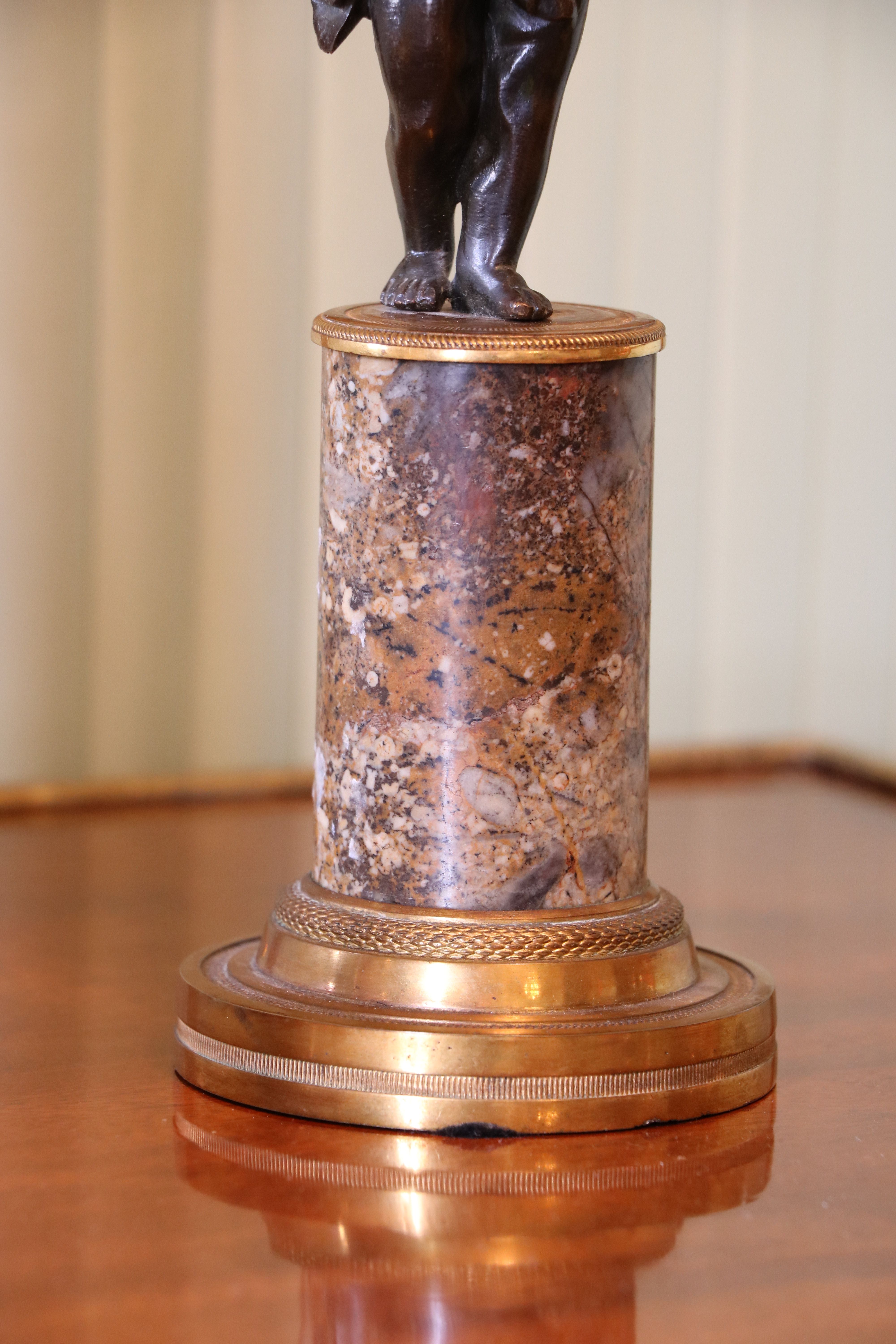 Paire de bougeoirs en bronze doré et en bronze patiné représentant un putto tenant une corne d'abondance sur une colonne de marbre Brocatelle Jaune d'Espagne. Le socle à deux évolutions se resserrent sur le fut de la colonne. On retrouve un décors de ciselures fines avec des frise guillochées, de godrons, de torsades ainsi que de perles. Epoque Louis XVI Etat d'usage (marbre fendu) Hauteur : 27 - Diamètre : 8 cm