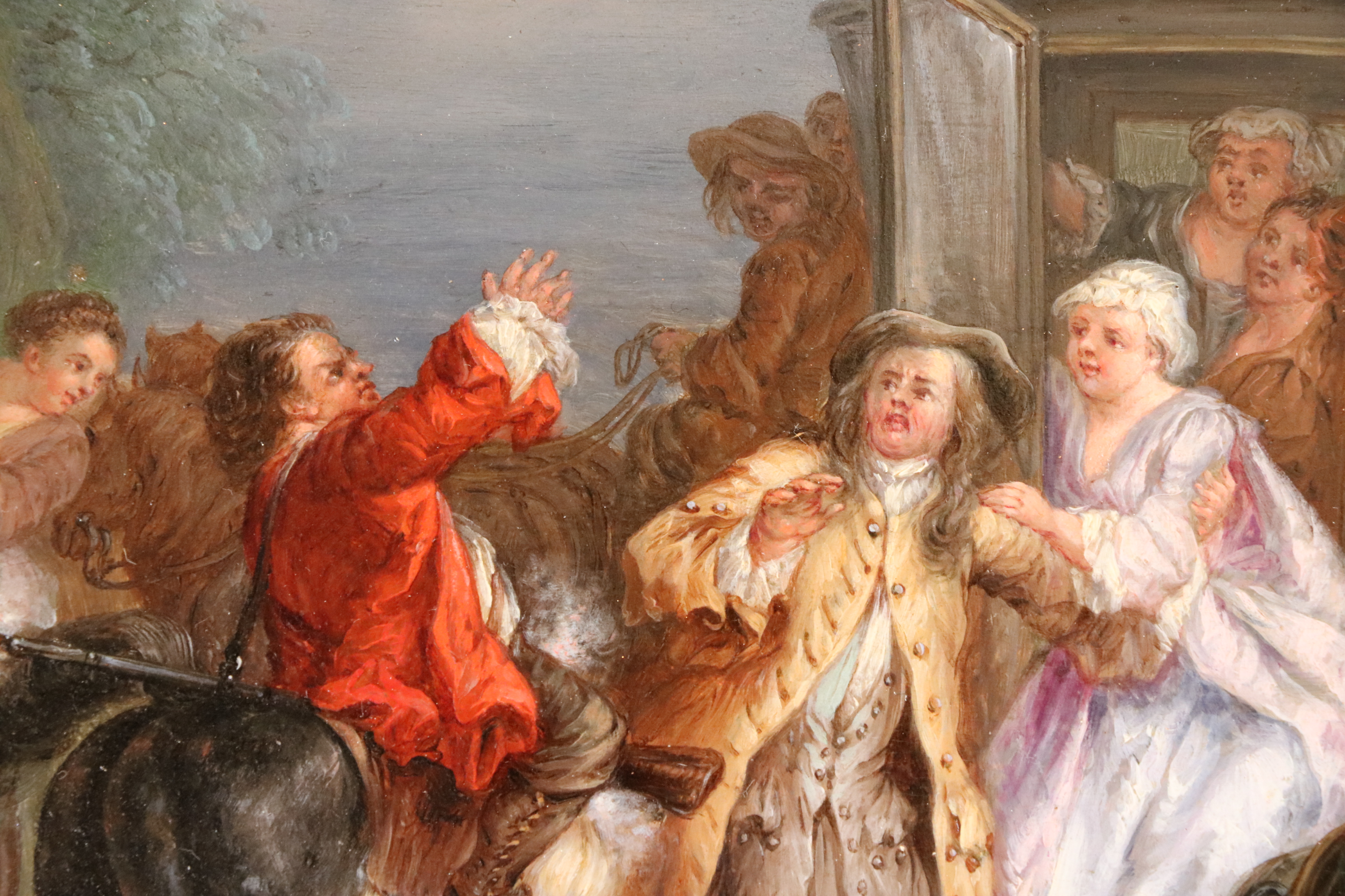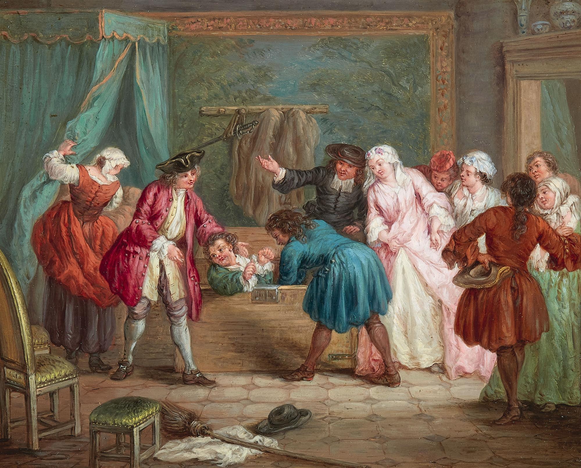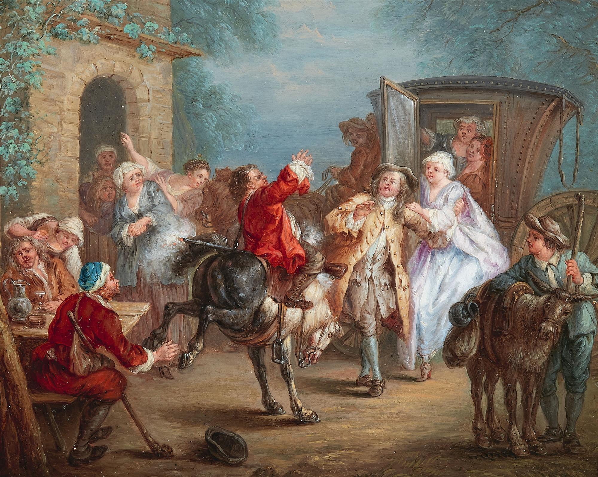 Scènes tirées du Roman Comique de Paul Scarron. La première scène présente Ragotin à cheval avec sa carabine tirant involontairement. La seconde illustre Ragotin retiré du coffre où la servante l'avait enfermé. Cette paire rappelle la suite de peintures réalisée par Jean-Baptiste Pater pour illustrer l'oeuvre de Paul Scarron. Les peintures de genre de Jeaurat, à la manière de David Teniers, étaient extrêmement populaires. On le surnomme même parfois le Teniers français. Il devint membre de l'Académie royale en 1733 et fut nommé gardien de la collection royale de peinture à Versailles en 1767. Il exposa au Salon des Artistes du Louvre pour la première fois en 1737 et continua à le faire jusqu'à peu avant sa mort, à l'âge de 90 ans. La présente paire de tableaux a été attribuée à Jeaurat par le Cabinet Millet, à Paris.