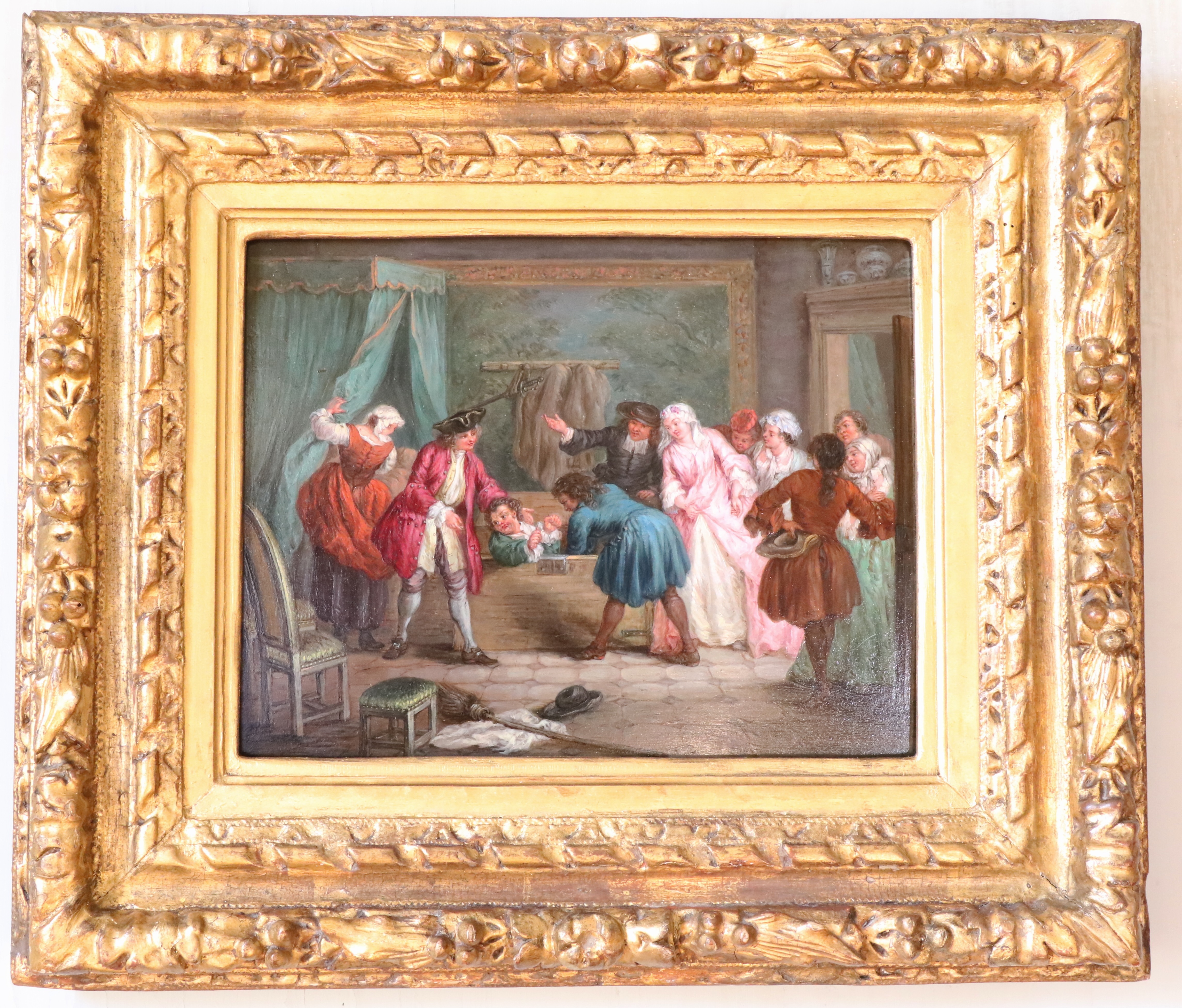 Paire de panneaux attribuée à Etienne Jeaurat. Né le 9 Février 1699 – Mort le 14 Décembre 1789 à Versailles. Le Coup de feu involontaire ; L'Amant découvert "Scène de Genres" Huile sur panneau. H. 19 x L. 24 cm