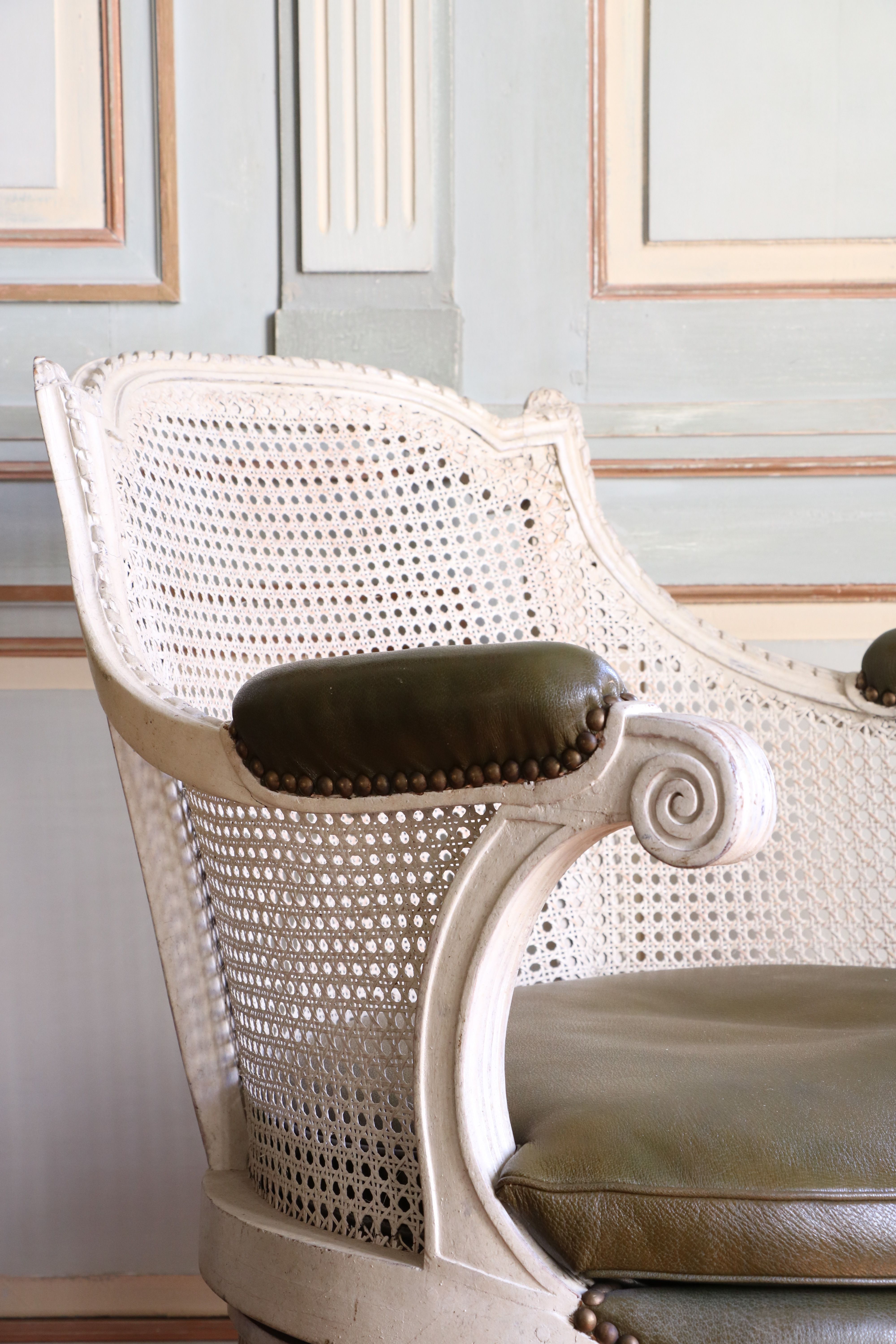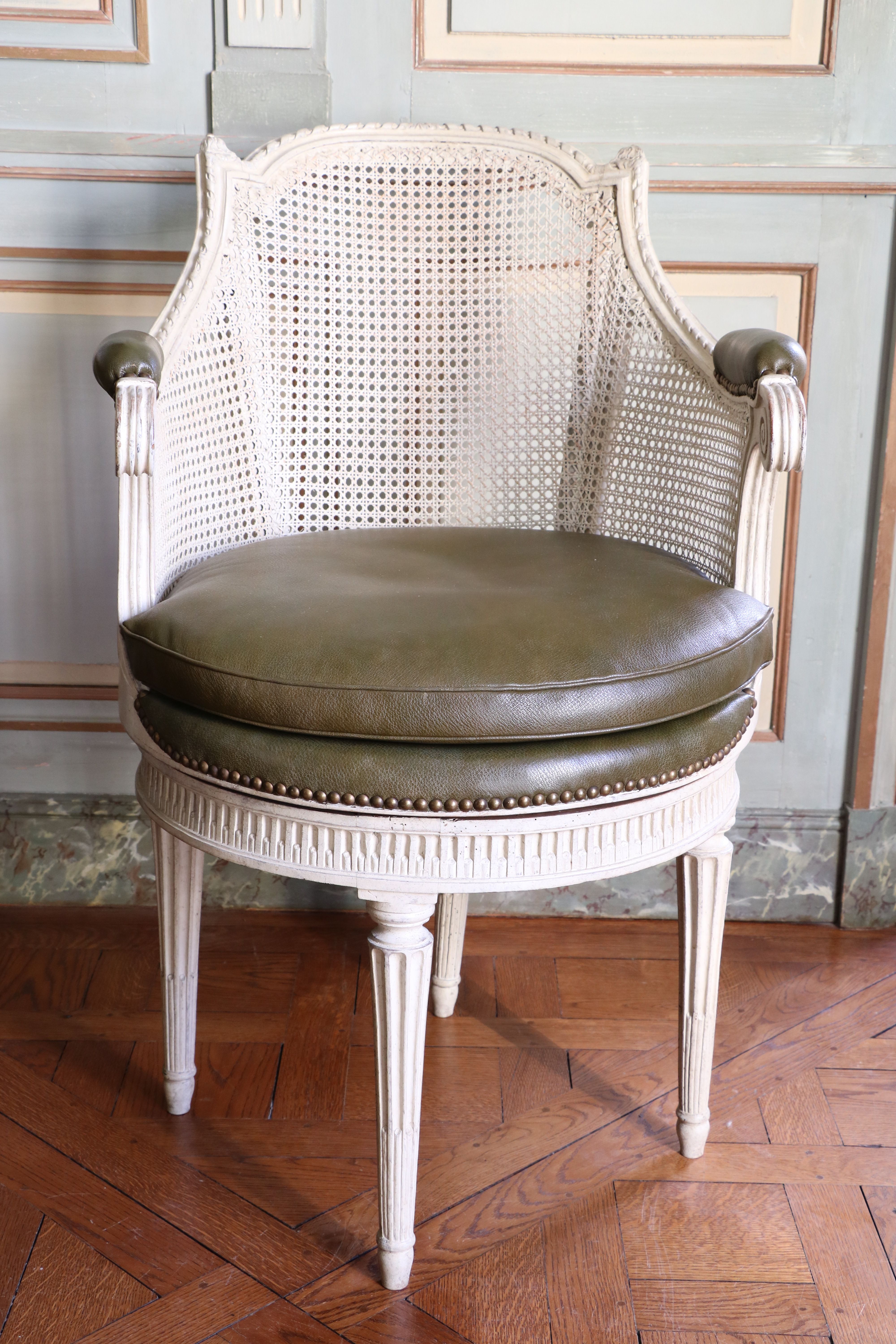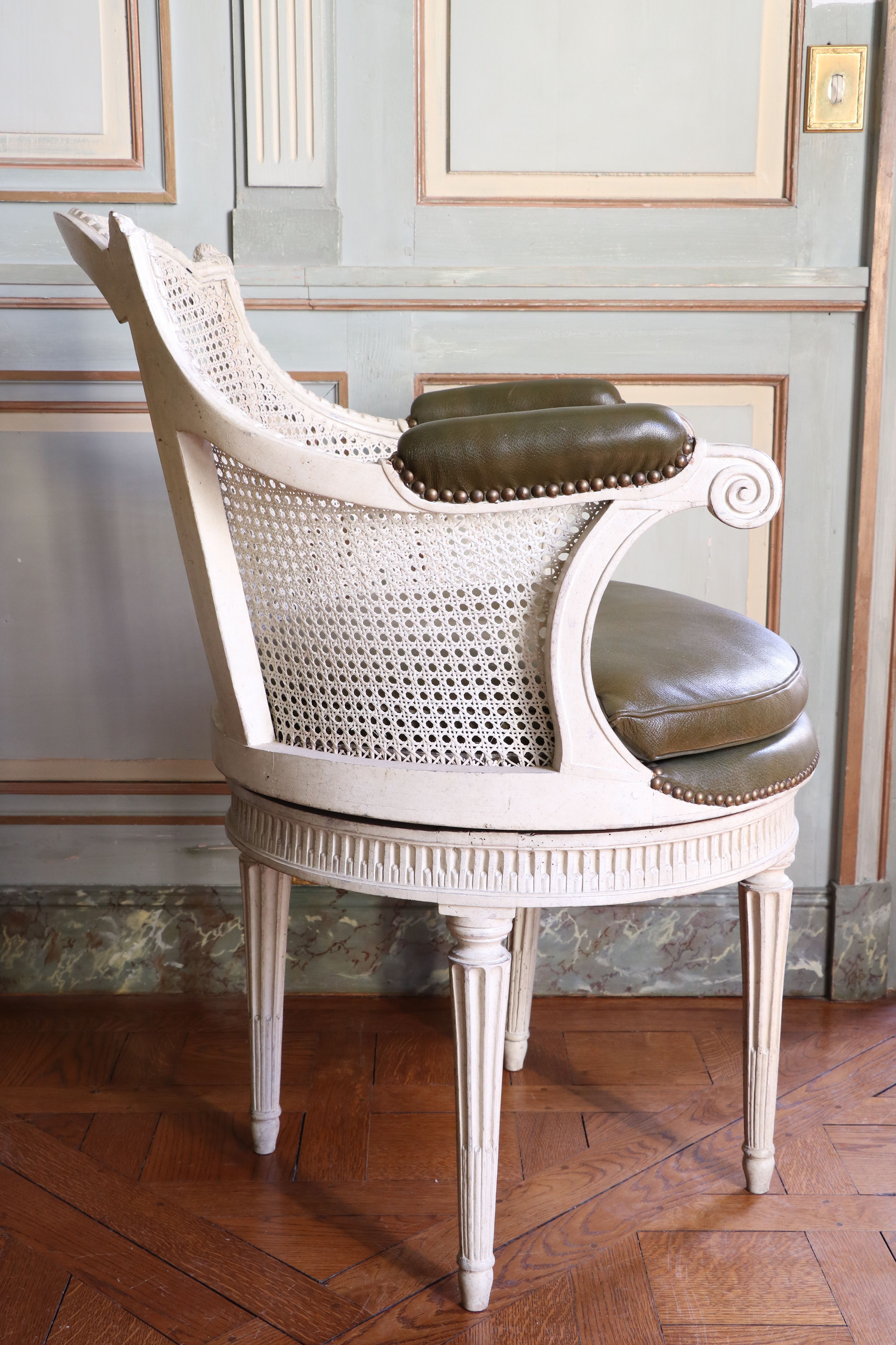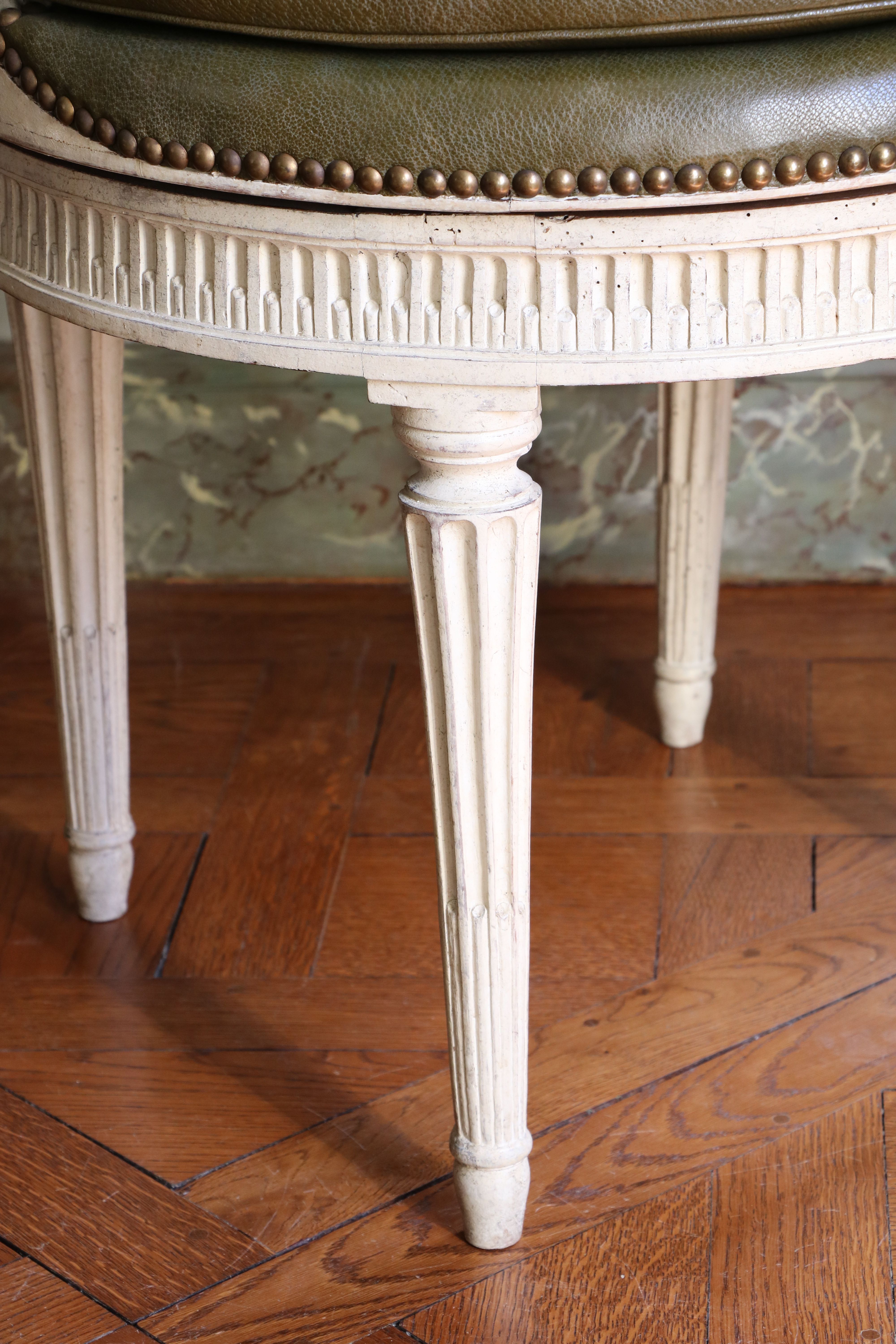 Fauteuil de cabinet à assise tournante, d'Époque Louis XVI. Très beau fauteuil de cabinet à assise tournante et à dossier cabriolet en bois de noyer finement mouluré, sculpté et laqué de couleur crème. Il présente une très belle ornementation d'esprit néoclassique, à motifs de culots feuillagés, de tors rubanés et de canaux. Le dossier à fond de canne reçoit des accotoirs à raccordement de moulure, soutenus par des supports en retrait. La ceinture circulaire repose sur quatre pieds fuselés à cannelures rudentées. L'assise en cuvette et en carreau est gainée de cuir vert. Estampillé : P. Bernard (sous la ceinture). Pierre BERNARD (vers 1730-1788) Cité maître le 24 janvier 1766. Paris. Époque Louis XVI. H_93 cm L_59 cm P_66 cm