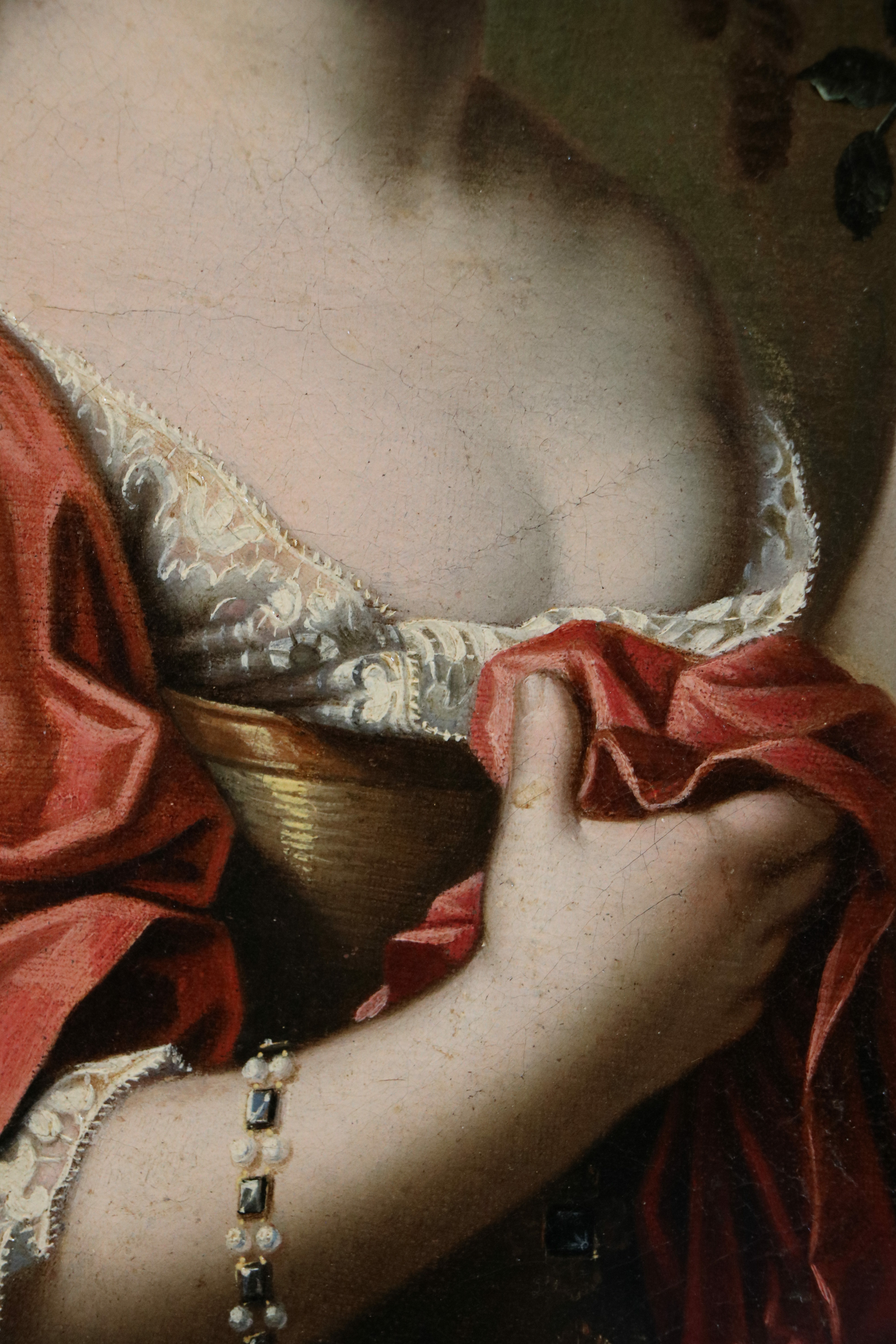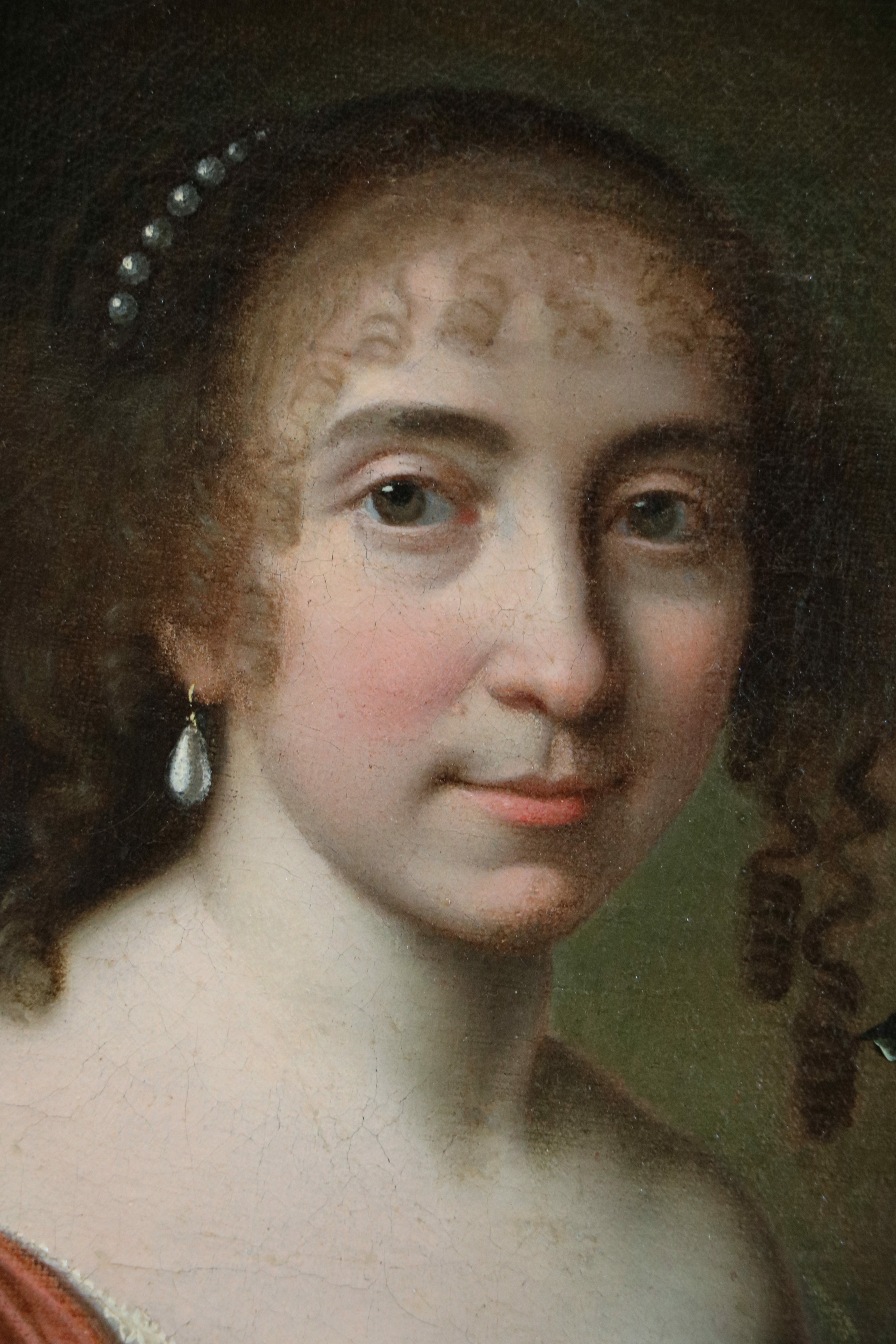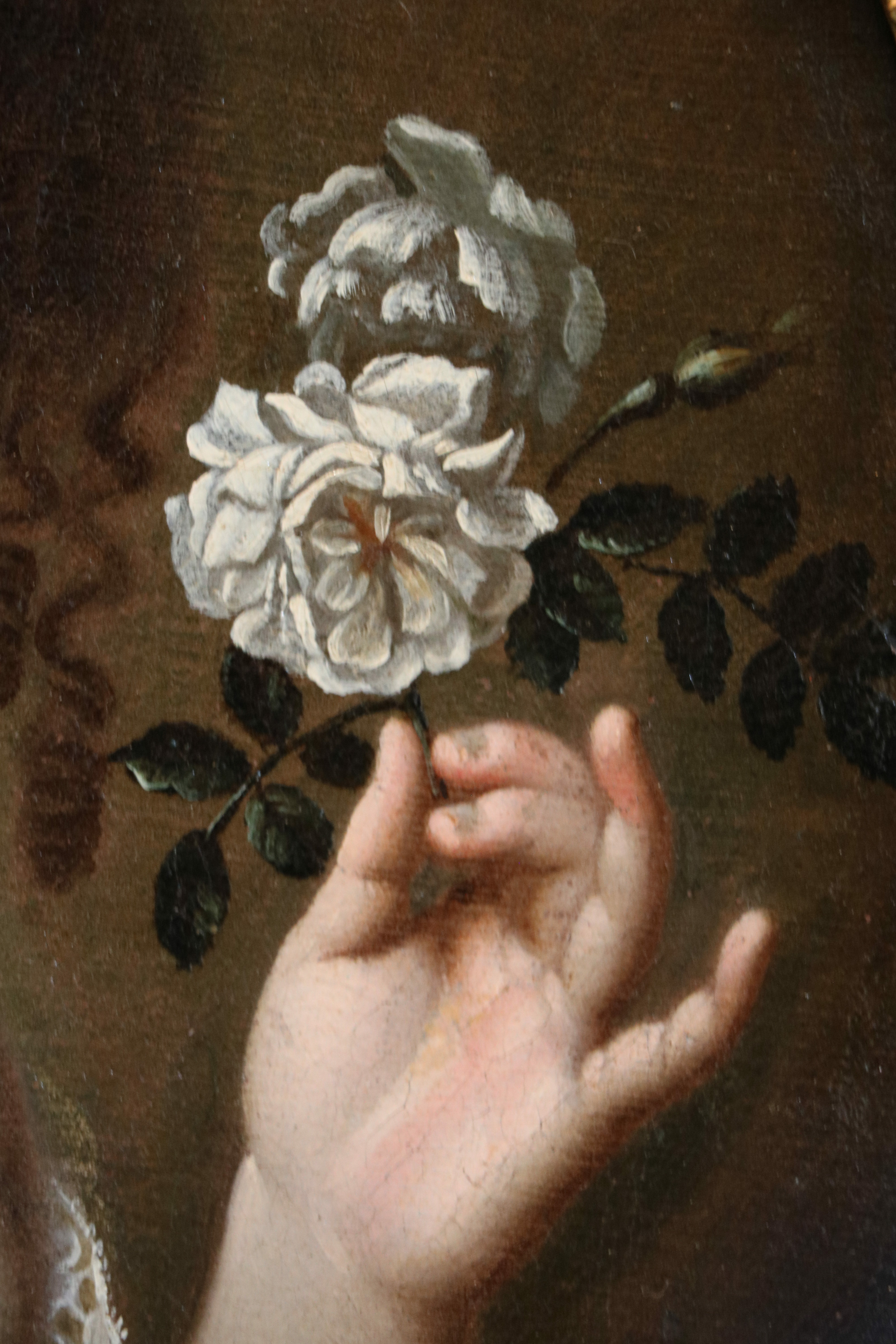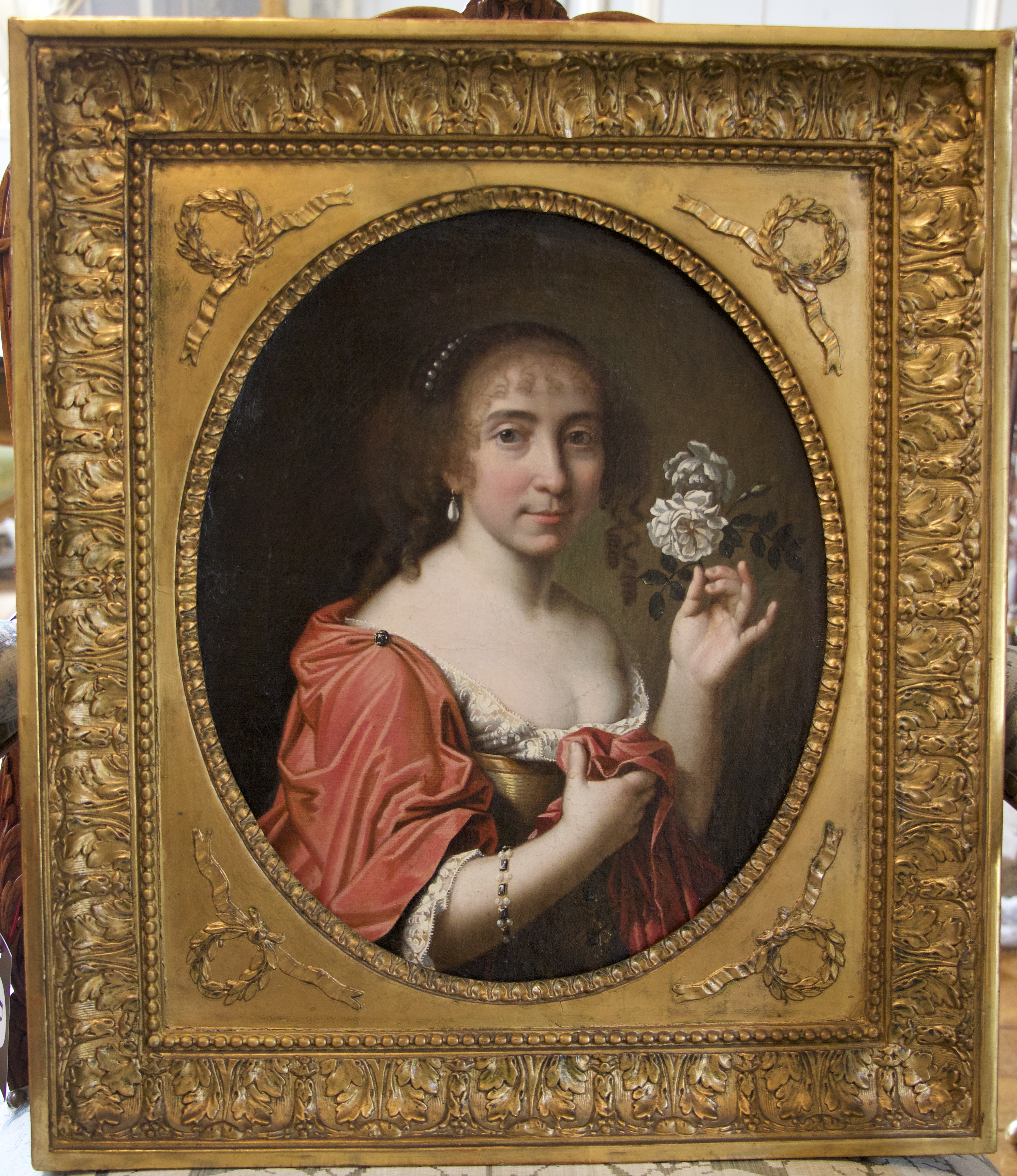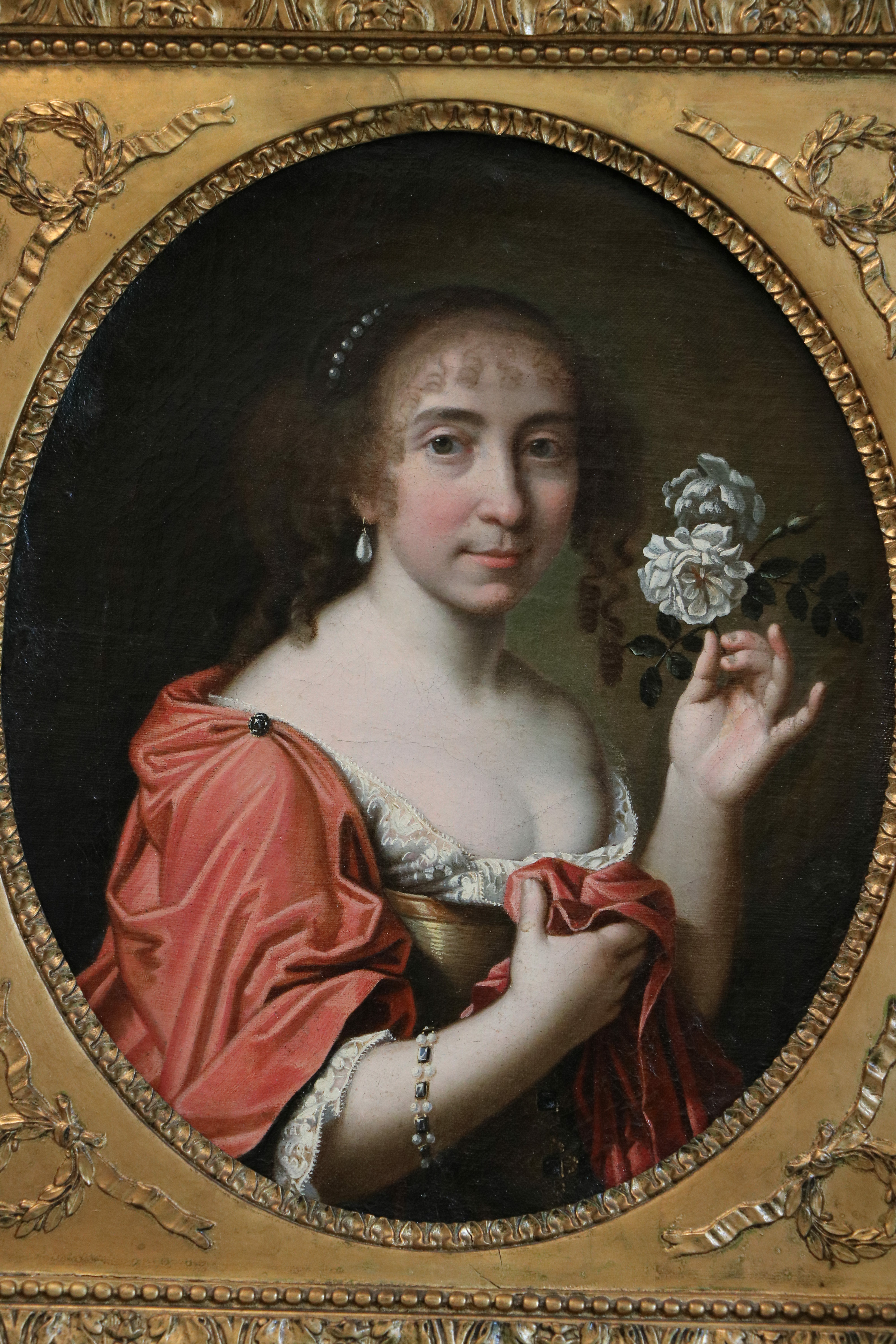 Ce portrait présente une jeune femme élégante du XVIIème siècle, vêtue d'un long manteau écarlate et d'une chemise en dentelle d'Alençon. Elle tient deux roses blanches, symbole de pureté et d'innocence. Arborant une "coiffure à la garcette", elle incarne parfaitement la jeune femme élégante de cette moitié XVIIème. Ecole Française, XVIIème siècle. Huile sur toile, Vue ovale H.37,5 x L.30,5 cm. Cadre en stuc doré XIXème Etat d'usage